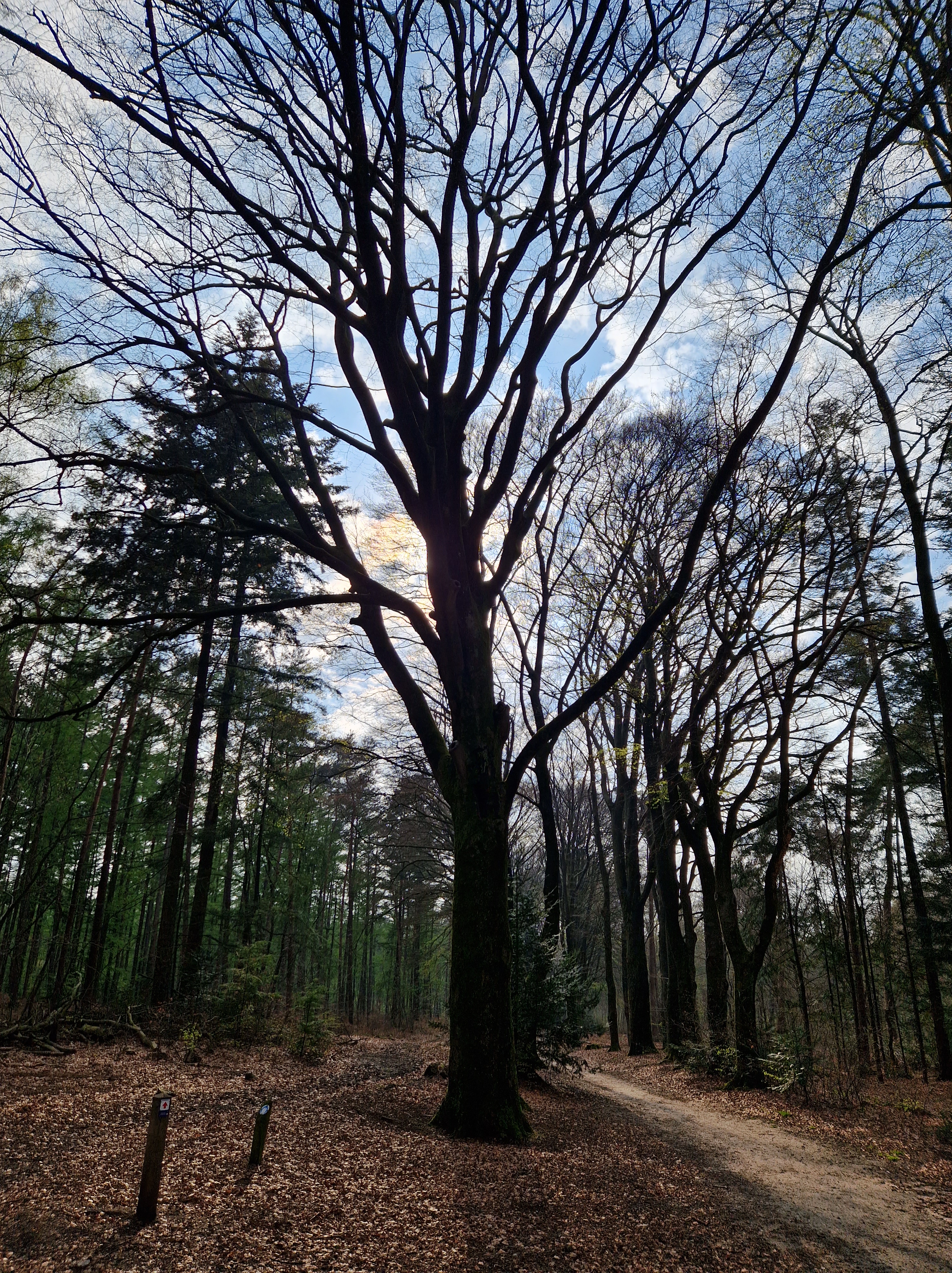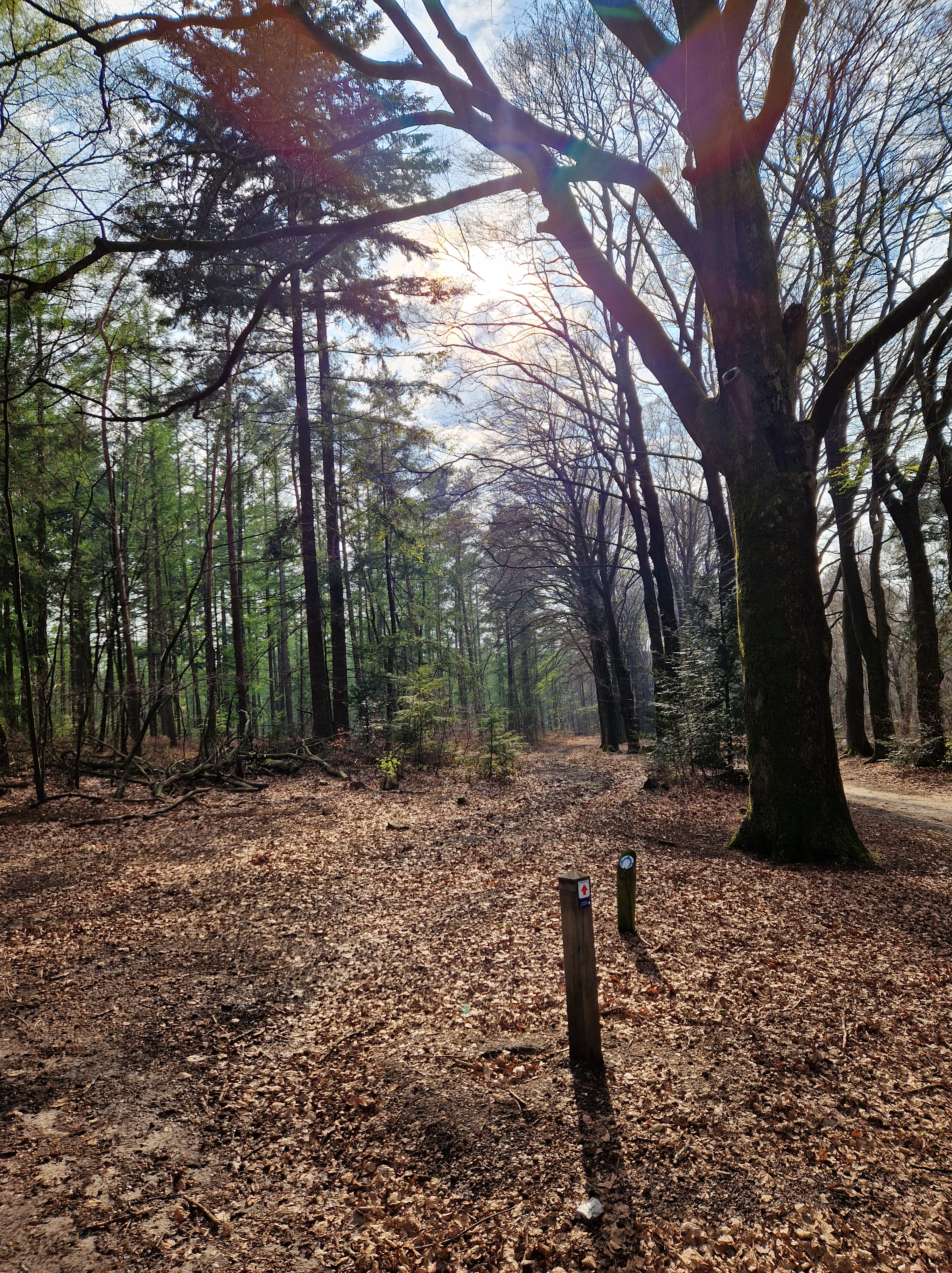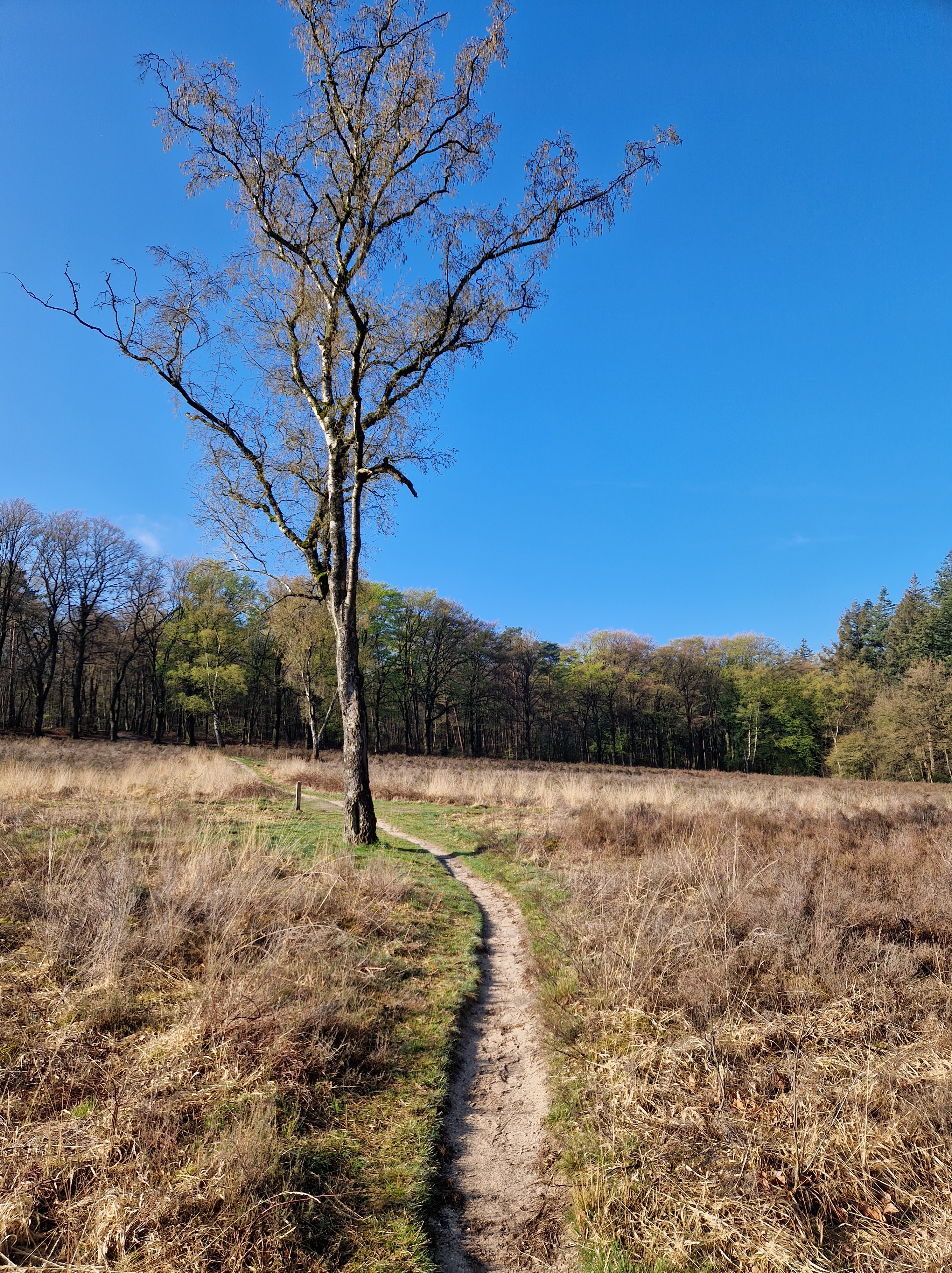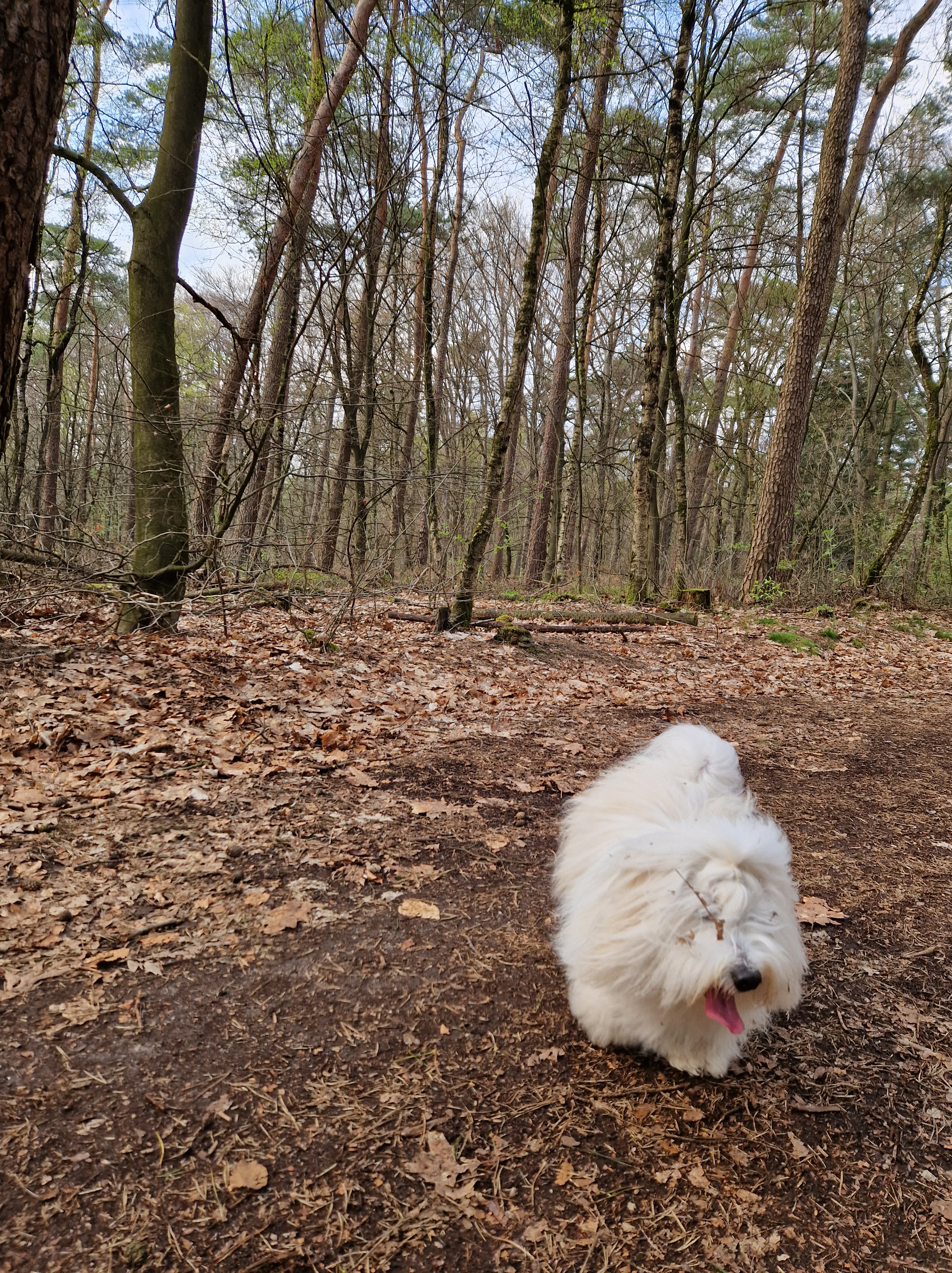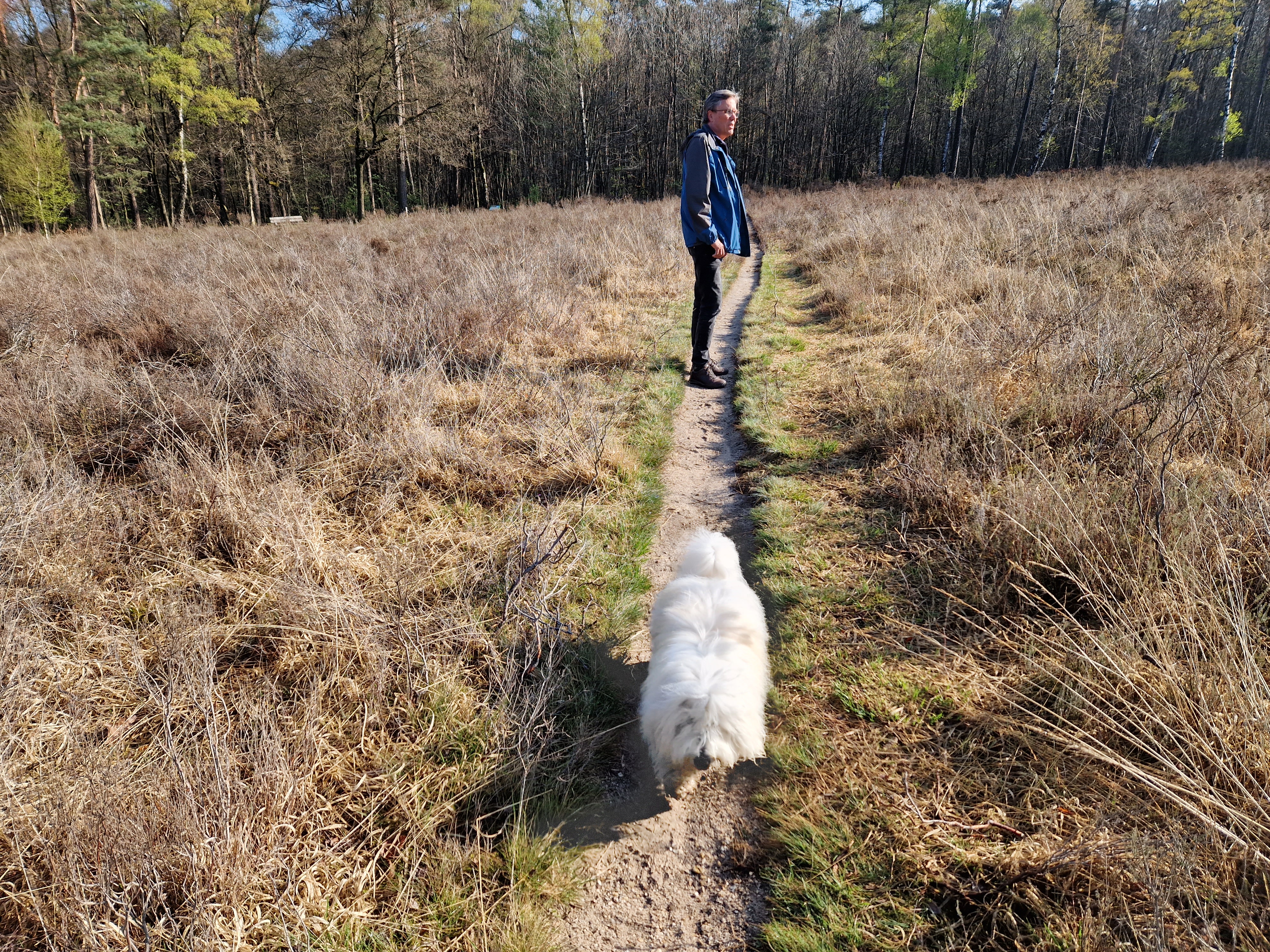 Tegen vijven melden we in ons bij het hotel. Mooi zolderkamertje. Spullen wegzetten en de benen strekken. We lopen uit het hotel direct het bos in. Ravi mag fijn los rennen. Gelukkig is het bos vrij droog op wat grote plassen na. We dwalen tussen de oeroude grafheuvels, de dennen, over geitenpaadjes op de hei. De zon tovert kleurenprisma’s in de wolken. Ravi dendert als Jolly Jumper -KataKlop! KataKlop!- de heuvels op en af. Hij slalomt door een drooggevallen slootbedding als een volleerd skater van de ene oever naar de andere. Als hij een grote modderpoel nadert, roep ik: “Rávi! Kijk-es! Kóóóm op!”. Vanuit de verte spurt hij met zijn vierwielaandrijving terug naar ons. Ja, dat snoepje heb je verdiend knapperd!