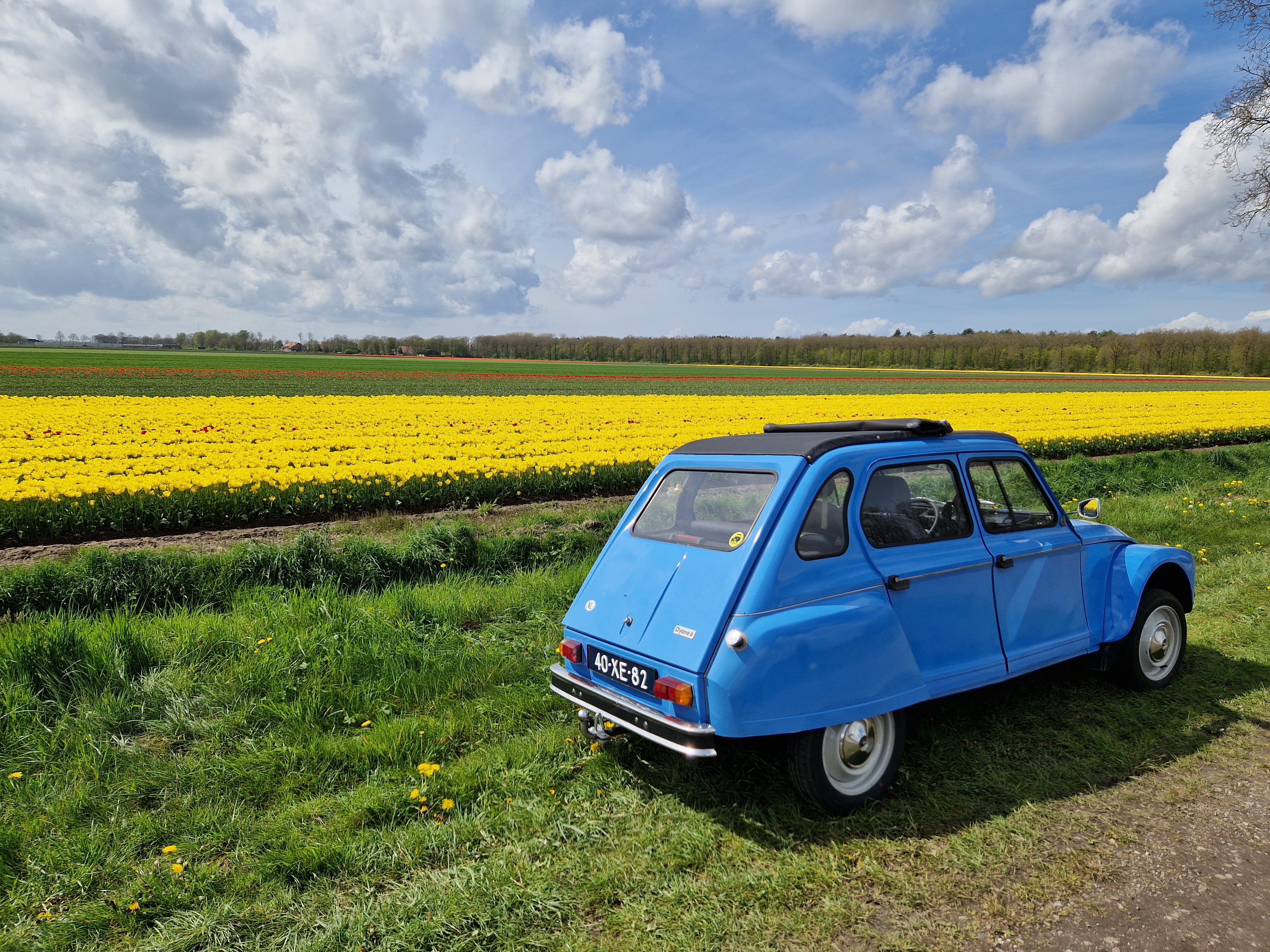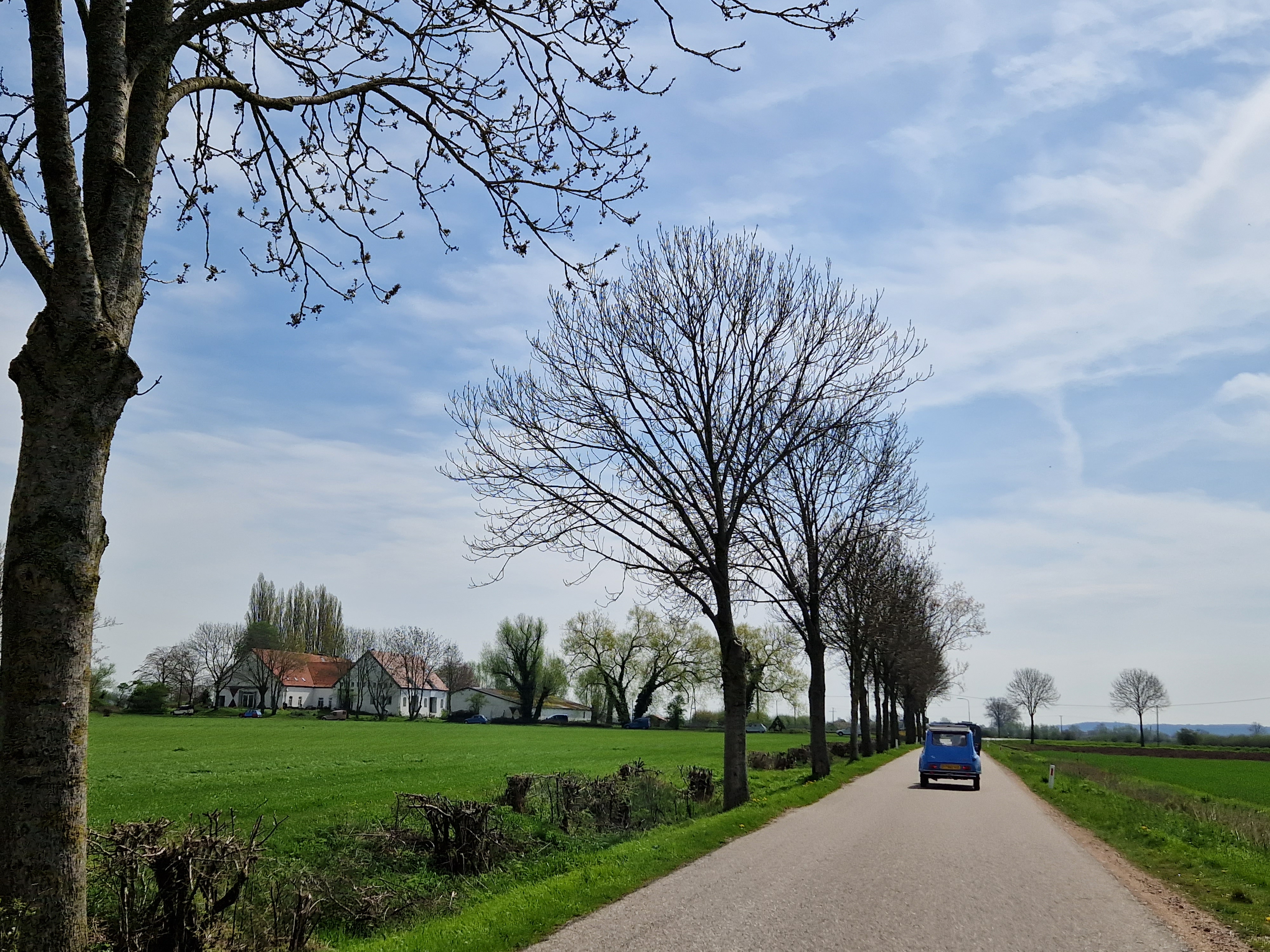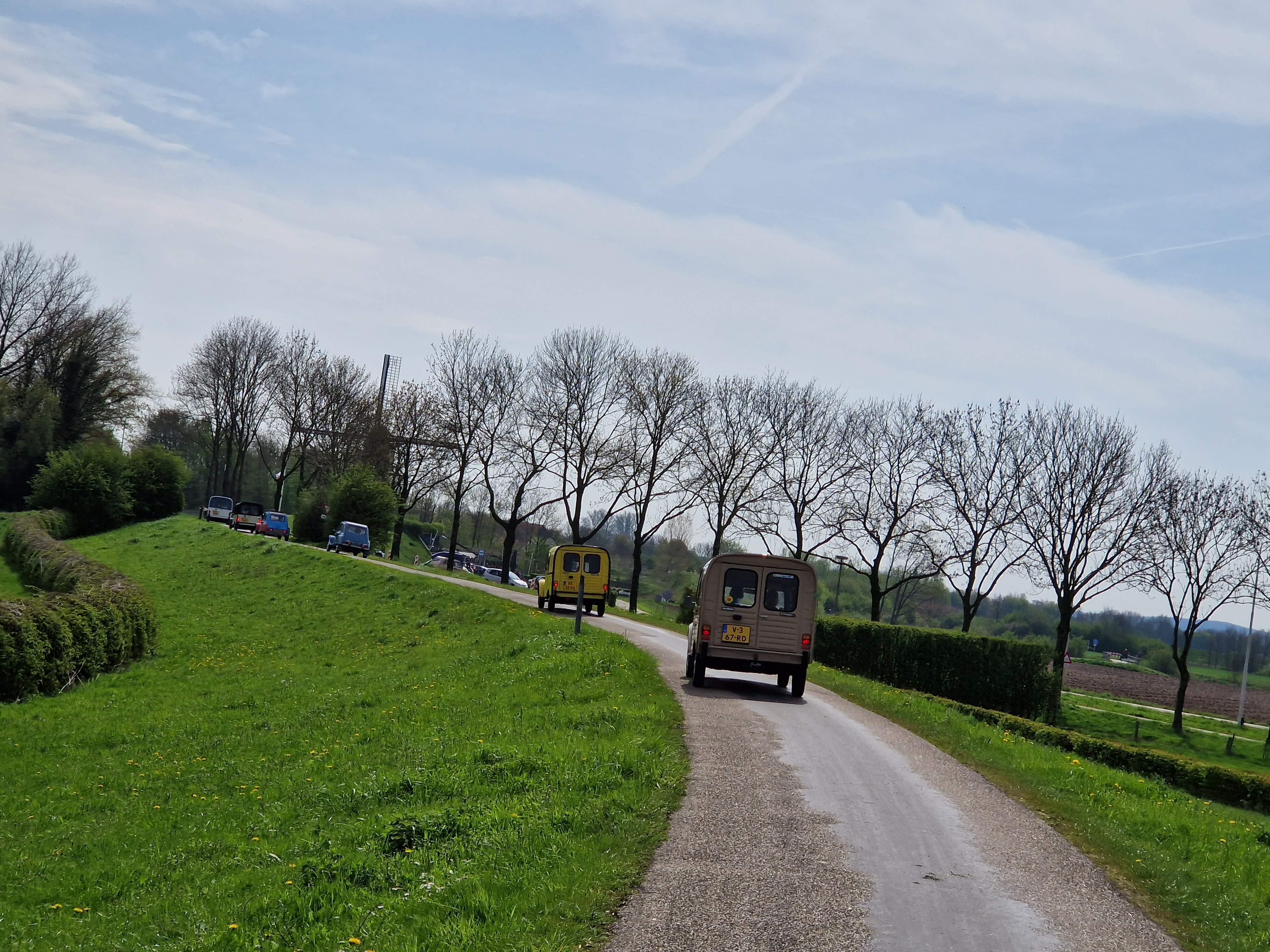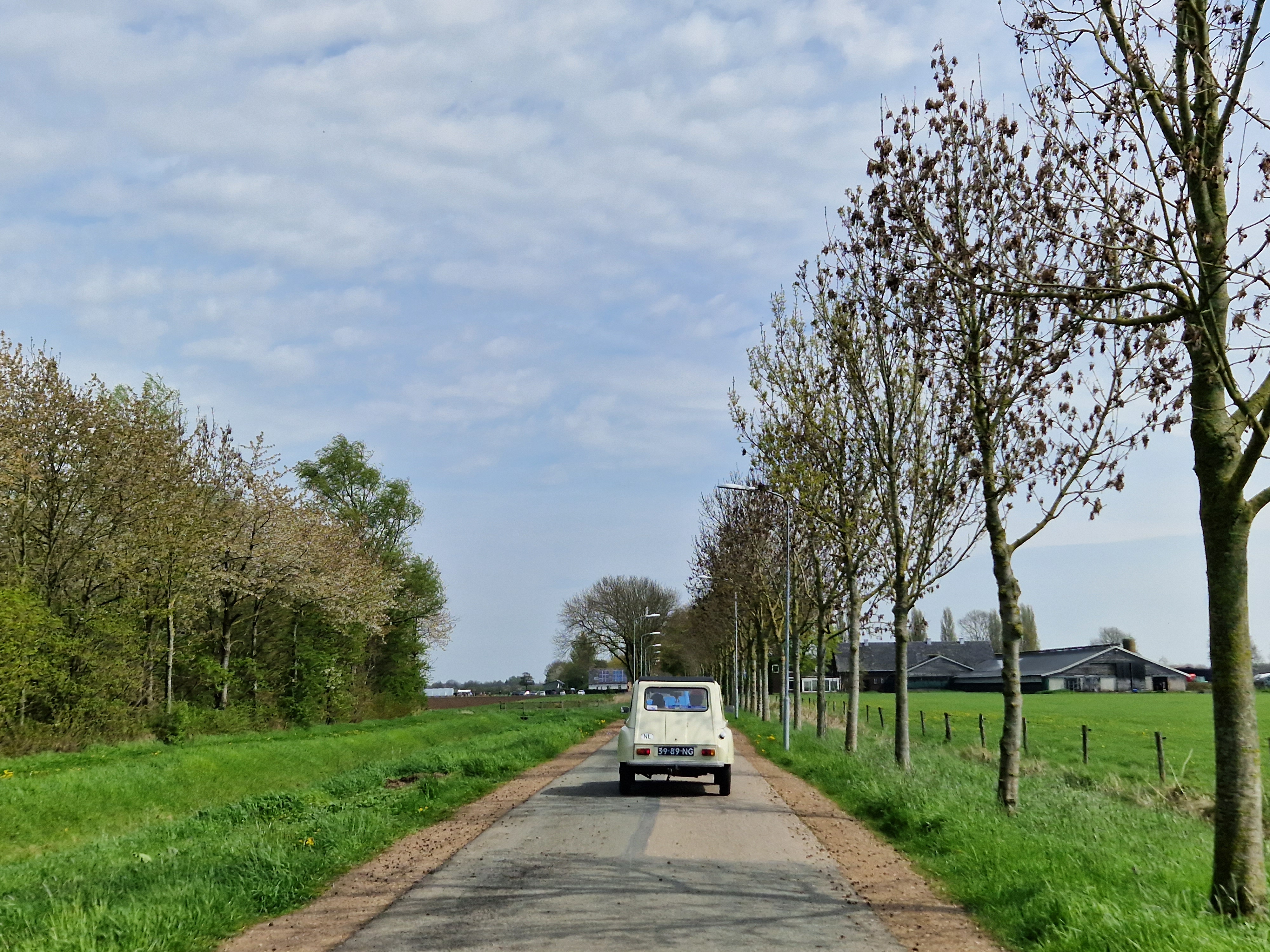 Tegen half 12 vertrekken we, met het dak half open. We zien een rijtje chique gerestaureerde herenhuizen uit 1910-1920 (dat zeggen de jaartallen in jugendstil-letters erop tenminste), allemaal even strak in de schmink. Koetelen door Beek met zijn gewichtige notariswoningen. We passeren het Hollandsch-Duitsch Gemaal. Komen langs 200 jaar oude boerenhoeves met bijbehorende parfums. Watertjes. Koeien. Koolzaadvelden. Wandelaars. Fietsers. En een hele rij eenden. Excuus, Dyanes en Acadianes. De zon schijnt, iedereen is blij.