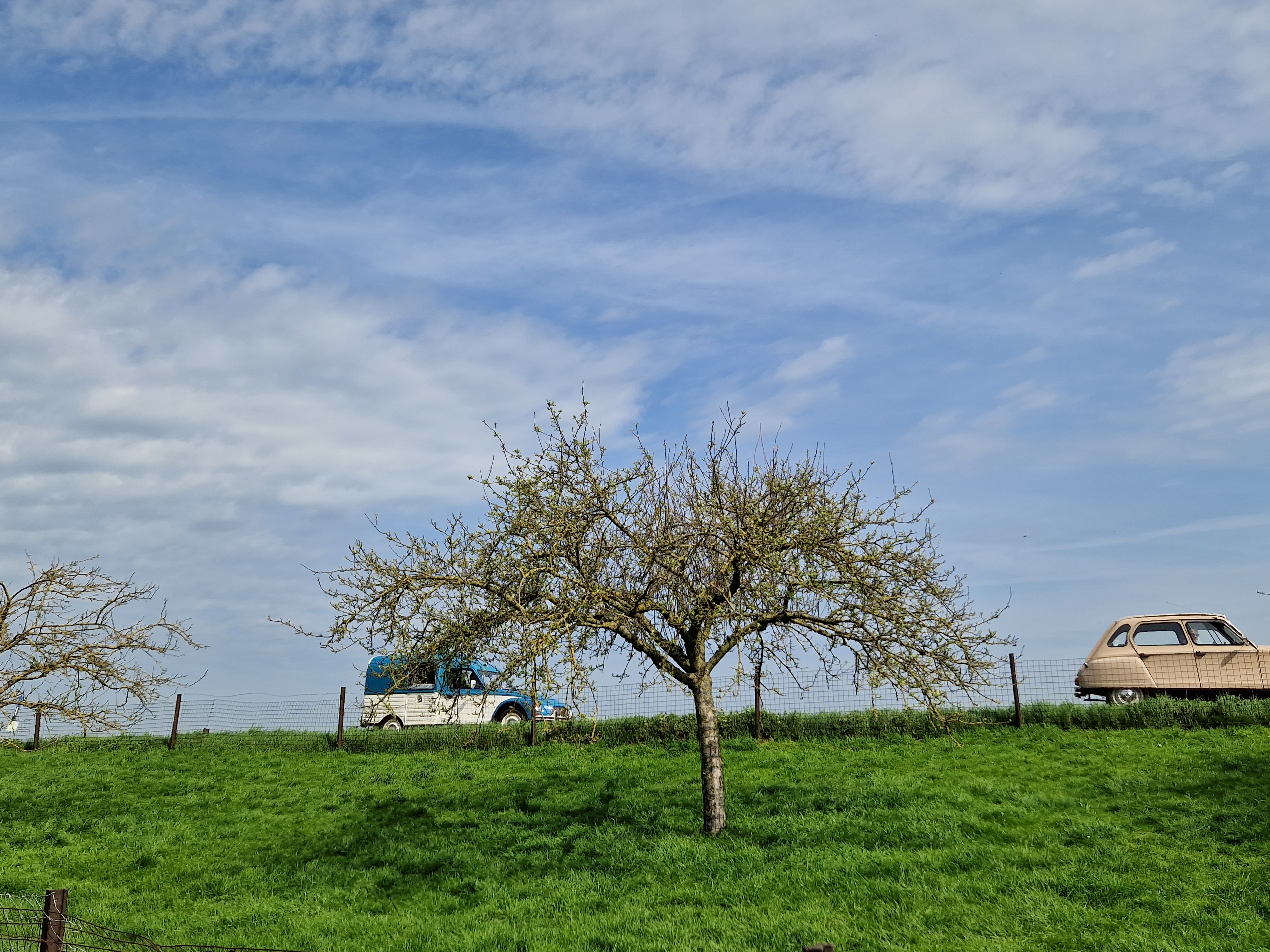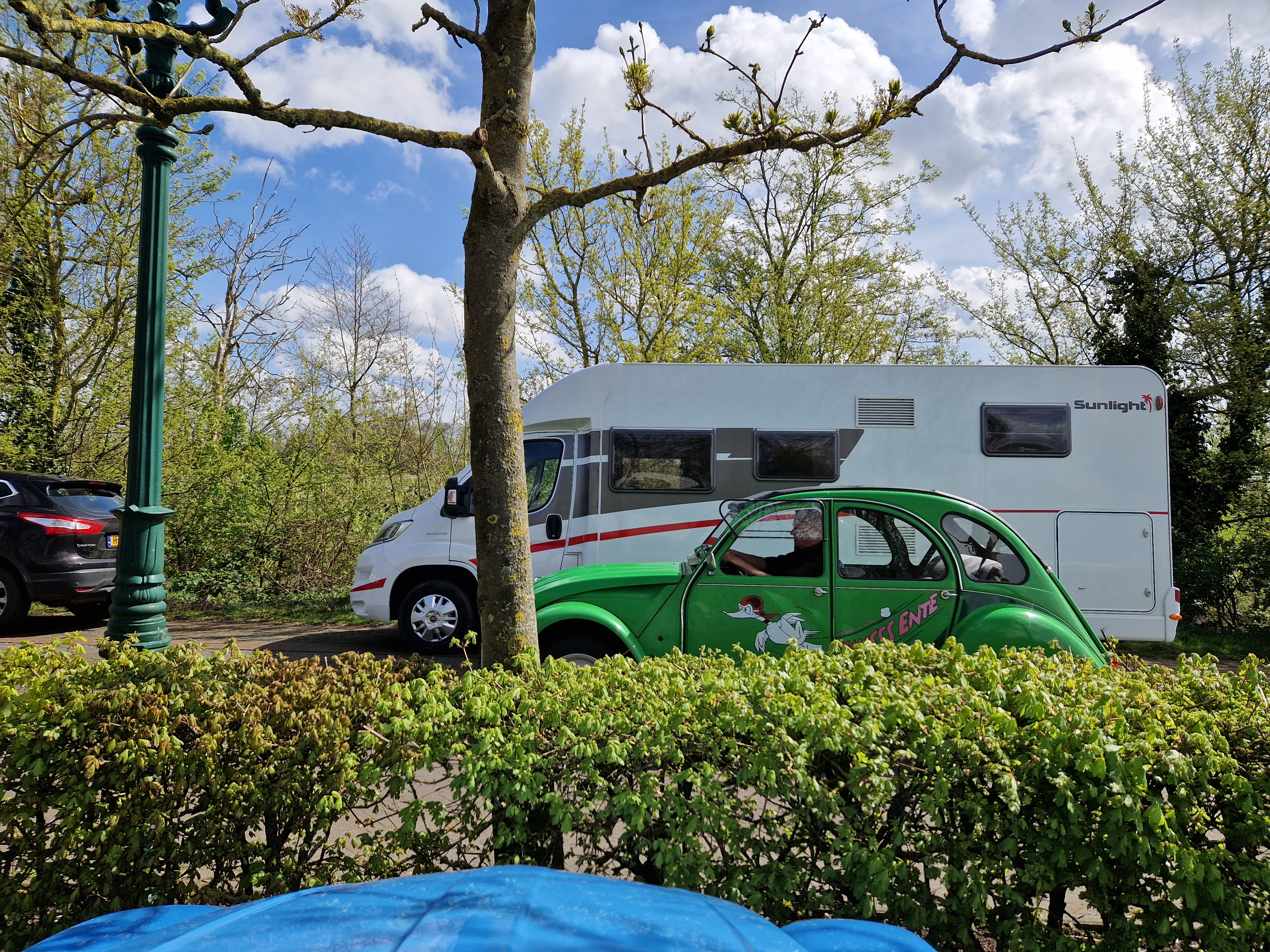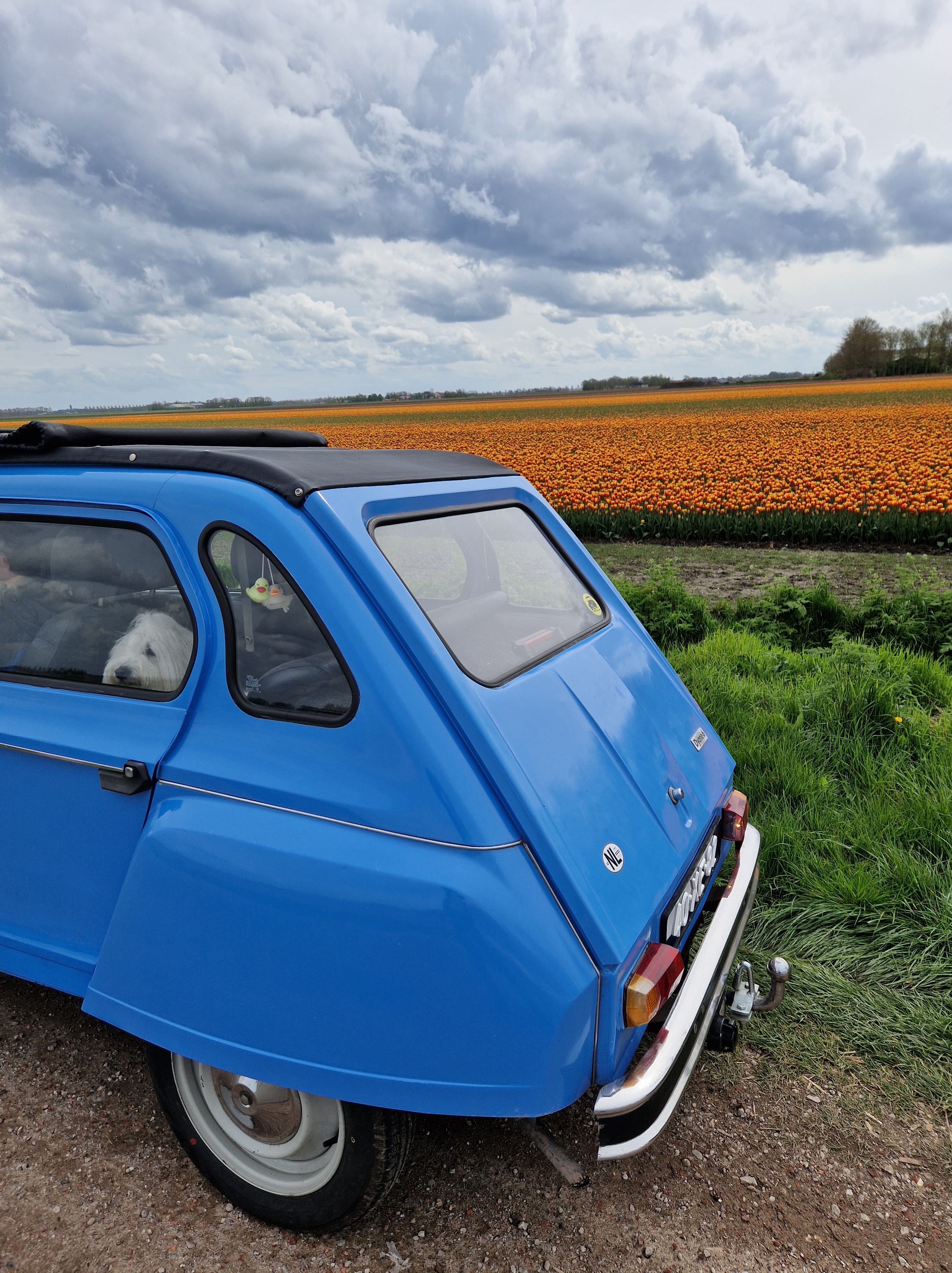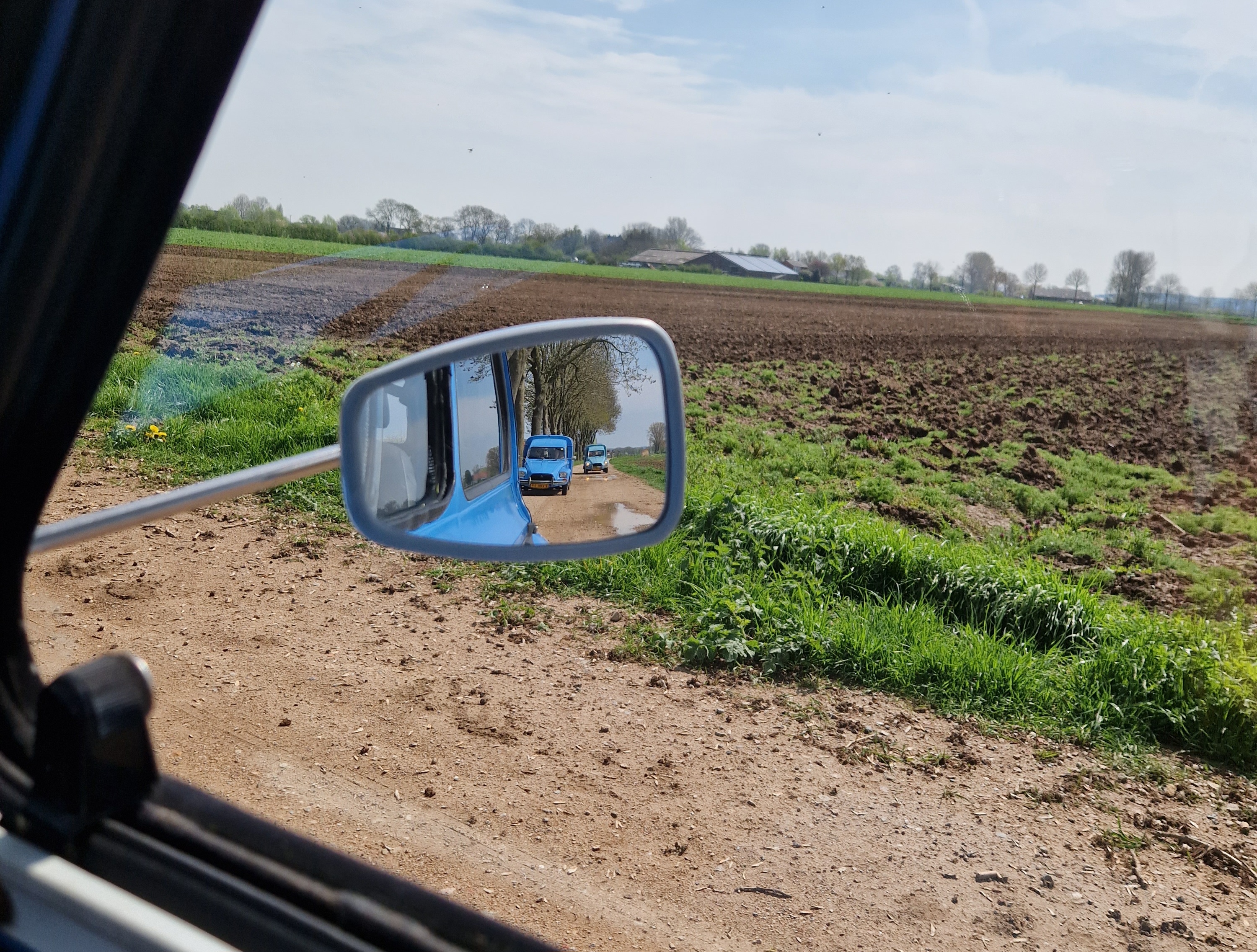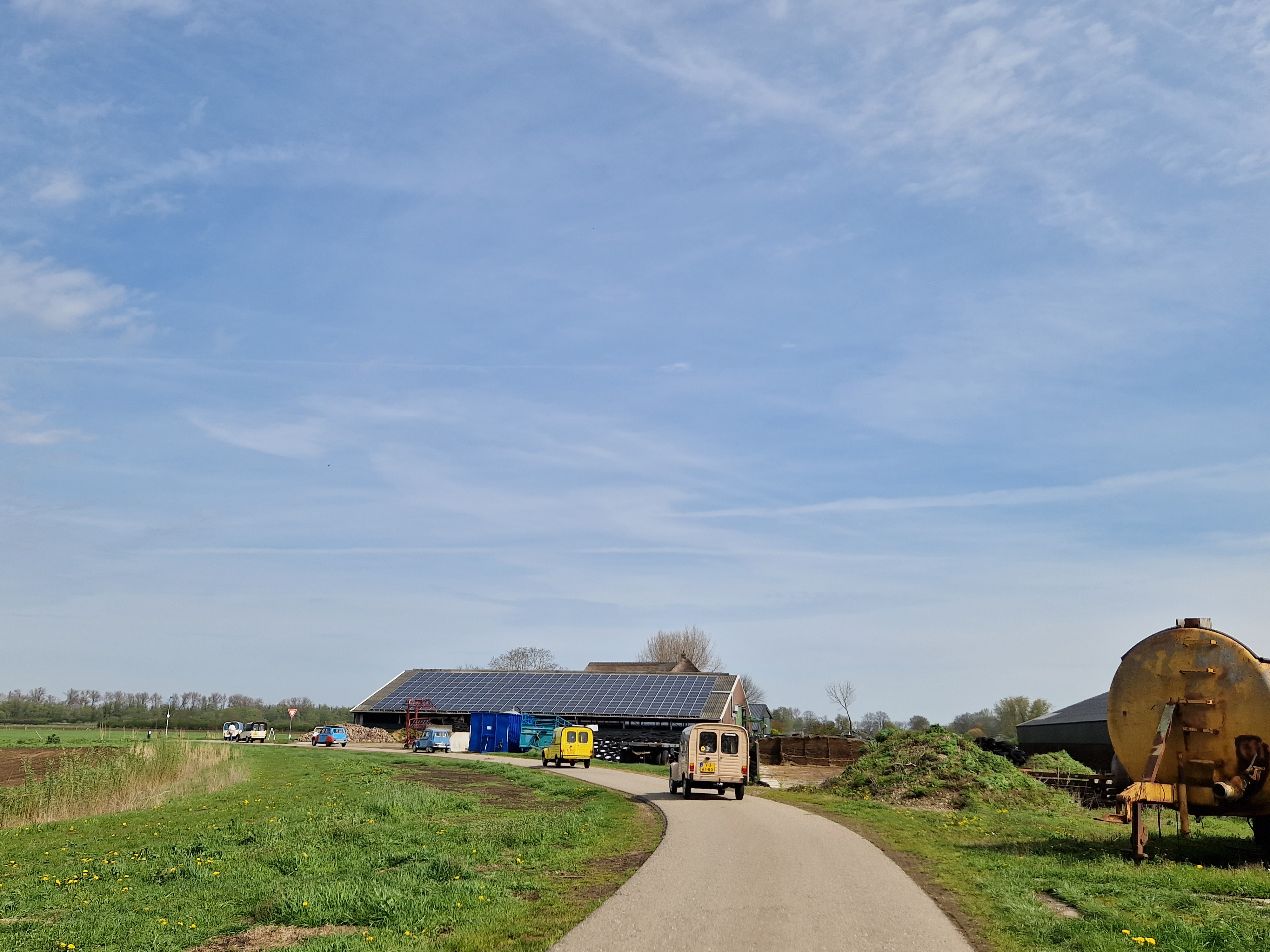 Tegen half 12 vertrekken we, met het dak half open. We zien een rijtje chique gerestaureerde herenhuizen uit 1910-1920 (dat zeggen de jaartallen in jugendstil-letters erop tenminste), allemaal even strak in de schmink. Koetelen door Beek met zijn gewichtige notariswoningen. We passeren het Hollandsch-Duitsch Gemaal. Komen langs 200 jaar oude boerenhoeves met bijbehorende parfums. Watertjes. Koeien. Koolzaadvelden. Wandelaars. Fietsers. En een hele rij eenden. Excuus, Dyanes en Acadianes. De zon schijnt, iedereen is blij.
