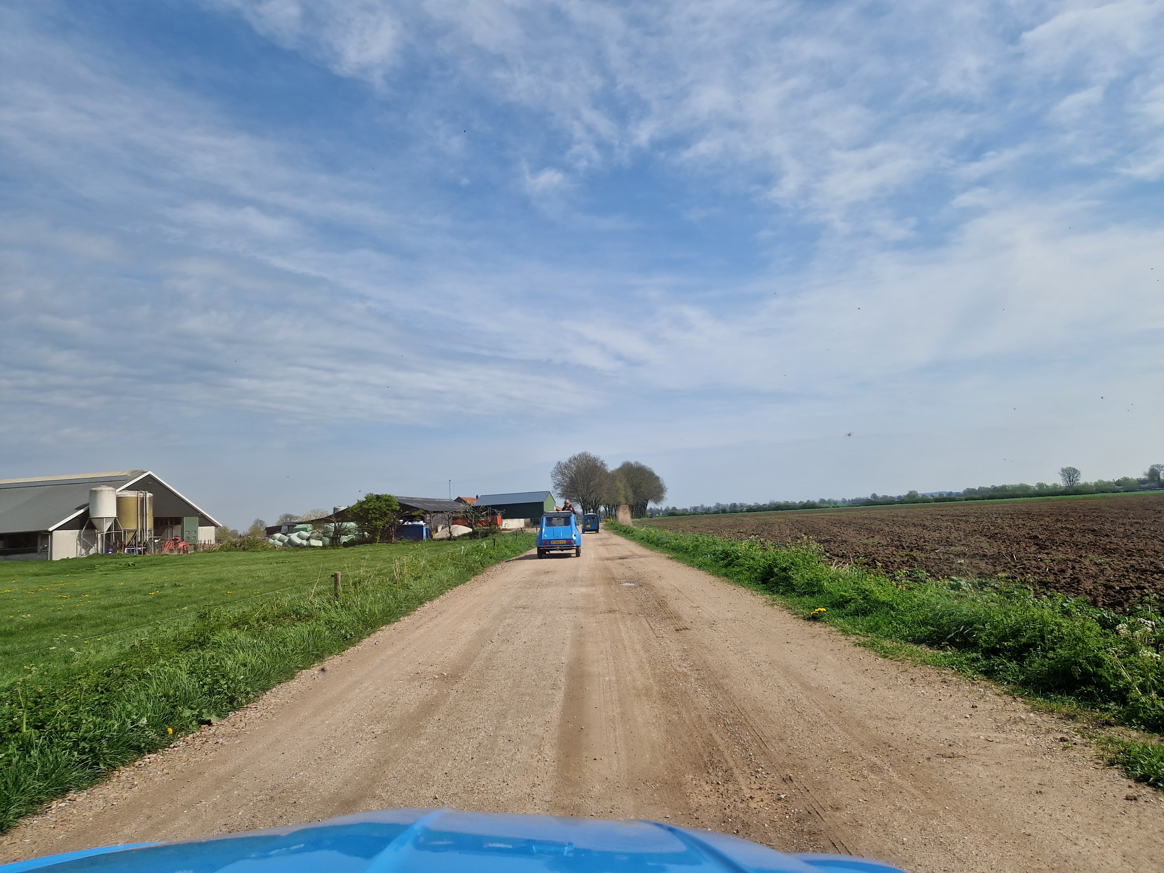 De routebeschrijving hebben we op papier en als GPX bestand voor de Tomtom. Mijn Polarsteps houdt alles keurig bij zodat we iedere slinger, elk dijkje en zandweggetje kunnen nazien. Ik maak veel foto’s en film uit het open dak, ik heb geen tijd om mee te schrijven.