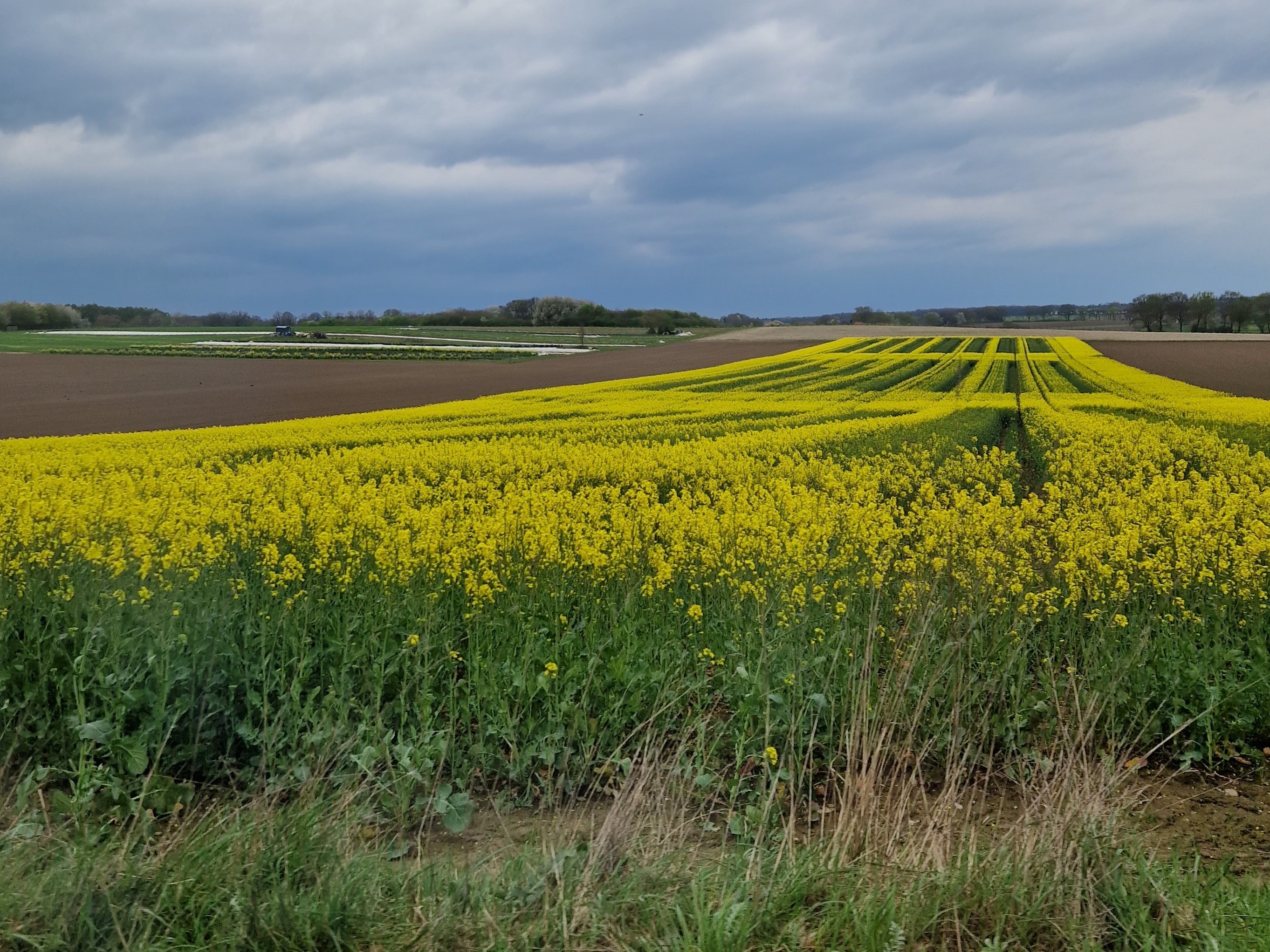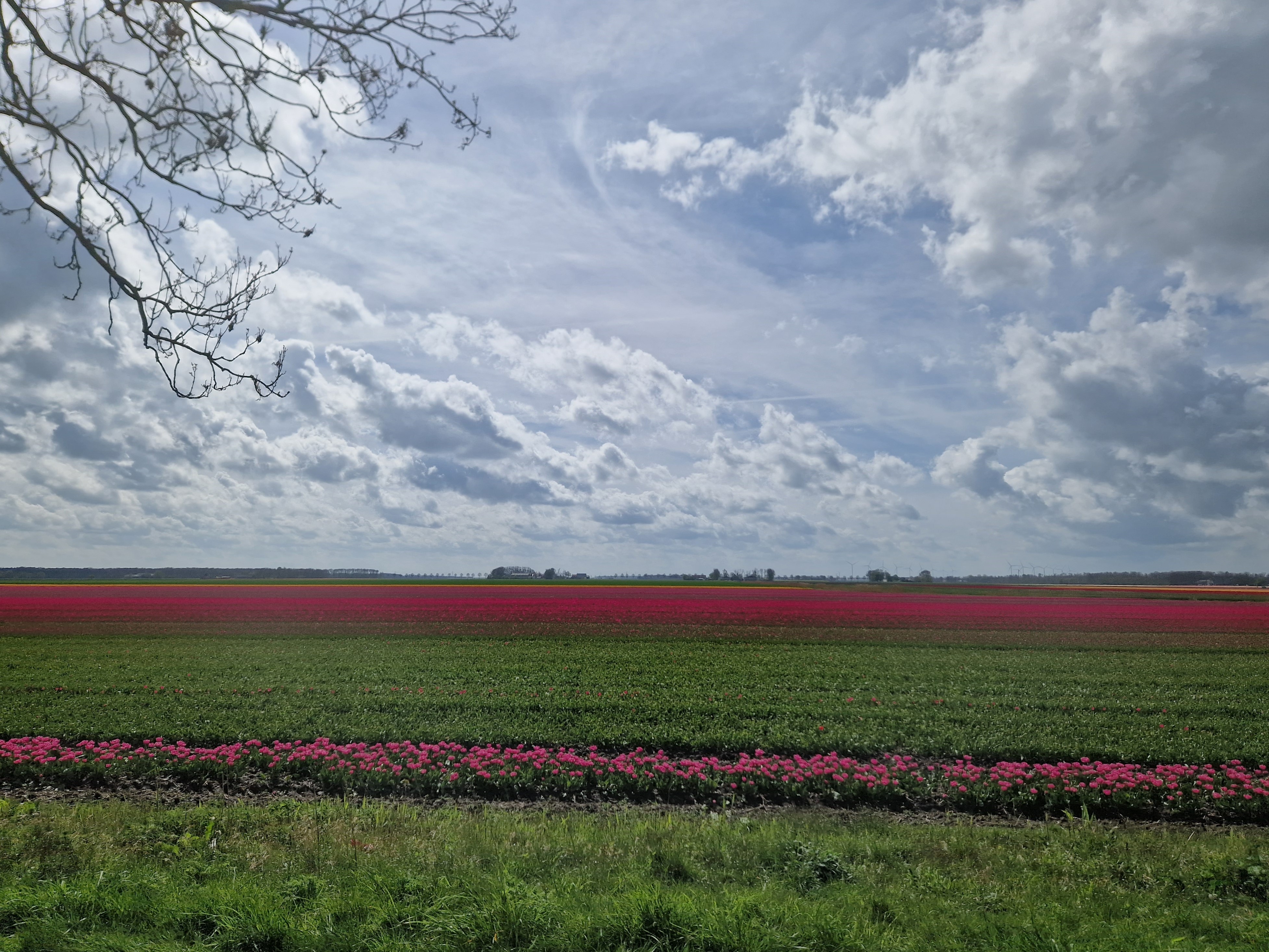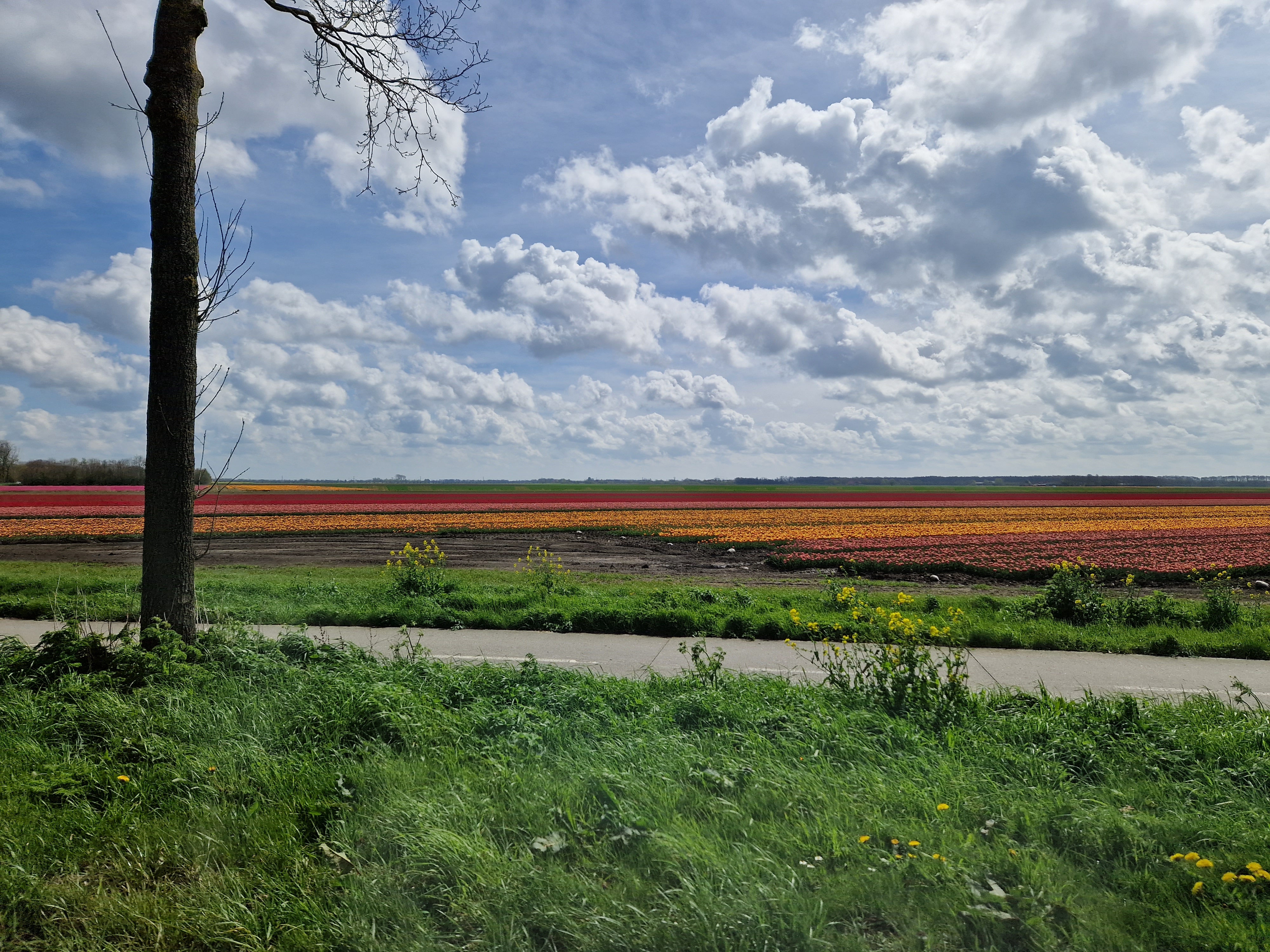 De Tulpenfestivalroute waar de club zich gemakshalve van bedient is een totáál ander soort rit dan gisteren. Dit is een wat commercieel “volg de bordjes”-geheel met veel 60-80 km wegen om van het ene perceel naar het andere te geraken. Geen enerverende kronkels, hellingen, zandweggetjes. Veel “vreemd volk” wat zich tussen de eenden mengt; de toeristen en dagjesmensen hebben allemaal dezelfde plattegrond met pijltjes. Ondanks dat alles genieten we volop, van het toeren, van de kleuren. Hoewel minder dan de helft van de bloemen in bloei staat, er bloeien bijna nog meer fruitbomen dan tulpen, zijn er genoeg plaatsen waar we een fotoshoot kunnen doen.