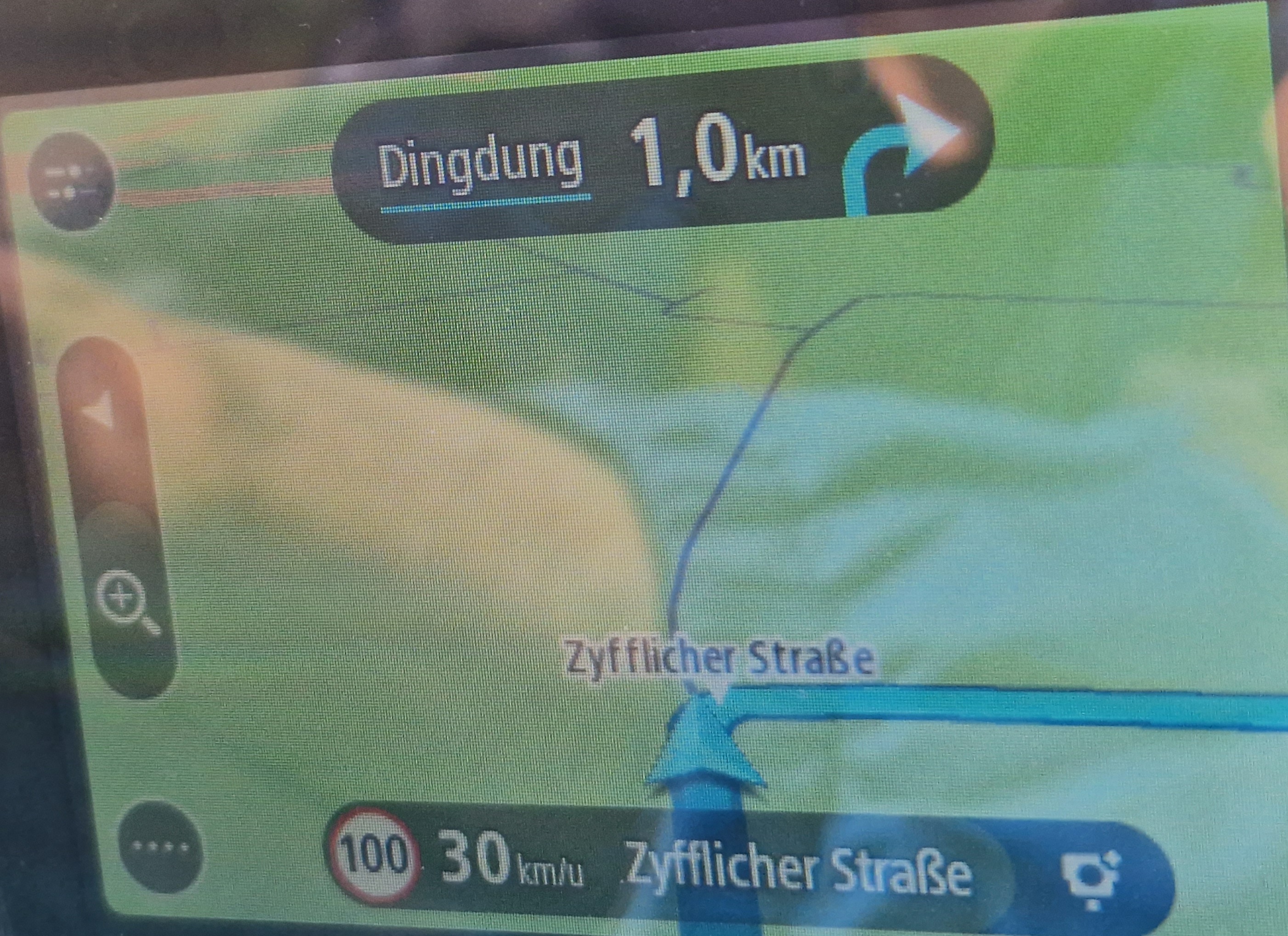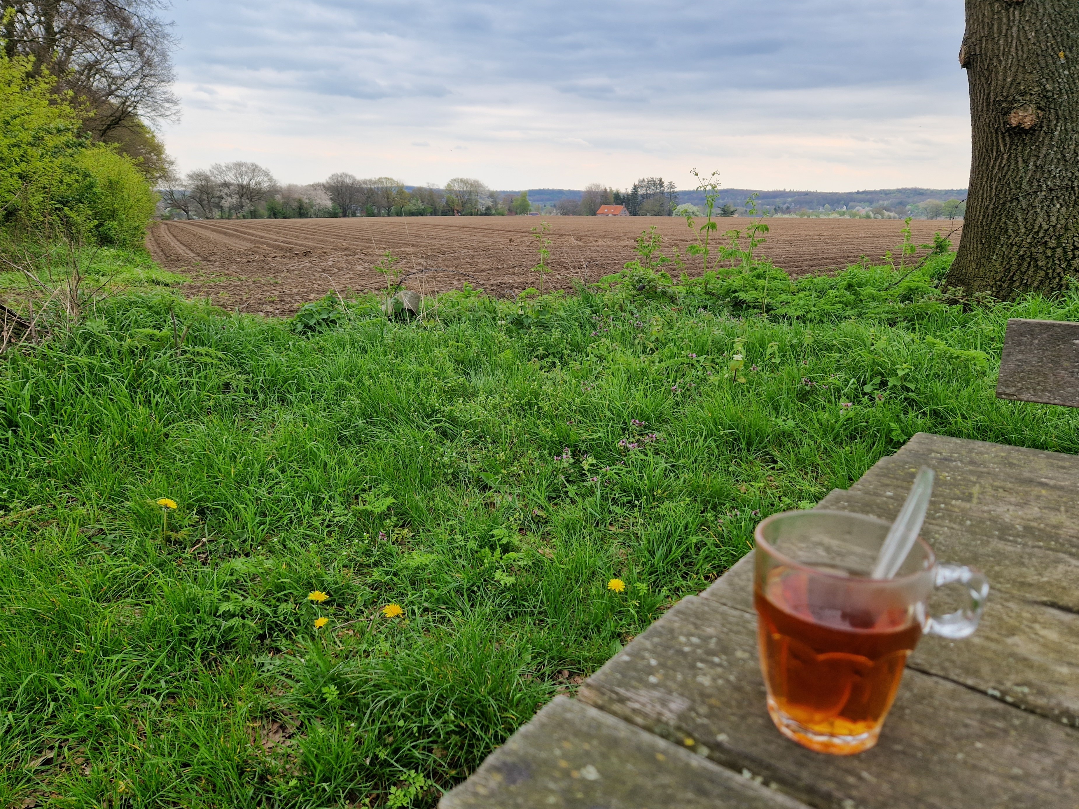 We rijden Duitsland in. Daar is Dingdung. De naam is té leuk om geen foto van te scoren, helaas ben ik steeds te laat voor de wegwijzers. Dan maar eentje van de Tomtom. We rijden Duitsland uit. En dat herhalen we een paar keer, we volgen de grens. In de beschrijving is ook een aantal lunchgelegenheden opgenomen, maar wij picknicken liever met onze eigen broodjes en koffie uit de kofferbak. Er komt meer bewolking, we duimen dat we de buien voorblijven. Bij het laatste kopje thee op een picknickbank in de bocht naar Klein America doen we het dak dicht voor drie spetters regen. Nu zijn we in het landingsgebied van de parachutisten van Operatie Market Garden in 1944. In het veld staat een nagebouwd skelet van een Waco Glider verdekt opgesteld. Twee mederijders zien kans ernaast te parkeren, zien we op facebook*. Dat zandweggetje ernaartoe hebben wij gemist.