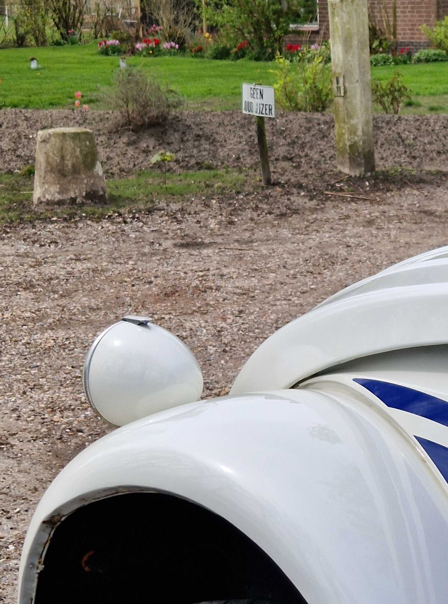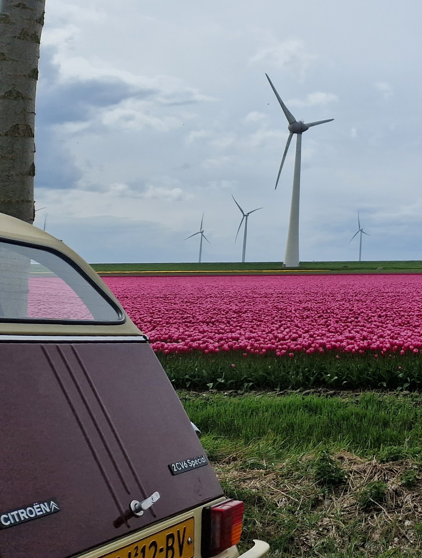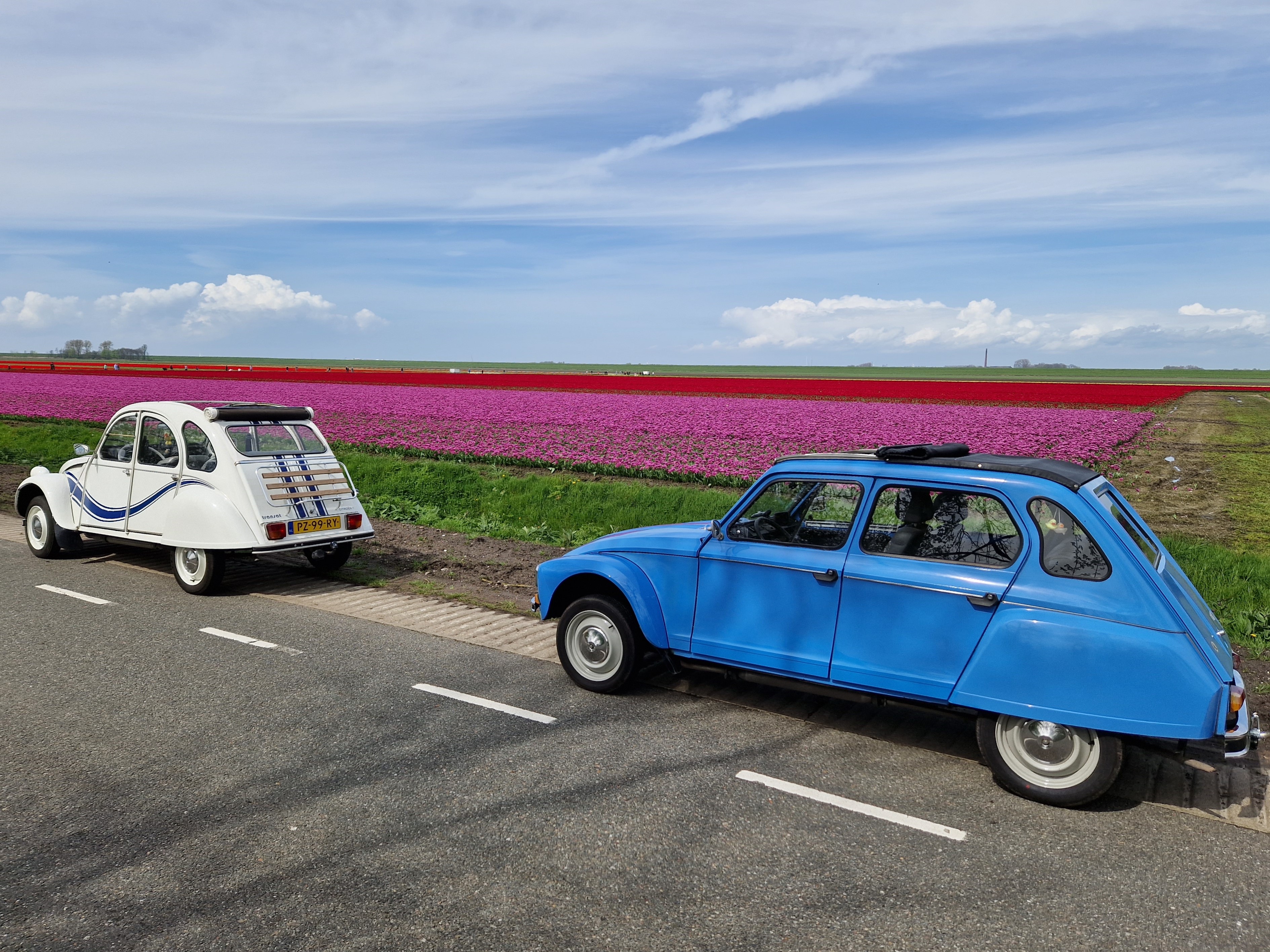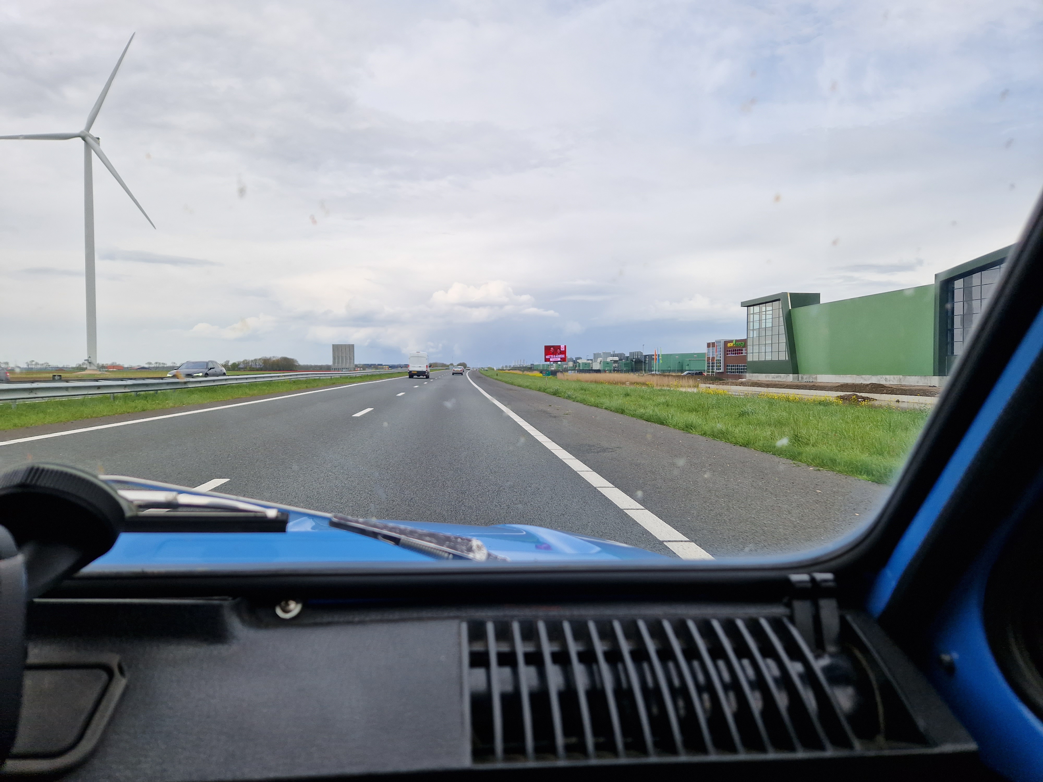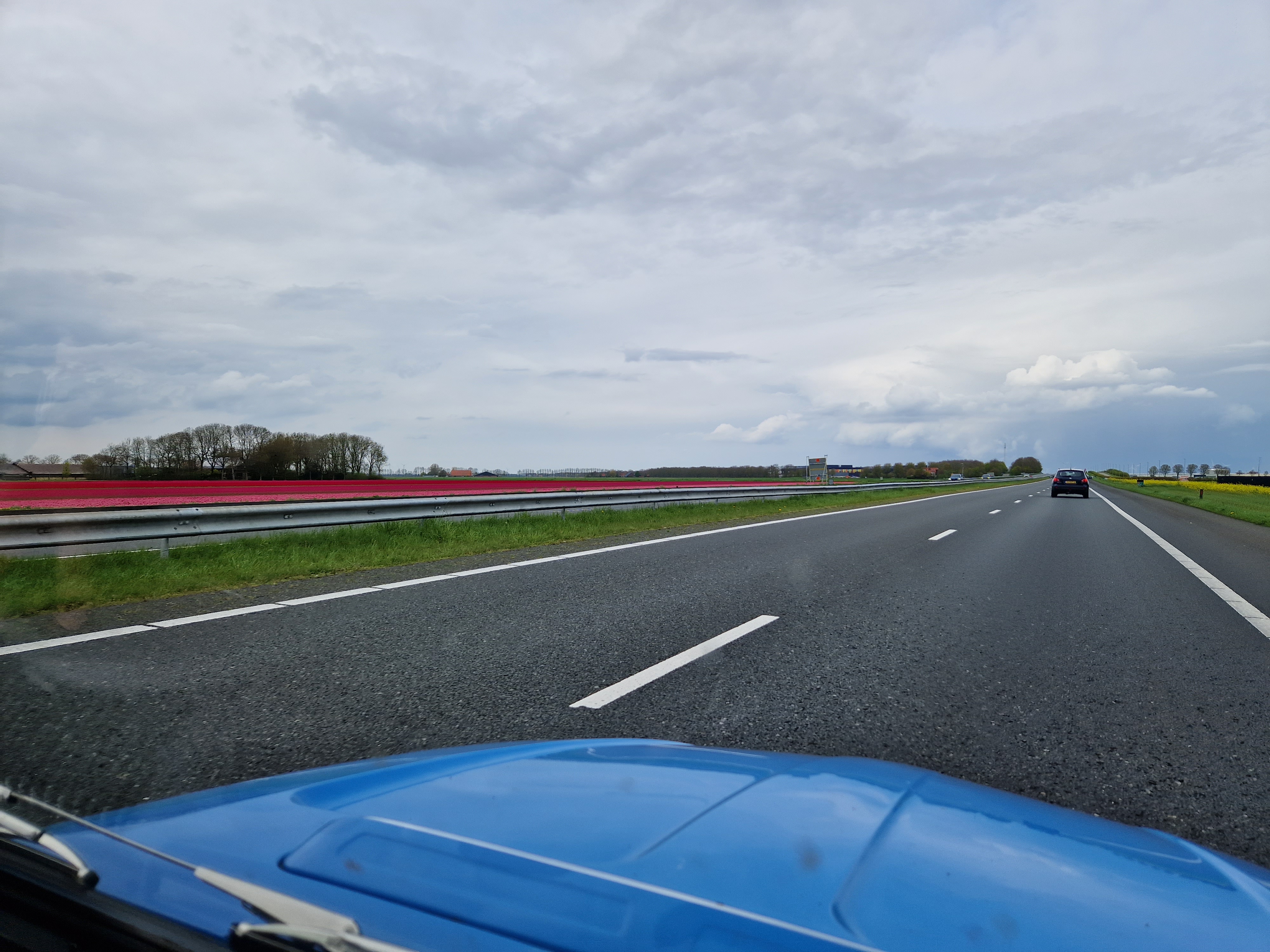 Dichtbij het eindpunt, bij een laatste leve-de-koningin-kleurig tulpenveld voorbij Tollebeek, doen we het dak dicht en zetten koers naar de A6-Lelystad-Enkhuizen-Middenmeer. Eenmaal op de dijk hebben we wind schuin mee en op de A7 helemaal. We redden de 100 km/u makkelijk. Tegenover het lelijke, verplichte, kotsgroen van de bedrijven op Agriport lichten de tulpen aan de overkant vrolijk roze-fuchsia-rood op. Als kleurrijke tegenhanger van het grauwe geld.