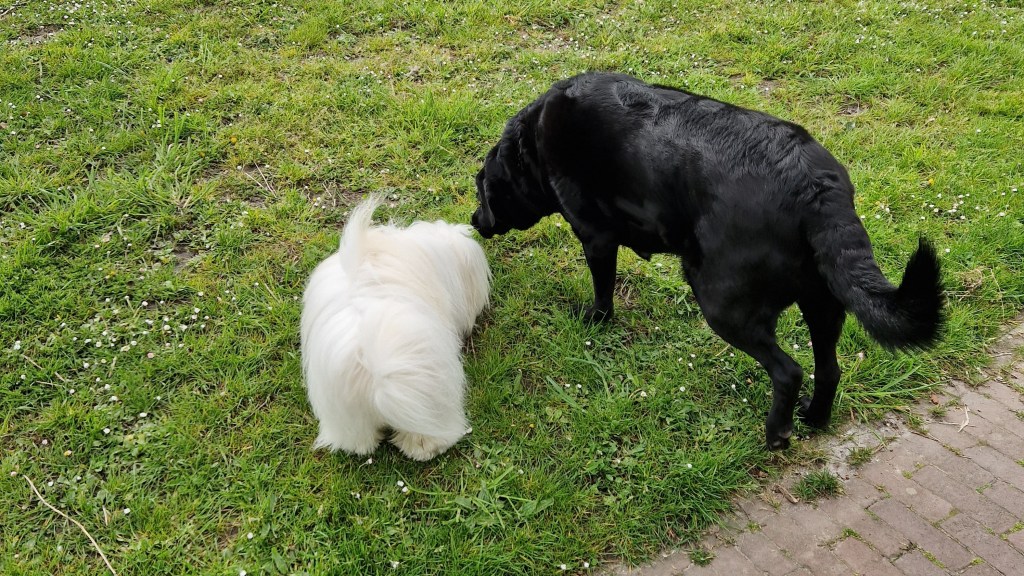 Ha, daar is Perry! Mijn grote krullerige vriend. Wil je spelen? Perry snapt ook niet waarom zij niet bij me is, maar spelen, dat lukt de oude vriend wel. Zijn mens doet iets met zijn mobieltje, we blijven waar we zijn. Spelen! Jammer dat Frits er niet bij is.