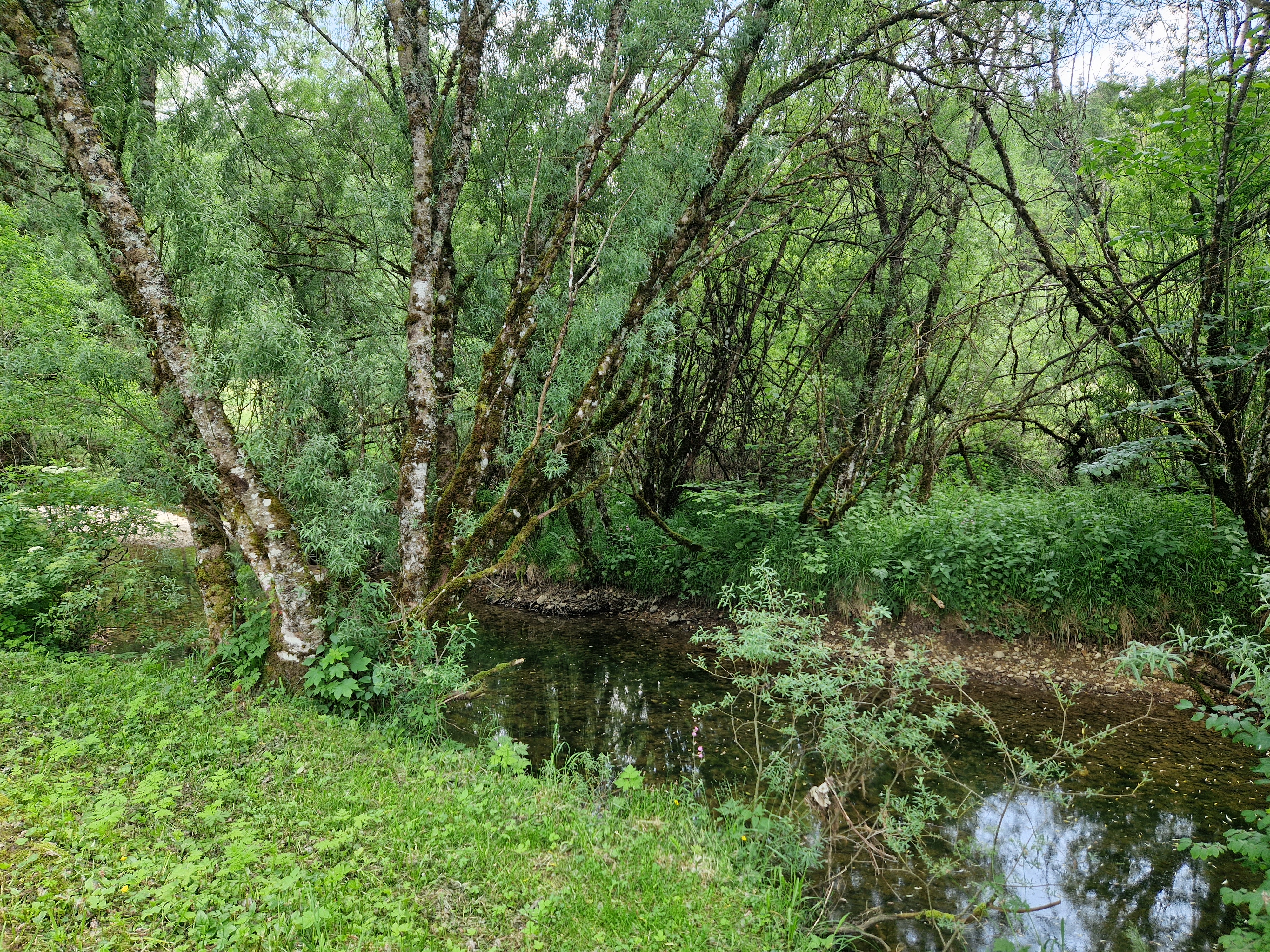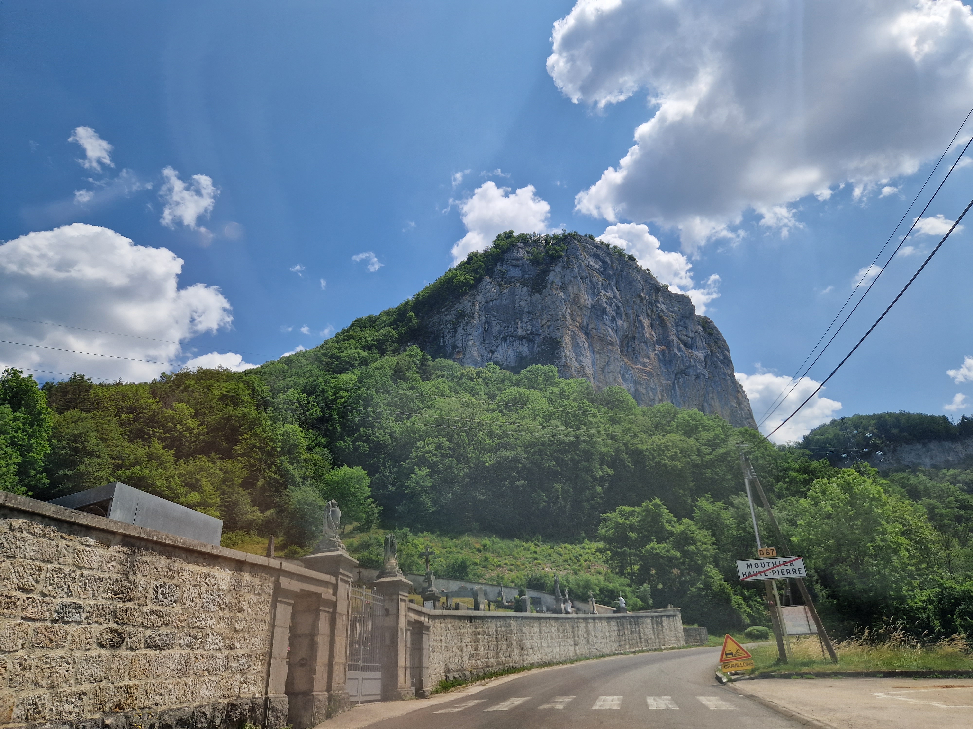 De eerste camping die ik heb uitgezocht ligt slechts 100 kilometer verderop. Leuk dorpje, dat Mouthier-Haut-Pierre, onder de rotsen. Het is een minicamping aan een bruisend watertje waar je niet bij kunt komen. Sanitair: 1 wc en 1 douche. En sterk verouderd, nog net niet vergaan. Nope, dit wordt hem toch niet.