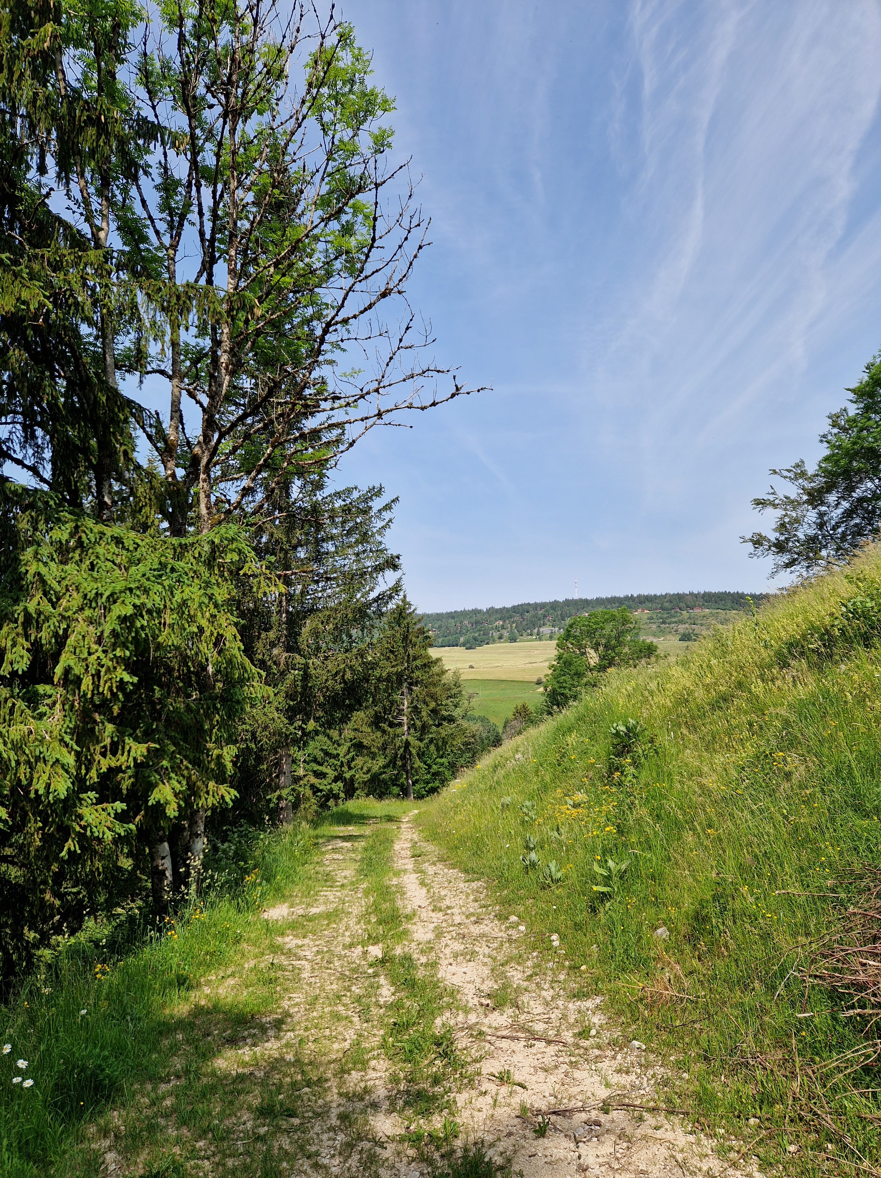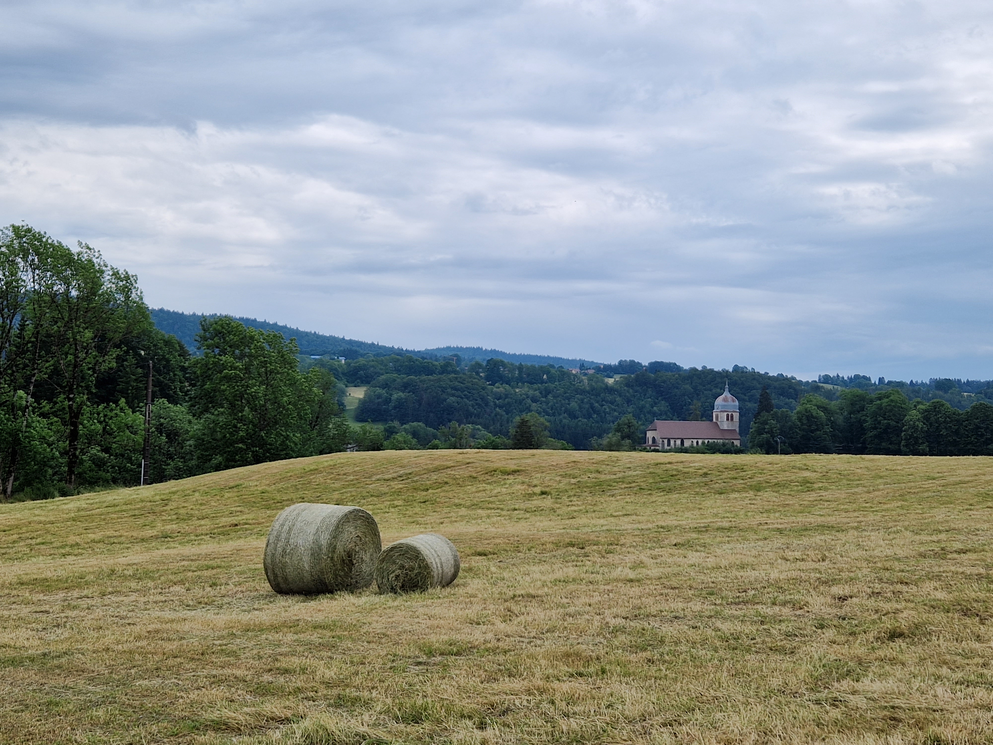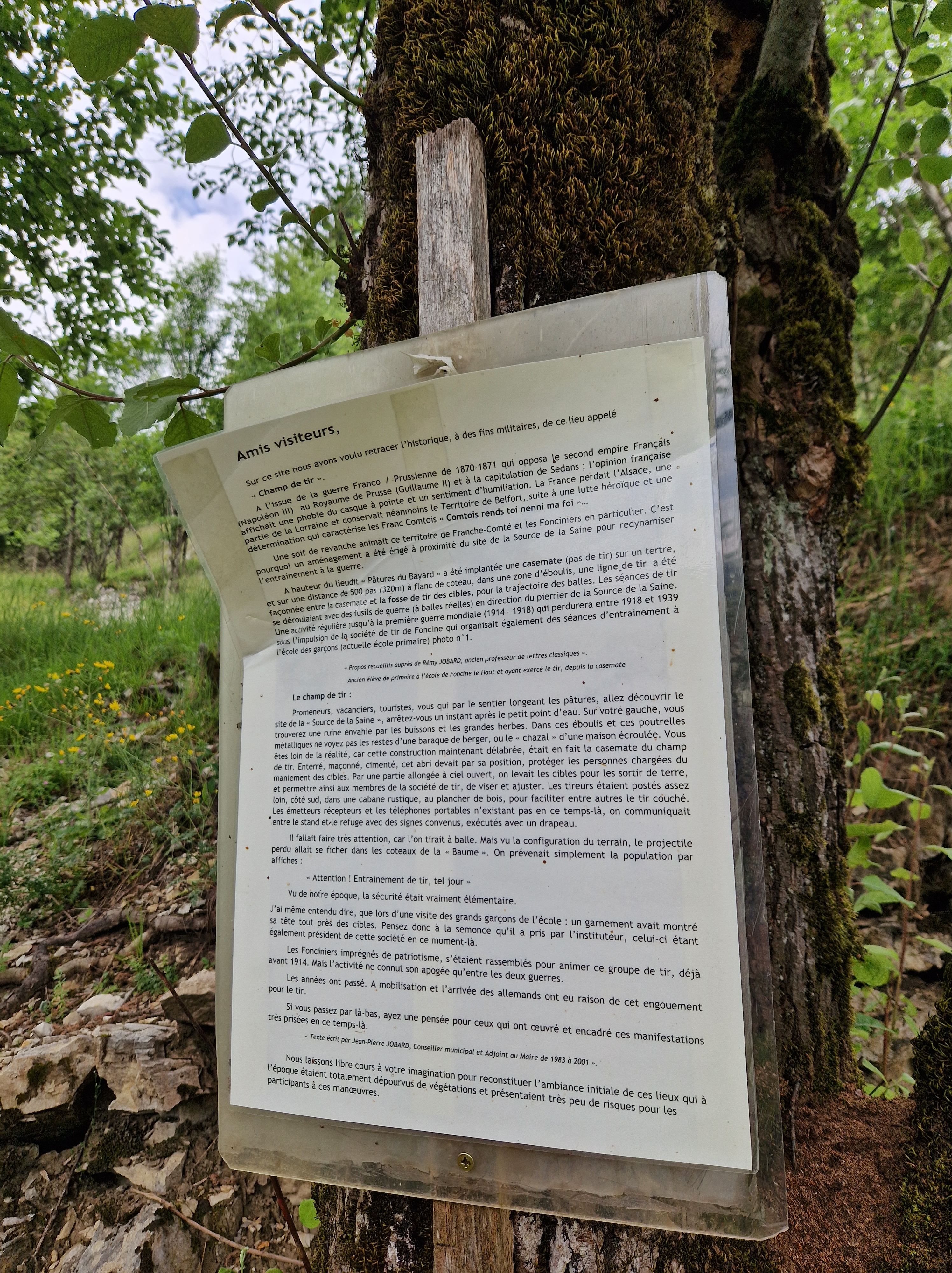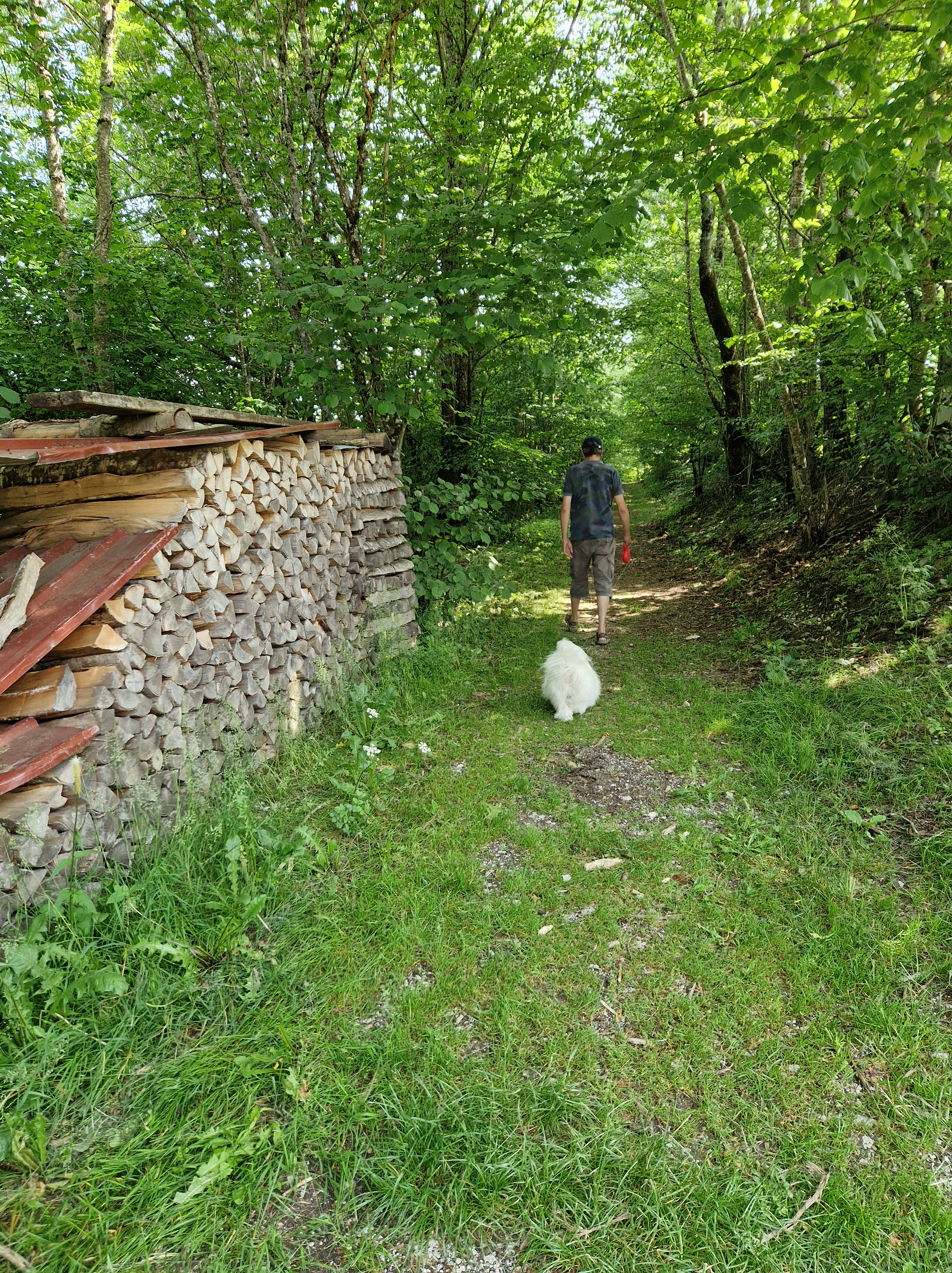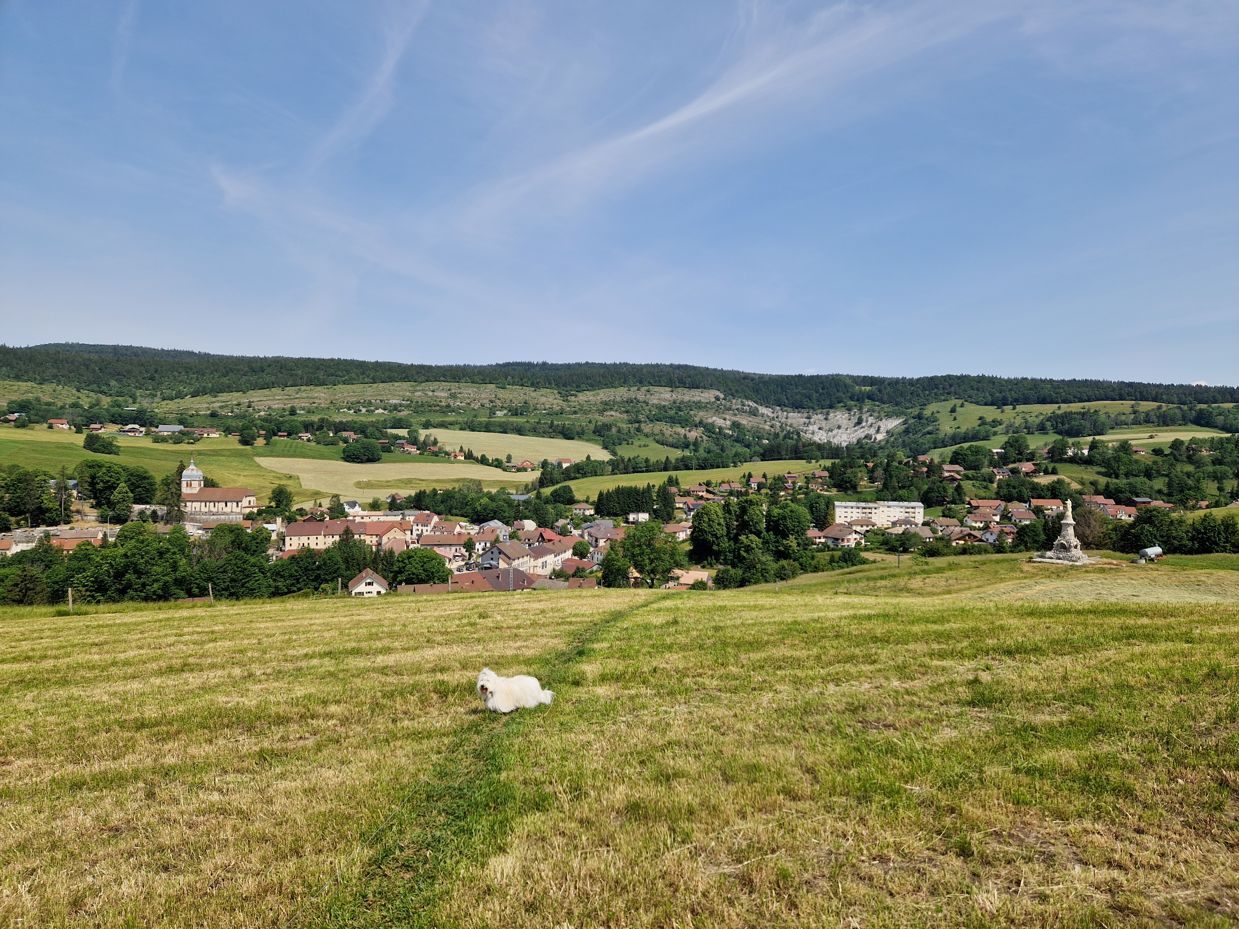 Hierna gaan we op zoek naar de bron. La Source de la Saine om precies te zijn. Niet te verwarren met dat water dat door Parijs stroomt. Na een stukje omhoog gelopen te hebben, komen we door een gehuchtje van waaruit het wandelpad zich tussen de weilanden door slingert. Koeien? Die liggen lui te herkauwen en bekijken ons nietige mensjes met ons nietige hondje vanuit de hoogte.