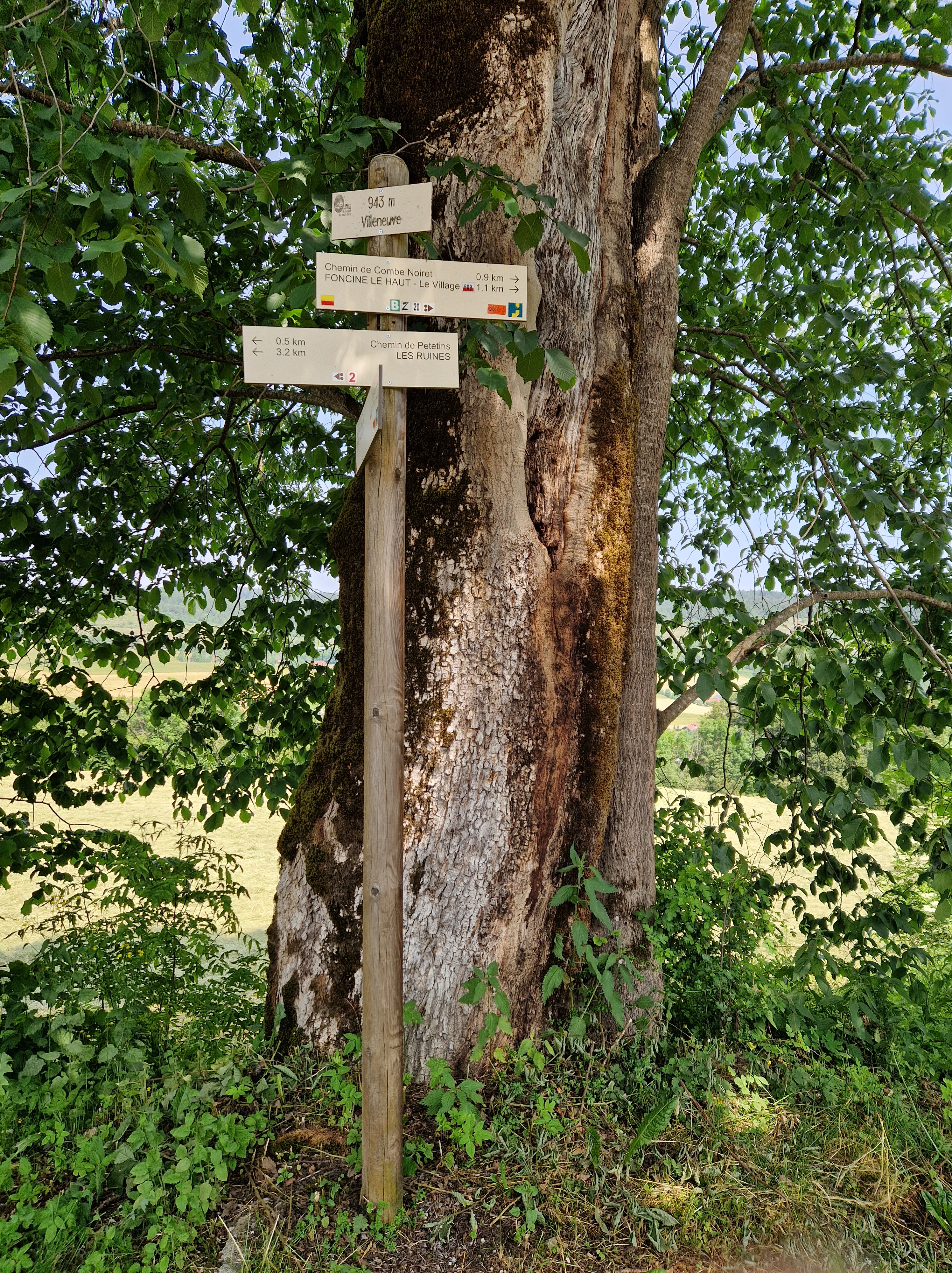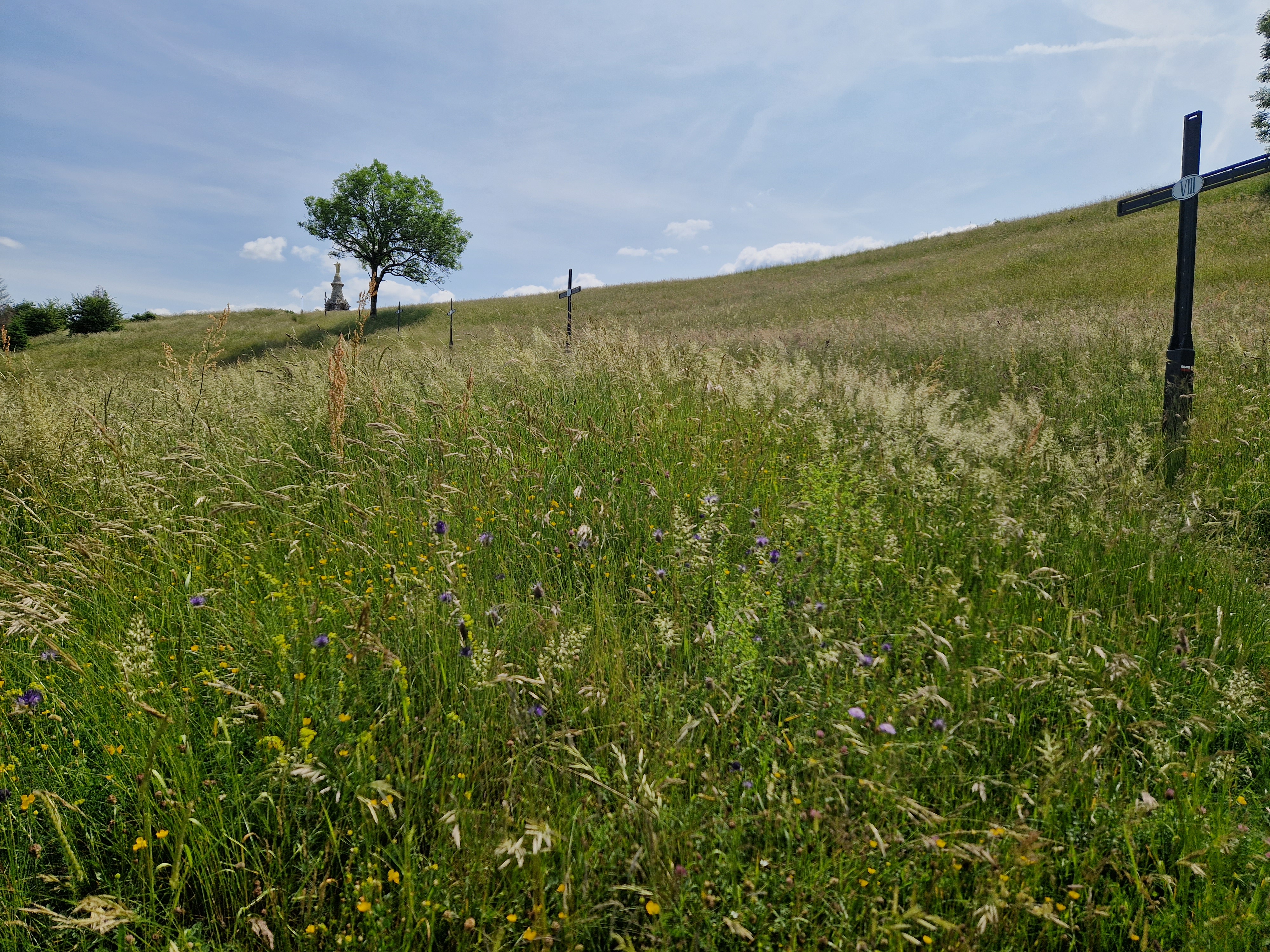 Vlak voor het dorp lopen we de kruisweg af vanaf het Christusbeeld. Langs het pad staan 14 metalen genummerde kruisen. Dat heb ik overigens pas door als ik er al 5 gepasseerd ben. Het beeld zelf staat op een wat pokdalig heuveltje van kalksteen. Mijn foto’s met tegenlicht geven dat niet goed weer, het is meer een sfeerimpressie.