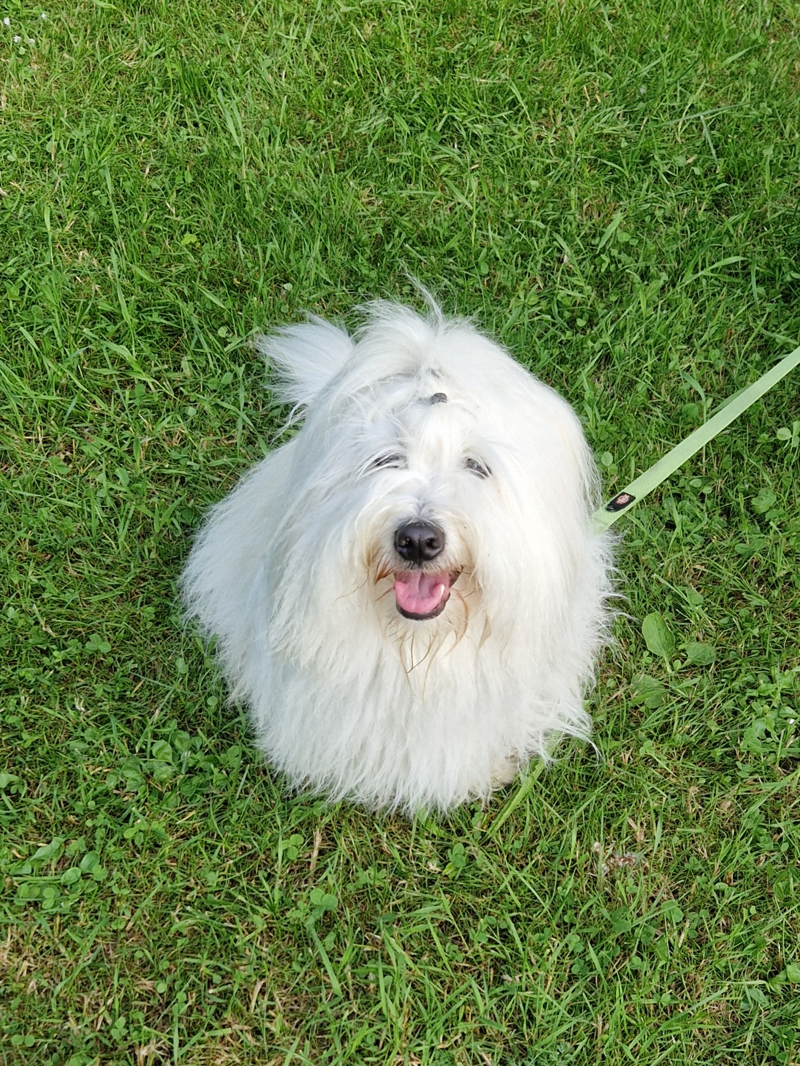 Bij de tent borstel ik Ravi. Hij ziet er een halve seconde mooi uit voor hij in het gras en de bloempluizen gaat liggen rollen. Daarna is hij groen uitgeslagen met zwart-witte spikkels van de uitgebloeide bloesems.