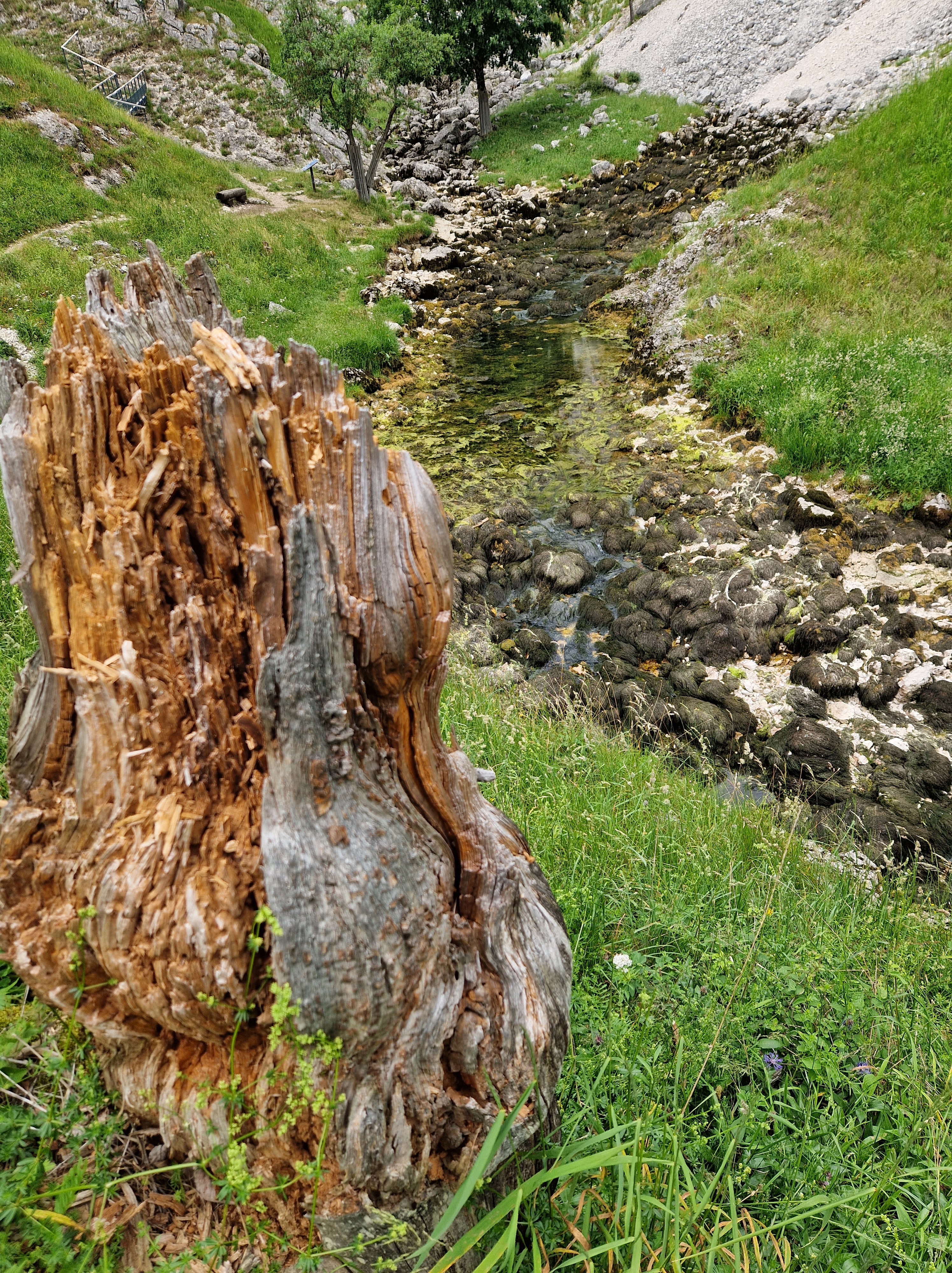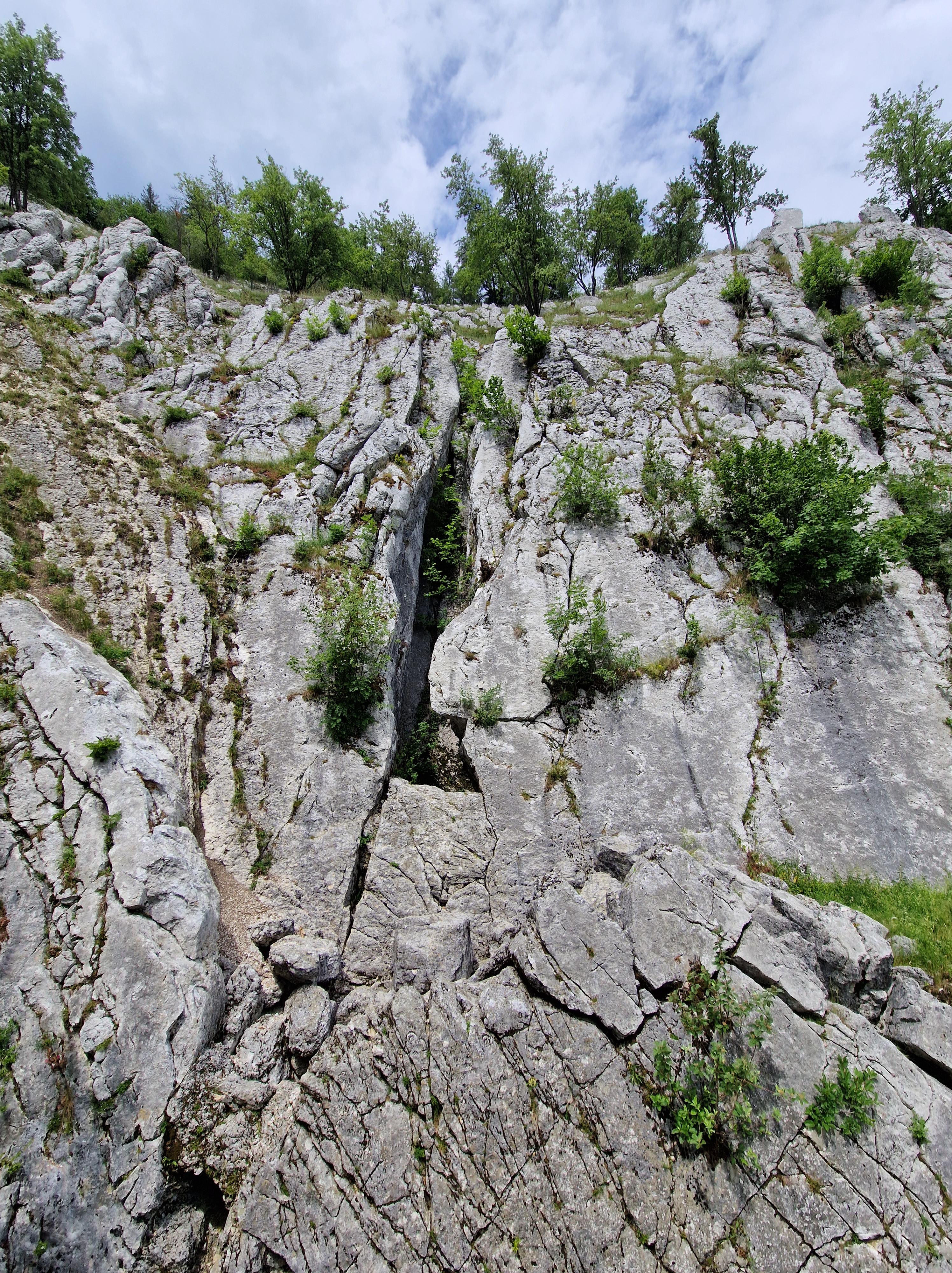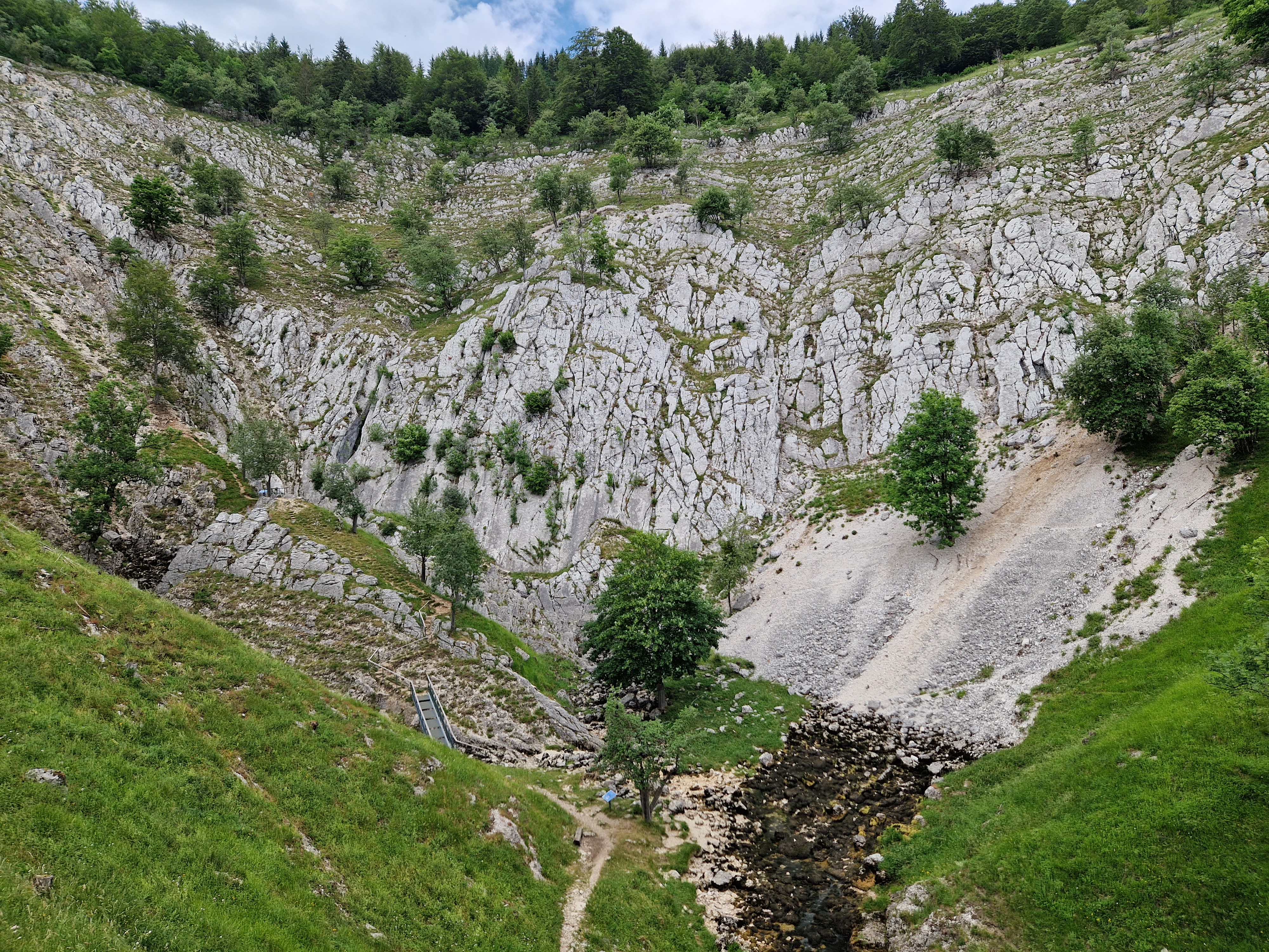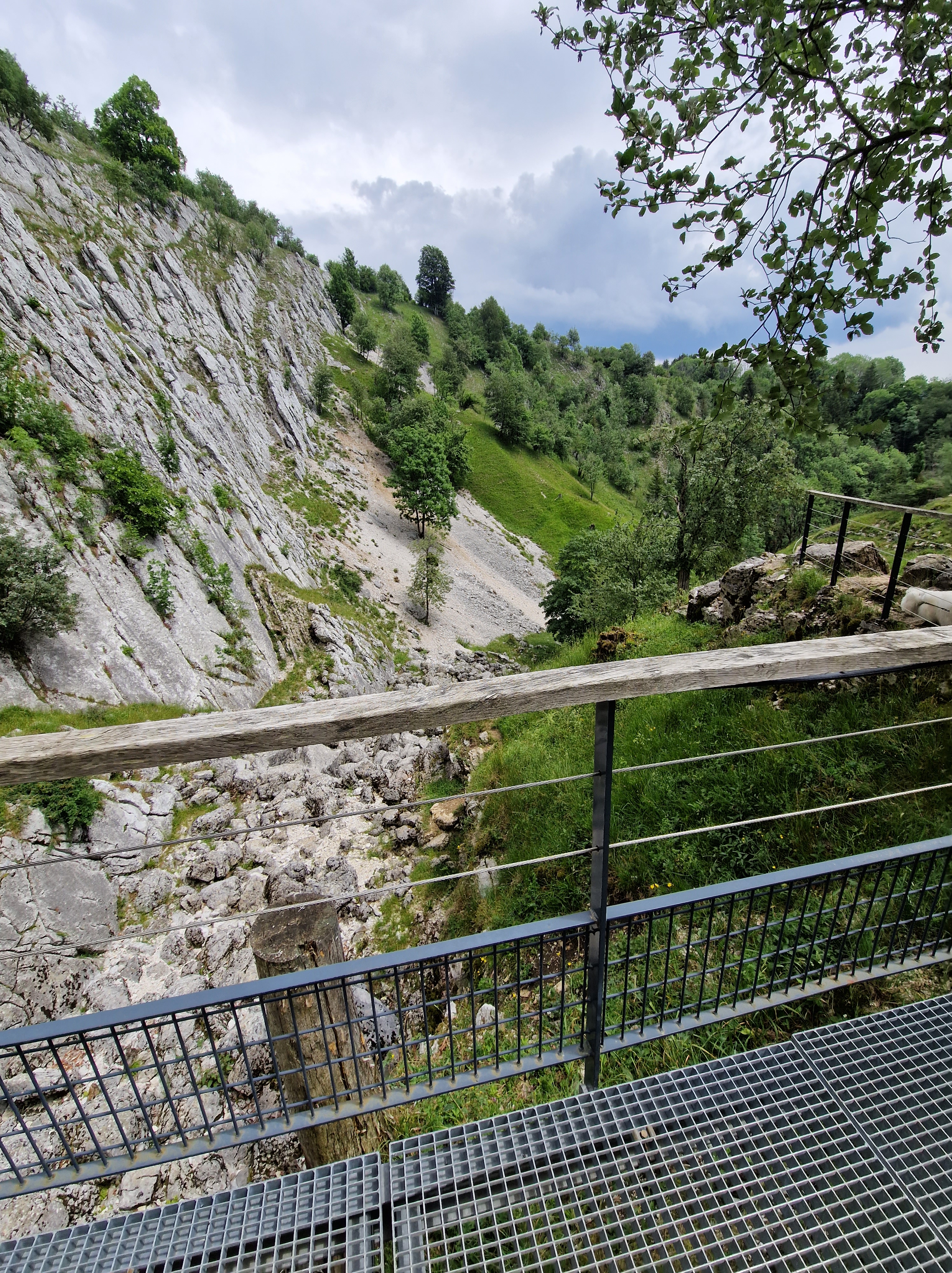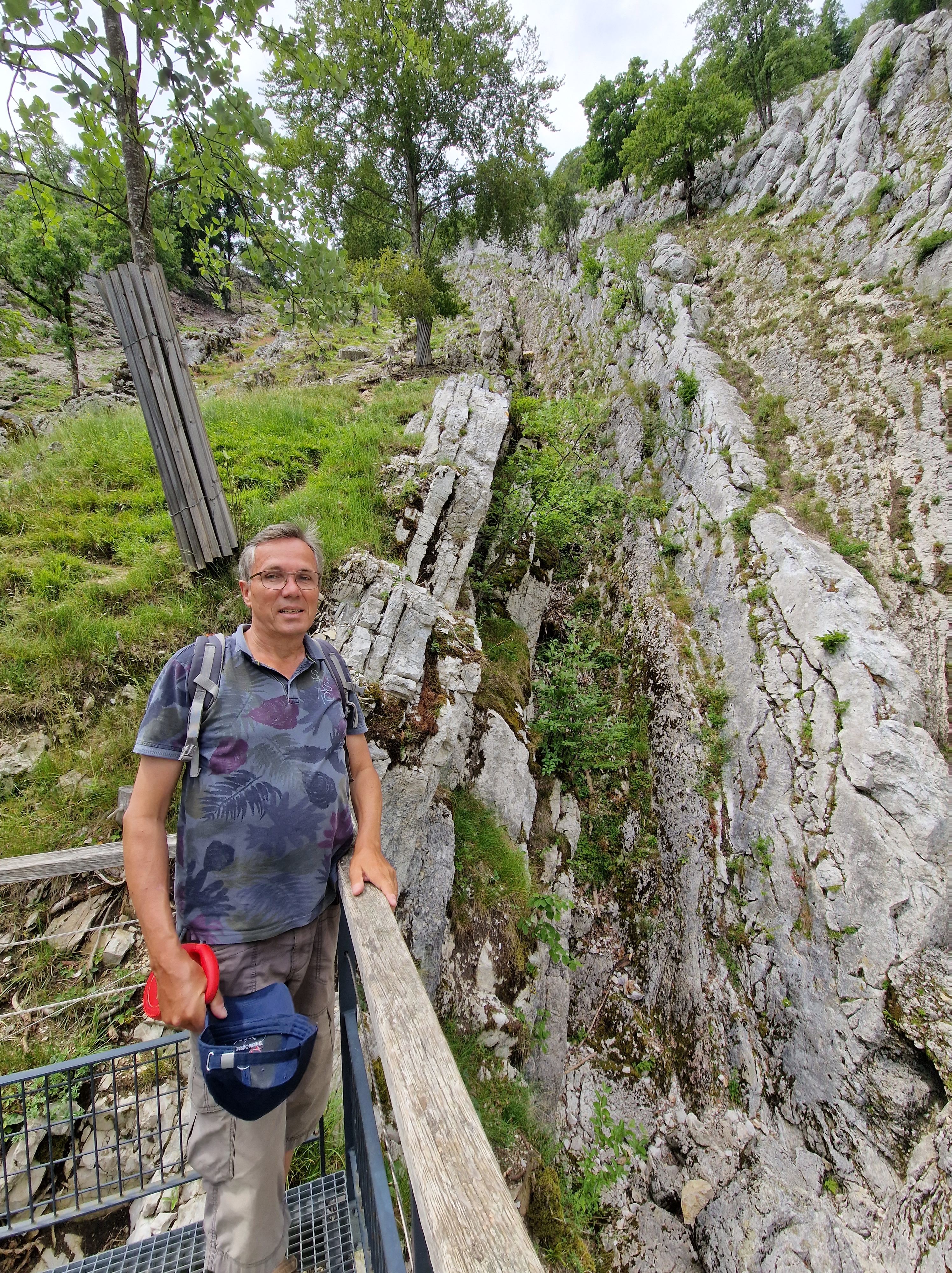 We passeren een opgegraven kazemat (vuurpunt) op een heuvel met tekst en uitleg over het 19e-eeuwse semimilitaire oefenterrein, de vuurlinie en de schietkuil richting de rotswand. Het uitzicht op die puinhelling van door water verpulverd karst-gesteente, is best indrukwekkend. Het pad ernaartoe bestaat uit gravel, gruis en stenen waar ik lenig als een gazelle op mijn birkies overheen hups. Niet echt dus, verre van charmant zelfs, maar ik red het. Op het hoogste punt is een stalen stellage met trappen en roosters aangelegd om tot het hoogste punt te geraken. We zitten wederom boven de 900 meter. Dat verklaart de ademnood (is mijn excuus).
