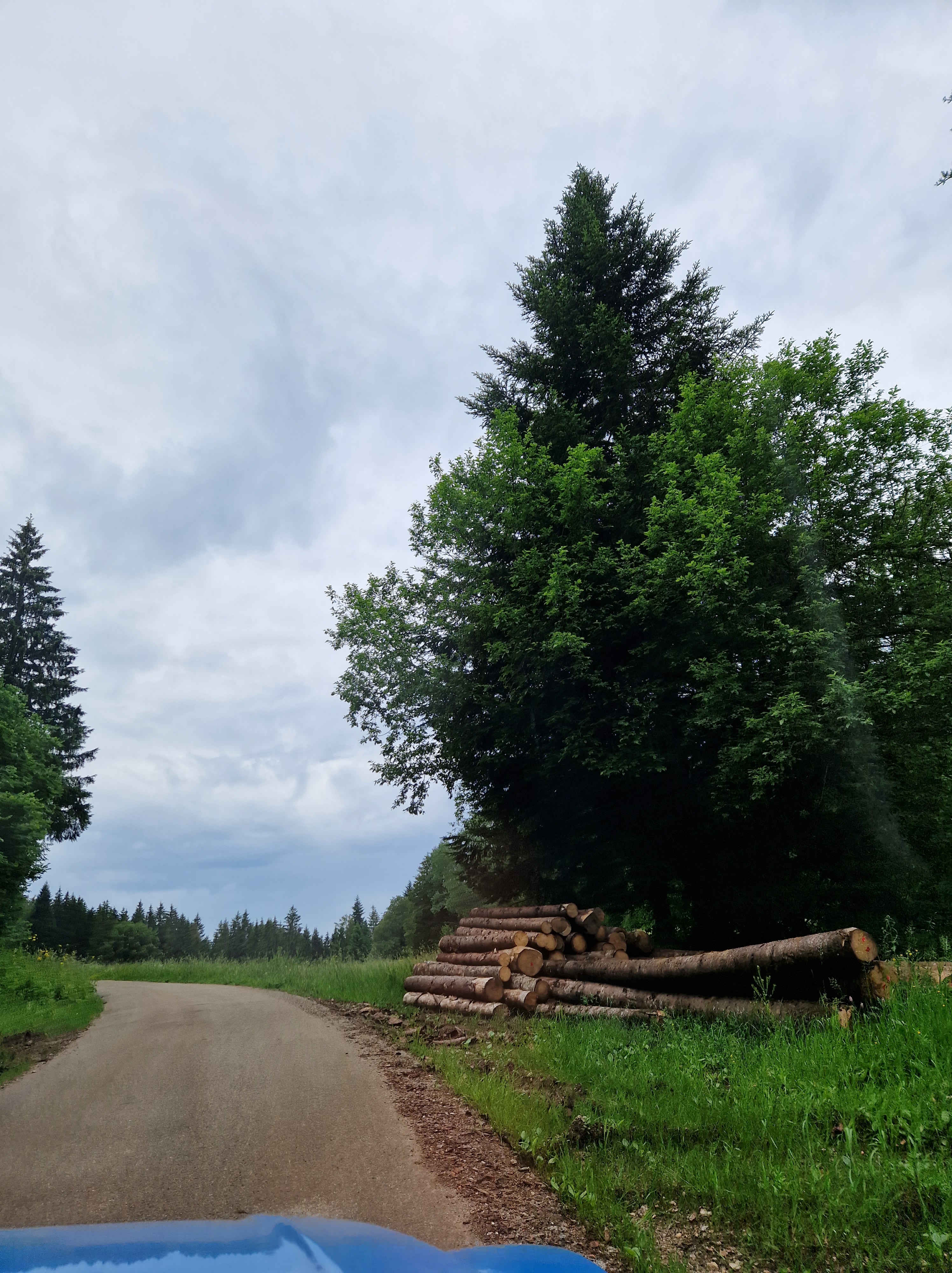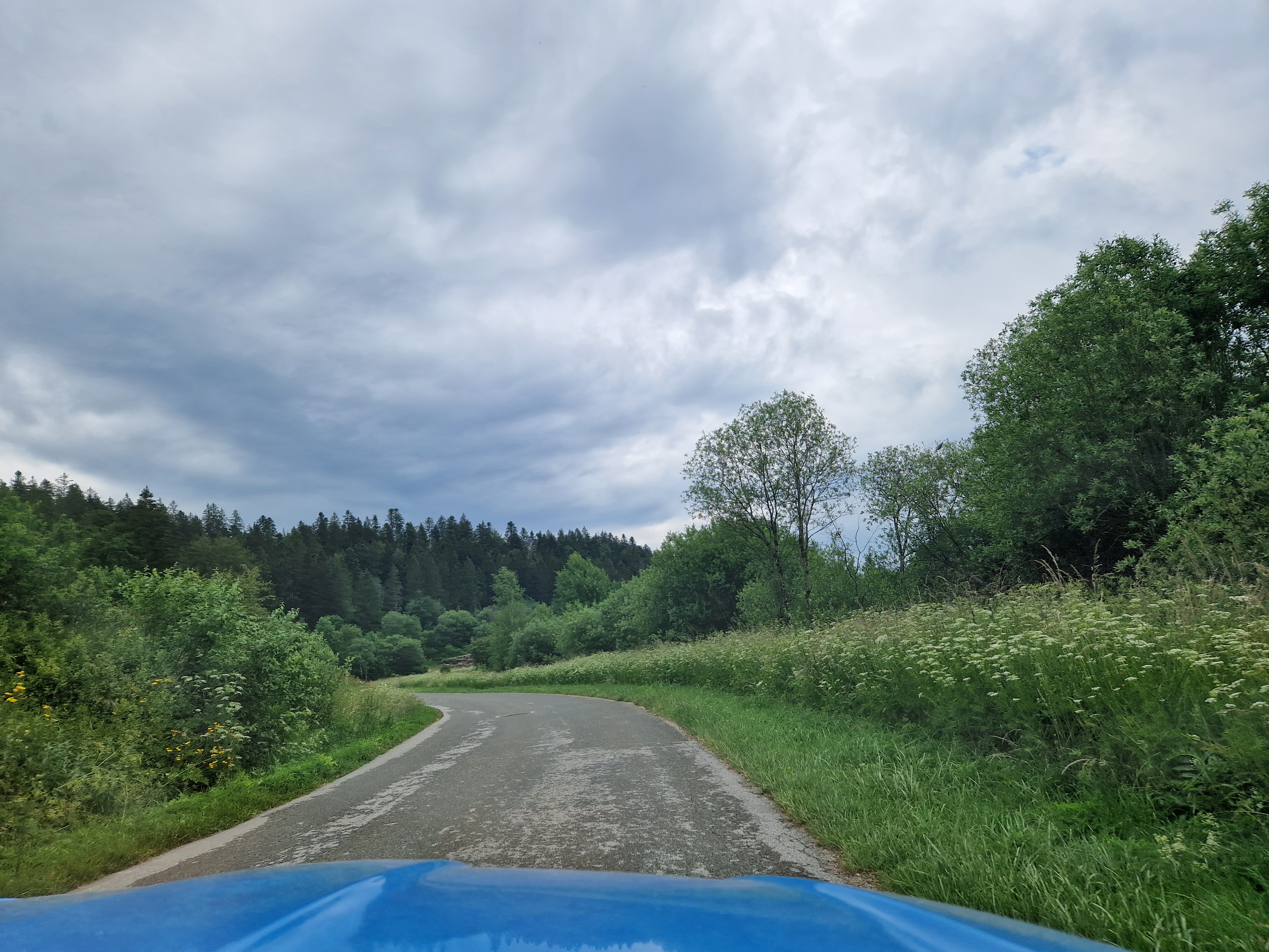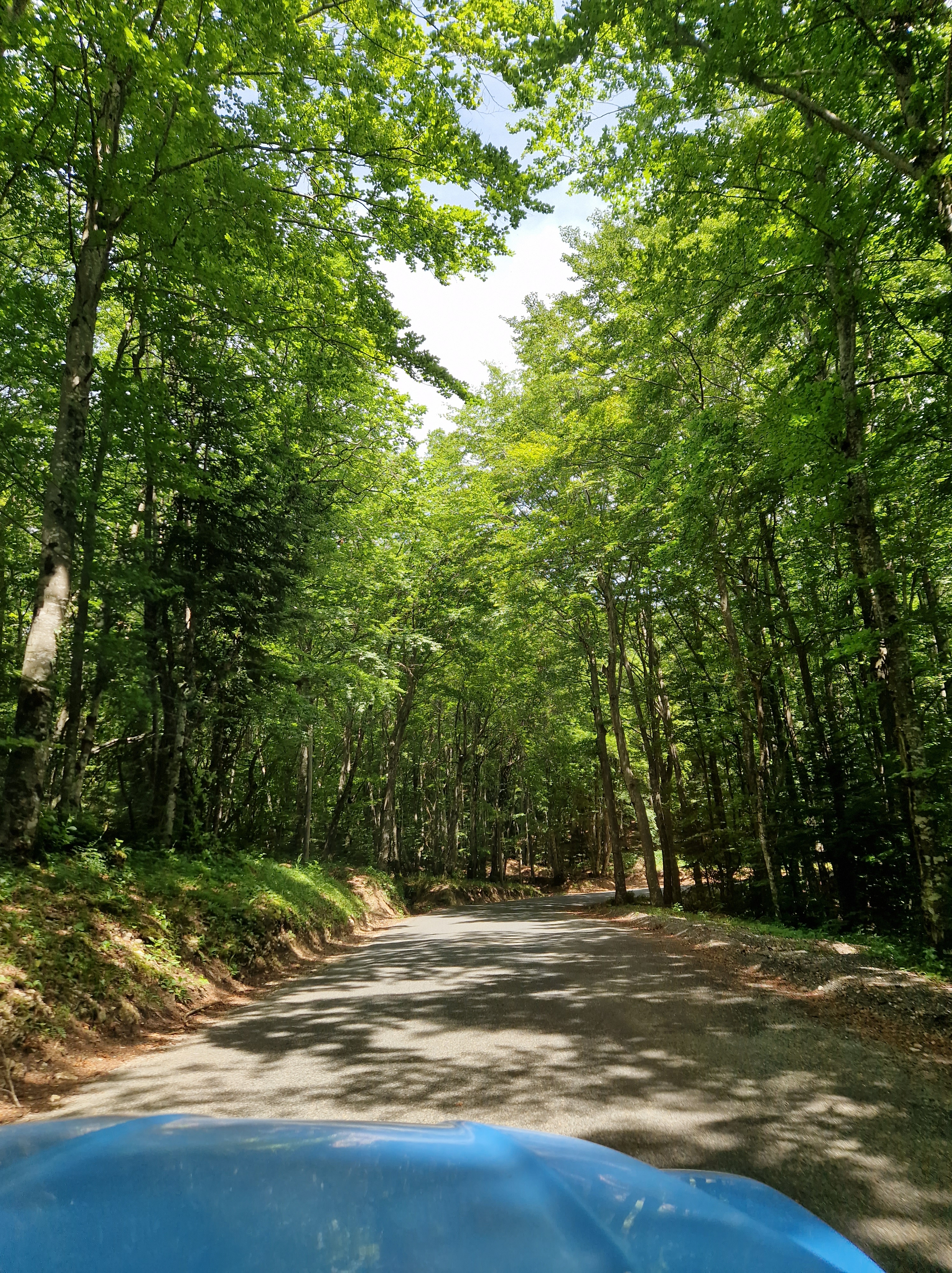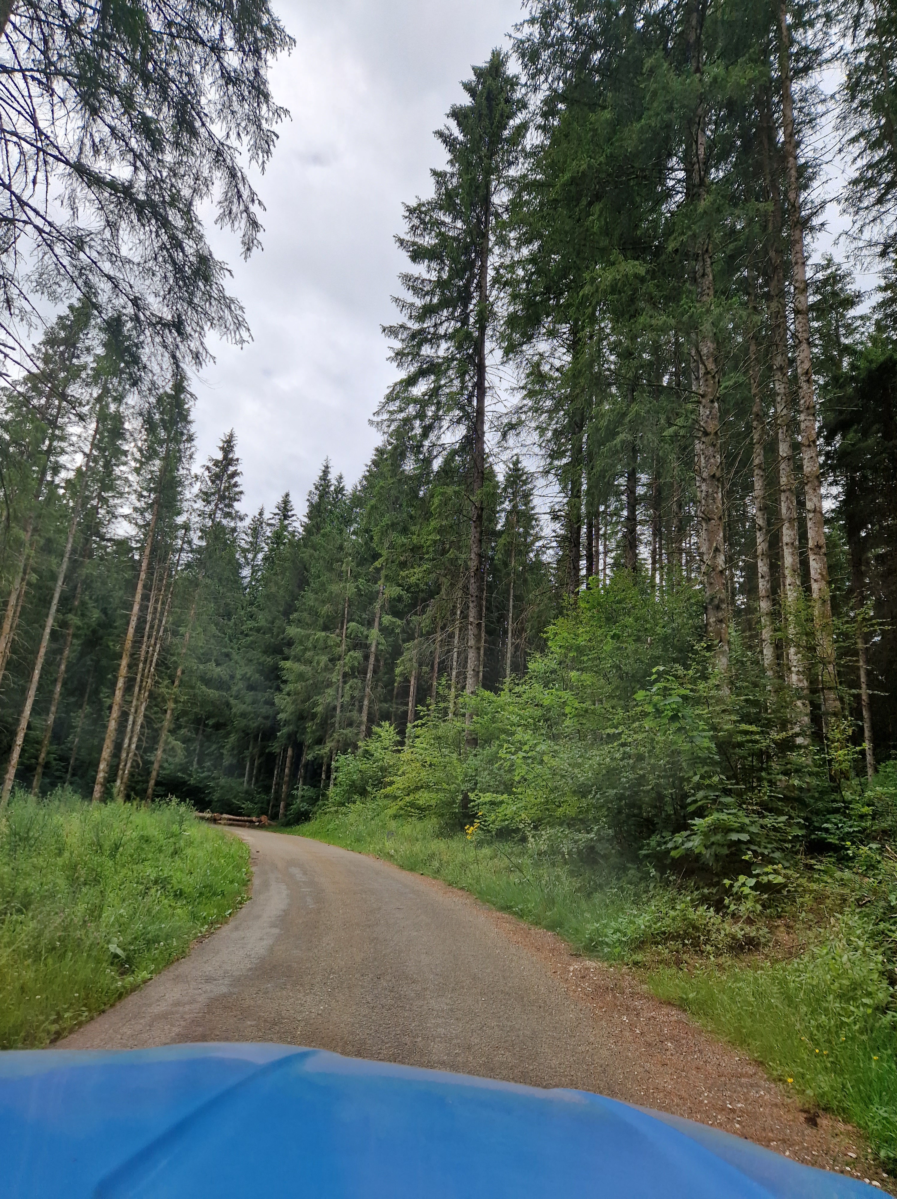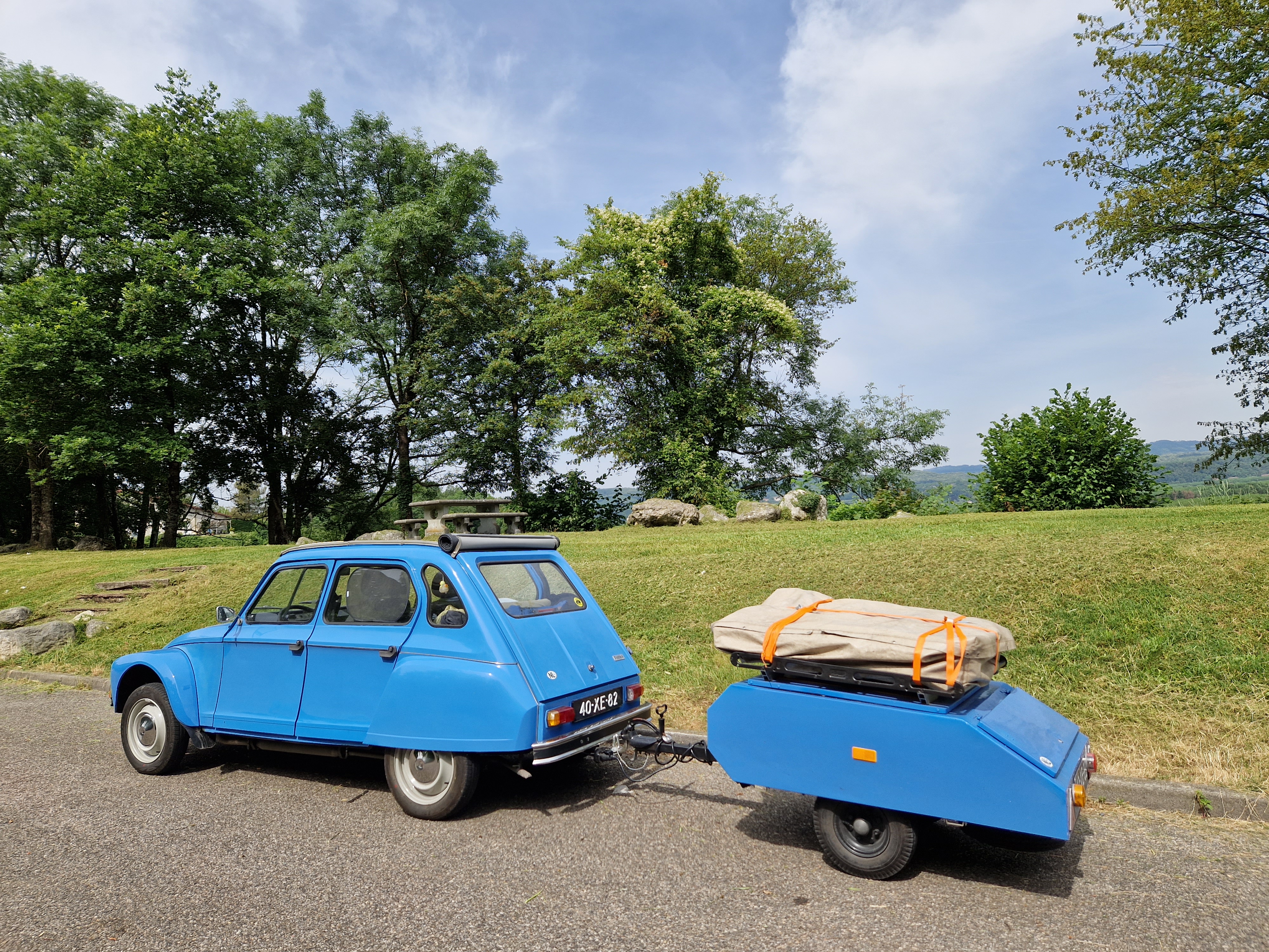 Gijs heeft een rechtstreekse kronkelroute naar Grenoble uitgezet waar we wel de hele dag zoet mee zullen zijn. Na een uurtje stranden we al op een steil gravelpad in het bos. Dat is iets te gevaarlijk, zwaar beladen als we zijn. Gijs manoeuvreert achteruit om te kunnen keren, niet zonder de nodige zweetdruppels wanneer het karretje gaat scharen op de kiezels.