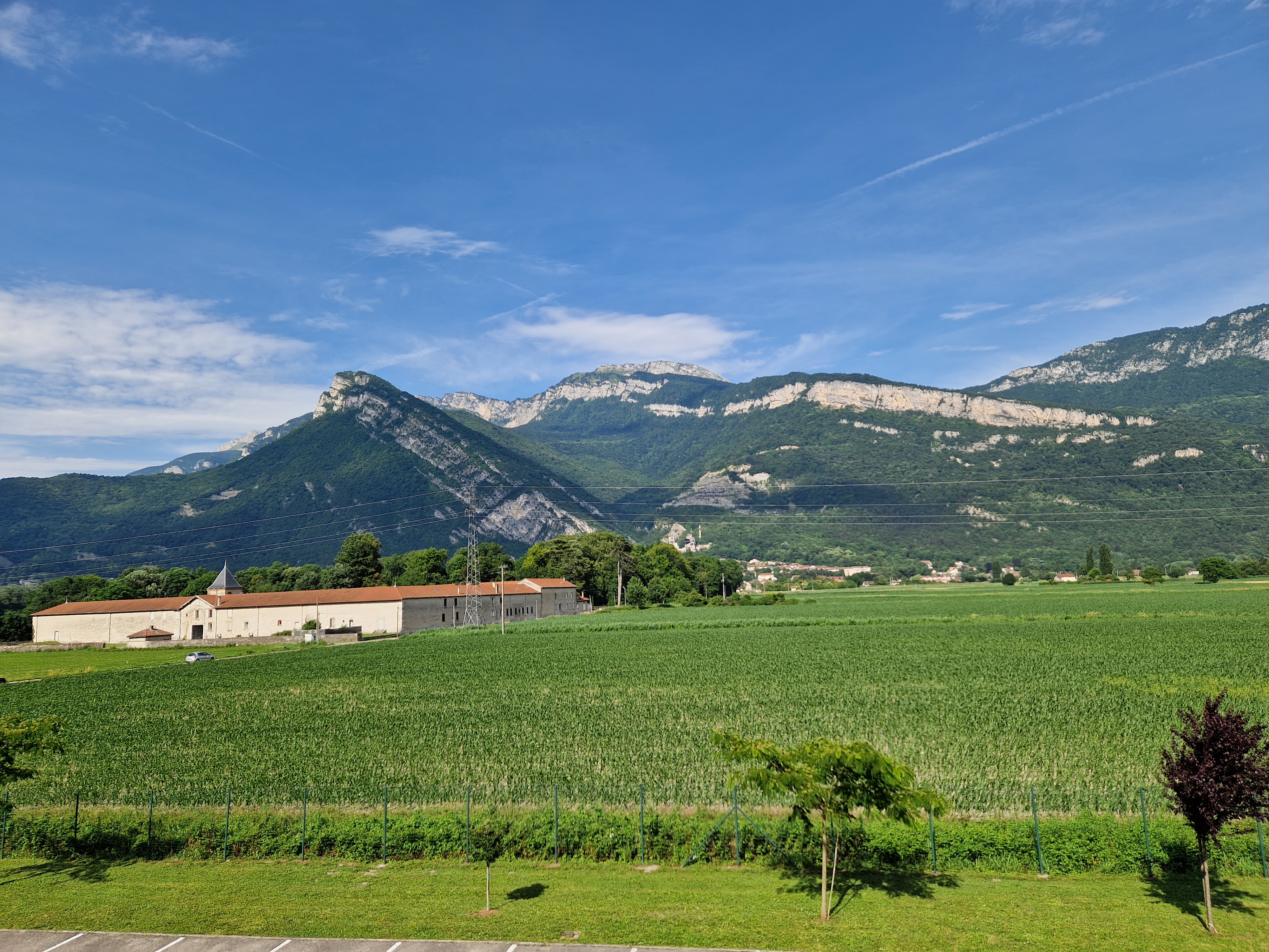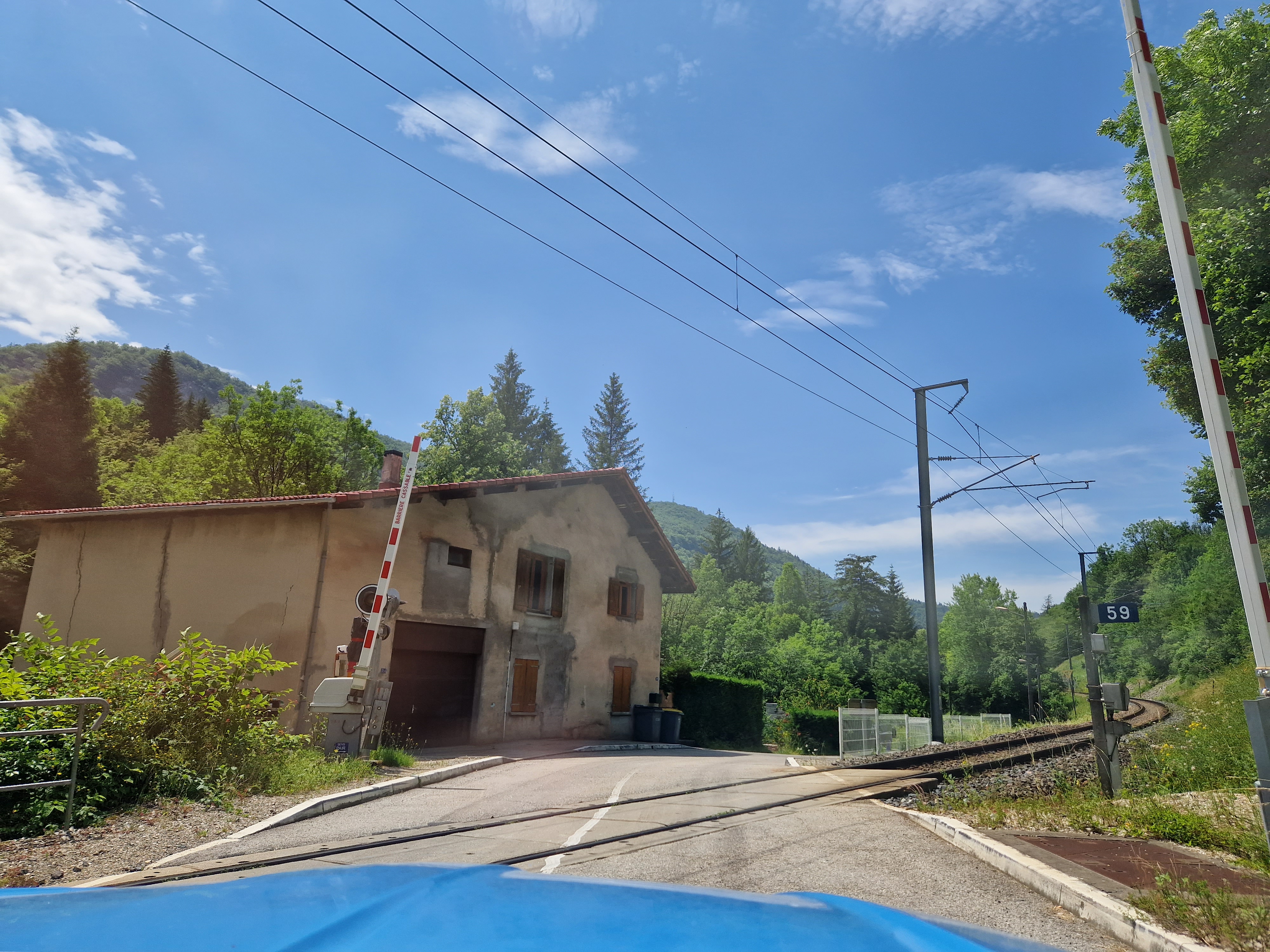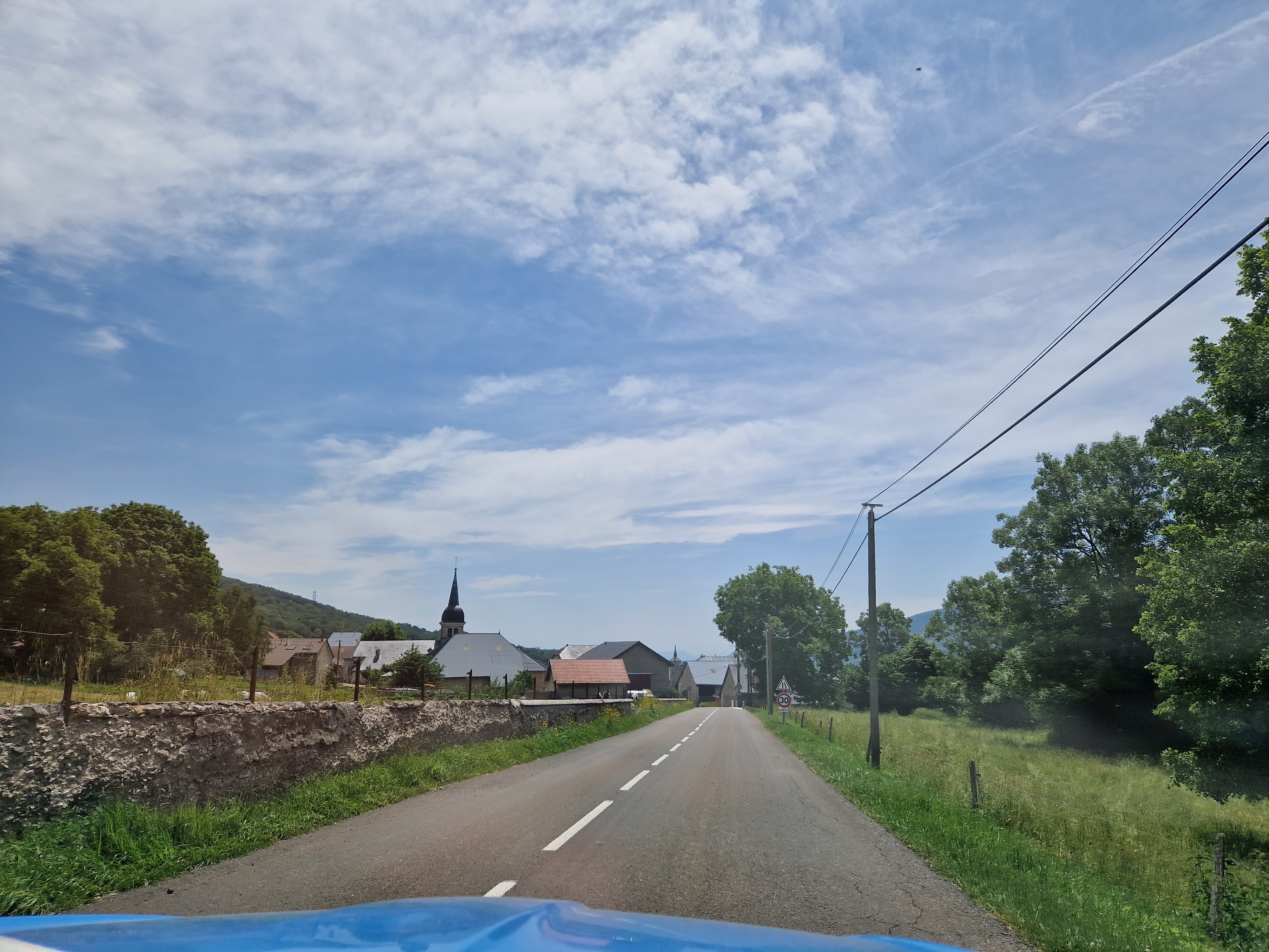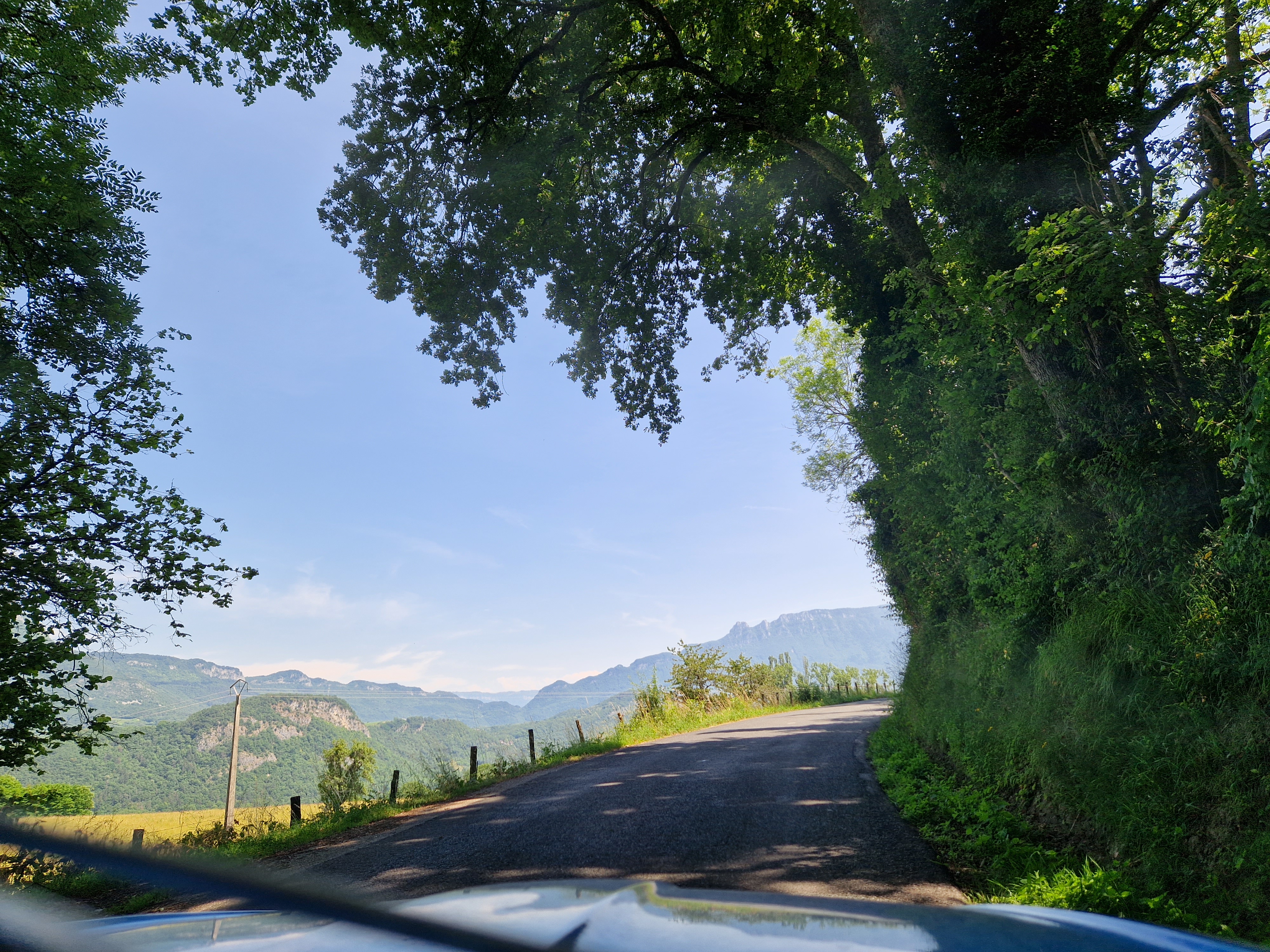Buiten Voreppe stuurt Tom ons na de steengroeve een steil plaatsje in, de berg op. Loodrecht, in haarspelden, tussen de huizen door. Muren aan elke kant, geen idee wat we moeten doen als er een tegenligger aankomt. Laat staan de schoolbus. Het bovenste weggetje waar we volgens Tom in moeten draaien… loopt dood! Dat betekent op anderhalve vierkante meter keren, tussen de muurtjes, op 25% helling. Ik krijg m’n deur niet eens open, zo scheef staan we. Gijs redt het, onder toeziend oog van een bewoonster. Slechts twee keer steken en we duiken de berg weer af.