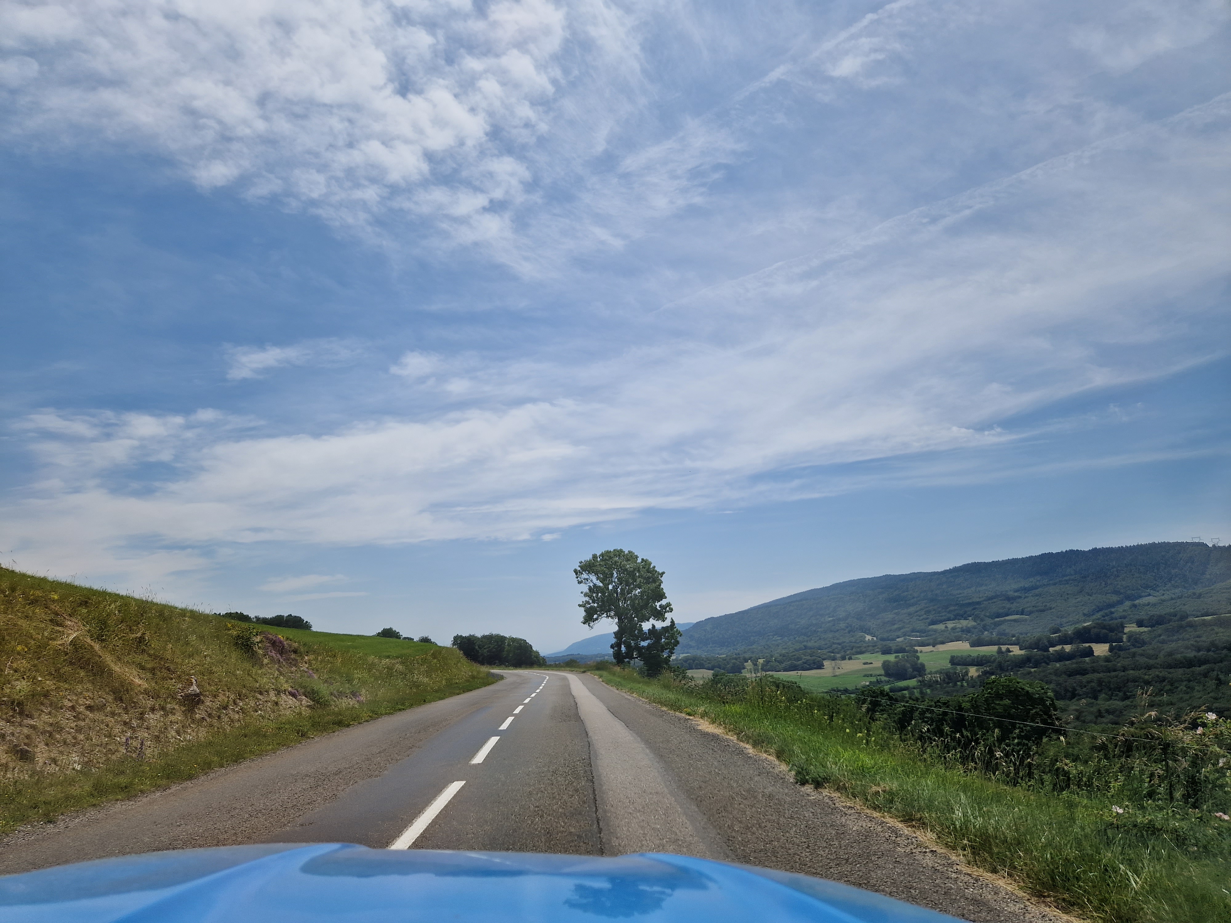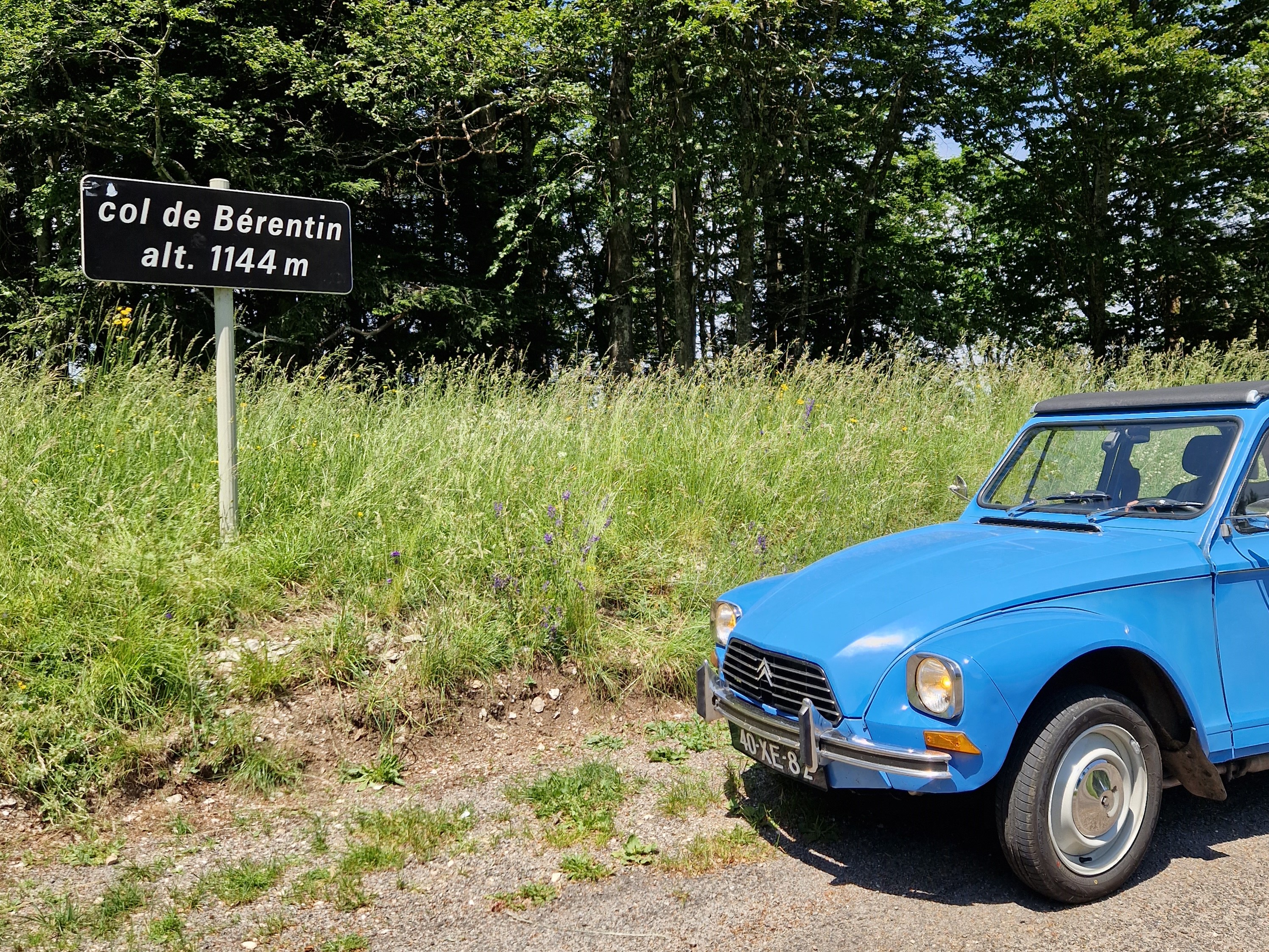 Beneden prikken we een nieuwe route en dan gaat het beter. Ik schrijf niet steeds mee, het is bochtig genoeg. Het weer klaart steeds meer op, het dak blijft wijselijk dicht. We nemen de ene Col na de andere, met 6-7% in z’n twee omhoog (zoals Col de Berentin, 1144 meter) of met 20% in z’n één omlaag. Je maakt eens wat mee.