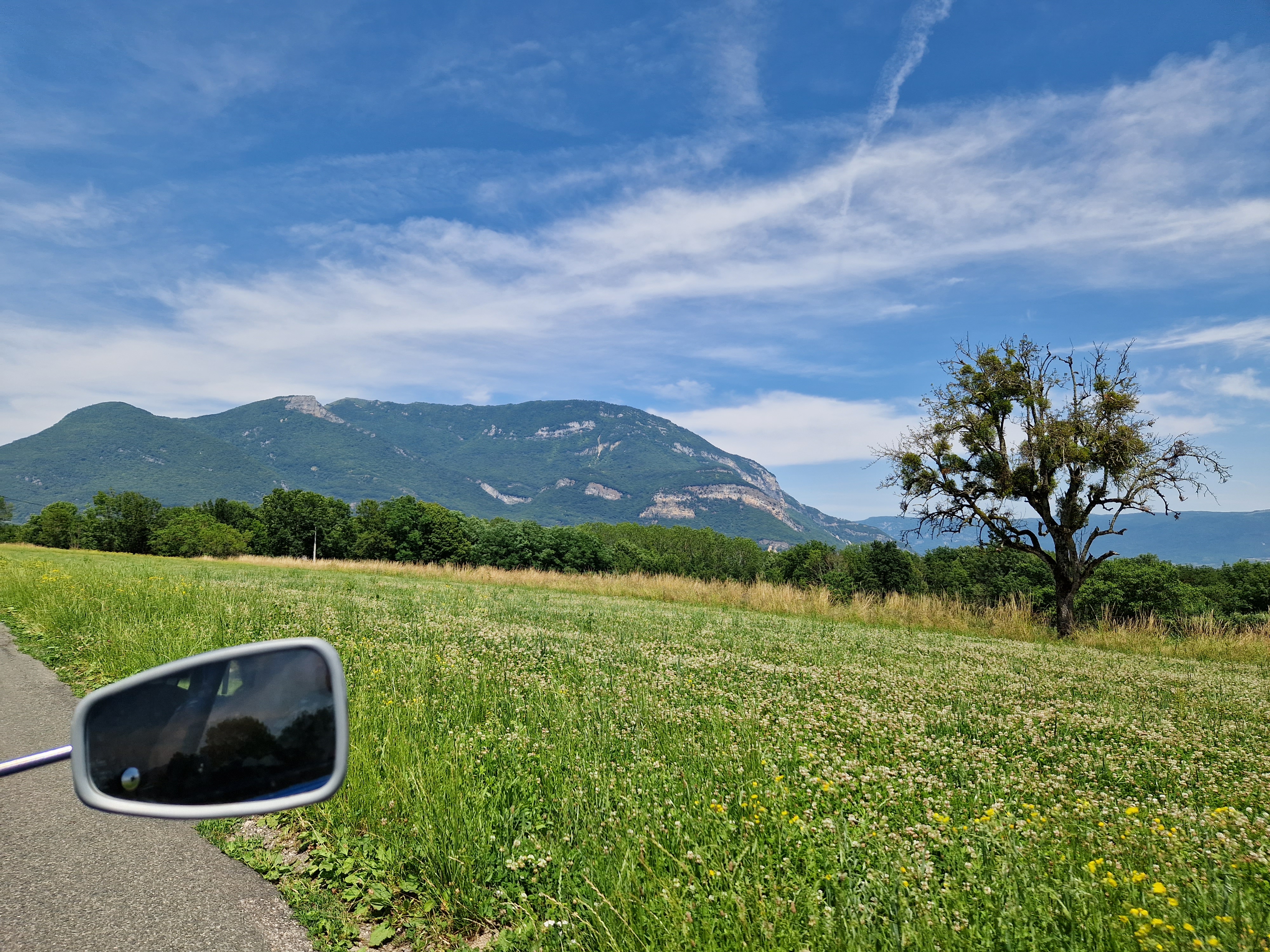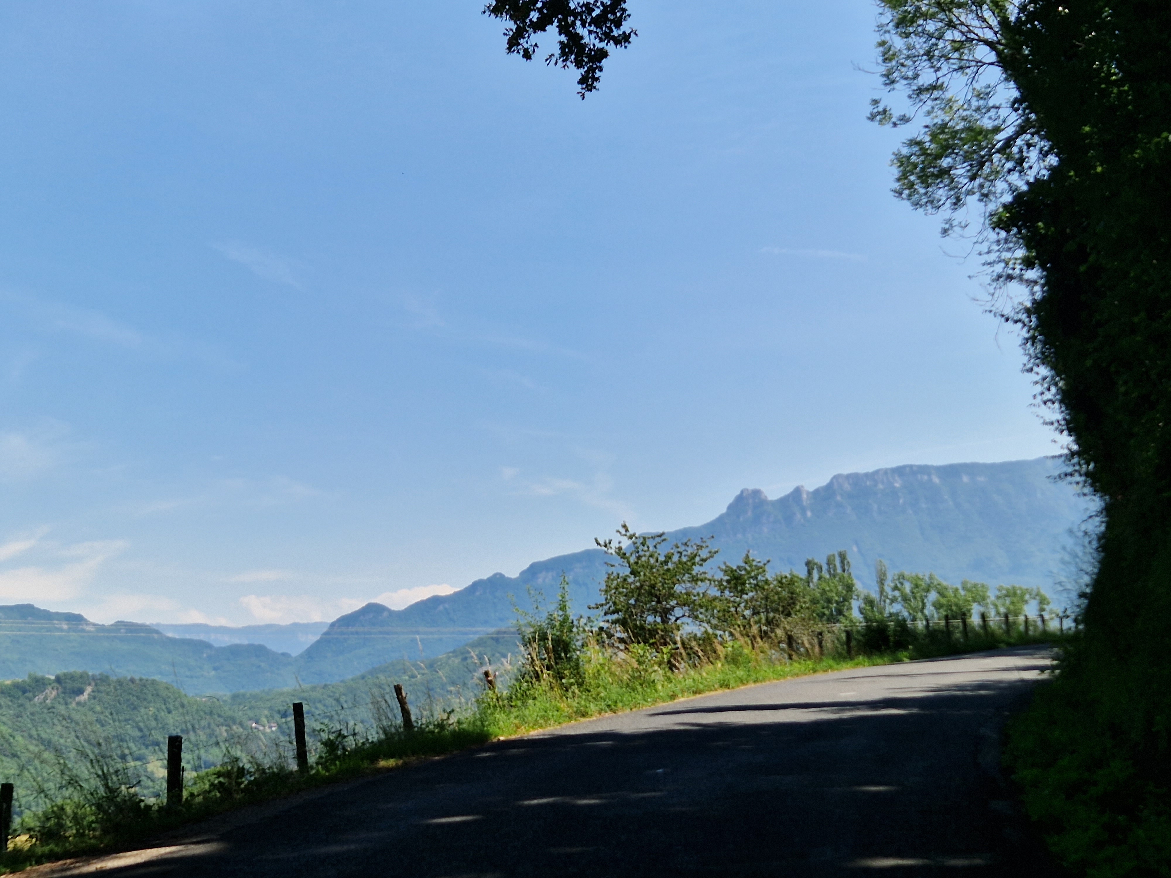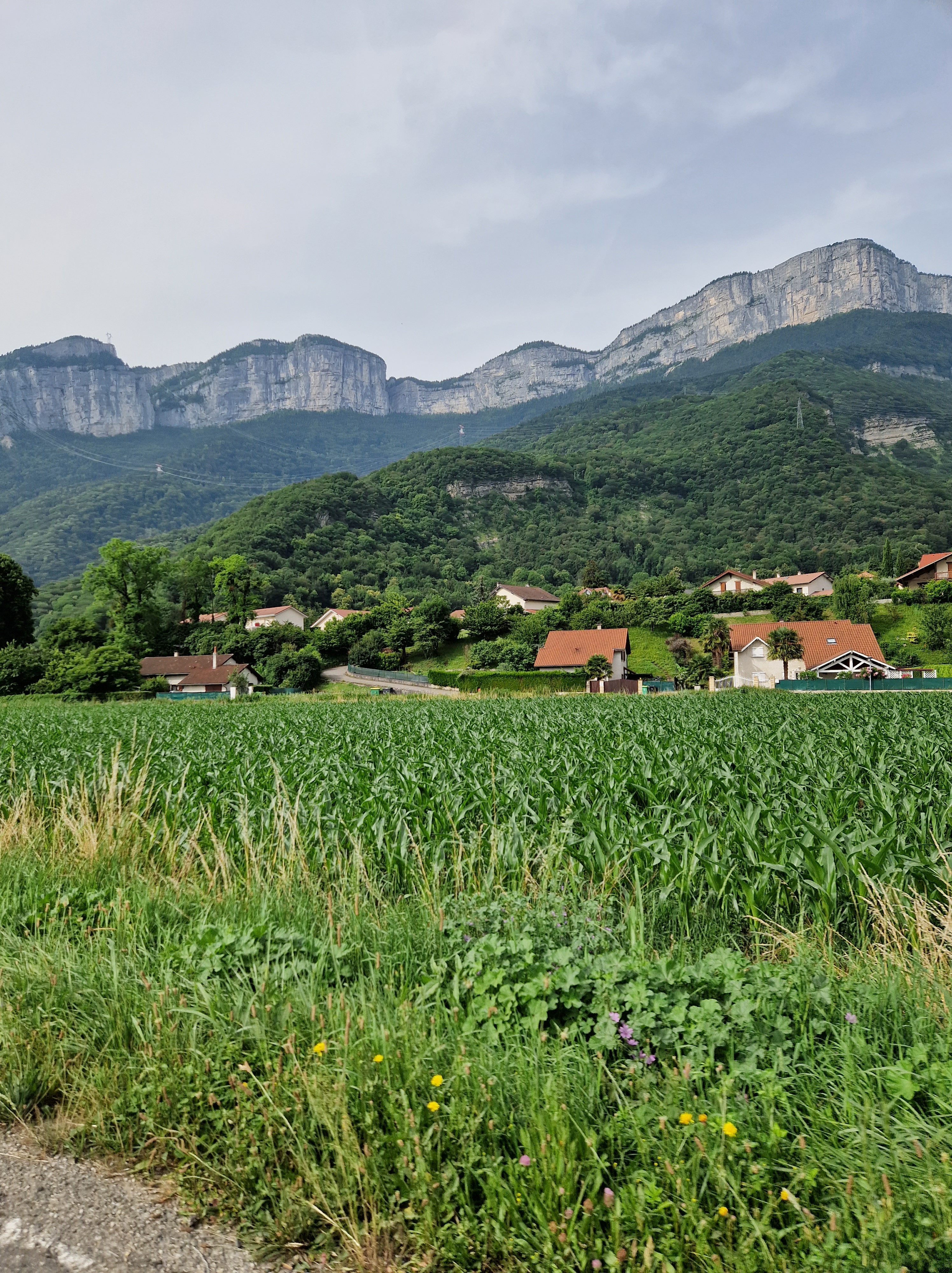Hooivelden maken plaats voor wijngaarden. Na alle zoete grasgeuren met wat parfum de vache ruikt het hier op deze hellingen heel anders. Stoffiger, kruidiger. Voorbij Yenne worden we wederom het bos ingestuurd. Het is koeler naarmate we de schaduw inklimmen. Stroboscopisch zonlicht. Zo zwerven we een uurtje tussen de bomen. De sfeer in de dorpjes verandert, al kan ik niet zeggen waarom. Rozenstruiken leunen, nieuwsgierig naar de voorbijgangers, over de muurtjes. Een grijze rotswand van weet-ik-veel welke berg doemt naast ons op en blijft de rest van de reis naast of voor ons.
