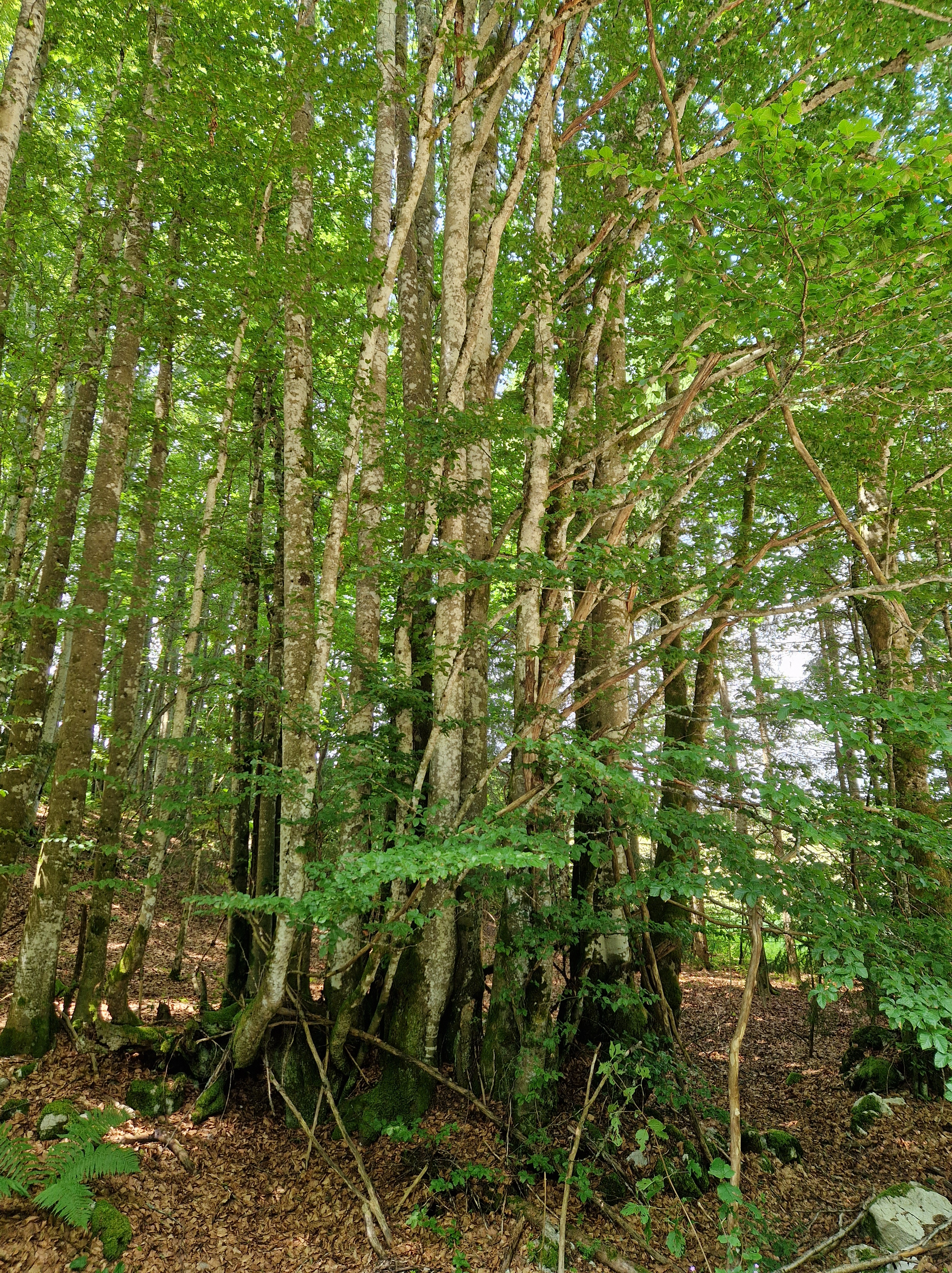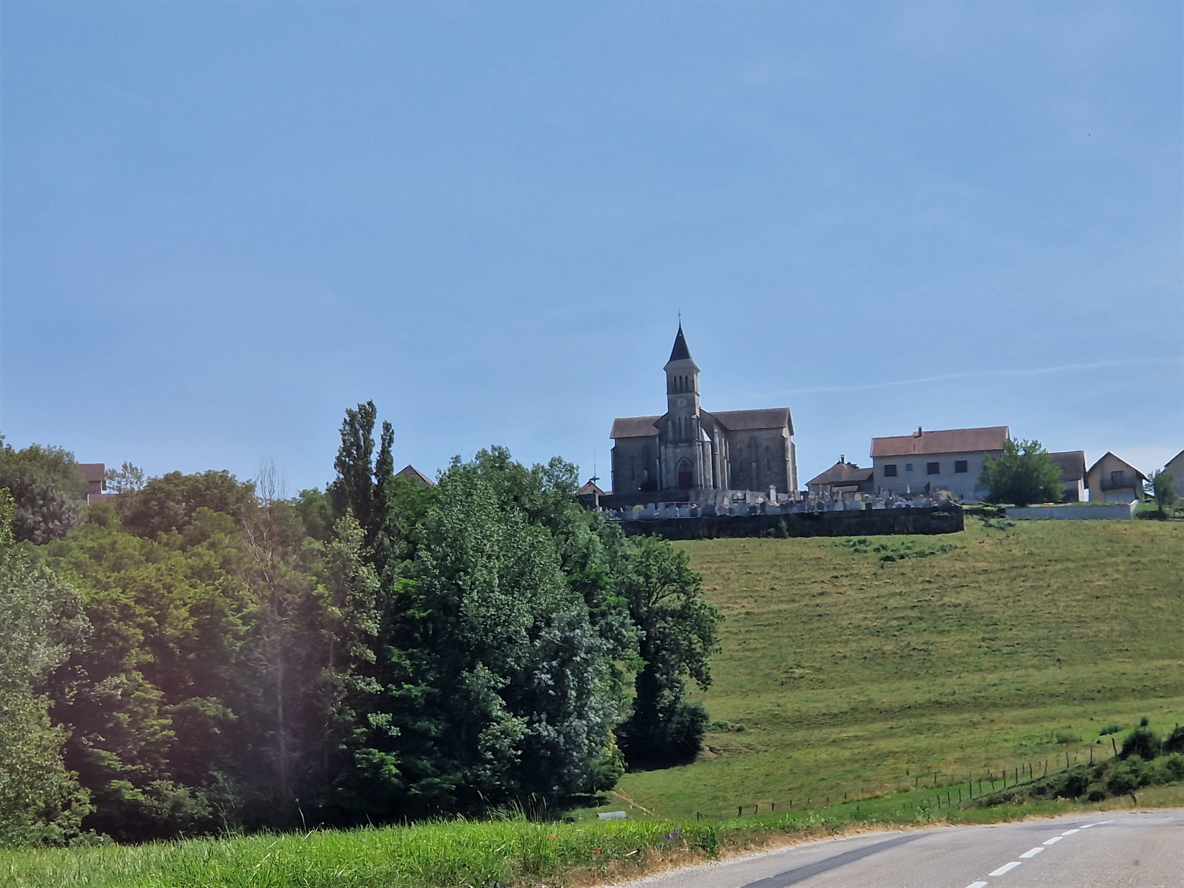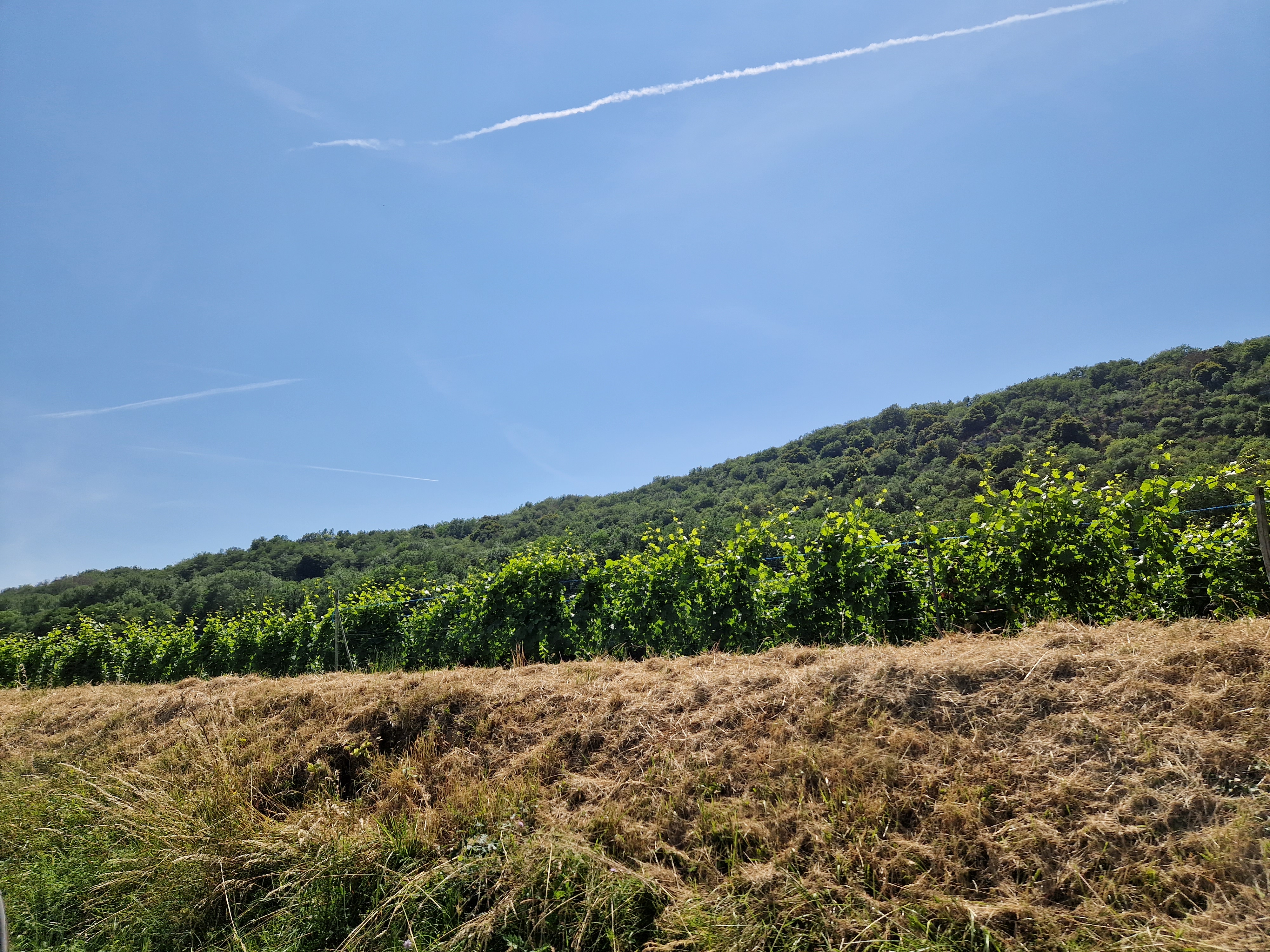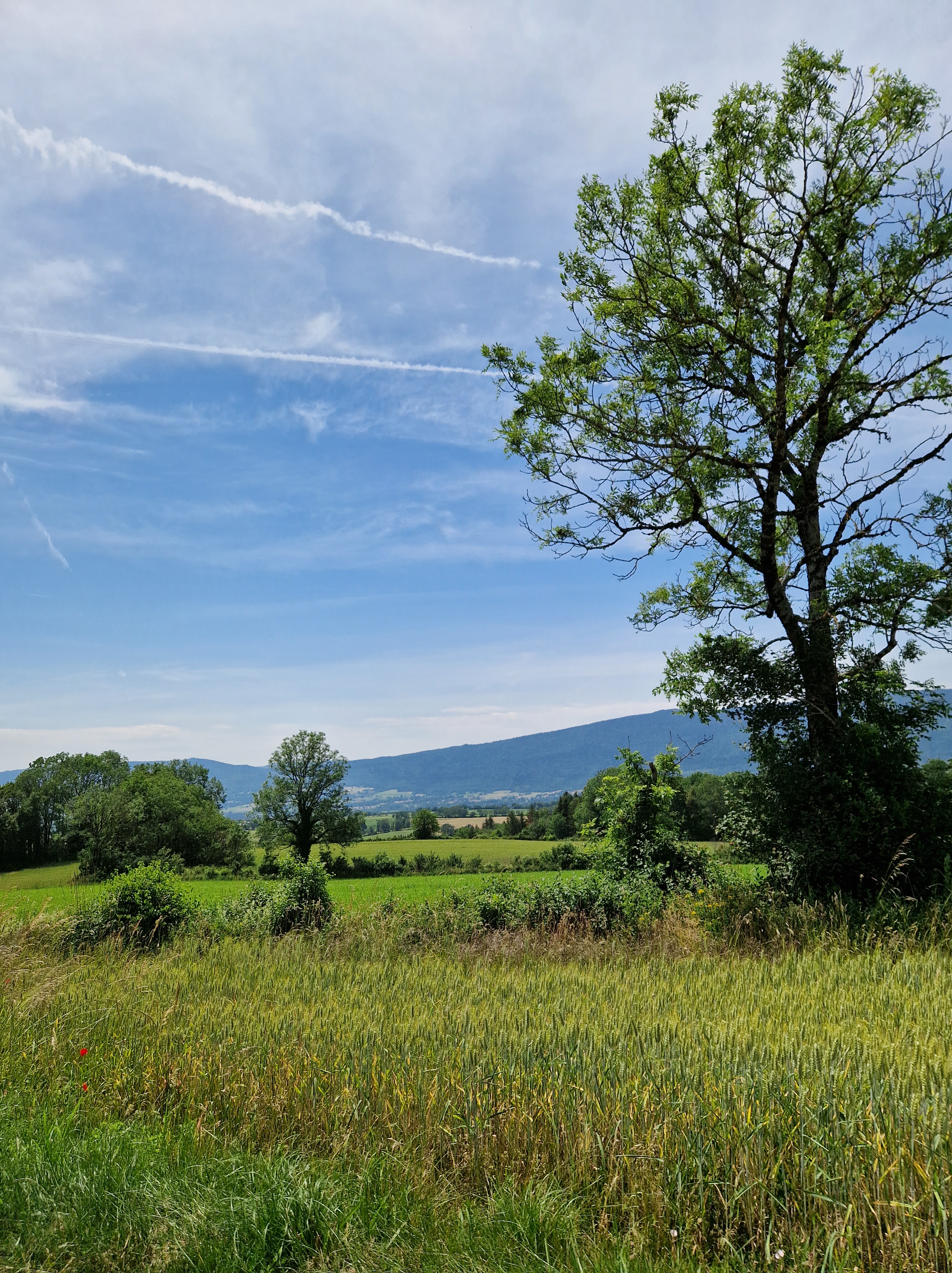 Hooivelden maken plaats voor wijngaarden. Na alle zoete grasgeuren met wat parfum de vache ruikt het hier op deze hellingen heel anders. Stoffiger, kruidiger. Voorbij Yenne worden we wederom het bos ingestuurd. Het is koeler naarmate we de schaduw inklimmen. Stroboscopisch zonlicht. Zo zwerven we een uurtje tussen de bomen. De sfeer in de dorpjes verandert, al kan ik niet zeggen waarom. Rozenstruiken leunen, nieuwsgierig naar de voorbijgangers, over de muurtjes. Een grijze rotswand van weet-ik-veel welke berg doemt naast ons op en blijft de rest van de reis naast of voor ons.