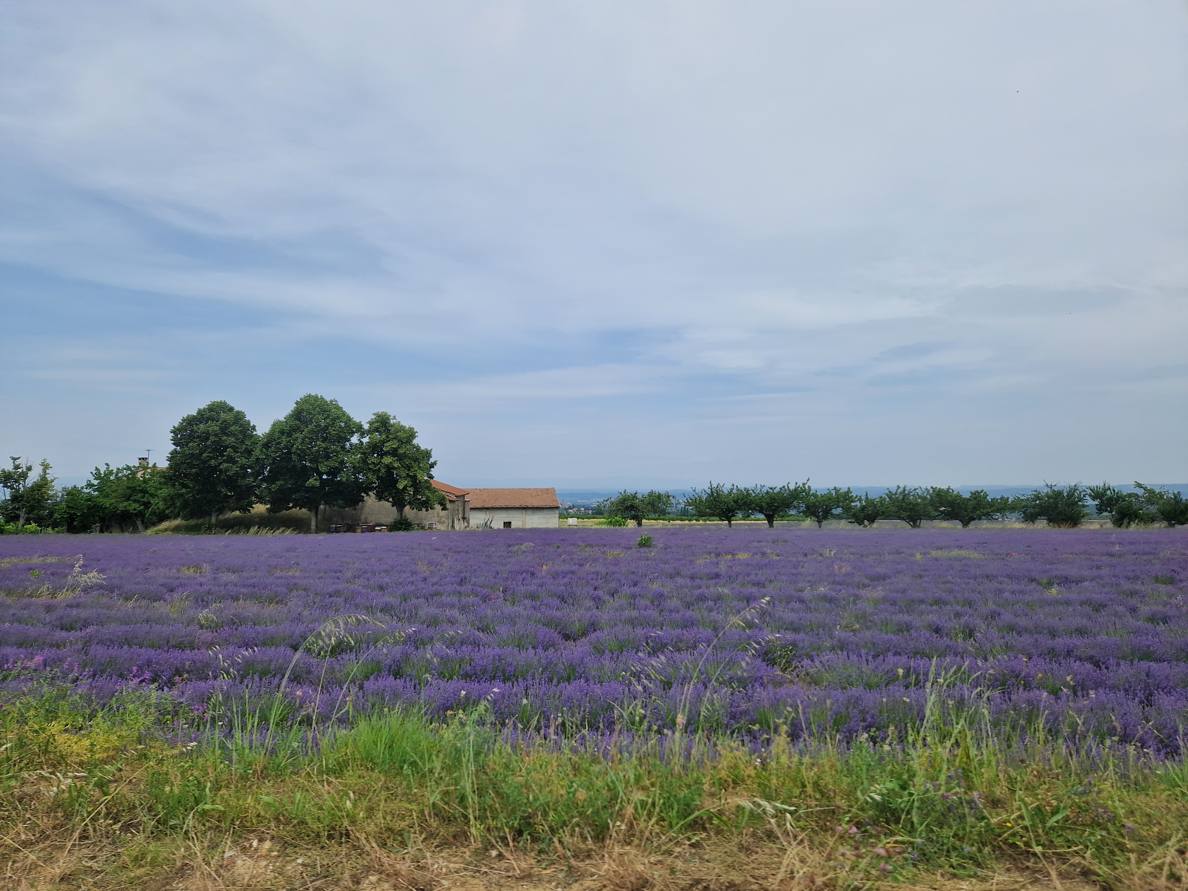De volgende D-weg is rustig, de lucht is bedekt. Geen felle zon op het bloemendak. In de Vercors niets dan kilometers walnotenkwekerijen. Tijd voor een bakkie. Daarna slingeren we een stukje op een route touristique. Om een uur of 12 zien we de eerste lavendelvelden naast de auto, gevolgd door meer lavendel en wijn. Ook de oleanders, ceders en cipressen rukken op. De zonnebloemen zijn nog niet zo ver.