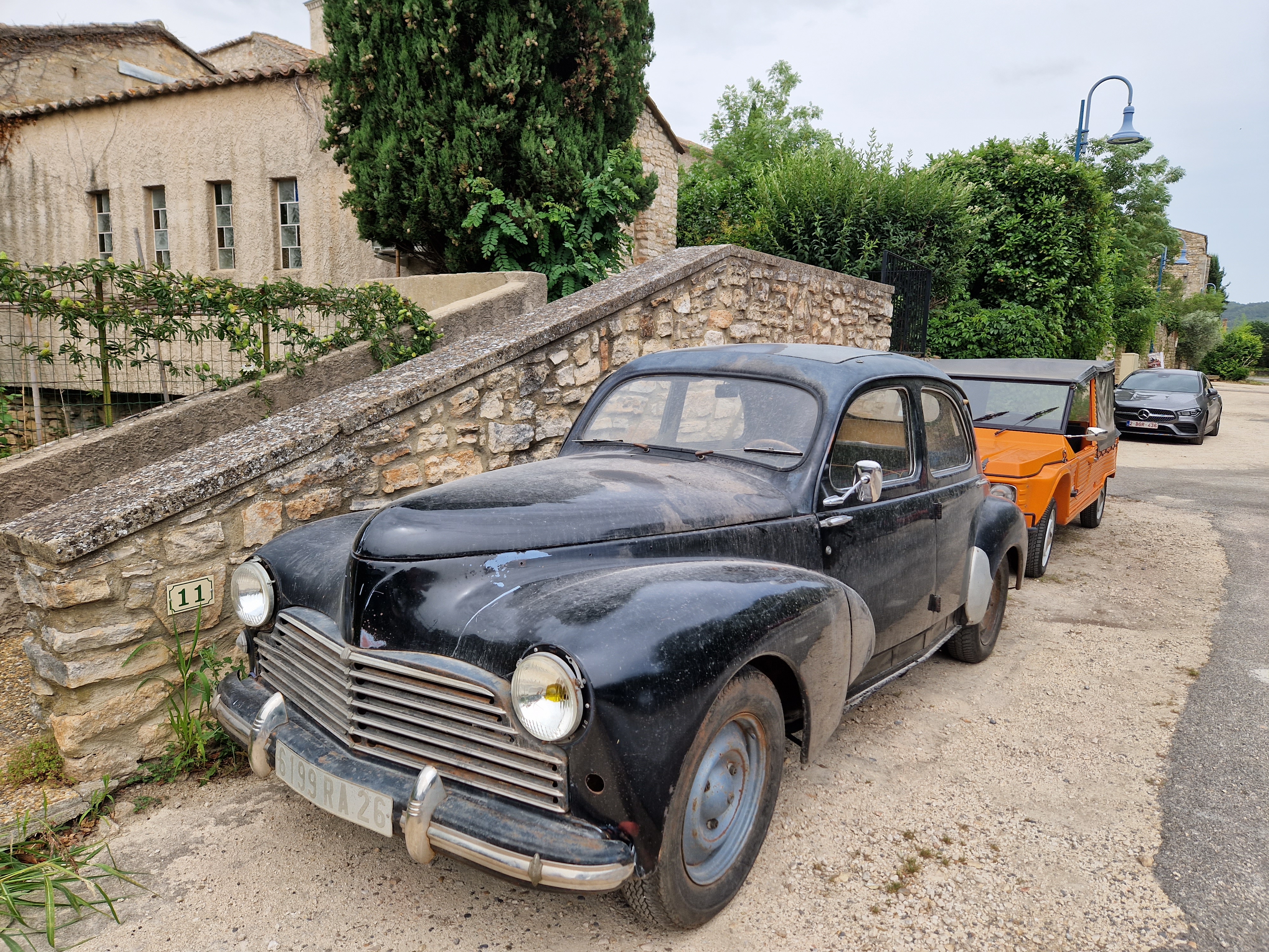 Langzaam maar zeker komen we een beetje thuis. Over de brug van Pont Saint Esprit voert het laatste bosritje ons naar Goudargues, Camping La Grenouille. Wijs geworden rusten we eerst uit, drinken we véél water en doen we een rondje oldtimers bij Garage Le Lavoir. Enige tijd later zijn we helemaal ingericht. De kerkklok slaat, comme d’habitude. En vanavond, vanavond eten we op ons oude terrasje. Encore: comme d’habitude.