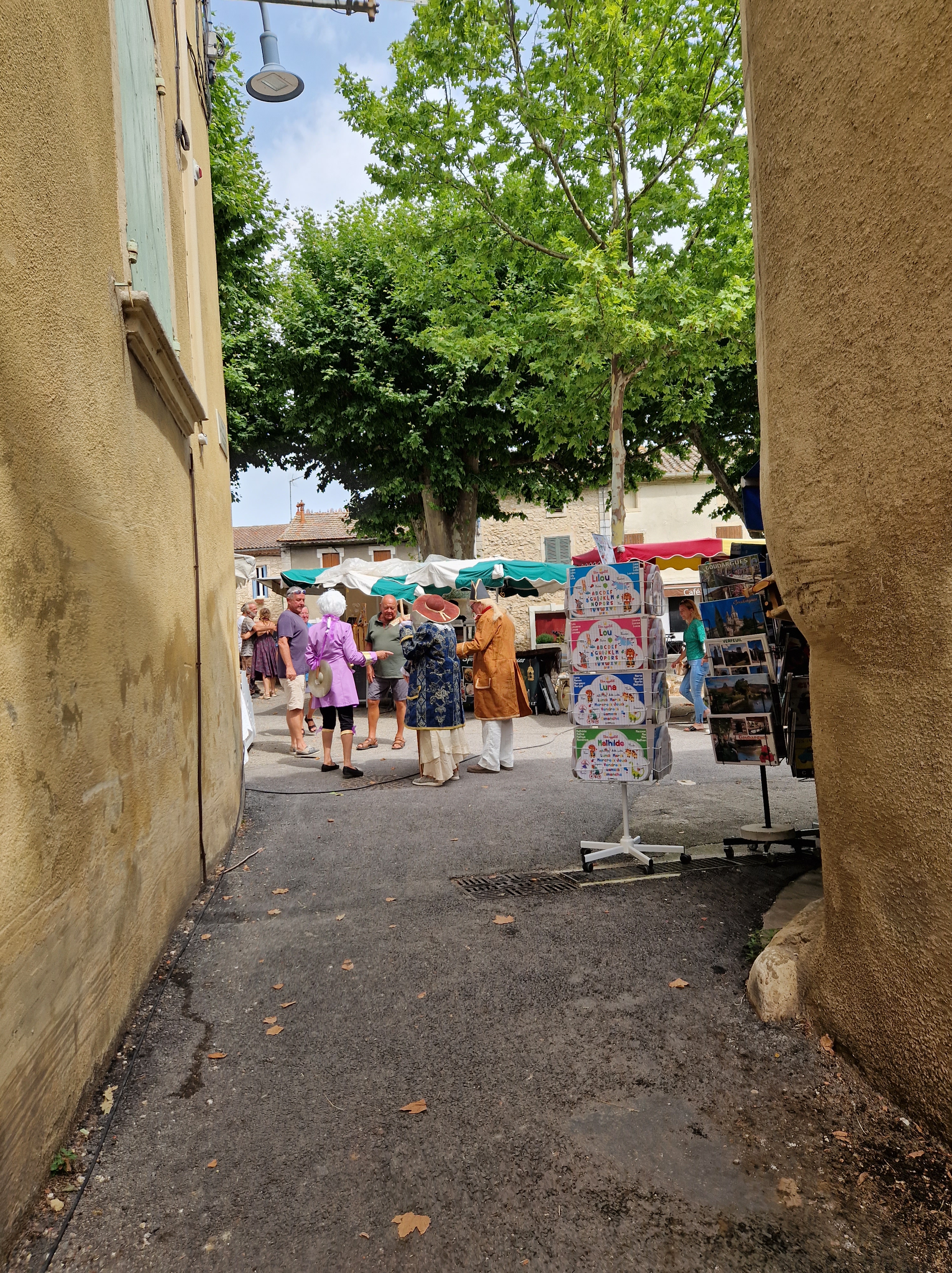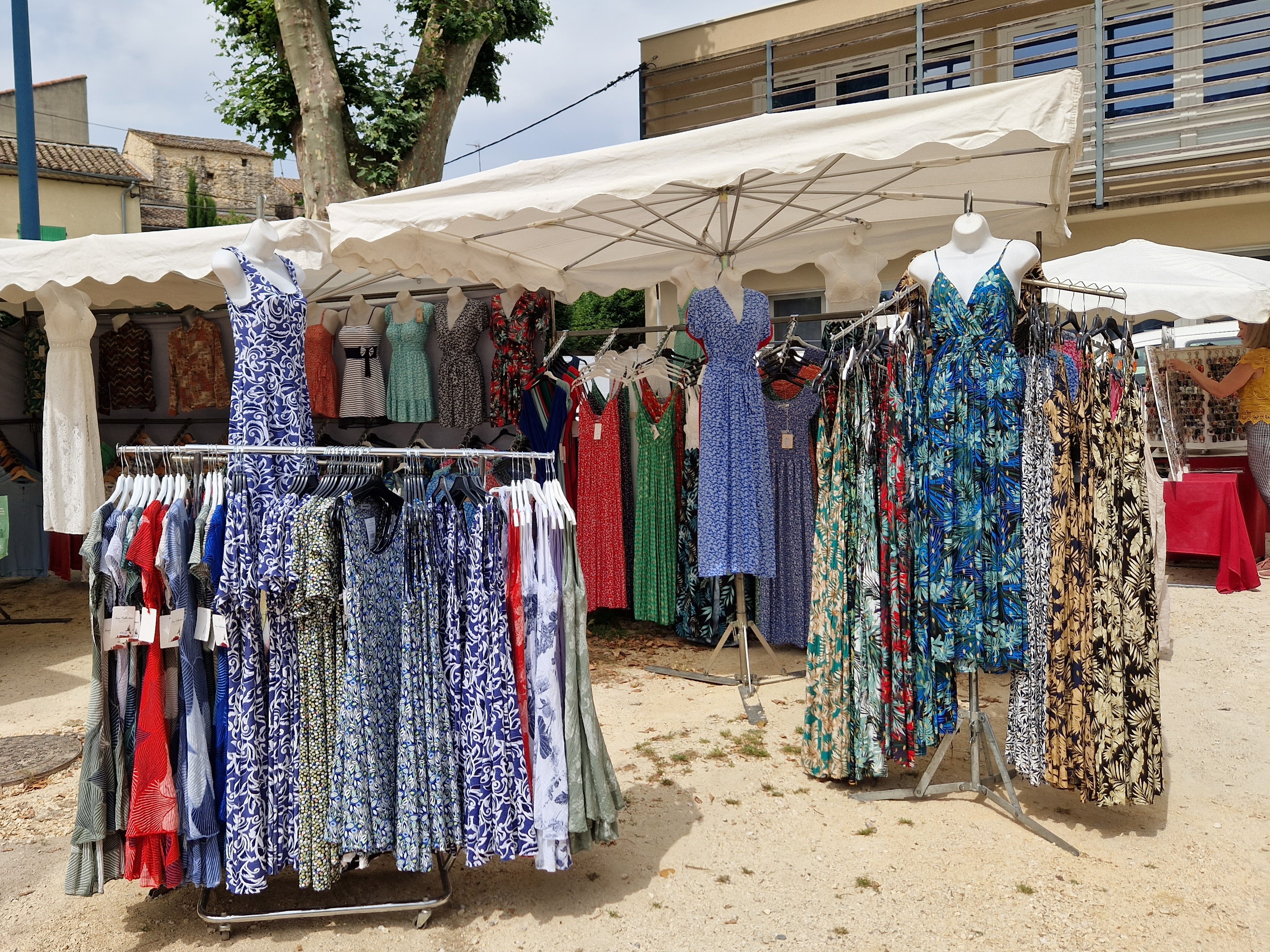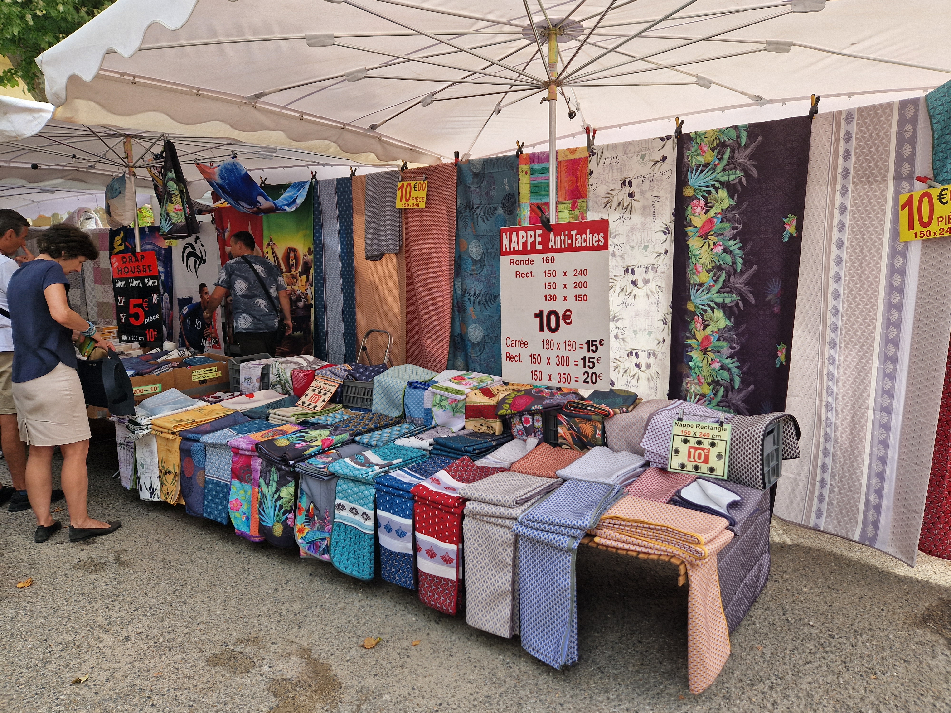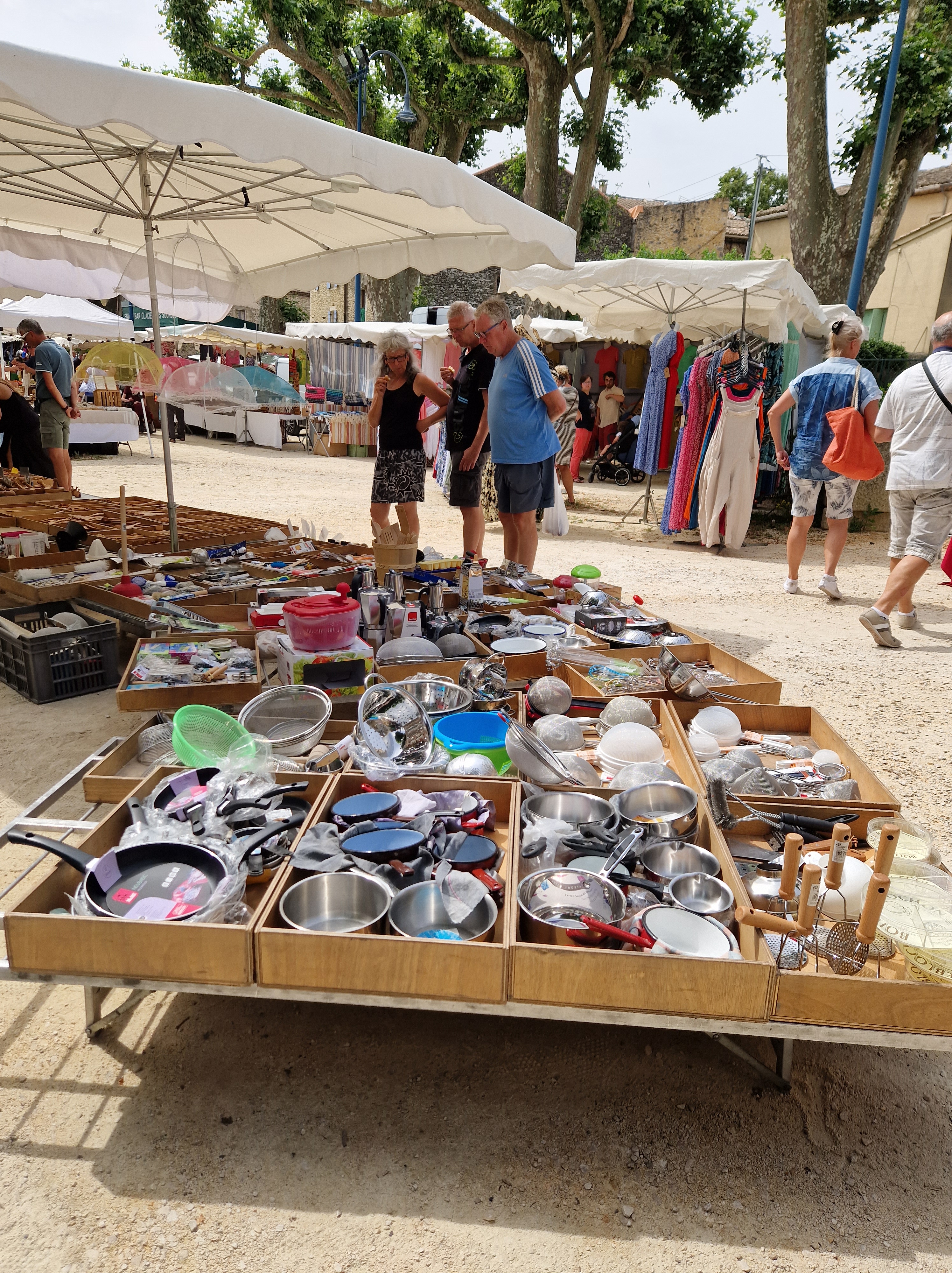 De markt in Goudargues heeft een goeie mix aan toeristen-meuk en marktkoopwaar. Vlees, worsten, kaas en meer kaas, visachtigen. Brood, olijven. Groente, fruit. Tafelkleden en bedlinnen, kleding. Ik scoor direct een nieuwe strandjurk, bij 32+ graden is dat geoorloofd. Lavendel, honing en olijfolie. Een quinquallerie. En vanzelfsprekend de obligate rieten manden (paniers) en Afrikaanse import matten, mandjes en onderzetters. Drie troubadours maken reclame voor de optredens van het plaatselijke koor in Goudargues en Bagnols, eind juni begin juli.