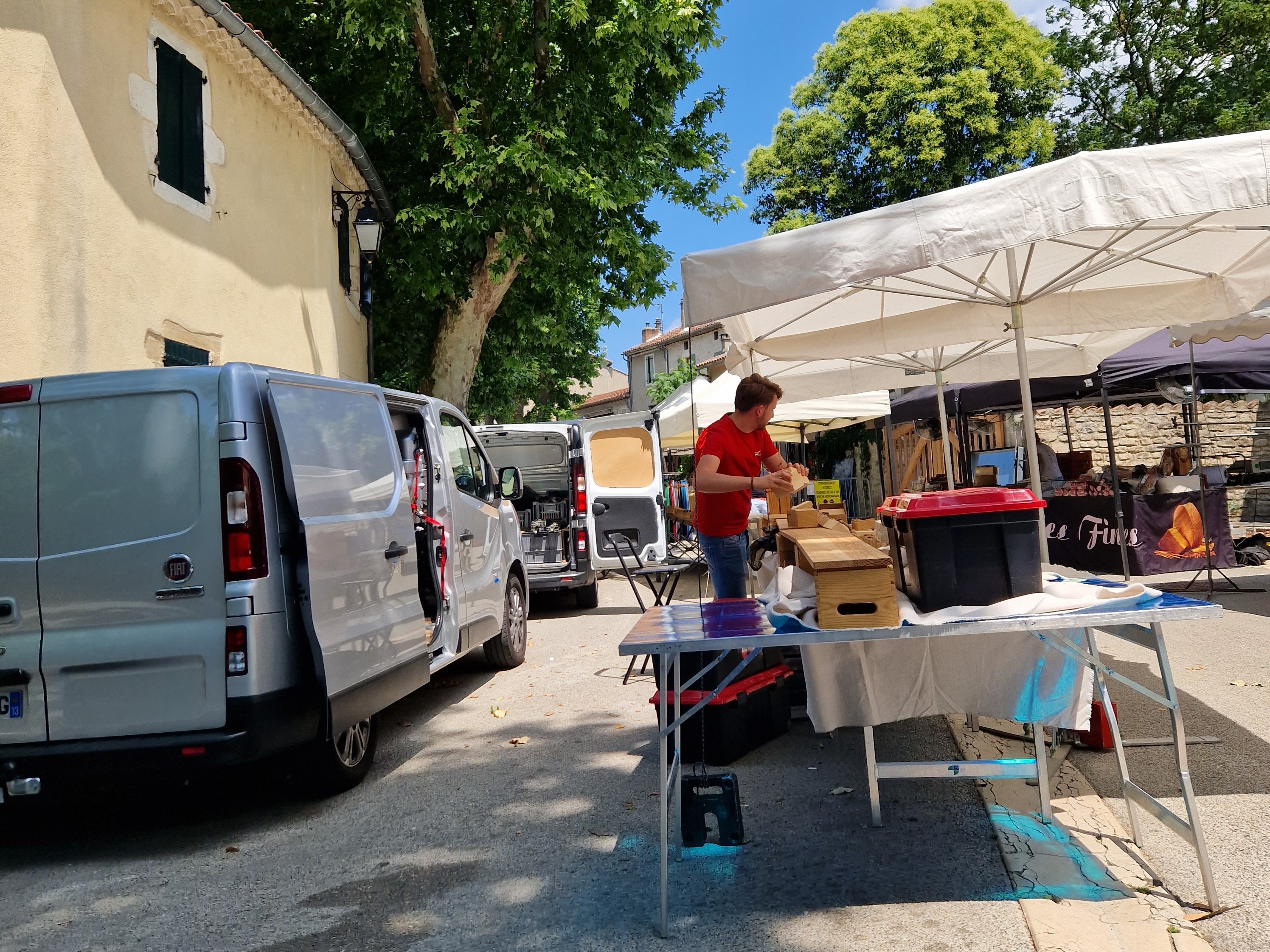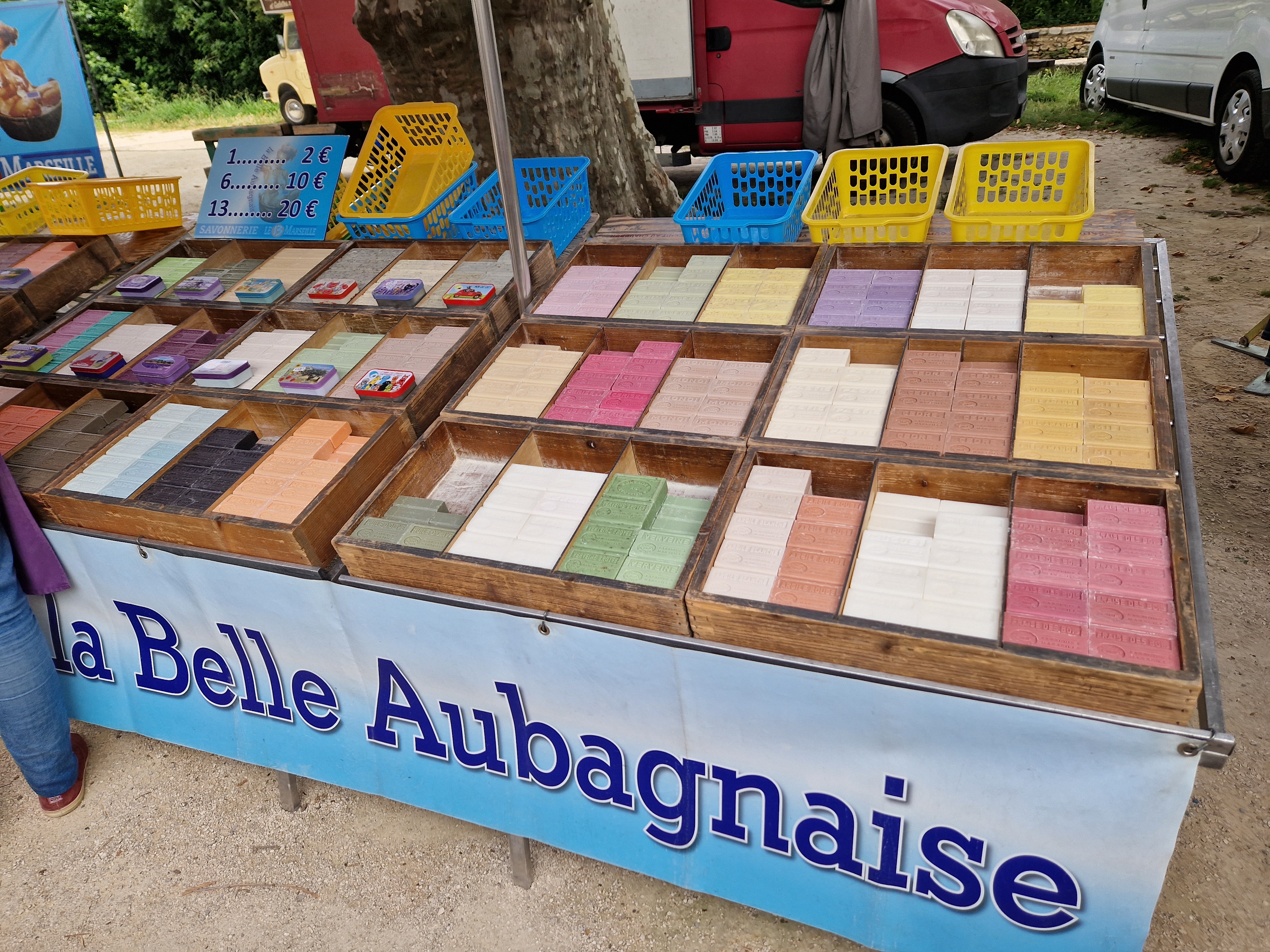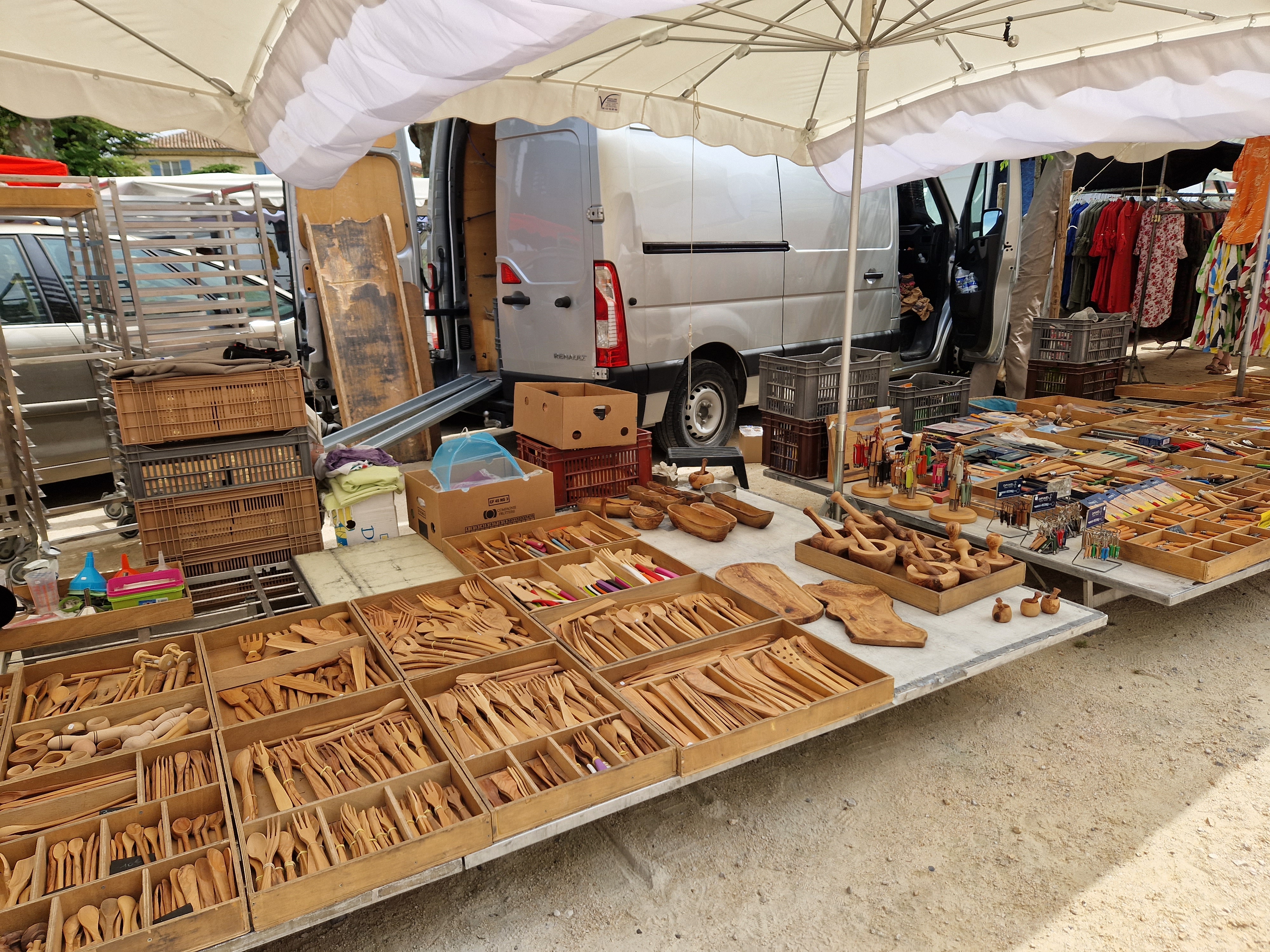 De markt in Goudargues heeft een goeie mix aan toeristen-meuk en marktkoopwaar. Vlees, worsten, kaas en meer kaas, visachtigen. Brood, olijven. Groente, fruit. Tafelkleden en bedlinnen, kleding. Ik scoor direct een nieuwe strandjurk, bij 32+ graden is dat geoorloofd. Lavendel, honing en olijfolie. Een quinquallerie. En vanzelfsprekend de obligate rieten manden (paniers) en Afrikaanse import matten, mandjes en onderzetters. Drie troubadours maken reclame voor de optredens van het plaatselijke koor in Goudargues en Bagnols, eind juni begin juli.