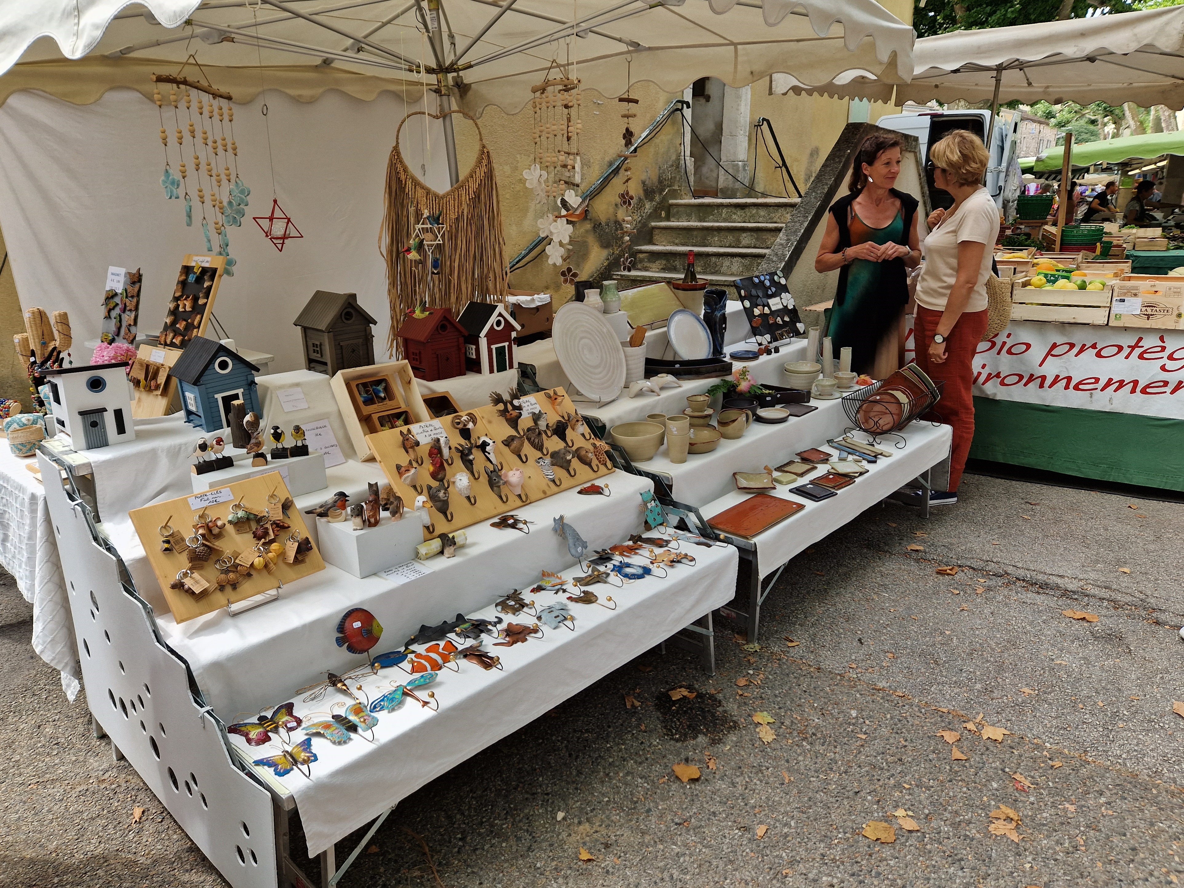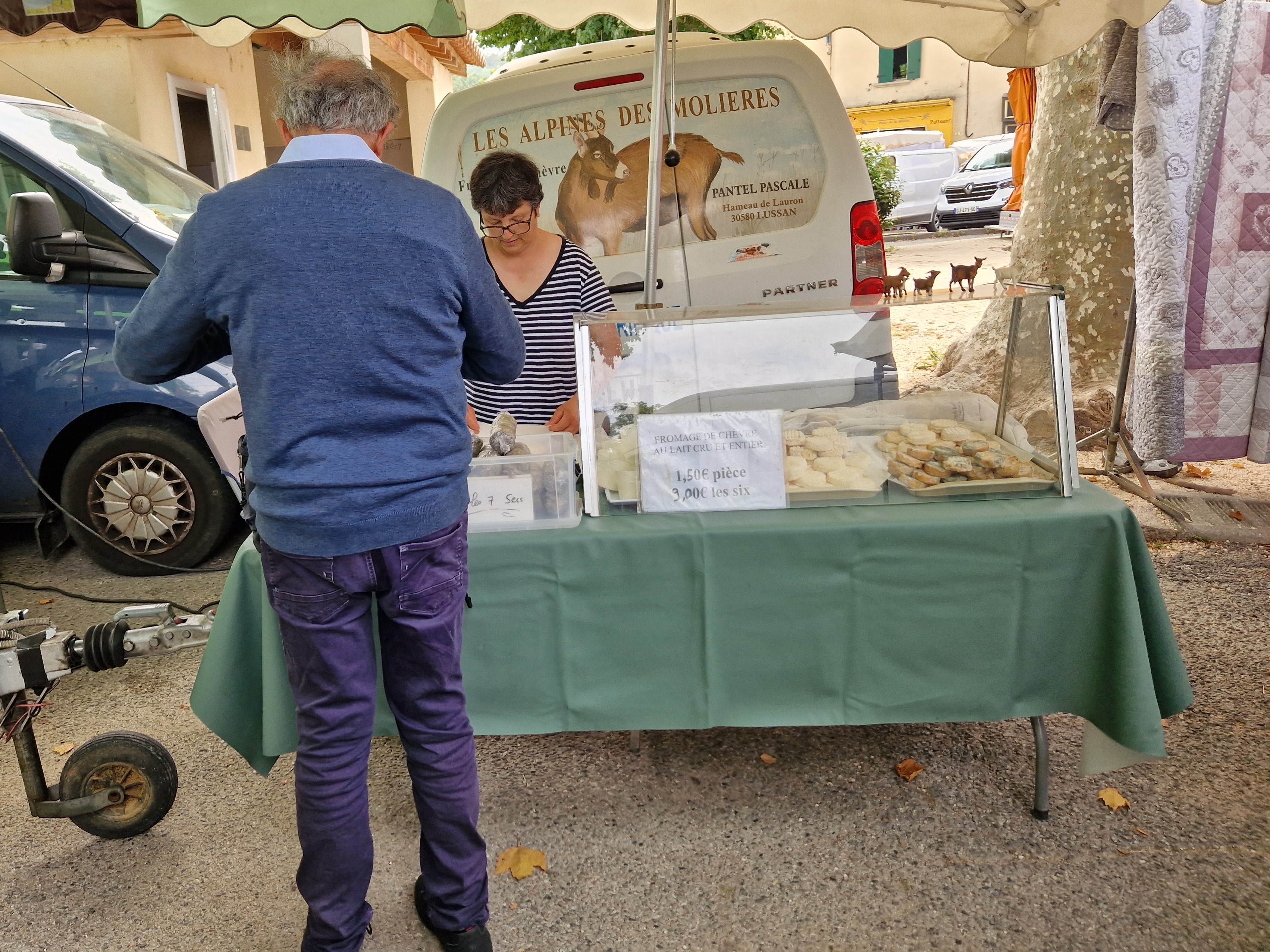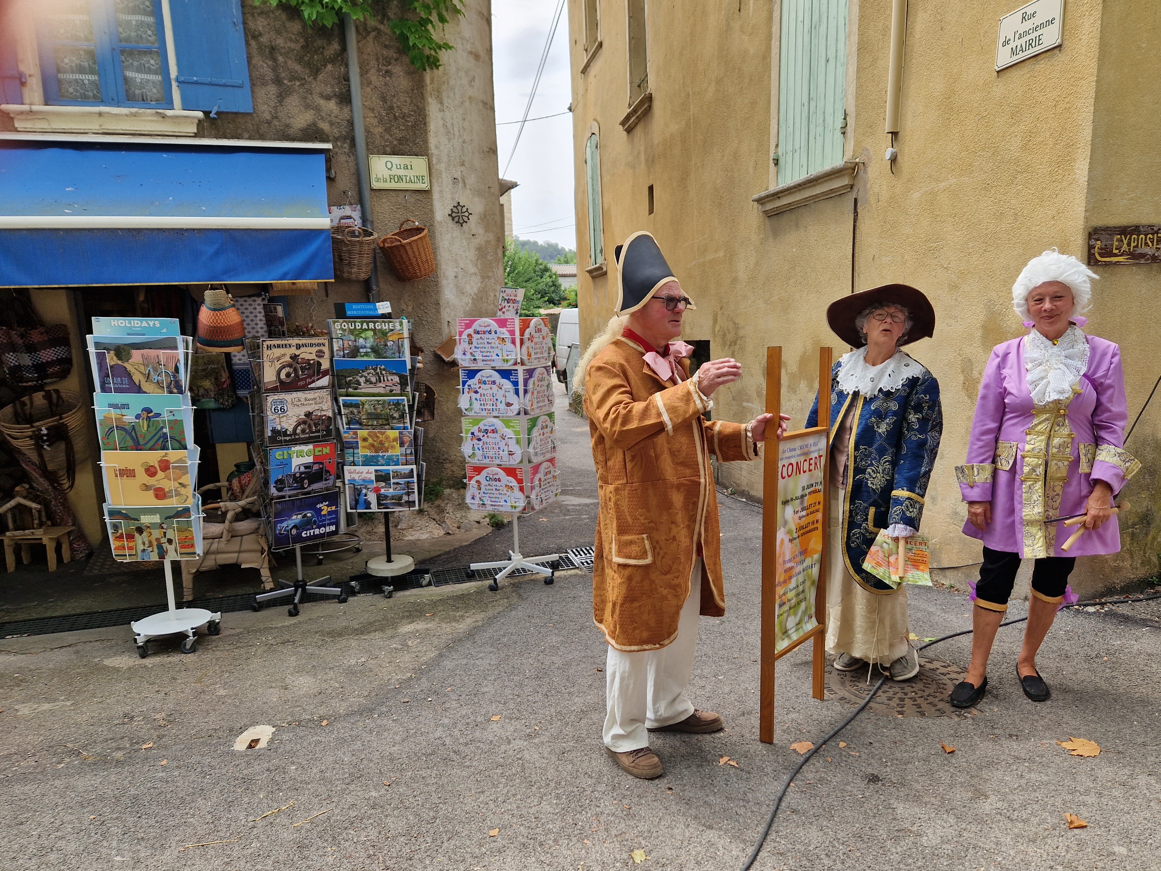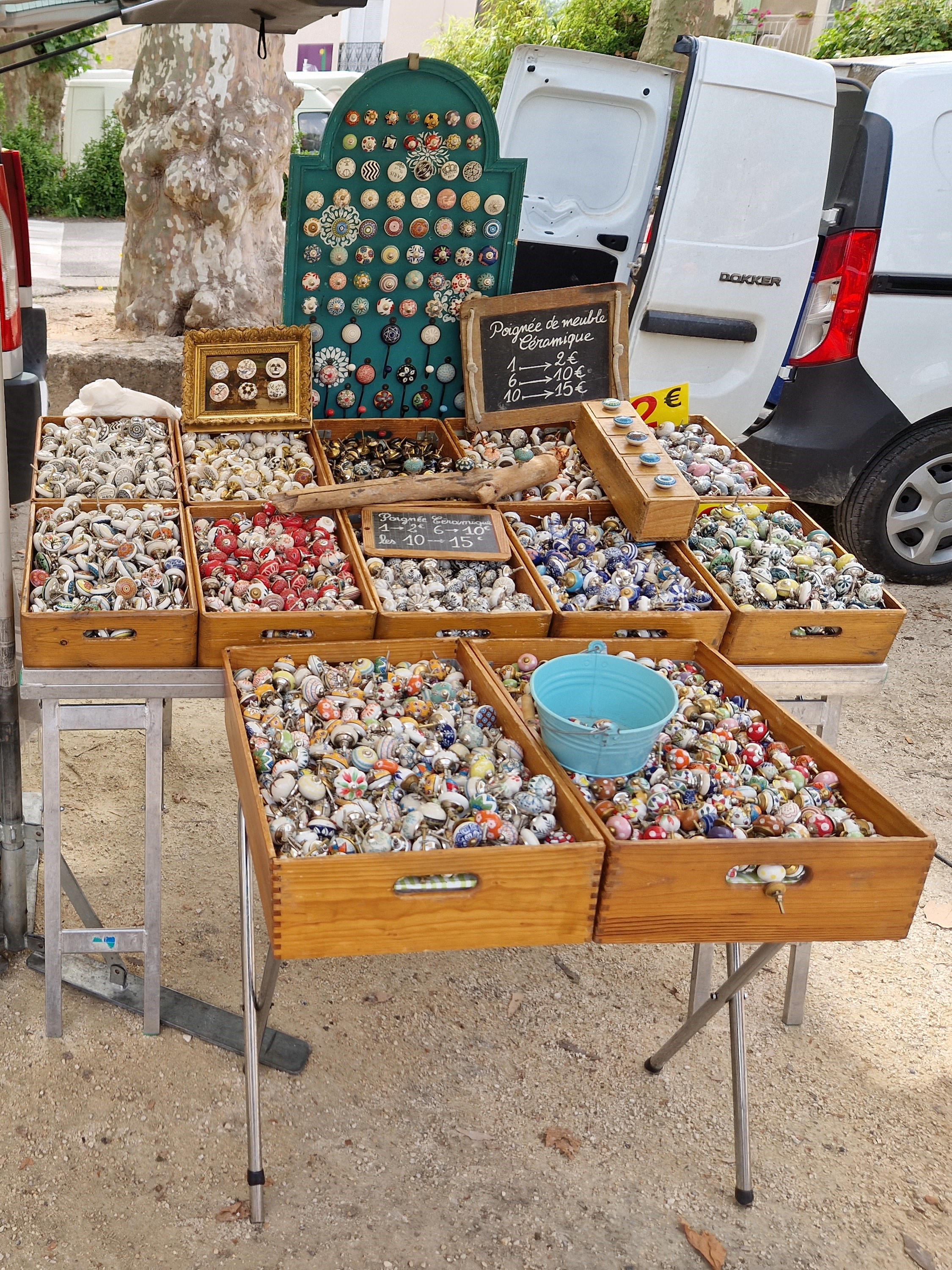 De markt in Goudargues heeft een goeie mix aan toeristen-meuk en marktkoopwaar. Vlees, worsten, kaas en meer kaas, visachtigen. Brood, olijven. Groente, fruit. Tafelkleden en bedlinnen, kleding. Ik scoor direct een nieuwe strandjurk, bij 32+ graden is dat geoorloofd. Lavendel, honing en olijfolie. Een quinquallerie. En vanzelfsprekend de obligate rieten manden (paniers) en Afrikaanse import matten, mandjes en onderzetters. Drie troubadours maken reclame voor de optredens van het plaatselijke koor in Goudargues en Bagnols, eind juni begin juli.