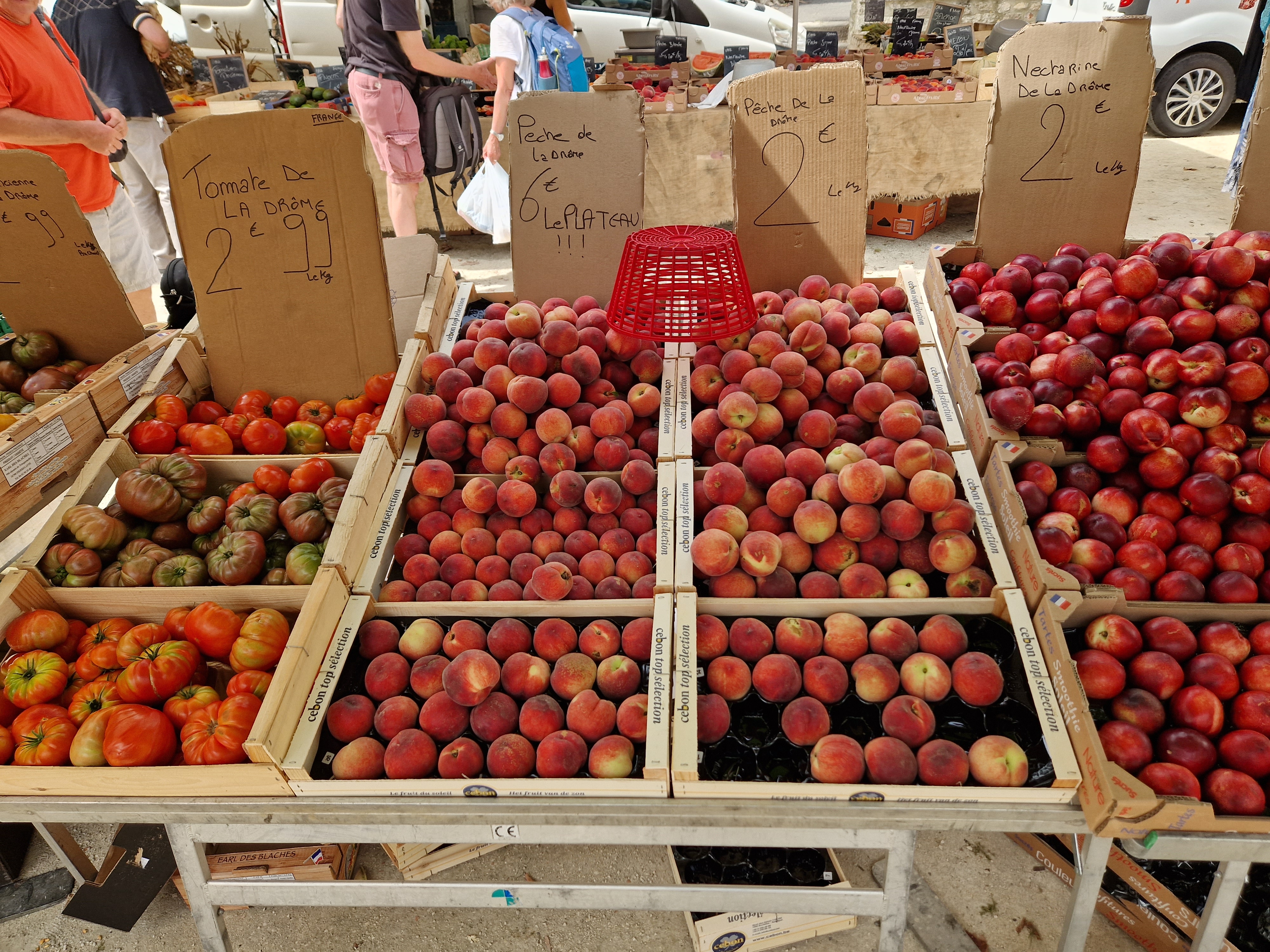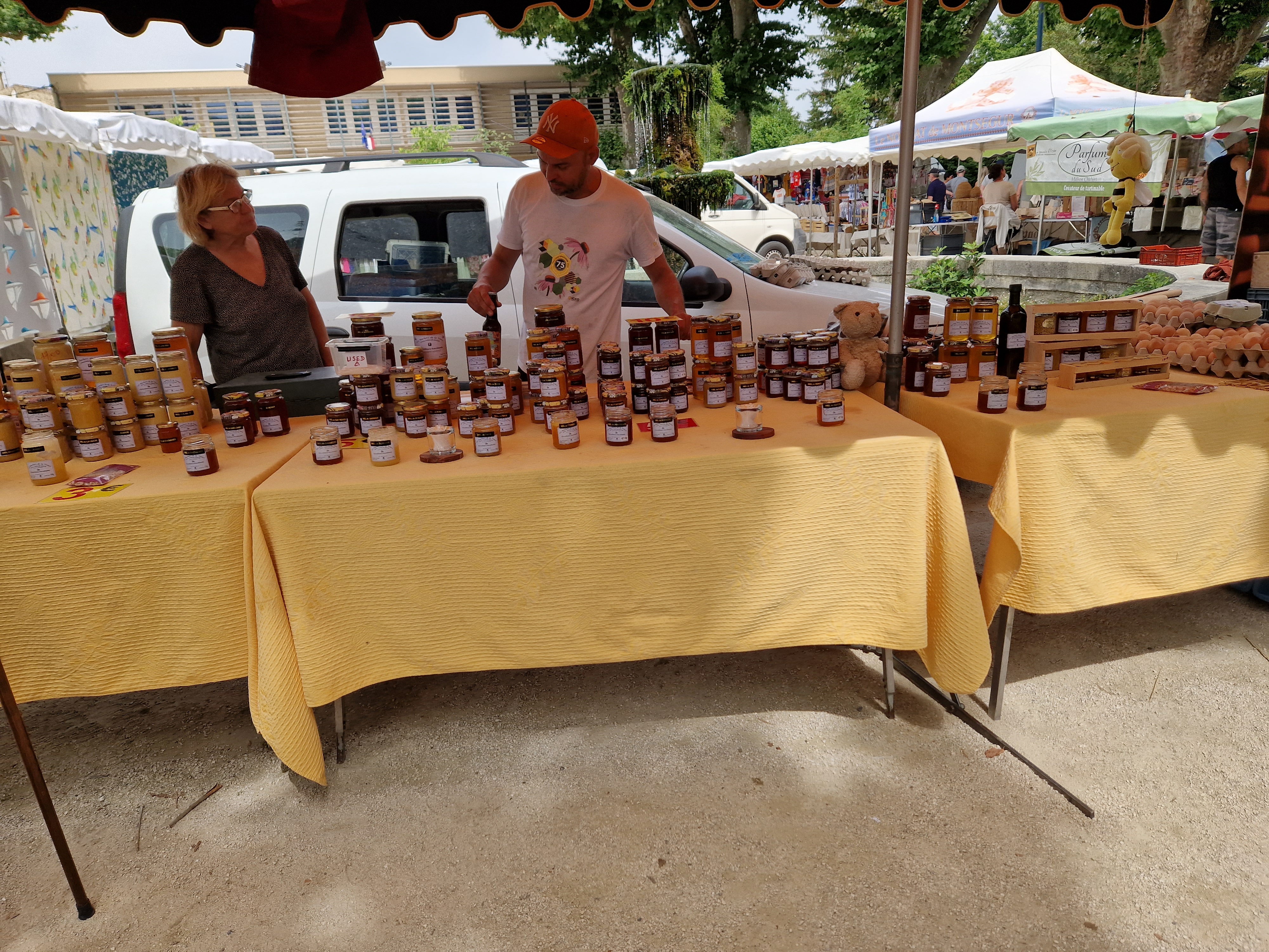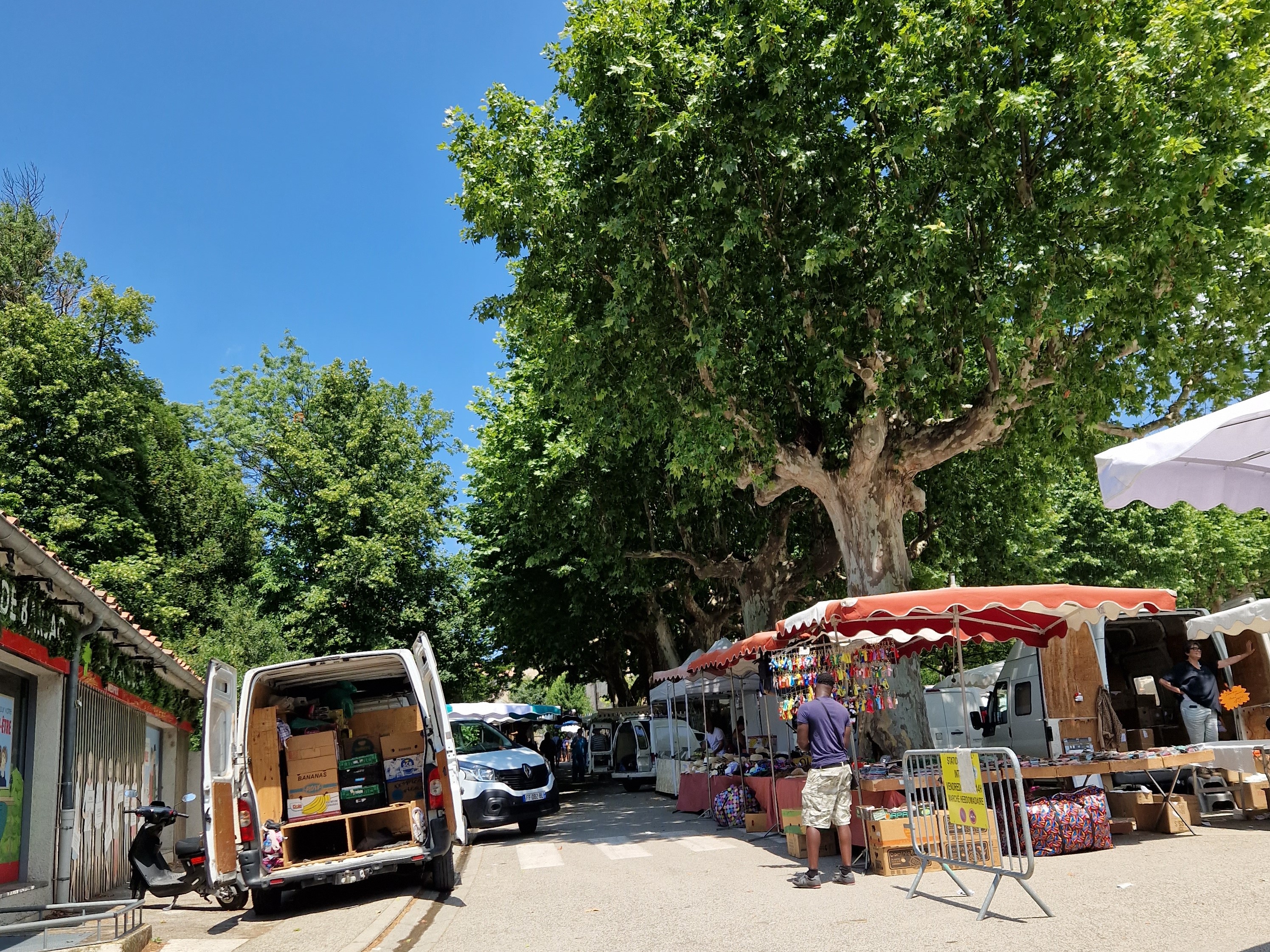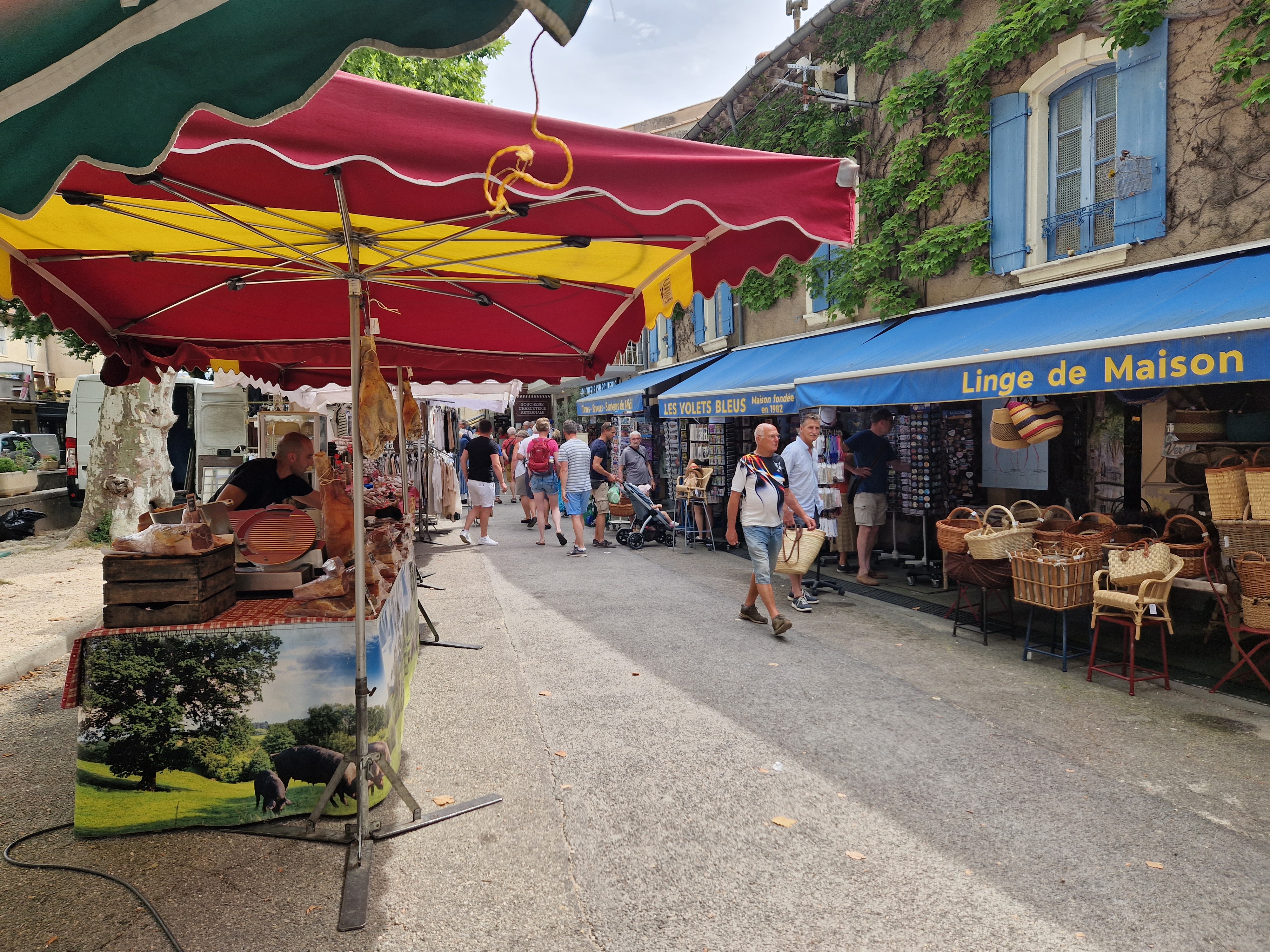 We gaan een stukkie toeren, daarna zal de was droog geblazen zijn. In Barjac rijden we langs de markt die 5x zo groot is als in Goudargues, waar je dus ook 5x zoveel van hetzelfde vindt. Men is al aan het opbreken en we hebben al een markt gezien deze vakantie. We gaan door.