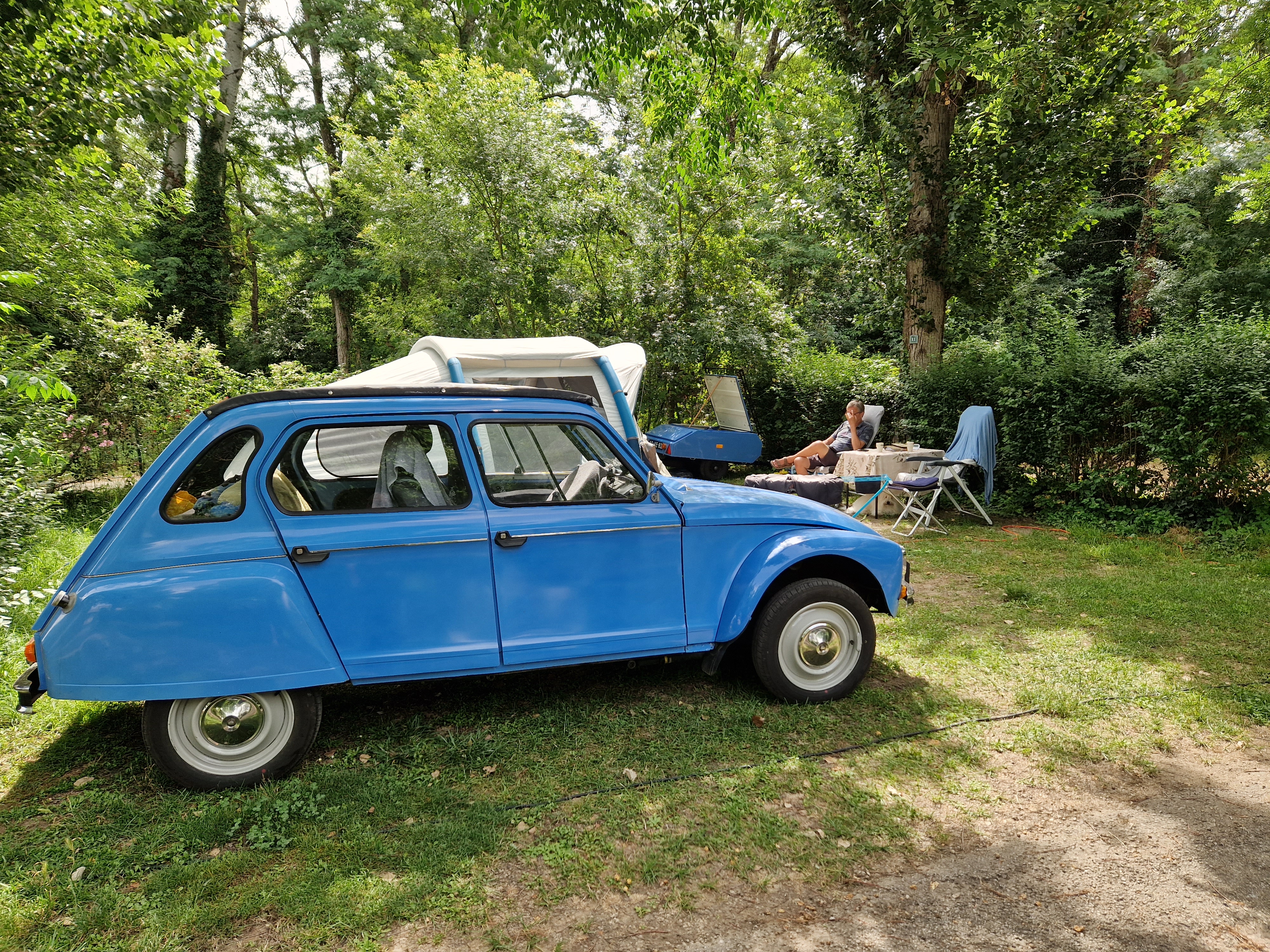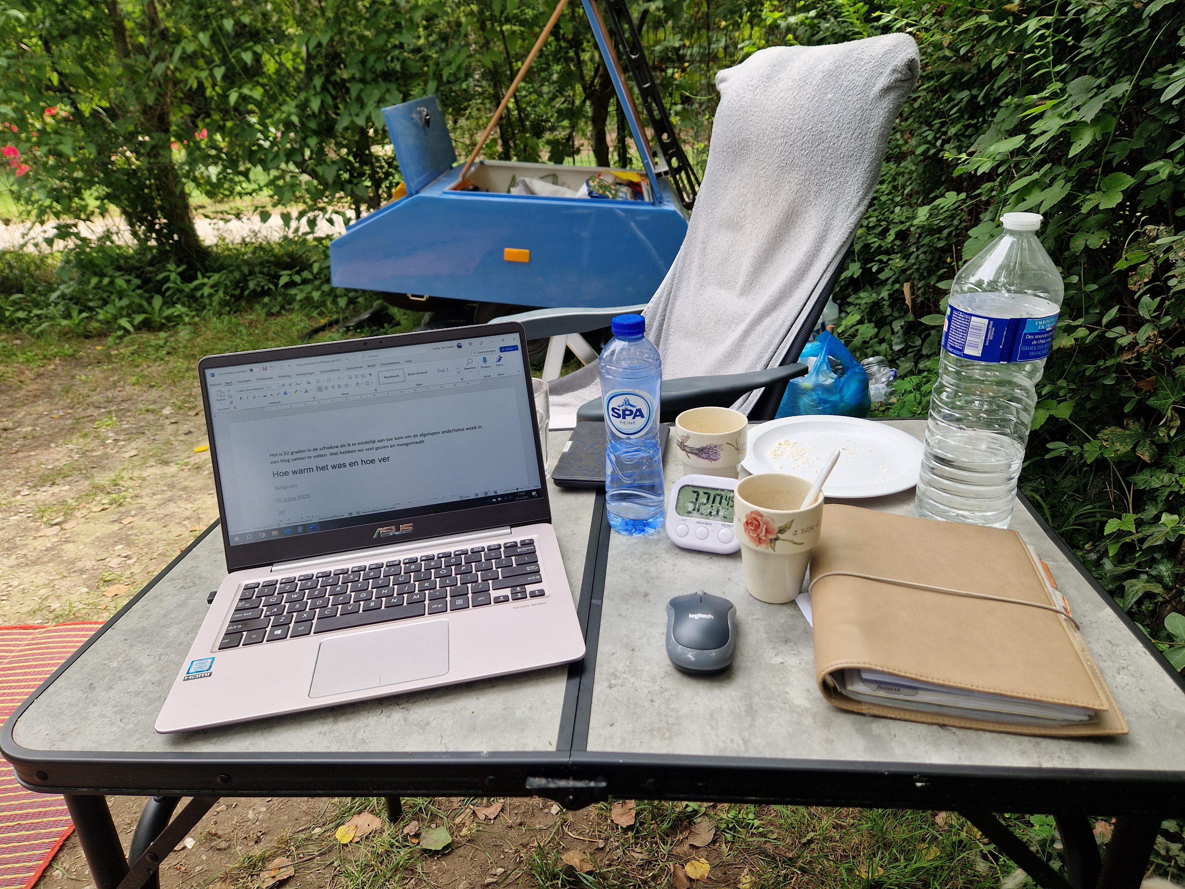Na een bloedhete avond en nacht is het vandaag een bewolktere waaibomendag. Een stuk koeler ook, behalve als je in de tent koffie aan het zetten bent. Dan lopen de straaltjes weer over je bast. Het is te hopen dat de hordes muggen wegwaaien. 40% DEET is geen uitdaging voor ze en de antiprik, de roze Onctose, jagen we er met tubes tegelijk doorheen. Bij de Pharmacie beginnen ze al te grijnzen als ik wéér twee tubes kom kopen. Ach, de geneugtes van het buitenleven.