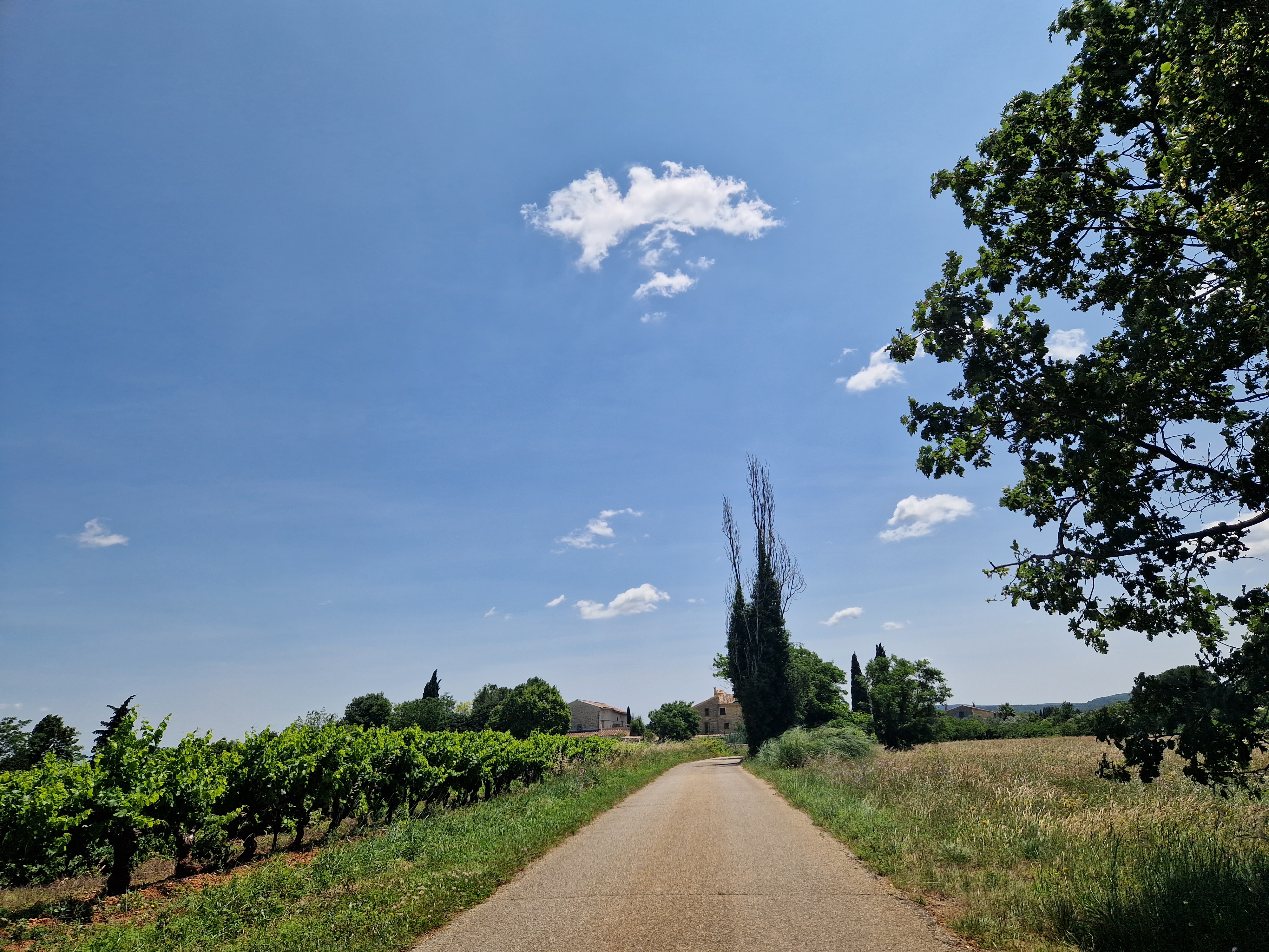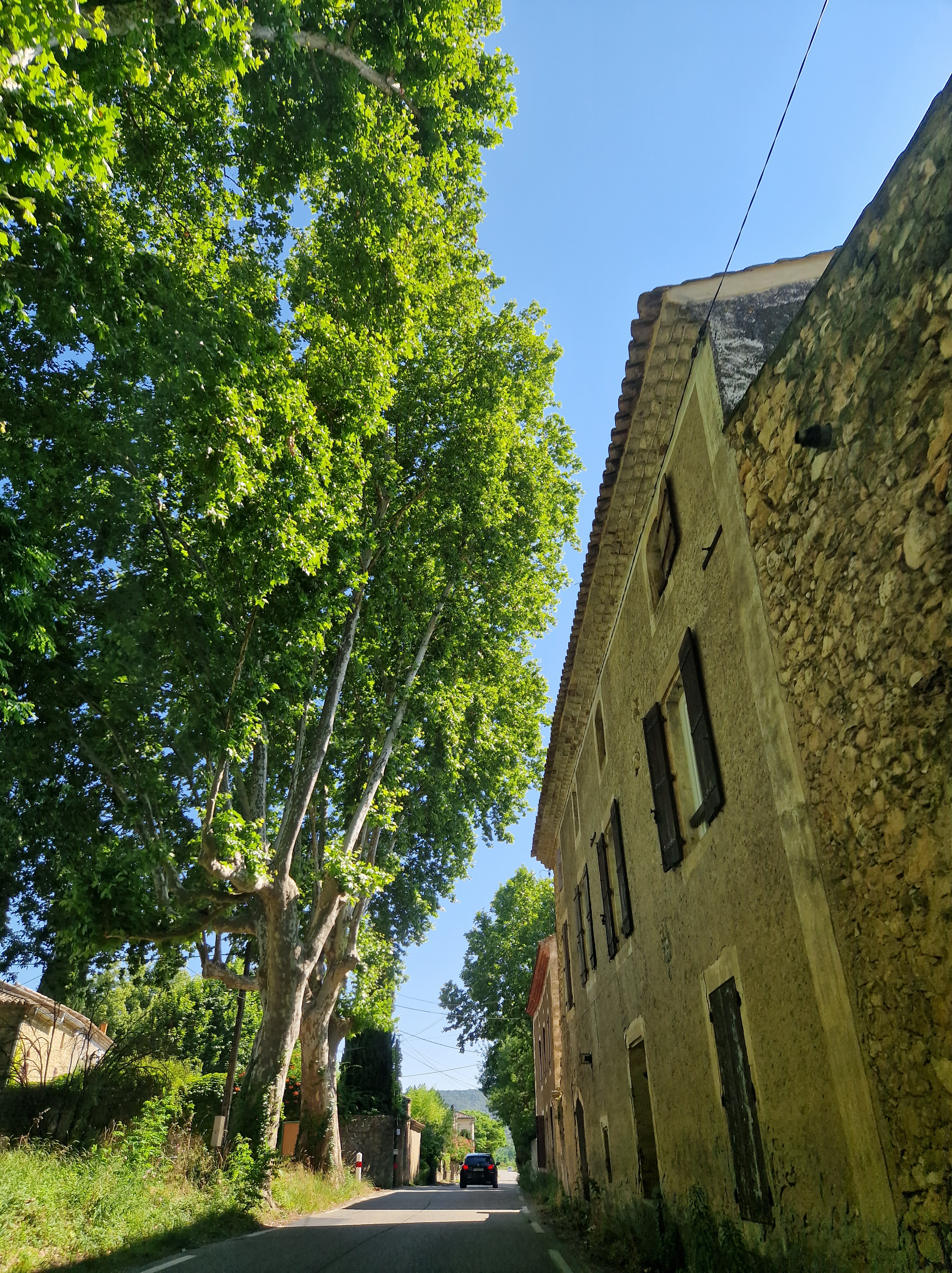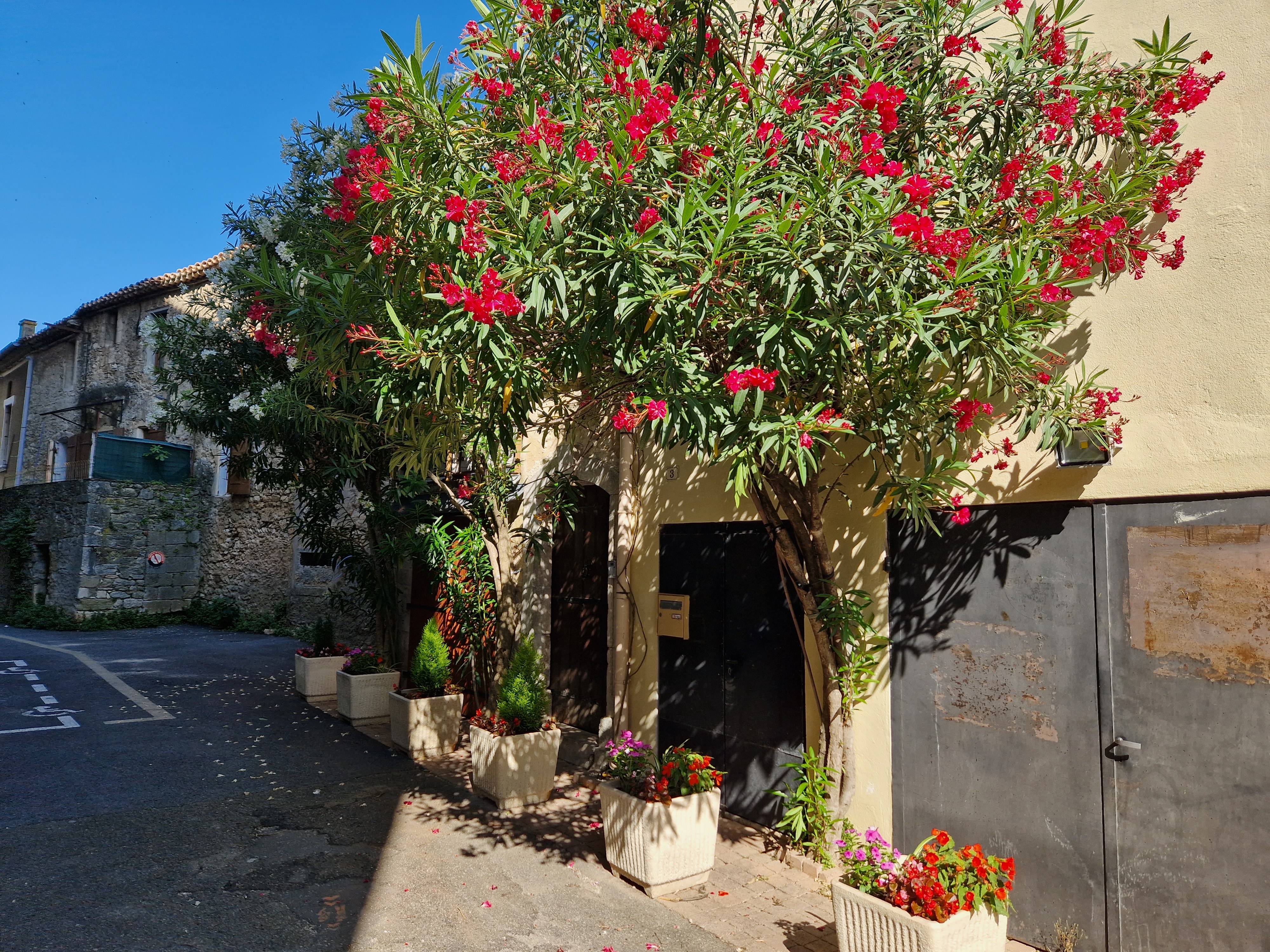 Langs wijngaarden en lavendelvelden en slingerend door een bos komen we via een semi-verhard weggetje bij Saint Christol de Rodières, een dorpje als mijn verzameling Provençaalse huisjes. We krauten door de steegjes, net breed genoeg voor de Dyane, onder een boog van een huis door naar het volgende gangetje. Roze, witte en rode oleander-explosies tegen de gevels, een schitterend gezicht. Alles is helaas te krap om goeie foto’s van te nemen. In een gebied dat we als onze broekzak dachten te kennen zien we zo toch nieuwe dingen.