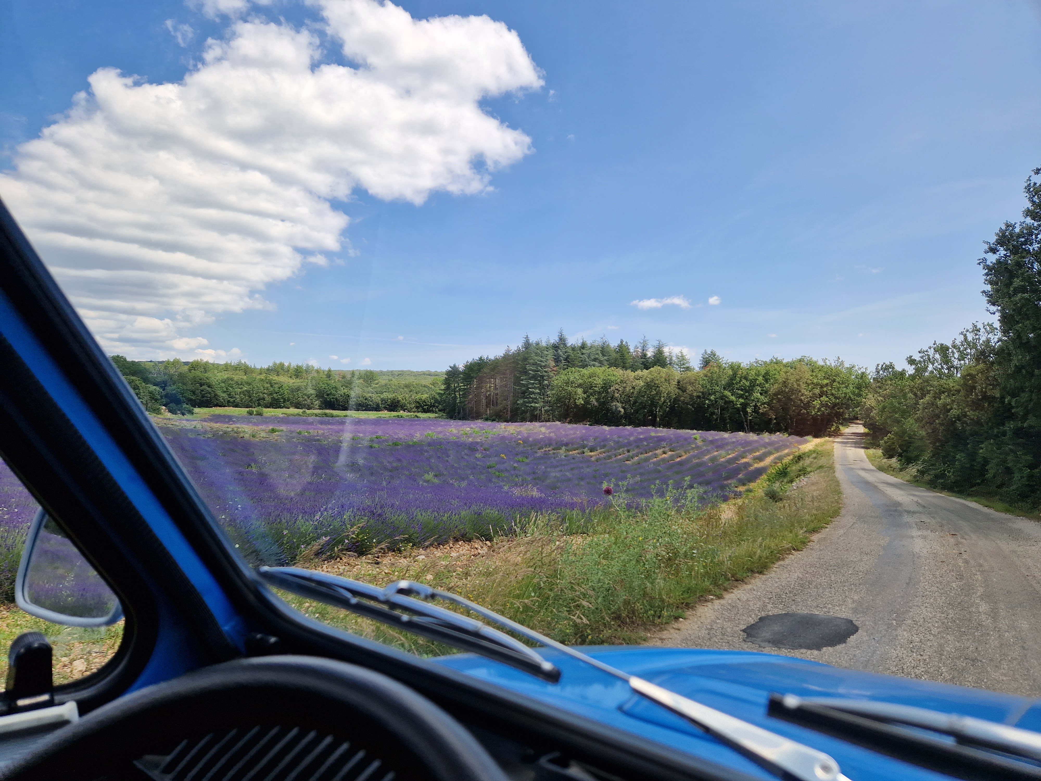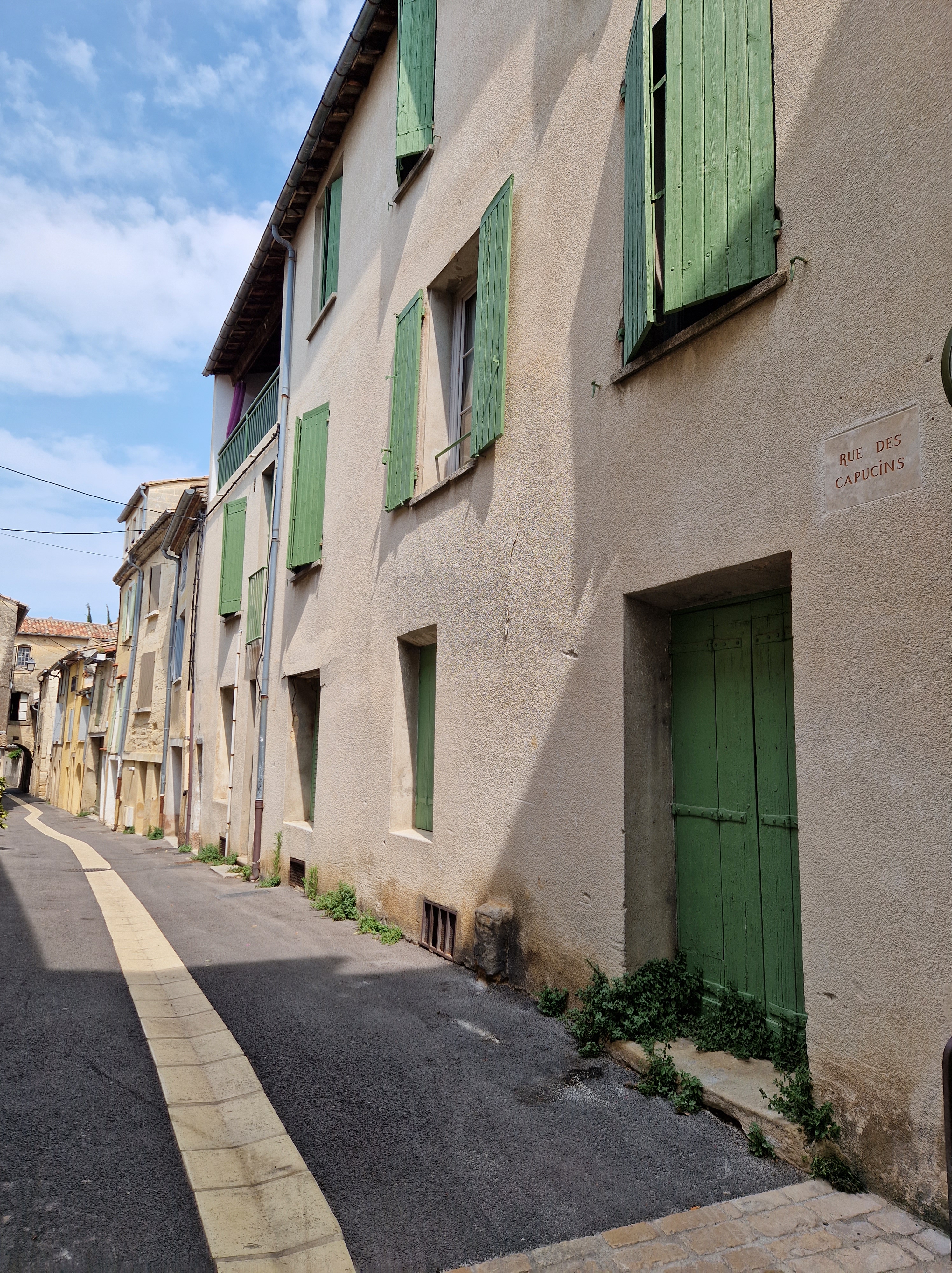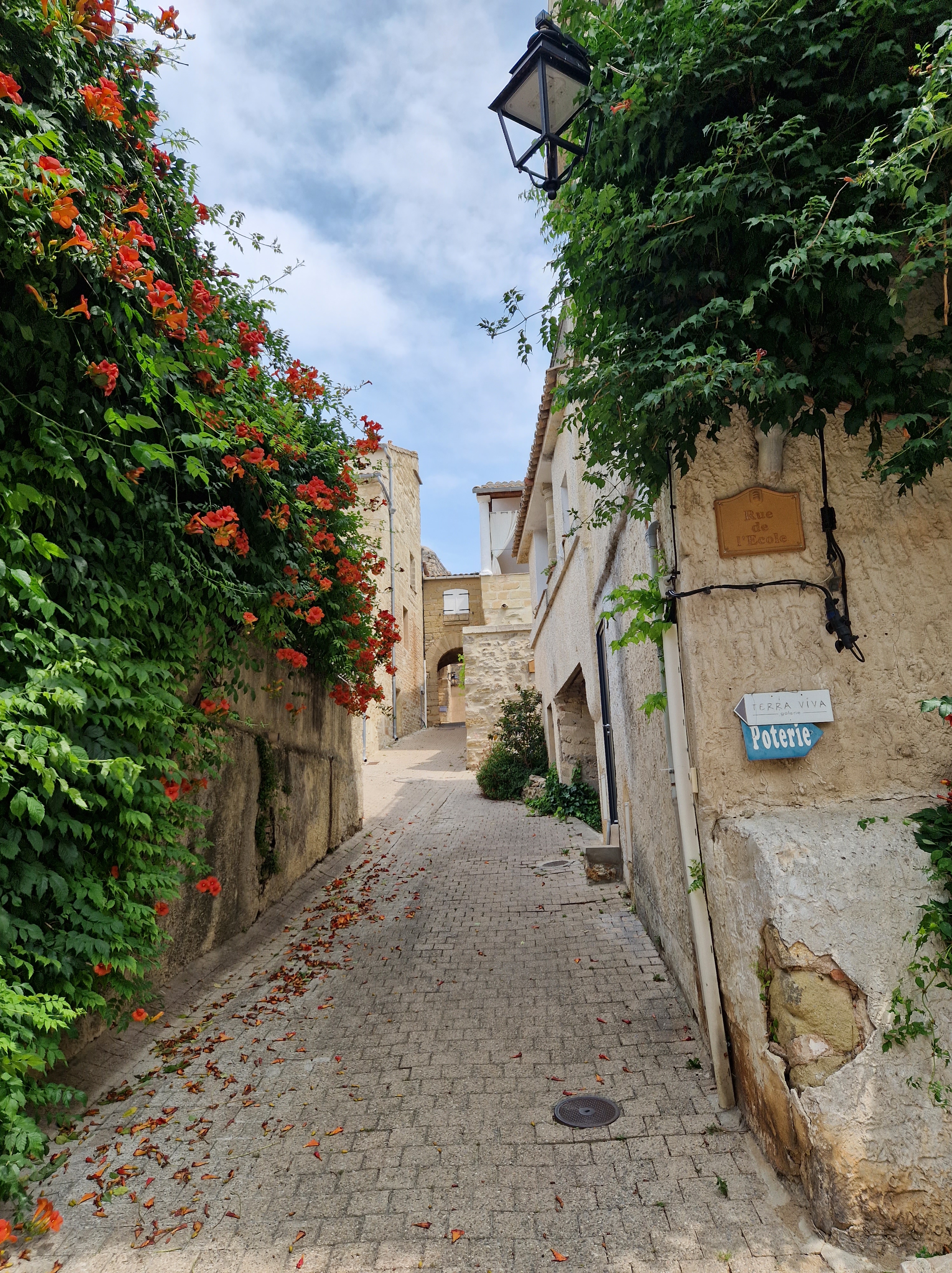 Langs wijngaarden en lavendelvelden en slingerend door een bos komen we via een semi-verhard weggetje bij Saint Christol de Rodières, een dorpje als mijn verzameling Provençaalse huisjes. We krauten door de steegjes, net breed genoeg voor de Dyane, onder een boog van een huis door naar het volgende gangetje. Roze, witte en rode oleander-explosies tegen de gevels, een schitterend gezicht. Alles is helaas te krap om goeie foto’s van te nemen. In een gebied dat we als onze broekzak dachten te kennen zien we zo toch nieuwe dingen.
