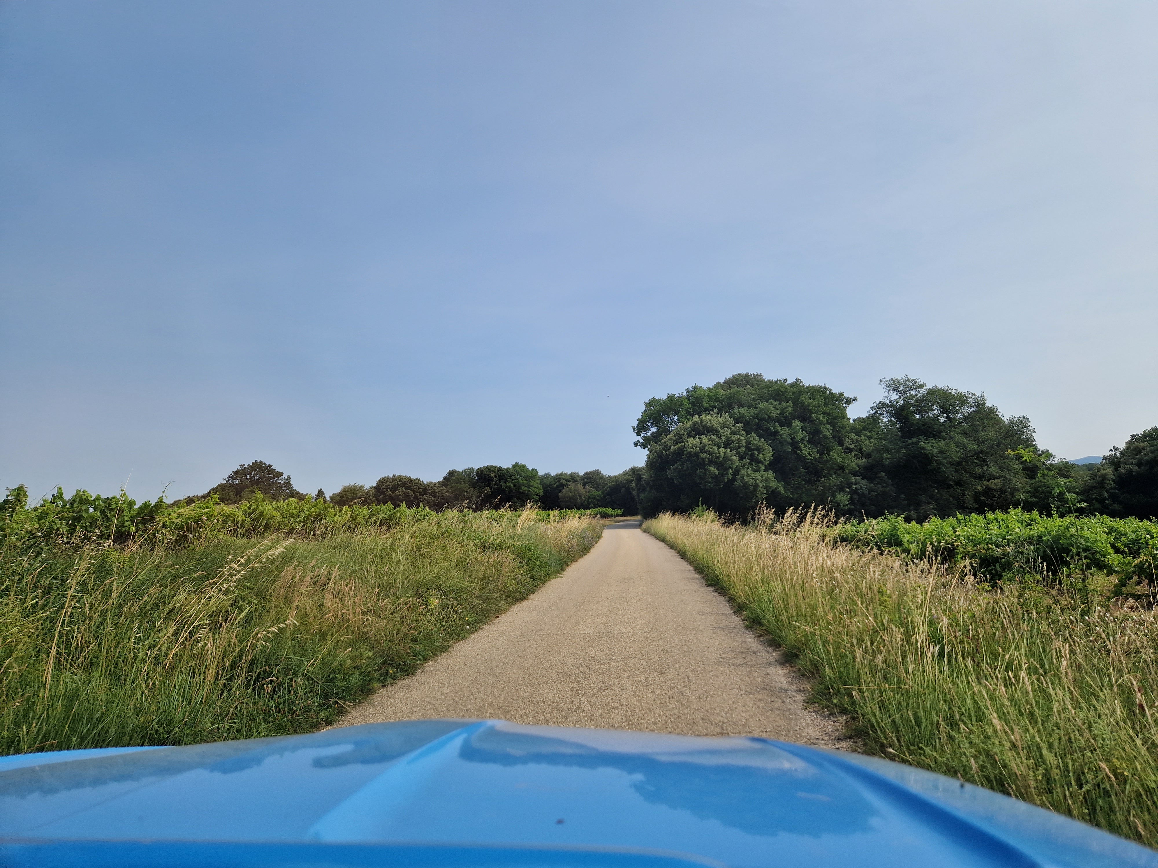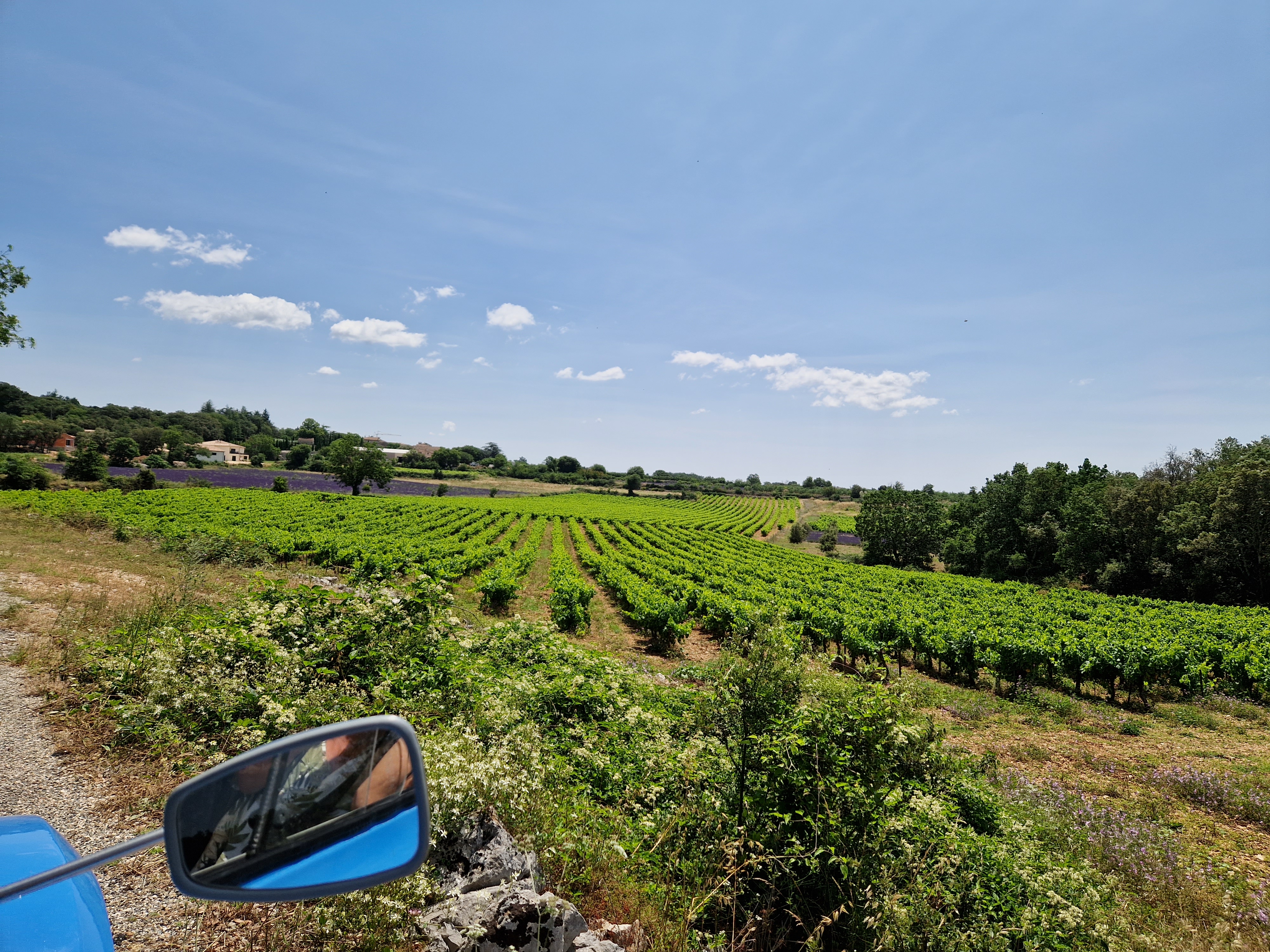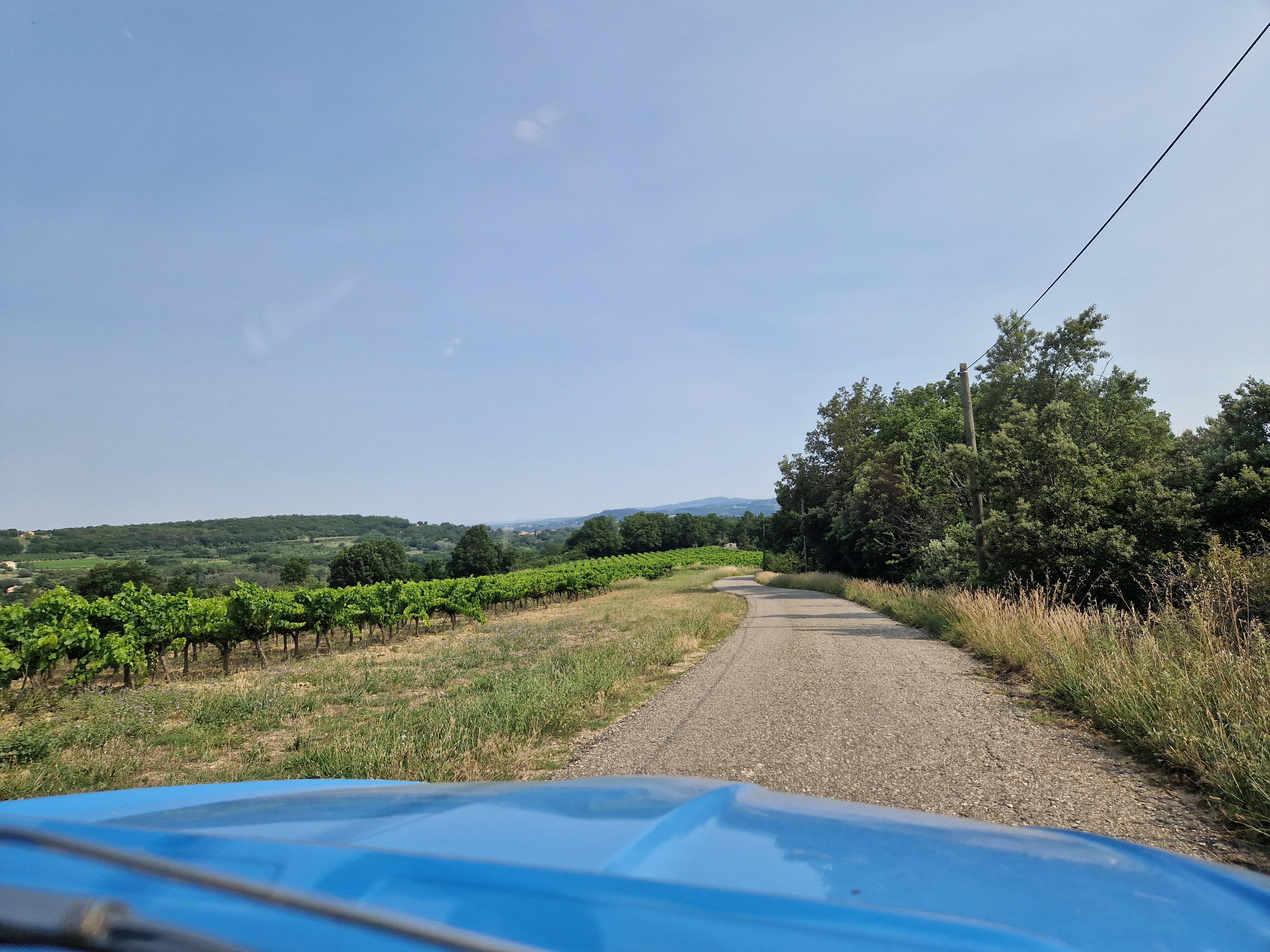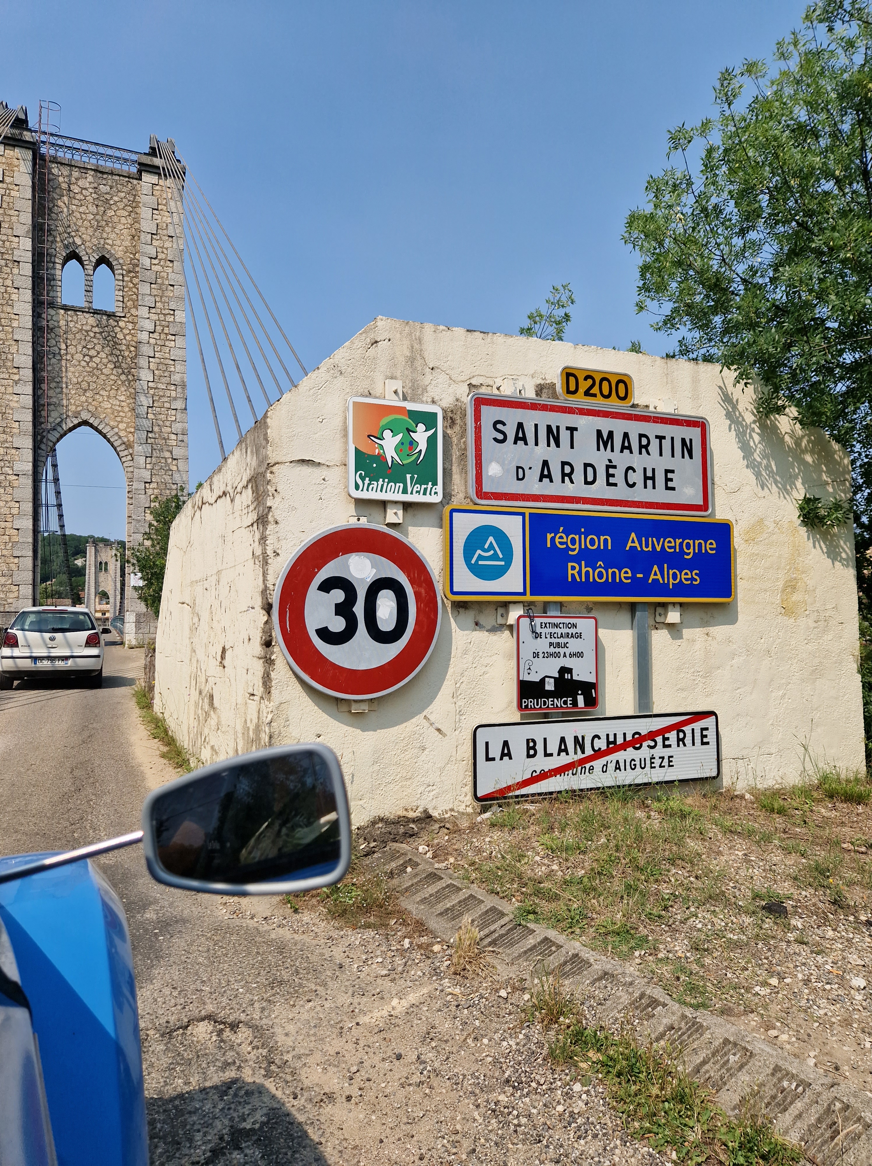 Aan het eind van de middag zijn we het mooi zitten en dom kijken een beetje zat. Even de wind door de haren, een zogenaamde “spannende route” de heuvels in. We zwaaien naar een knalroze eend voor ons die linksaf slaat. Wij slaan rechtsaf richting Saint Martin d’Ardèche. Brugje over, altijd leuk. We maken een mooi rondje met een stuk Gorges d’Ardèche de verkeerde kant om. Via zo goed als onverharde landweggetjes tussen de druiven door komen we weer terug bij de brug in Saint Martin.