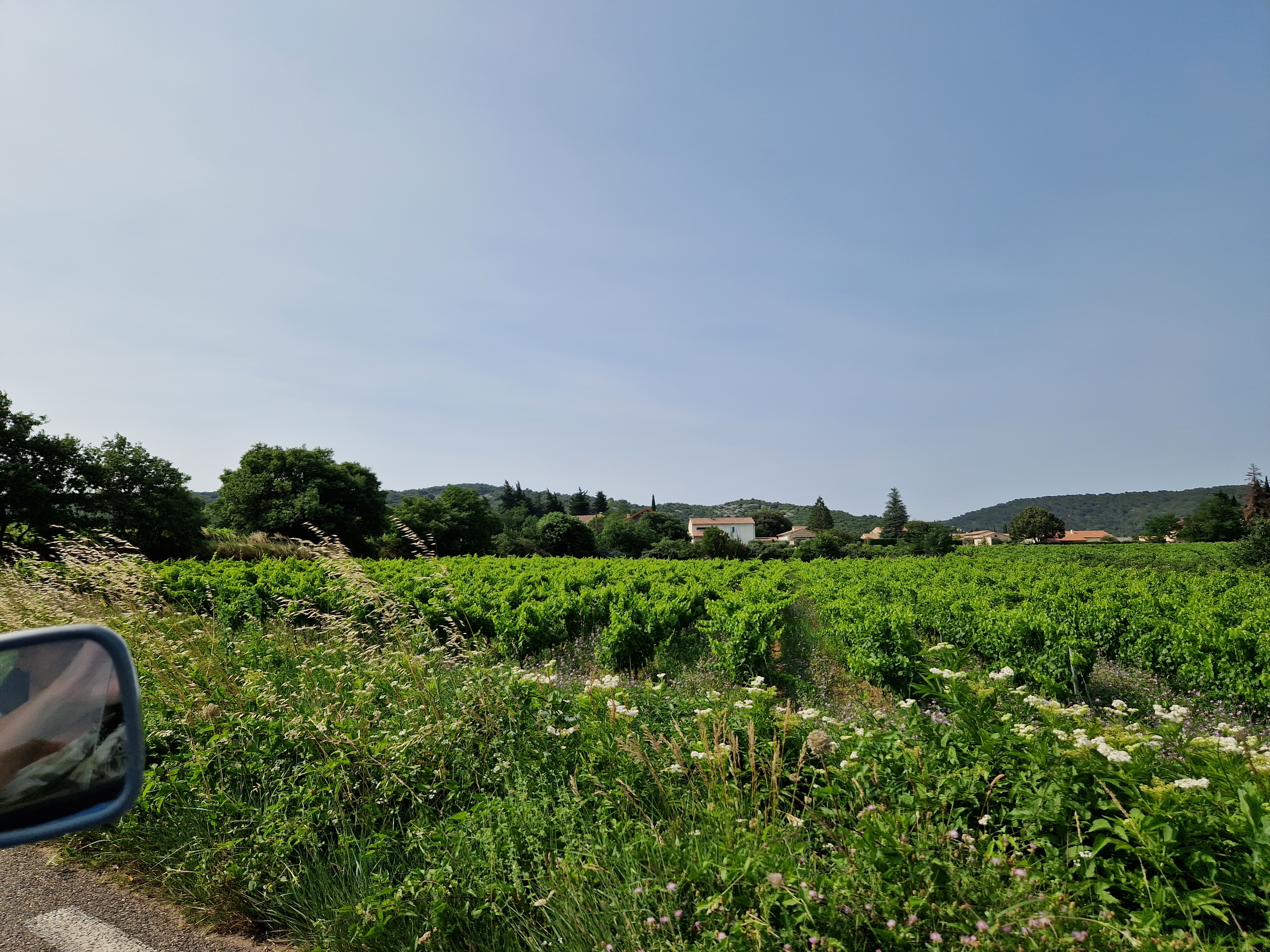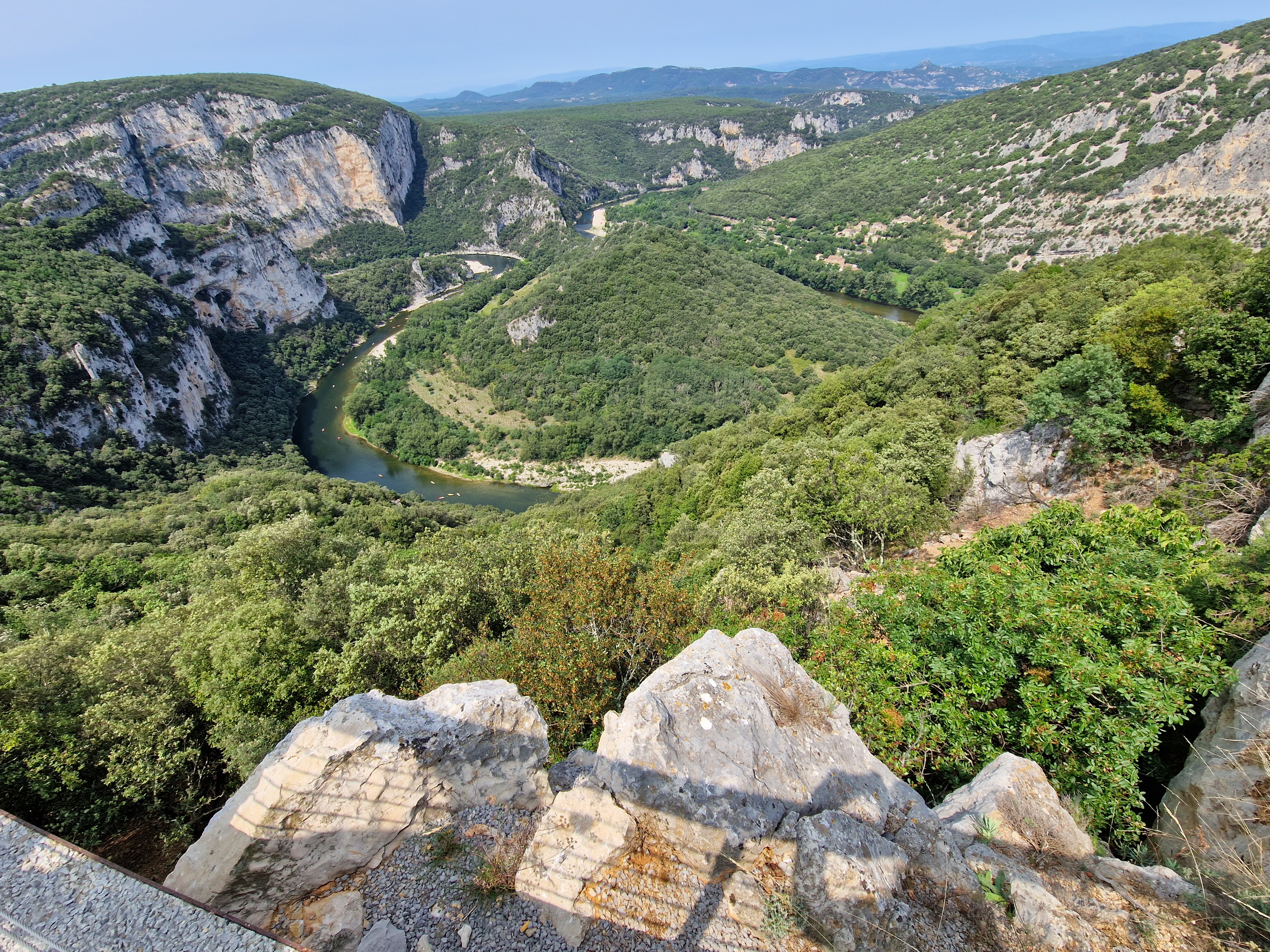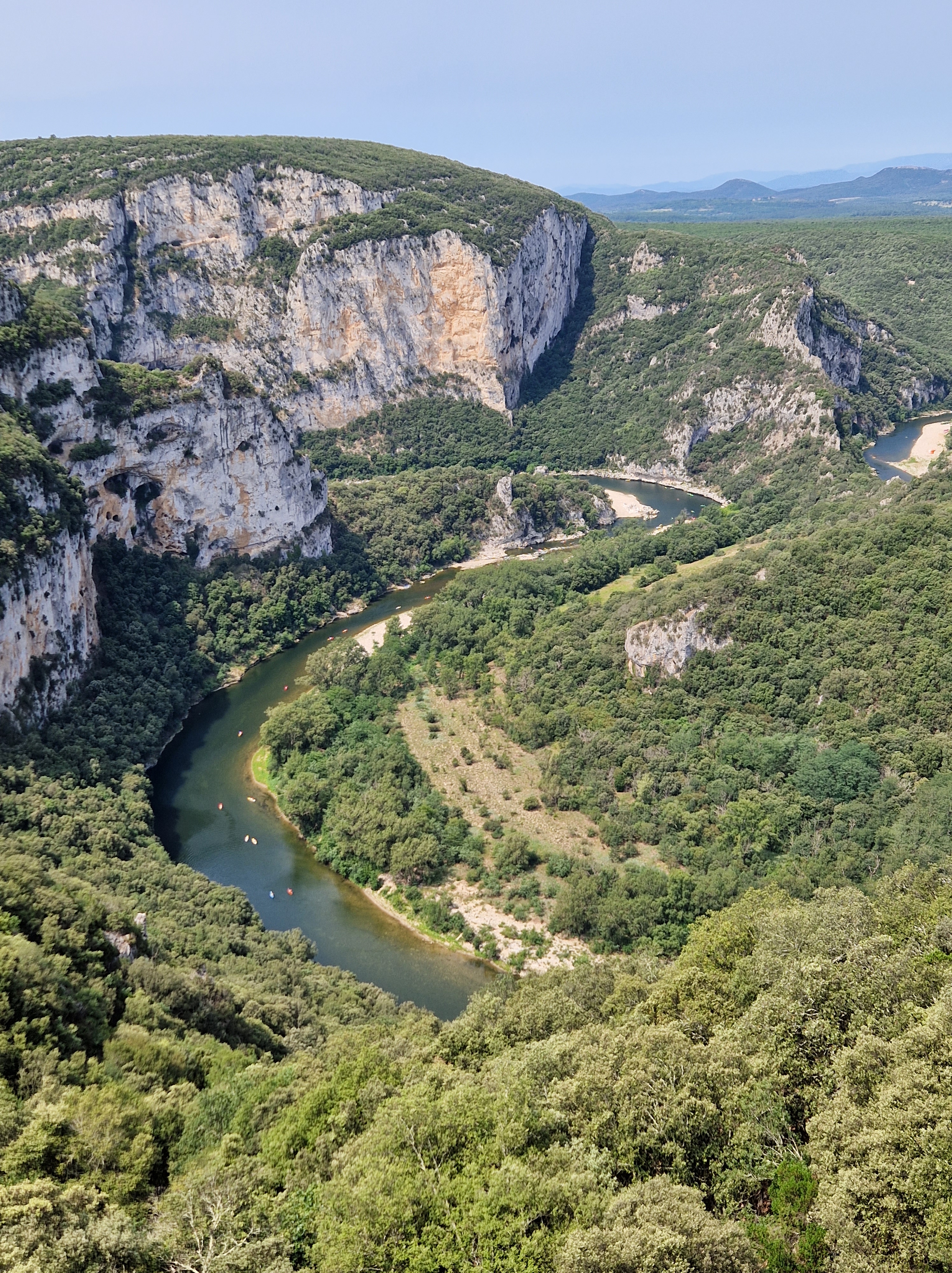 Aan het eind van de middag zijn we het mooi zitten en dom kijken een beetje zat. Even de wind door de haren, een zogenaamde “spannende route” de heuvels in. We zwaaien naar een knalroze eend voor ons die linksaf slaat. Wij slaan rechtsaf richting Saint Martin d’Ardèche. Brugje over, altijd leuk. We maken een mooi rondje met een stuk Gorges d’Ardèche de verkeerde kant om. Via zo goed als onverharde landweggetjes tussen de druiven door komen we weer terug bij de brug in Saint Martin.