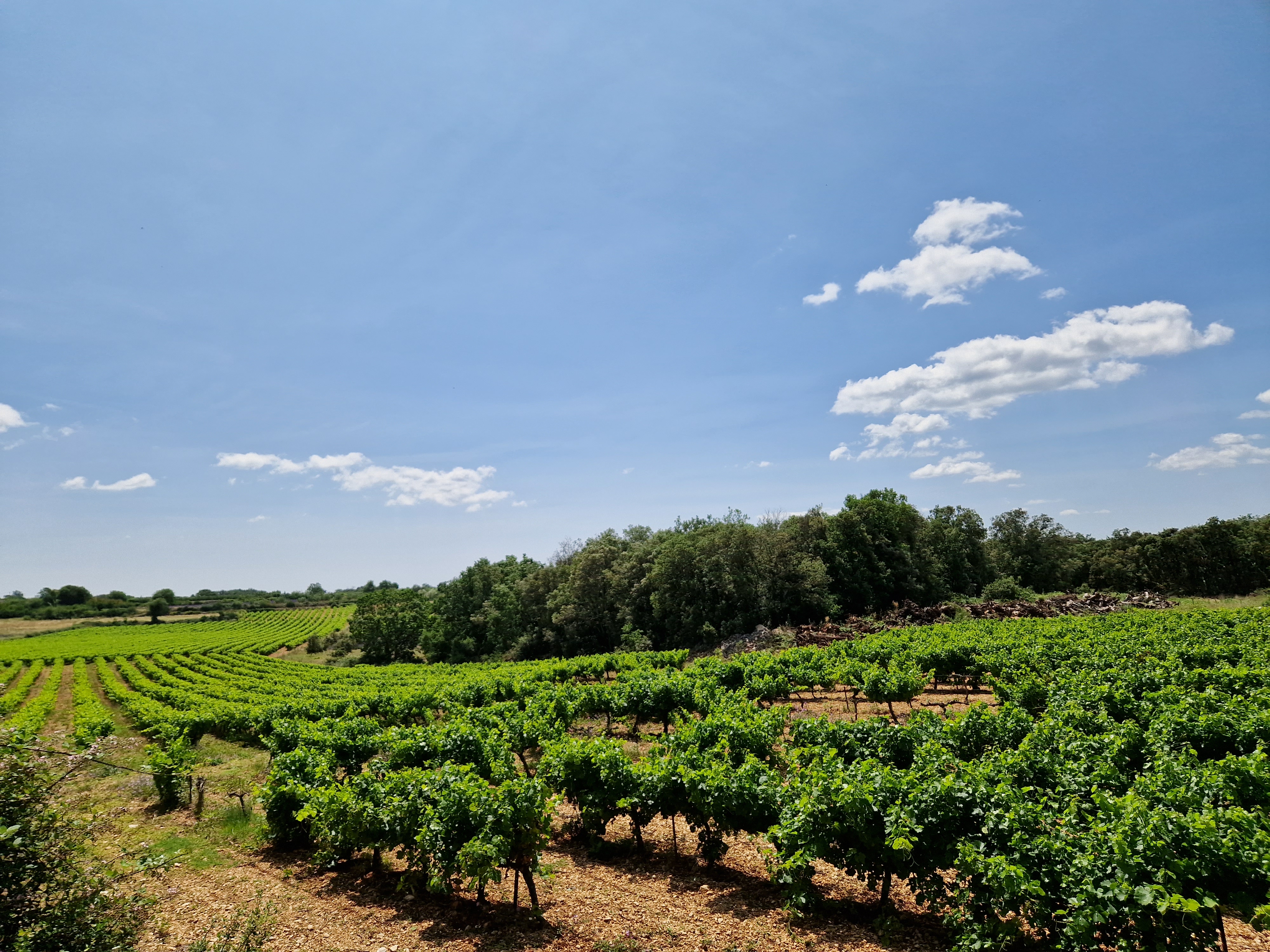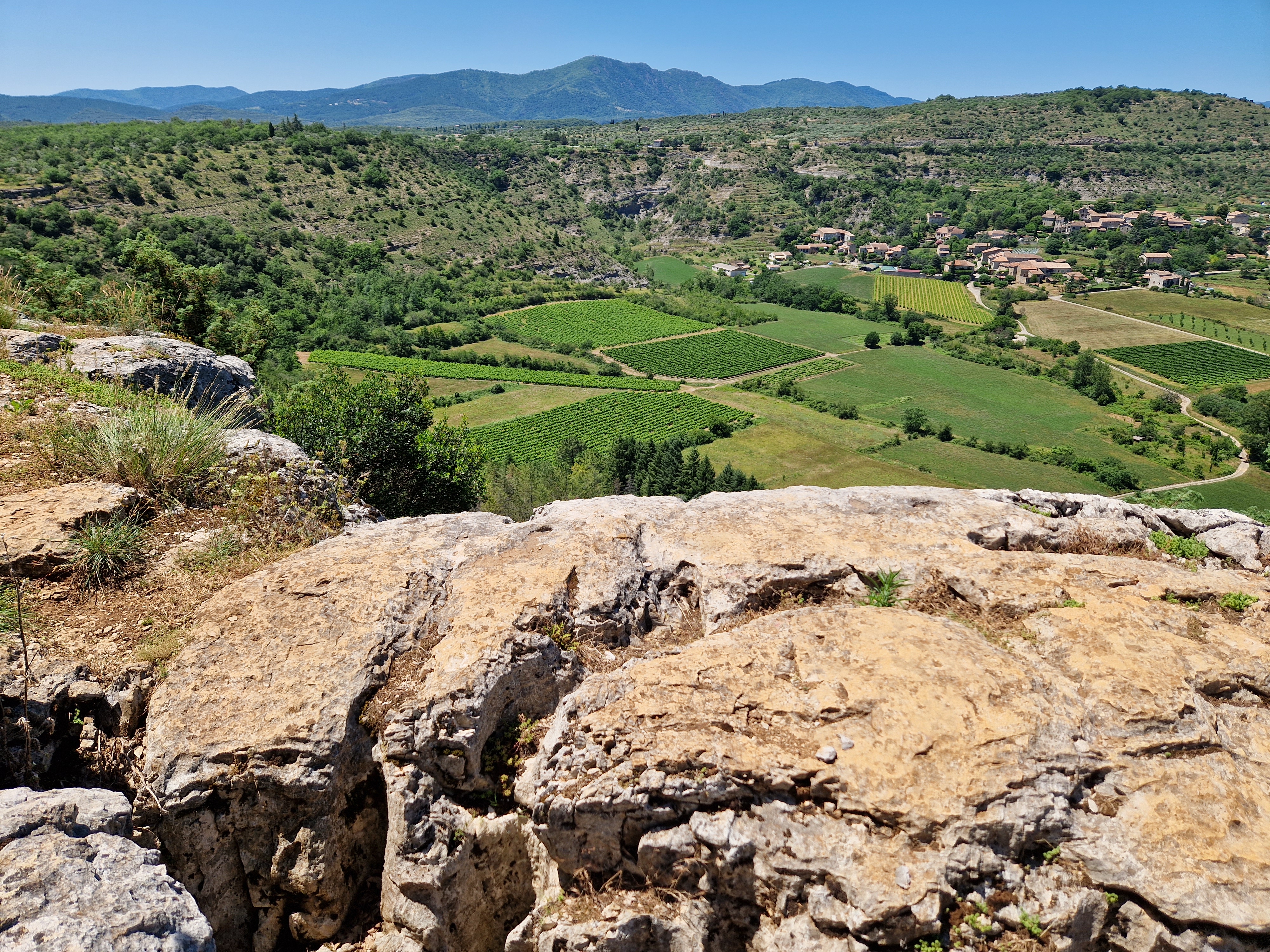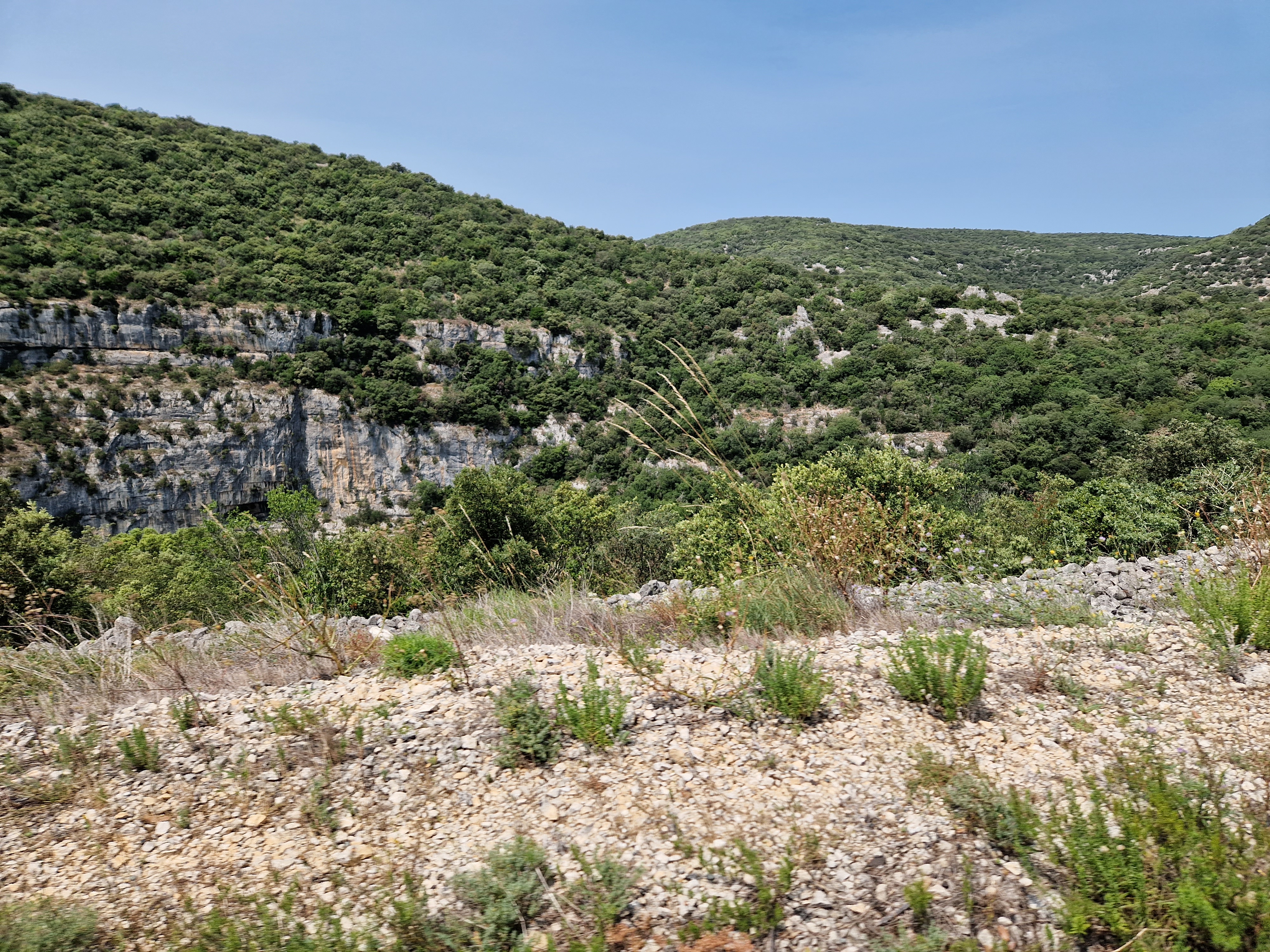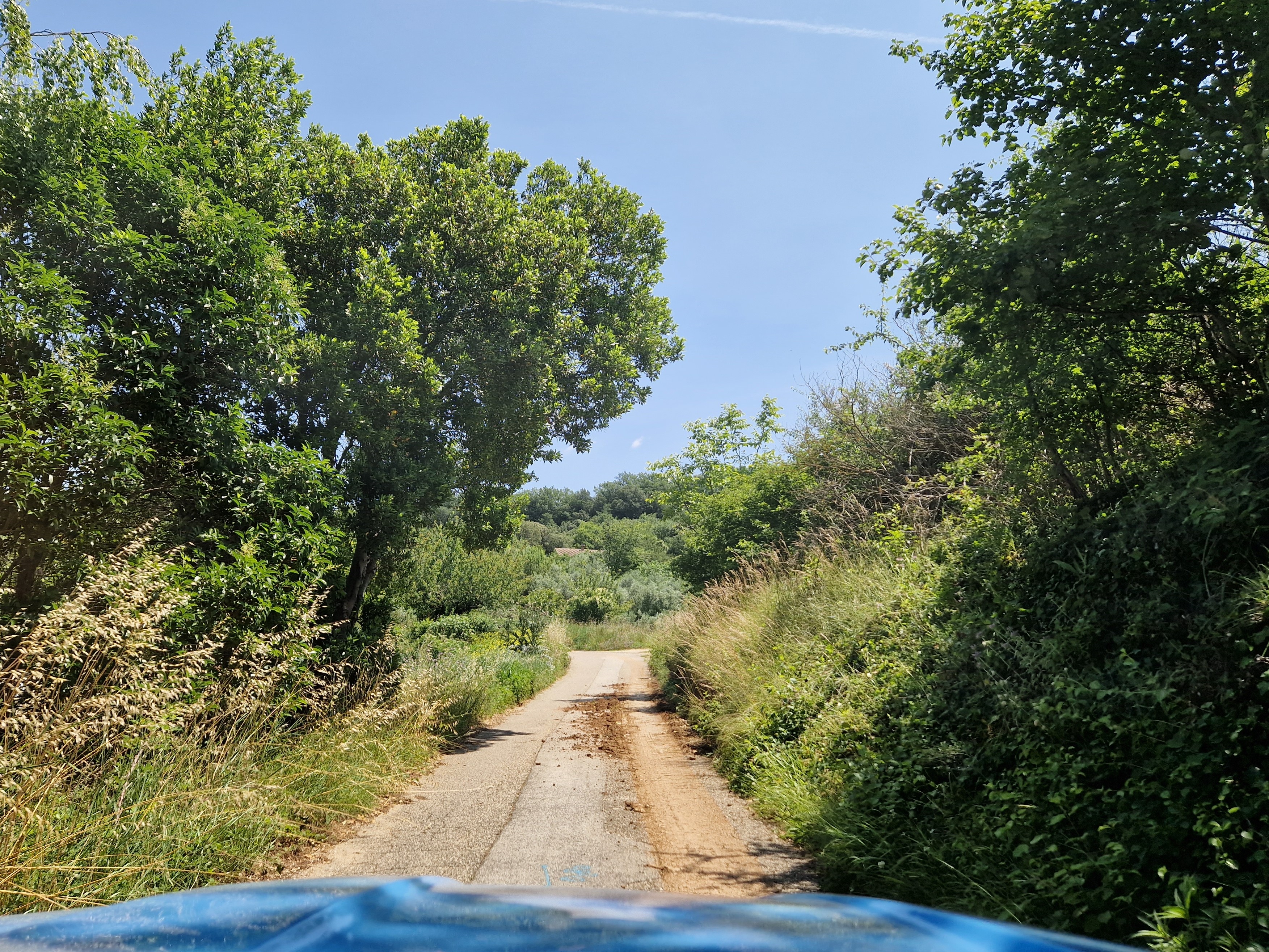 Aan het eind van de middag zijn we het mooi zitten en dom kijken een beetje zat. Even de wind door de haren, een zogenaamde “spannende route” de heuvels in. We zwaaien naar een knalroze eend voor ons die linksaf slaat. Wij slaan rechtsaf richting Saint Martin d’Ardèche. Brugje over, altijd leuk. We maken een mooi rondje met een stuk Gorges d’Ardèche de verkeerde kant om. Via zo goed als onverharde landweggetjes tussen de druiven door komen we weer terug bij de brug in Saint Martin.