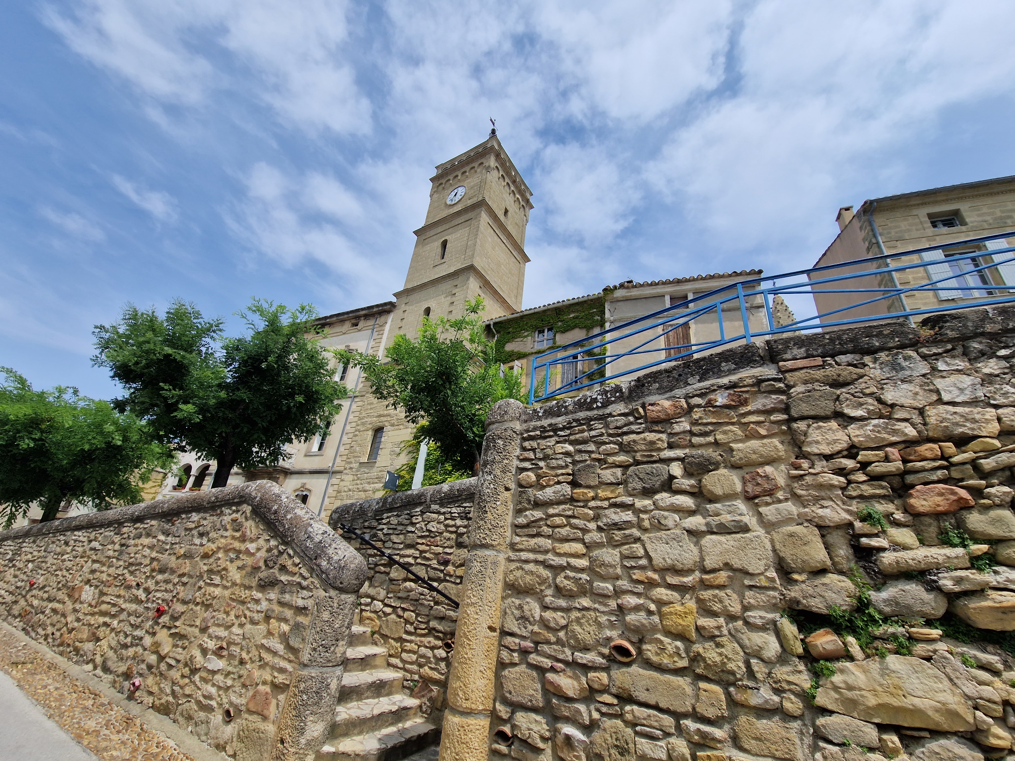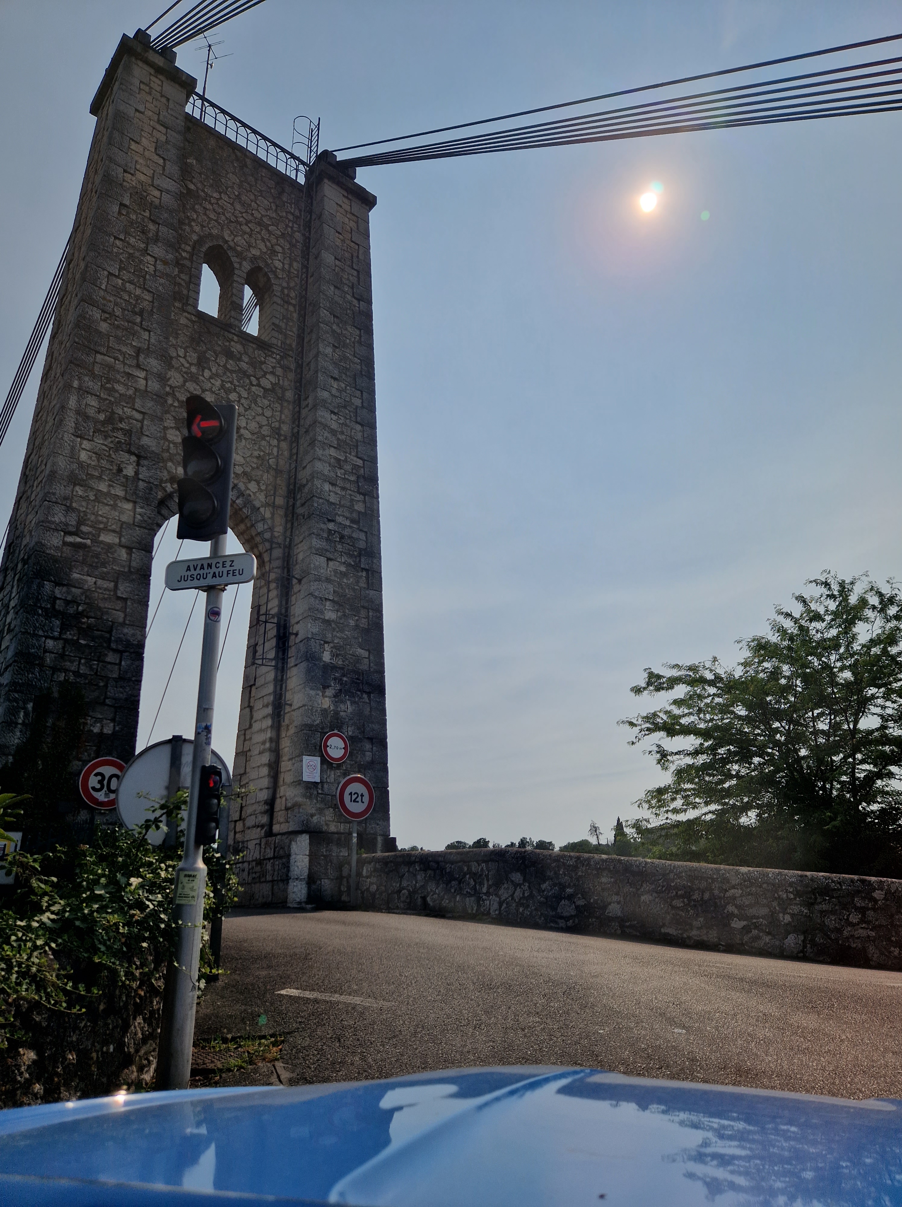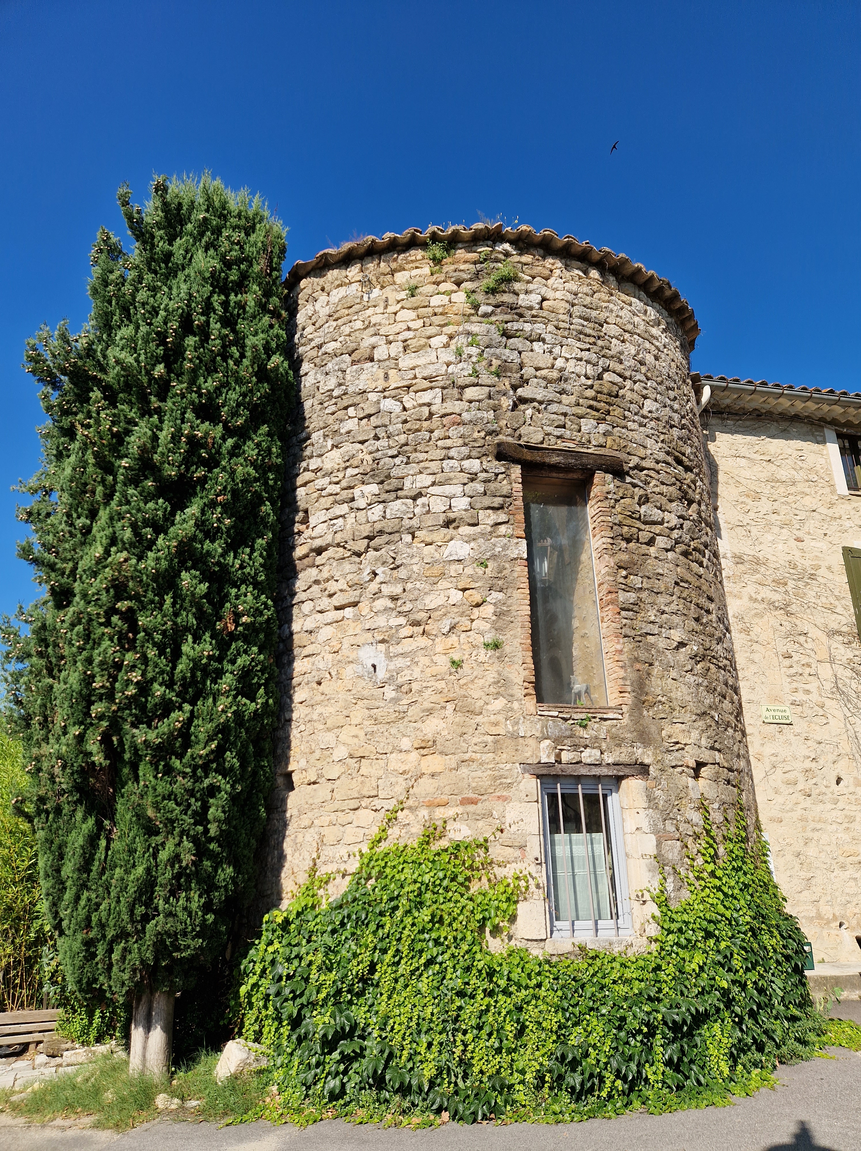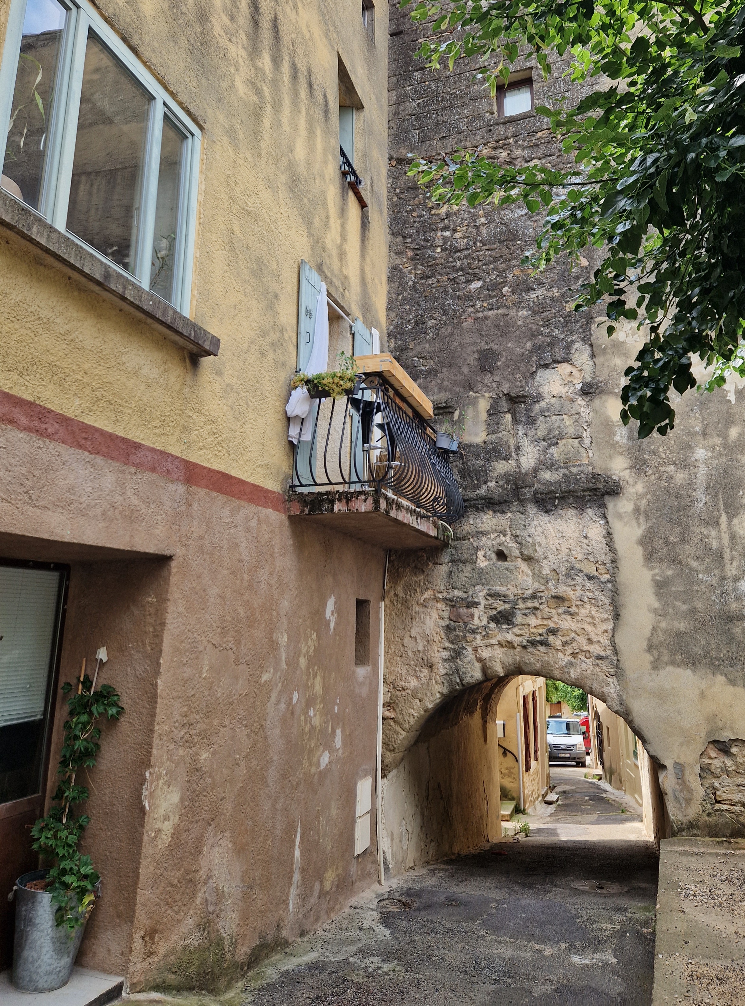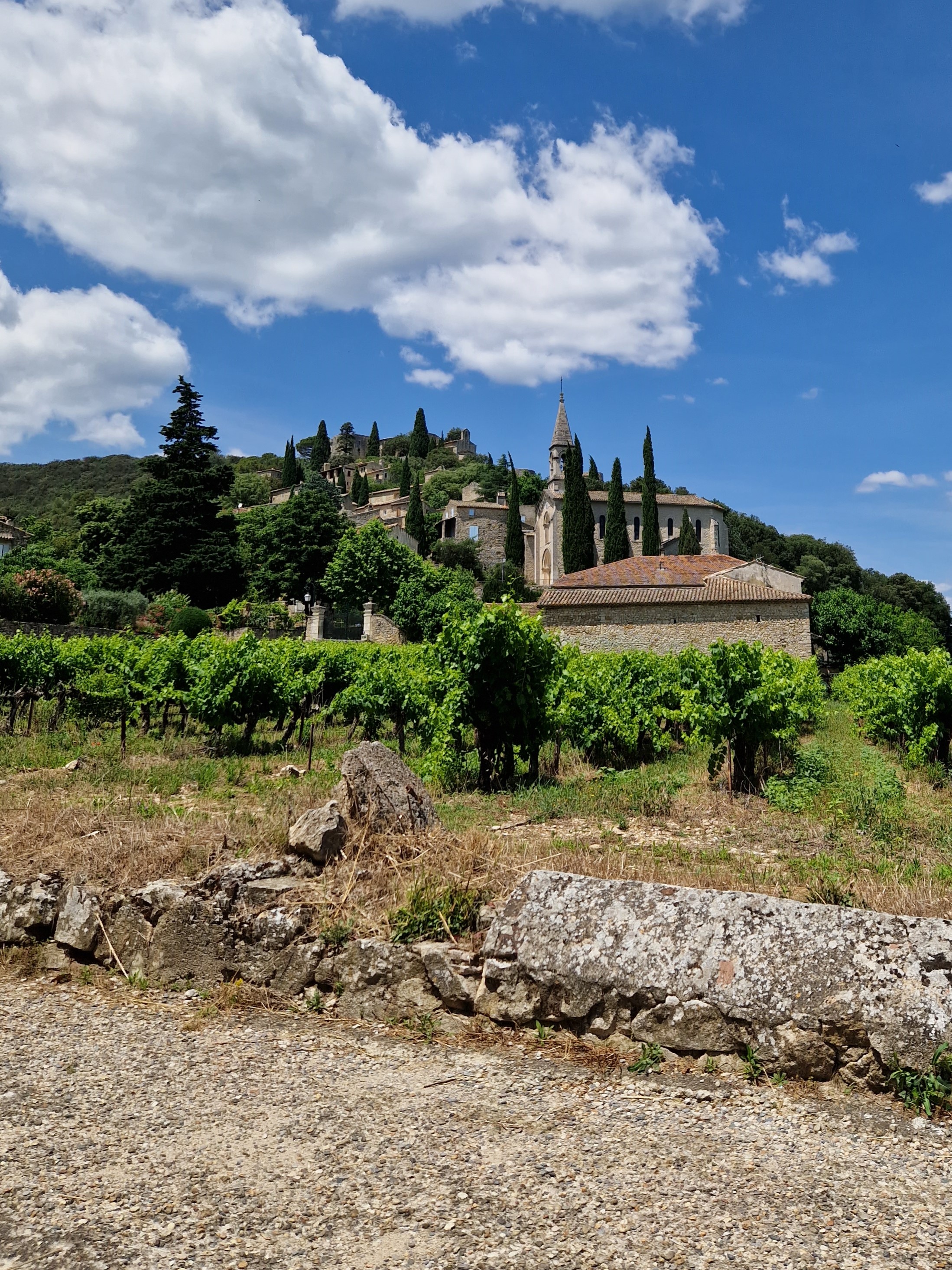 Blijkbaar hebben we een omtrekkende beweging naar La Roque-sur-Cèze gemaakt. Via het grappige bruggetje over de Cèze, eígenlijk te smal voor een moderne auto maar perfect voor ons, passeren we onderlangs het stadje waar we vorig jaar naar boven zijn geklommen.