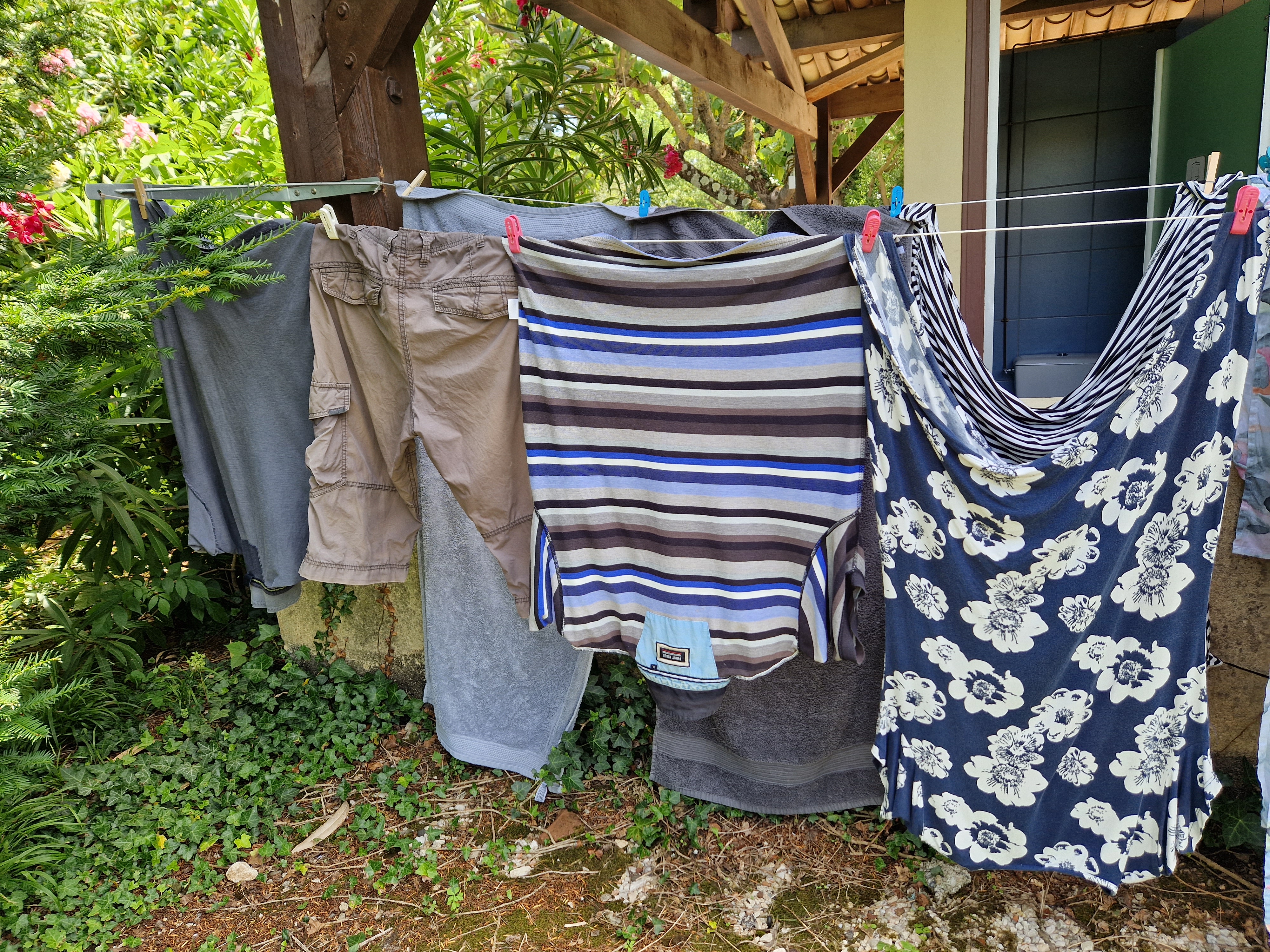 Nee, niet in het Lavoir. In nieuwe wasmachines, fantastische dingen. De handdoeken en het grotere wasgoed aan de gemeenschappelijke waslijnen, het kleine spul op het rekje. Het stormt hard en de zon schijnt net zo hard.