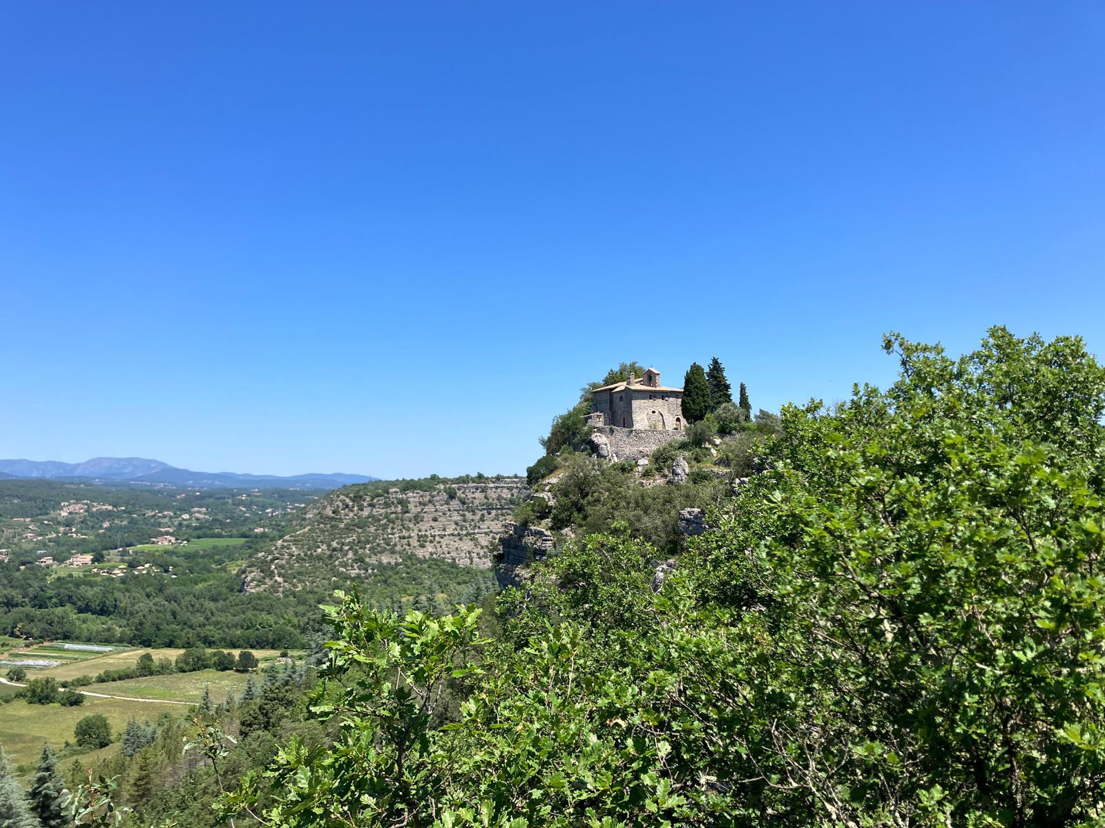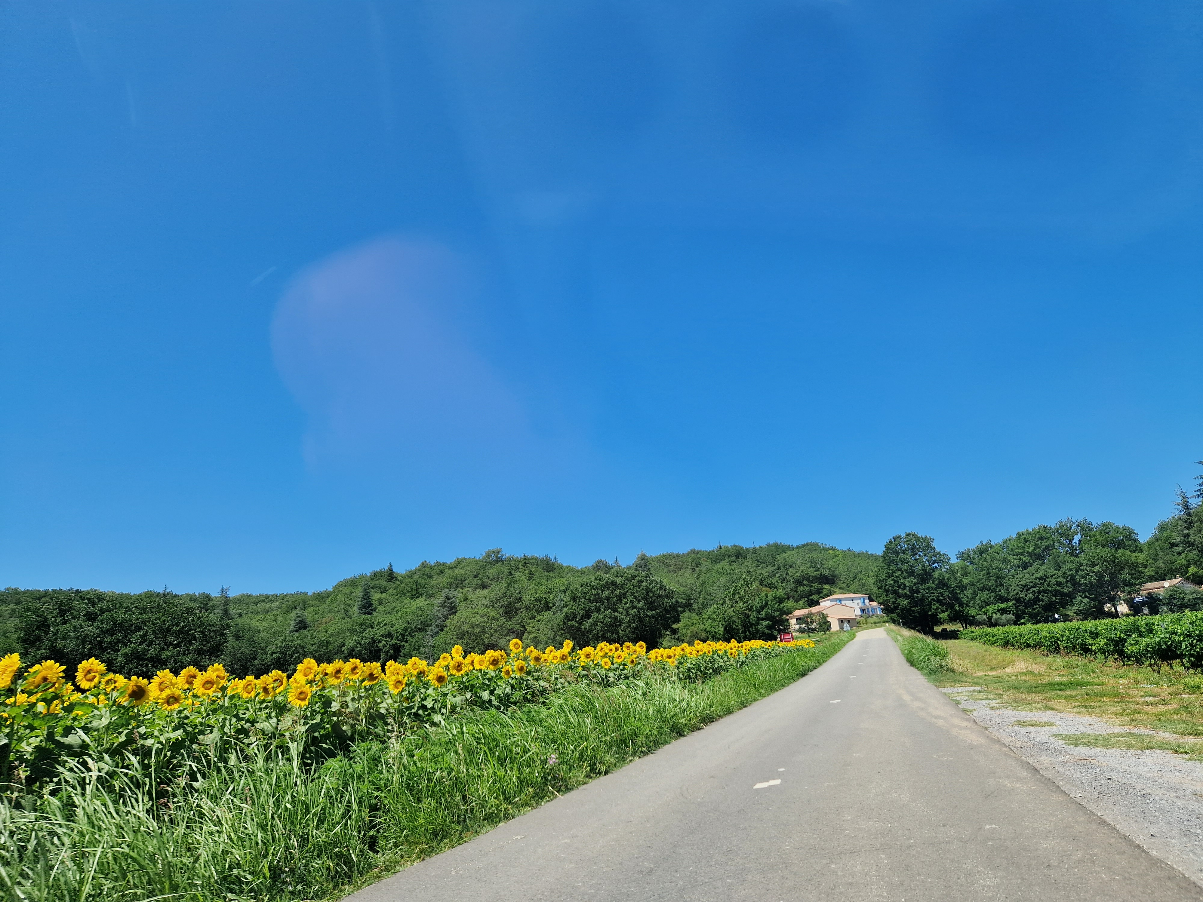 De meest rechtstreekse weg naar Bois de Païolive slingert als een gek. We gaan 9% omhoog, halen een eenzame fietser in die met volle bepakking de haarspelden trotseert. Met blote bast, ik hoop dat hij genoeg water bij zich heeft. Je ziet hem bijna verdampen.