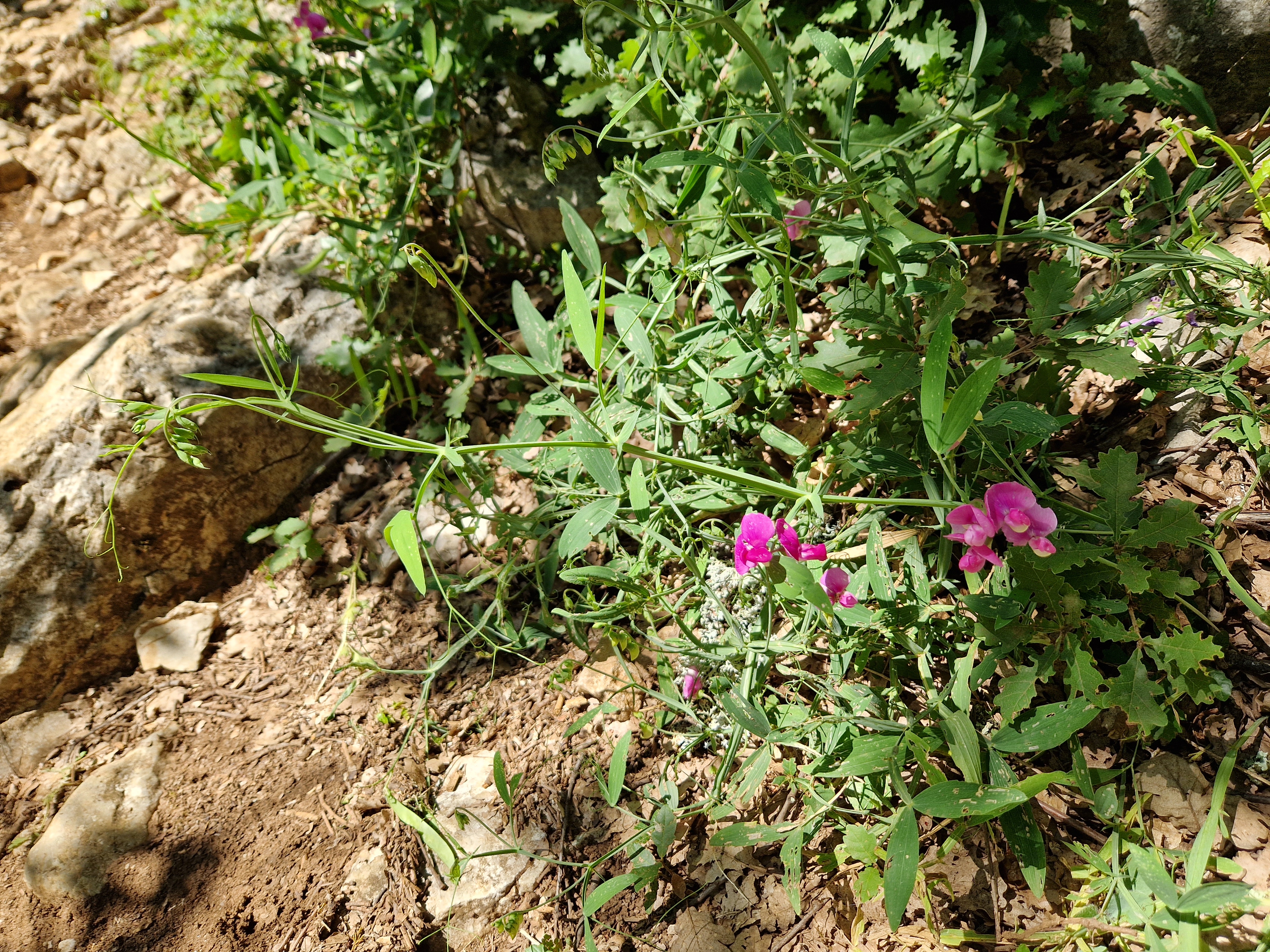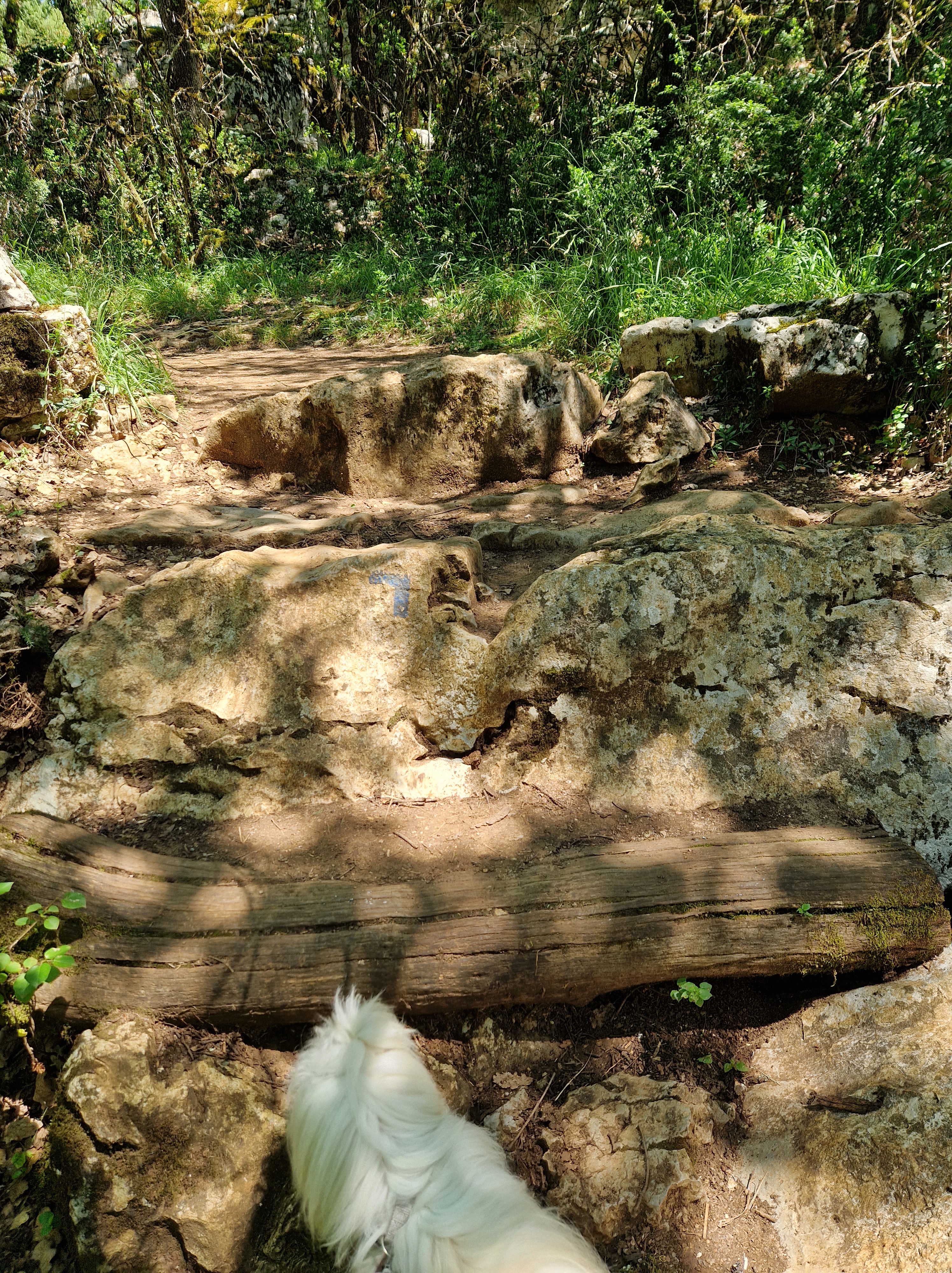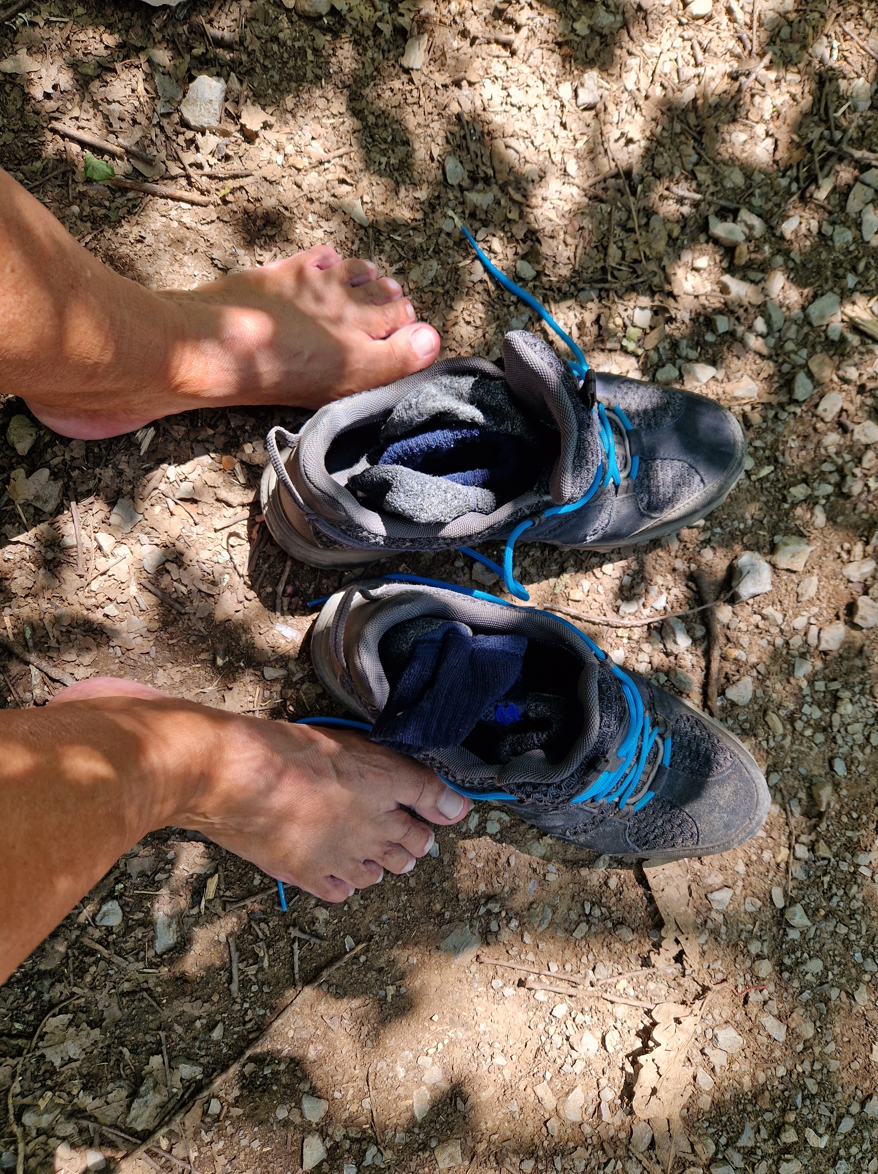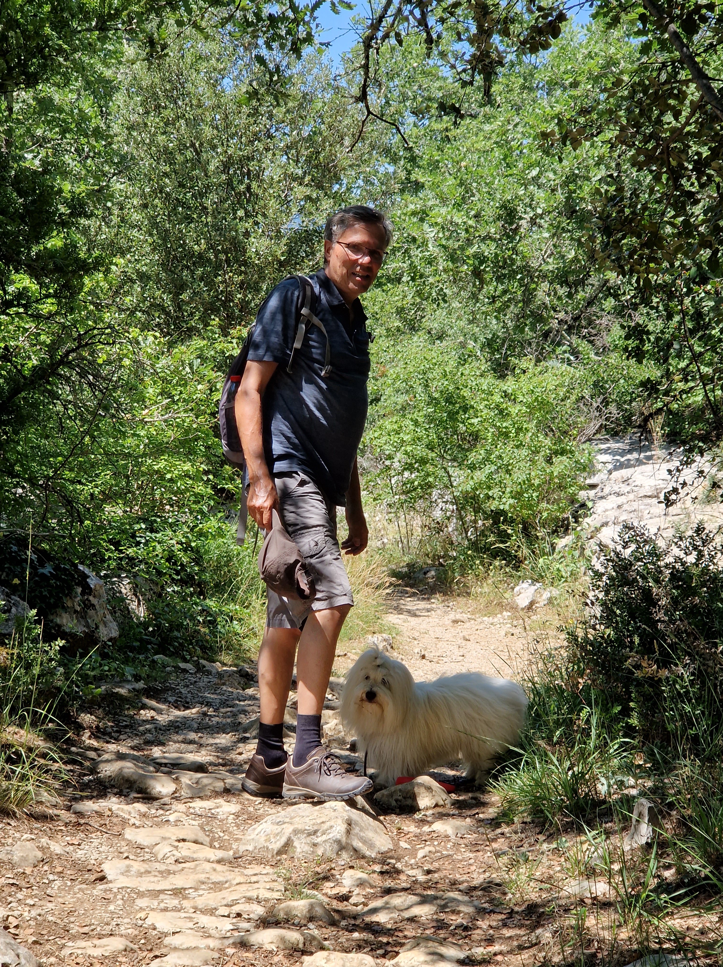 Ravi springt als een klipgeit voor ons uit, zoekt intuïtief zijn weg waar ik over elke stap moet nadenken om niet mijn nek te breken. Factor 50 smelt van mijn vel in de zon, onder de bomen met een vlaagje wind is het koeler. Wilde lathyrus piept tussen de struiken door het pad op. Cigales zingzagen, bijna rinkelend, het is een kabaal van jewelste in het stille bos. Na het uitkijkpunt bij het kleine klooster blijven we klimmen en dalen tussen rotsen, stenen muurtjes en bomen die regelmatig als anker fungeren. Na twee-en-een-half uur zijn we terug bij de auto. Schoenen en sokken uit. De blarenpleisters hebben hun werk goed gedaan.
