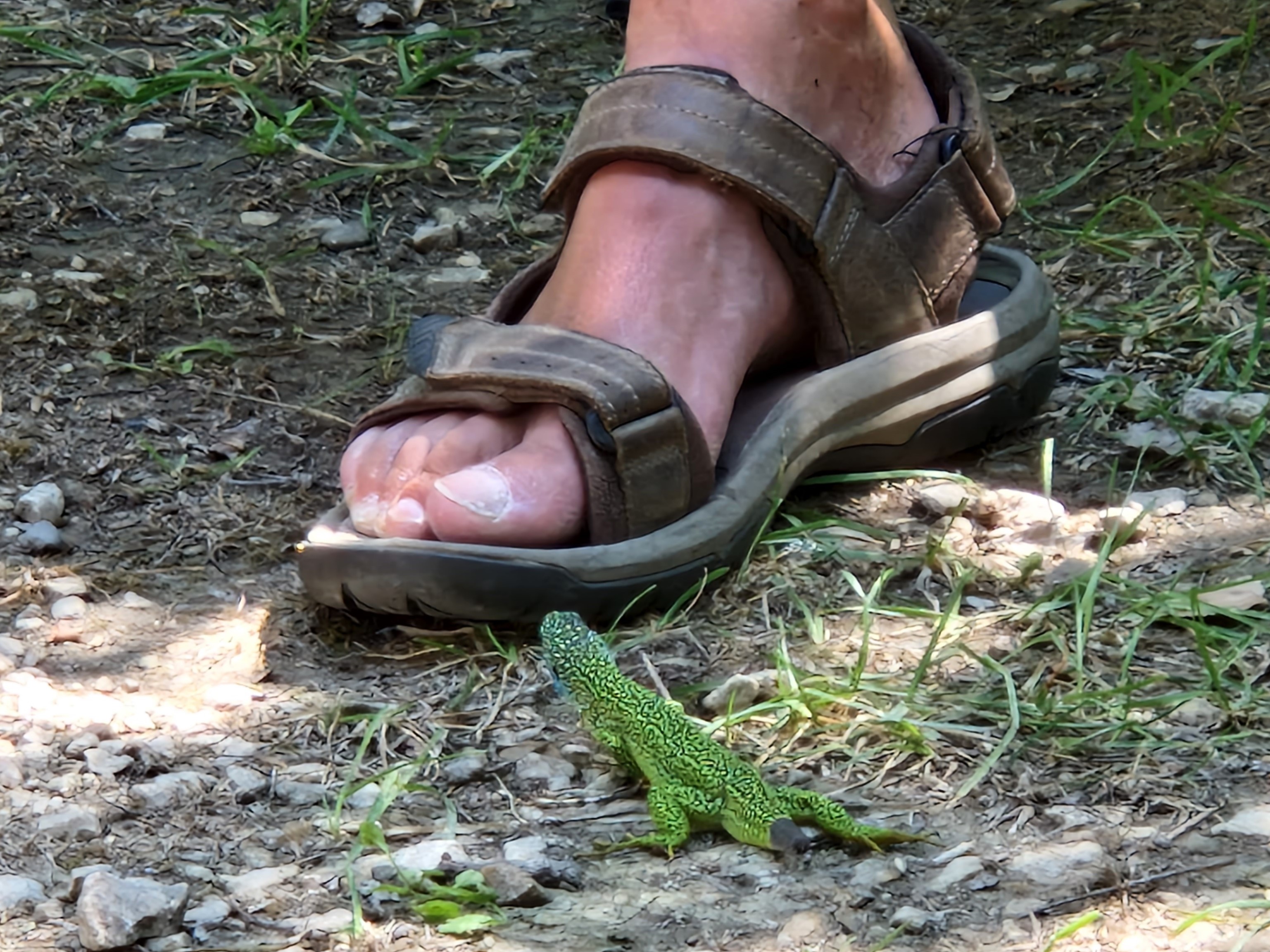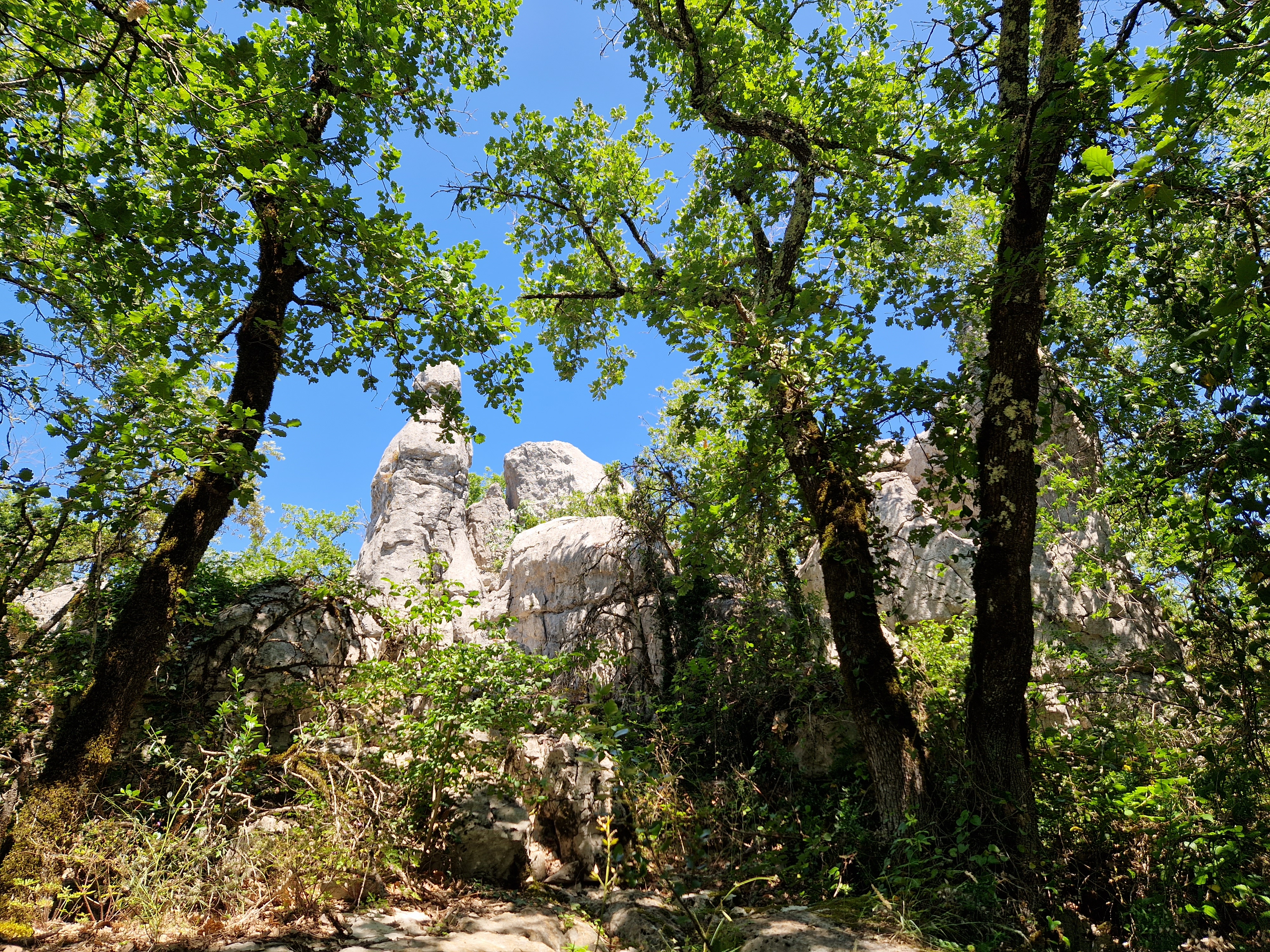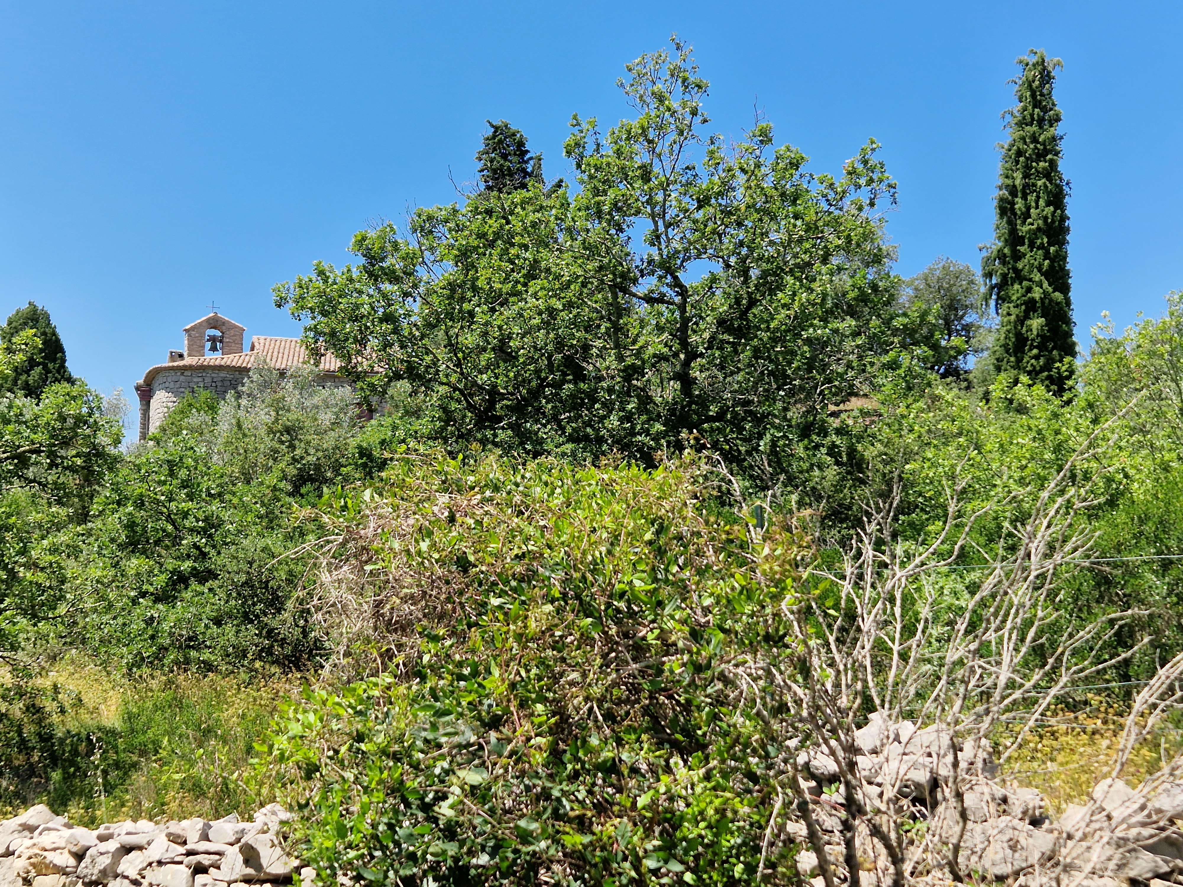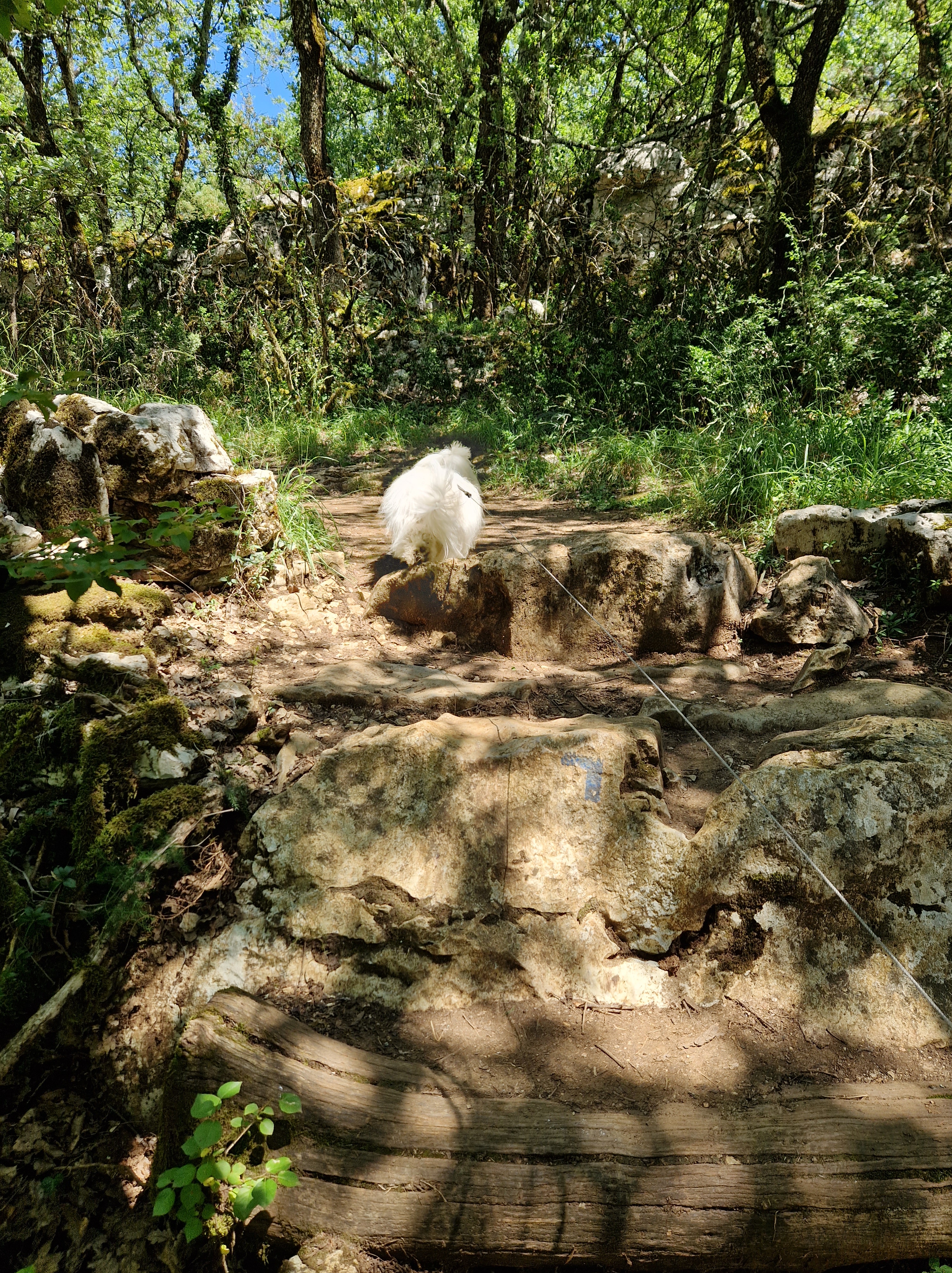 Ravi springt als een klipgeit voor ons uit, zoekt intuïtief zijn weg waar ik over elke stap moet nadenken om niet mijn nek te breken. Factor 50 smelt van mijn vel in de zon, onder de bomen met een vlaagje wind is het koeler. Wilde lathyrus piept tussen de struiken door het pad op. Cigales zingzagen, bijna rinkelend, het is een kabaal van jewelste in het stille bos. Na het uitkijkpunt bij het kleine klooster blijven we klimmen en dalen tussen rotsen, stenen muurtjes en bomen die regelmatig als anker fungeren. Na twee-en-een-half uur zijn we terug bij de auto. Schoenen en sokken uit. De blarenpleisters hebben hun werk goed gedaan.