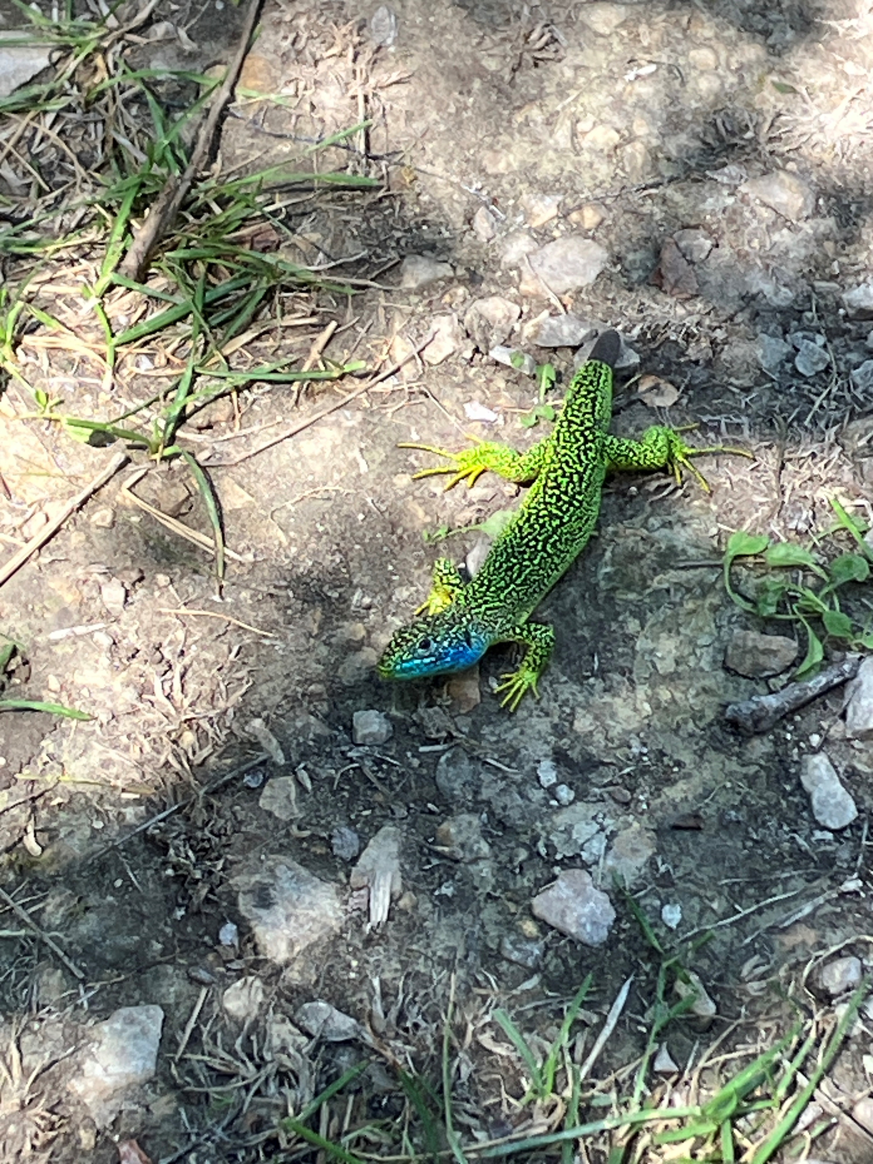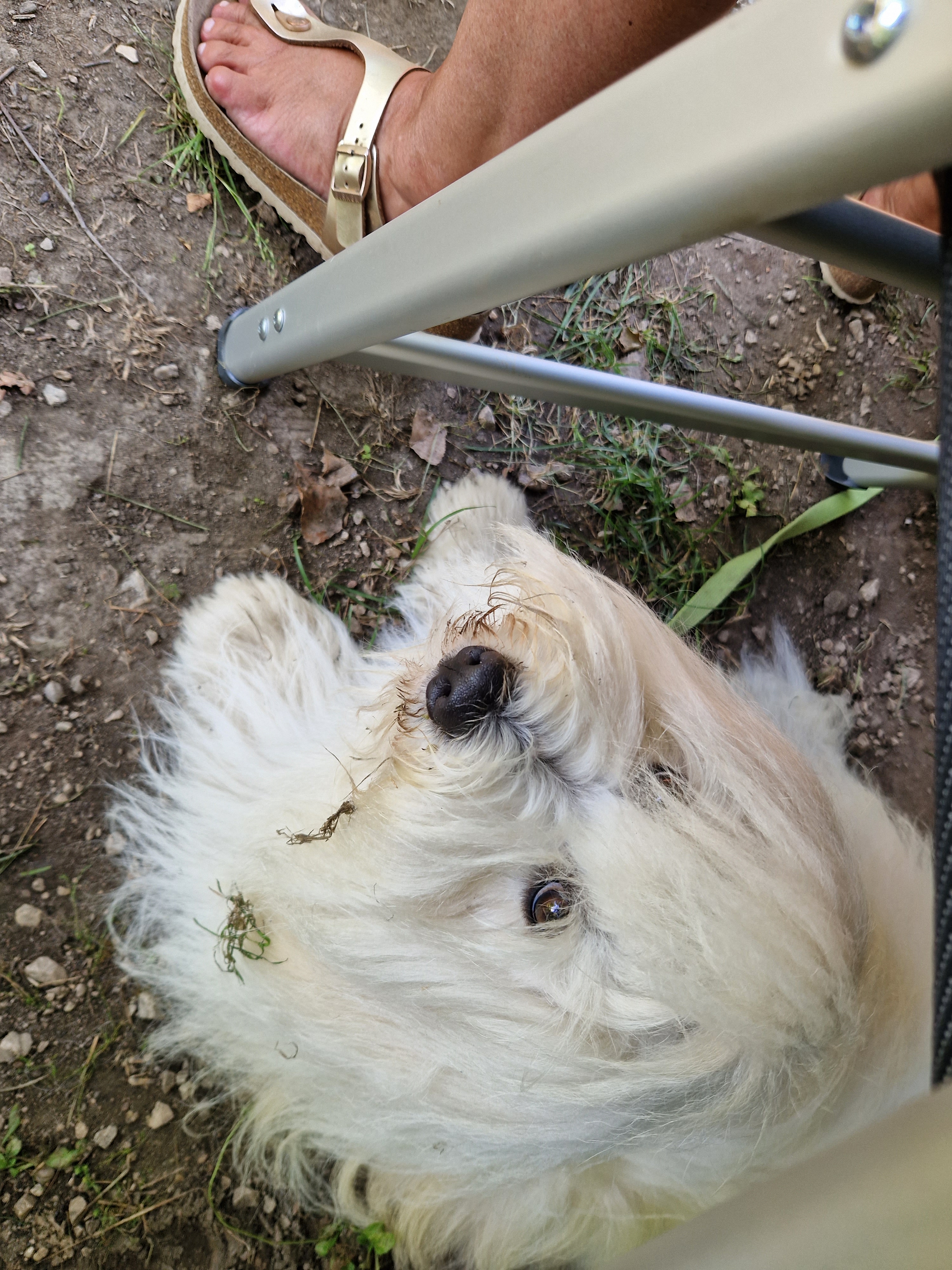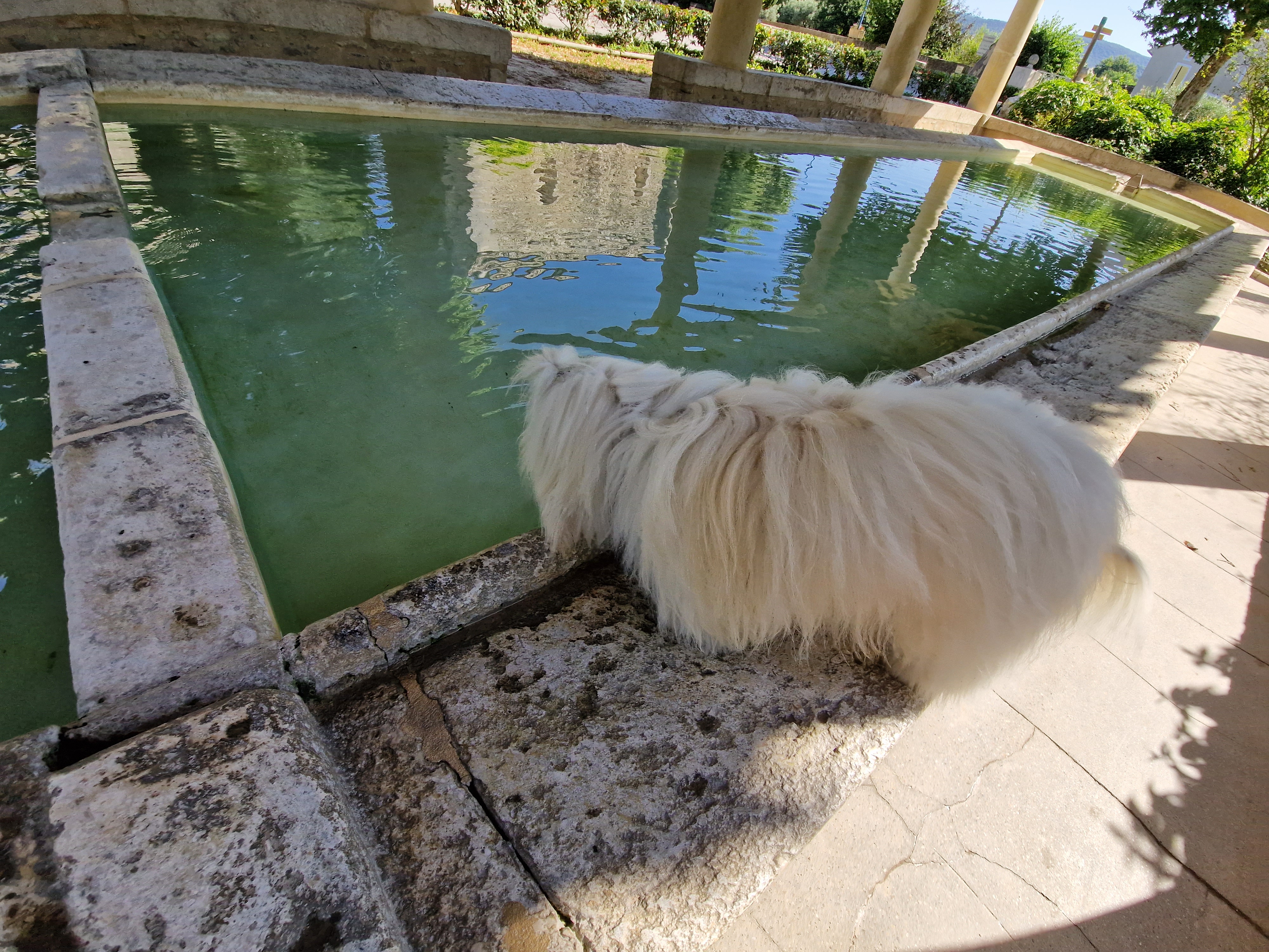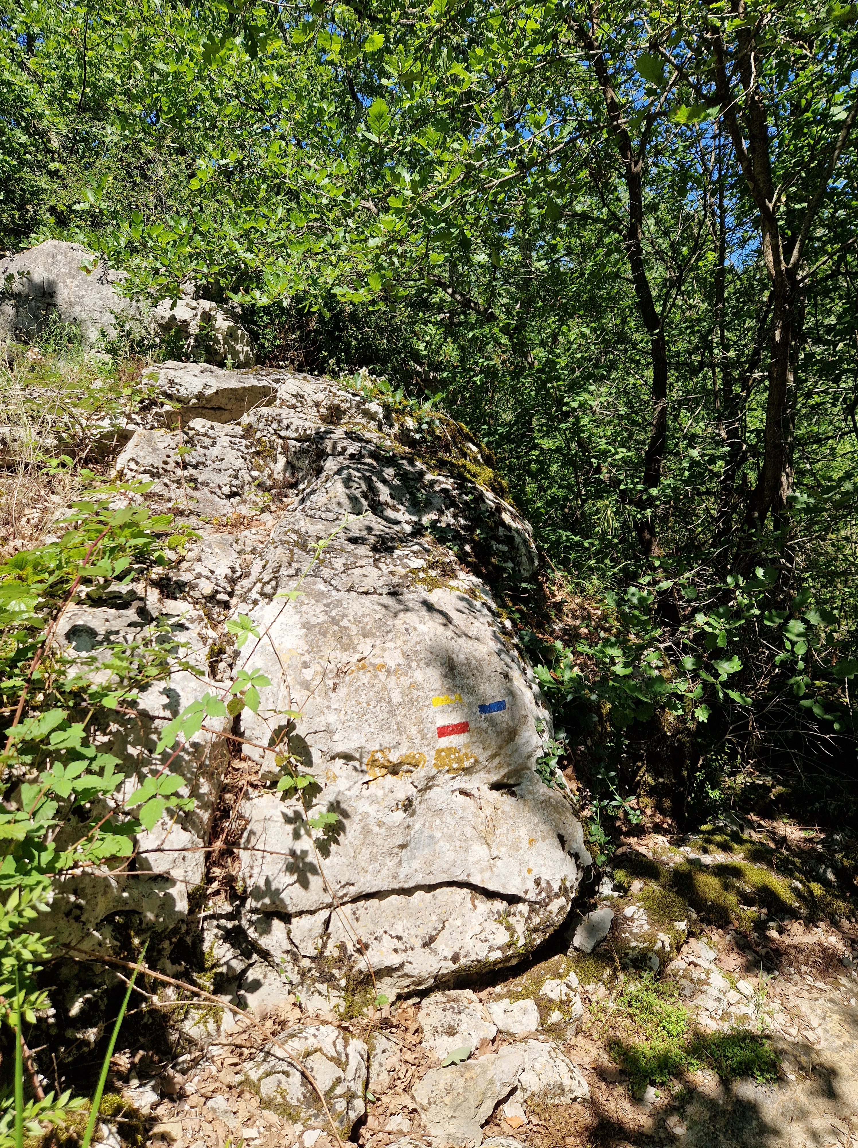 Ravi springt als een klipgeit voor ons uit, zoekt intuïtief zijn weg waar ik over elke stap moet nadenken om niet mijn nek te breken. Factor 50 smelt van mijn vel in de zon, onder de bomen met een vlaagje wind is het koeler. Wilde lathyrus piept tussen de struiken door het pad op. Cigales zingzagen, bijna rinkelend, het is een kabaal van jewelste in het stille bos. Na het uitkijkpunt bij het kleine klooster blijven we klimmen en dalen tussen rotsen, stenen muurtjes en bomen die regelmatig als anker fungeren. Na twee-en-een-half uur zijn we terug bij de auto. Schoenen en sokken uit. De blarenpleisters hebben hun werk goed gedaan.