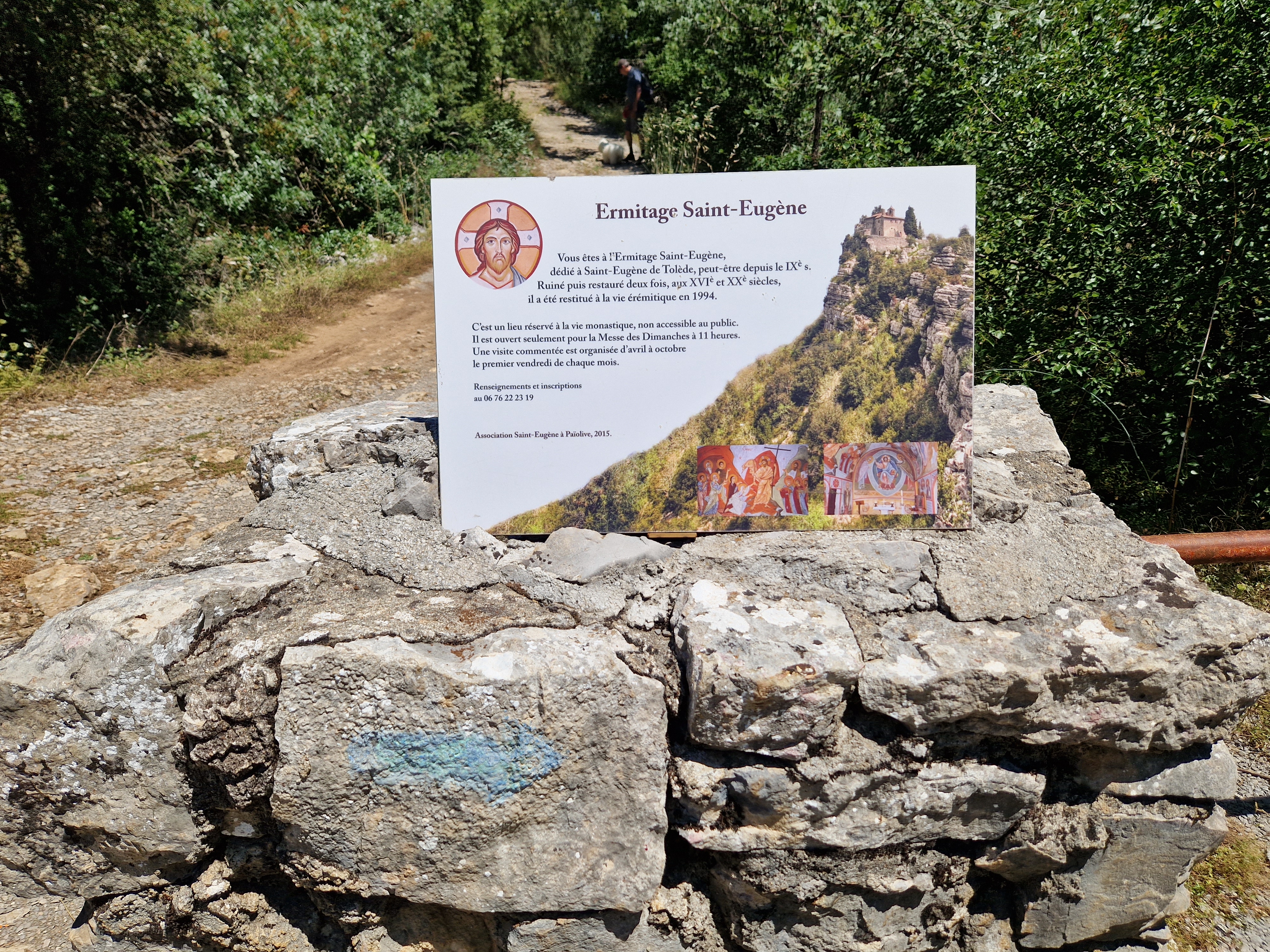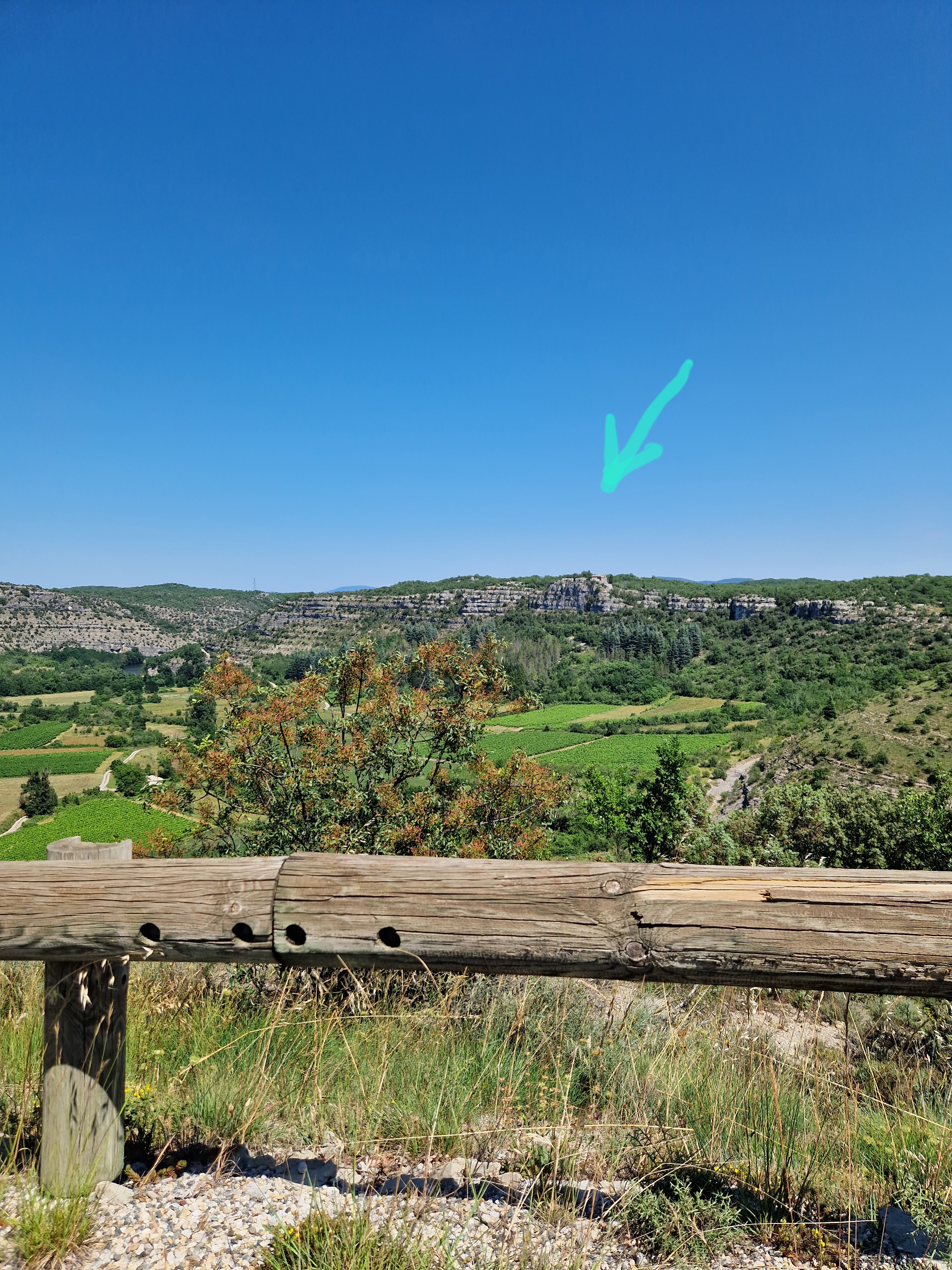 Als de hartslag voldoende gedaald is en de suikers zijn aangevuld, rijden we via een andere route terug. Foto met pijltje: daar was het uitkijkpunt bij l’Ermitage Saint Eugène.