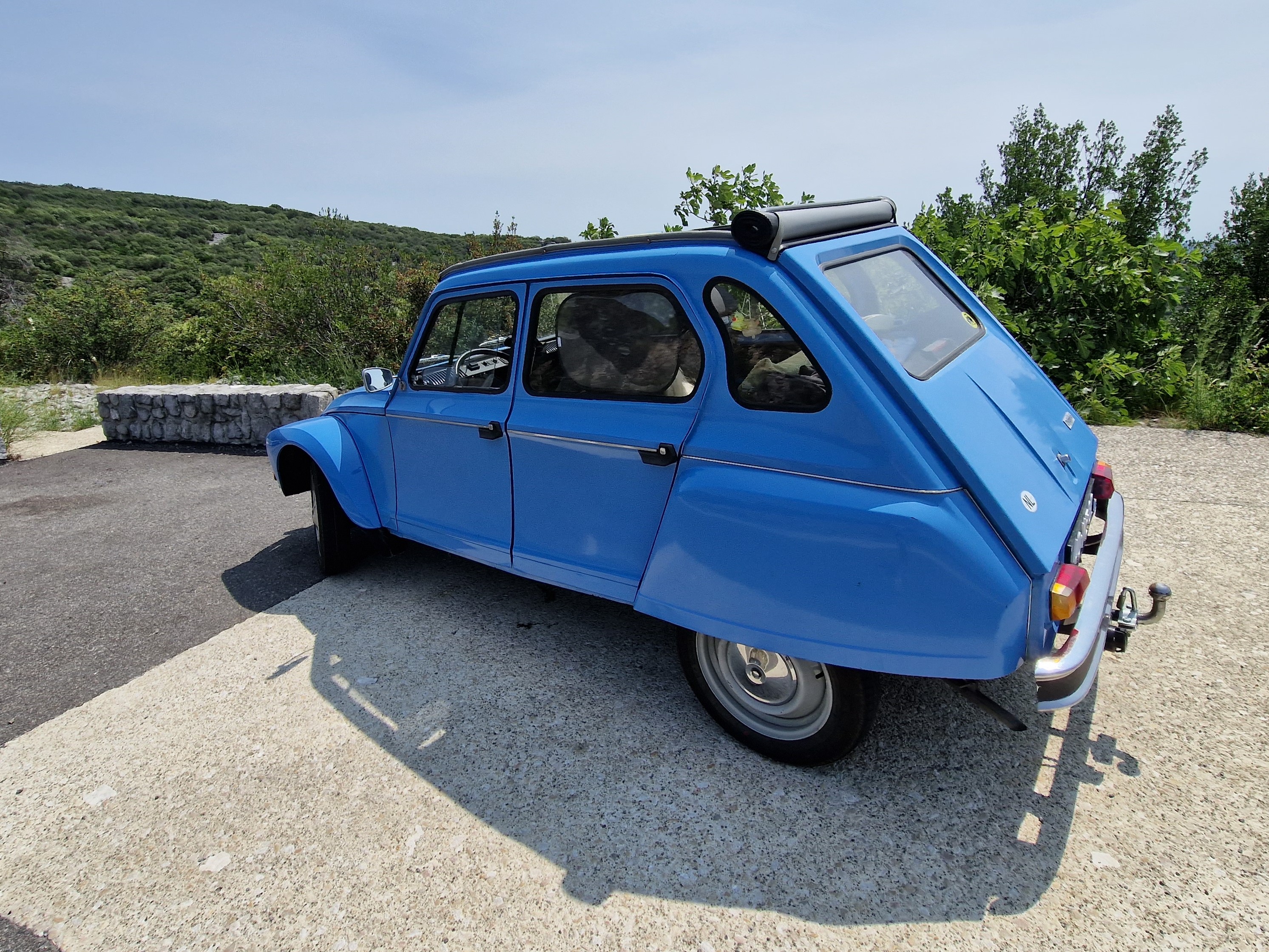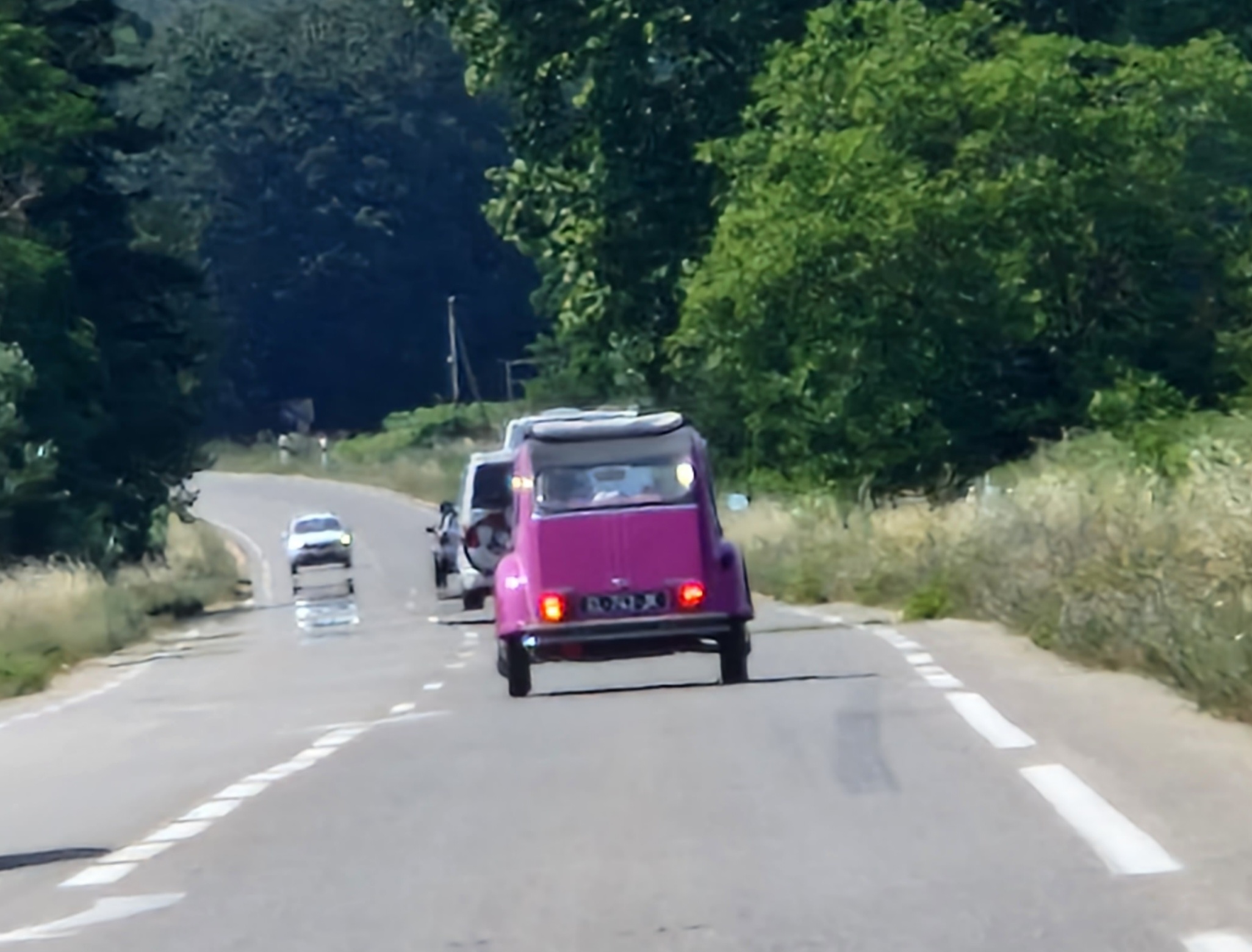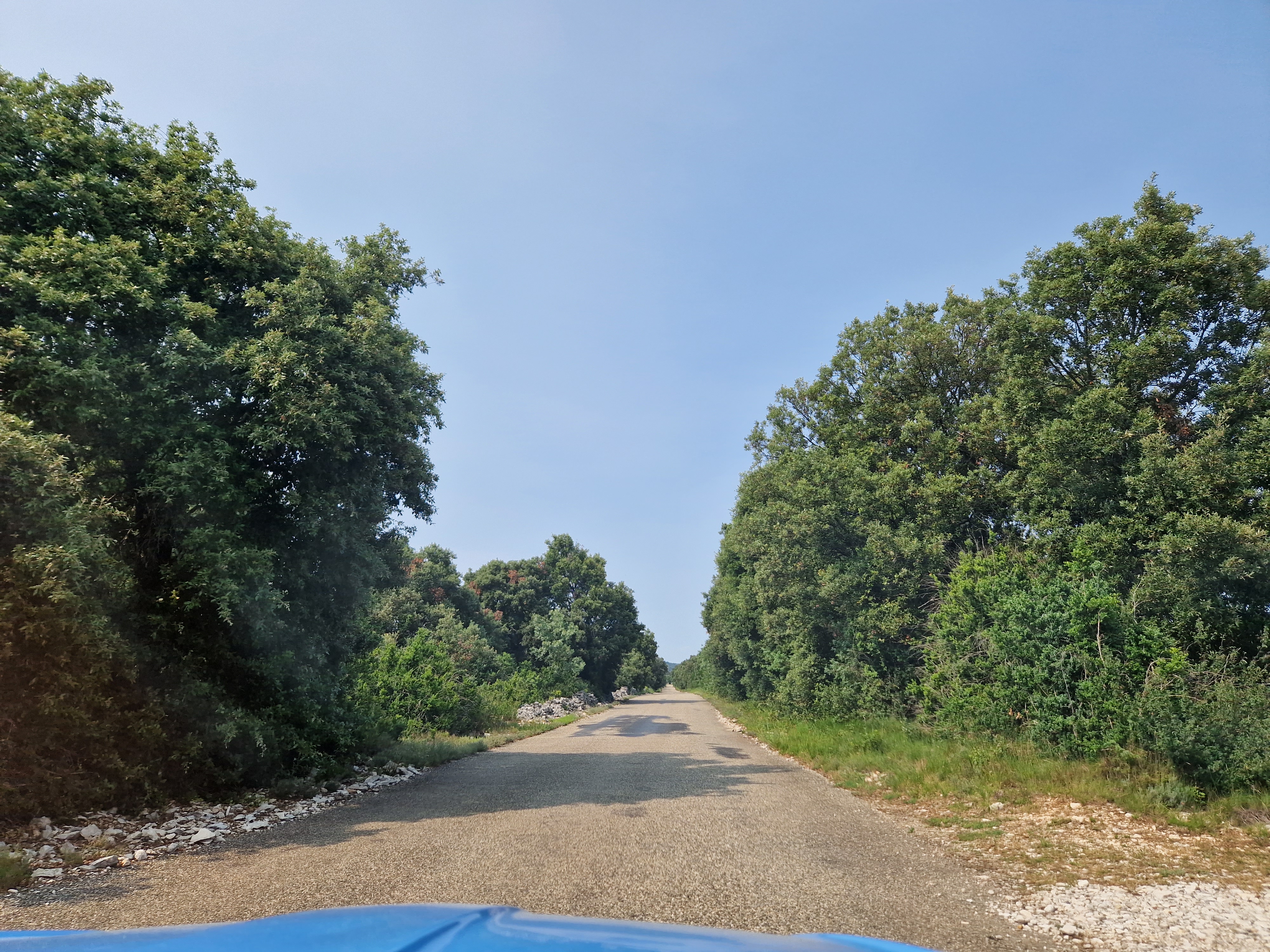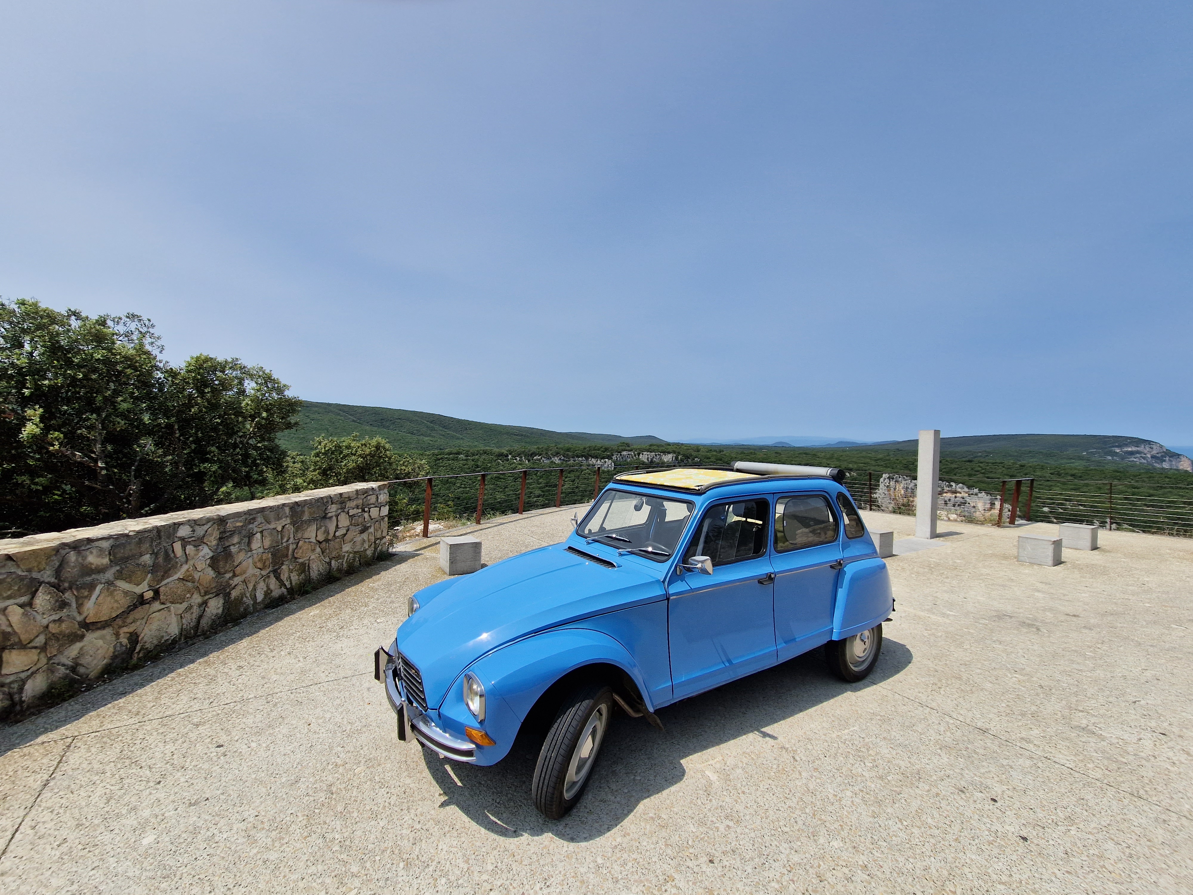 De “belvédères” zijn “balcons” geworden: geplaveide, omheinde uitzichtpunten waar je onmogelijk een spannende fotoshoot met de Dyane kunt doen. Voor een mooi rotsen-décor zou je midden op de weg moeten stilstaan. Een scenario dat met jakkerende Franse bouwbusjes achter je op zijn minst onverstandig te noemen is. Door de dicht bebladerde steeneiken op de hellingen naast de weg heb je zicht op de Ardèche noch op de rotswanden. De foto’s vanuit de auto zijn toevalstreffers.