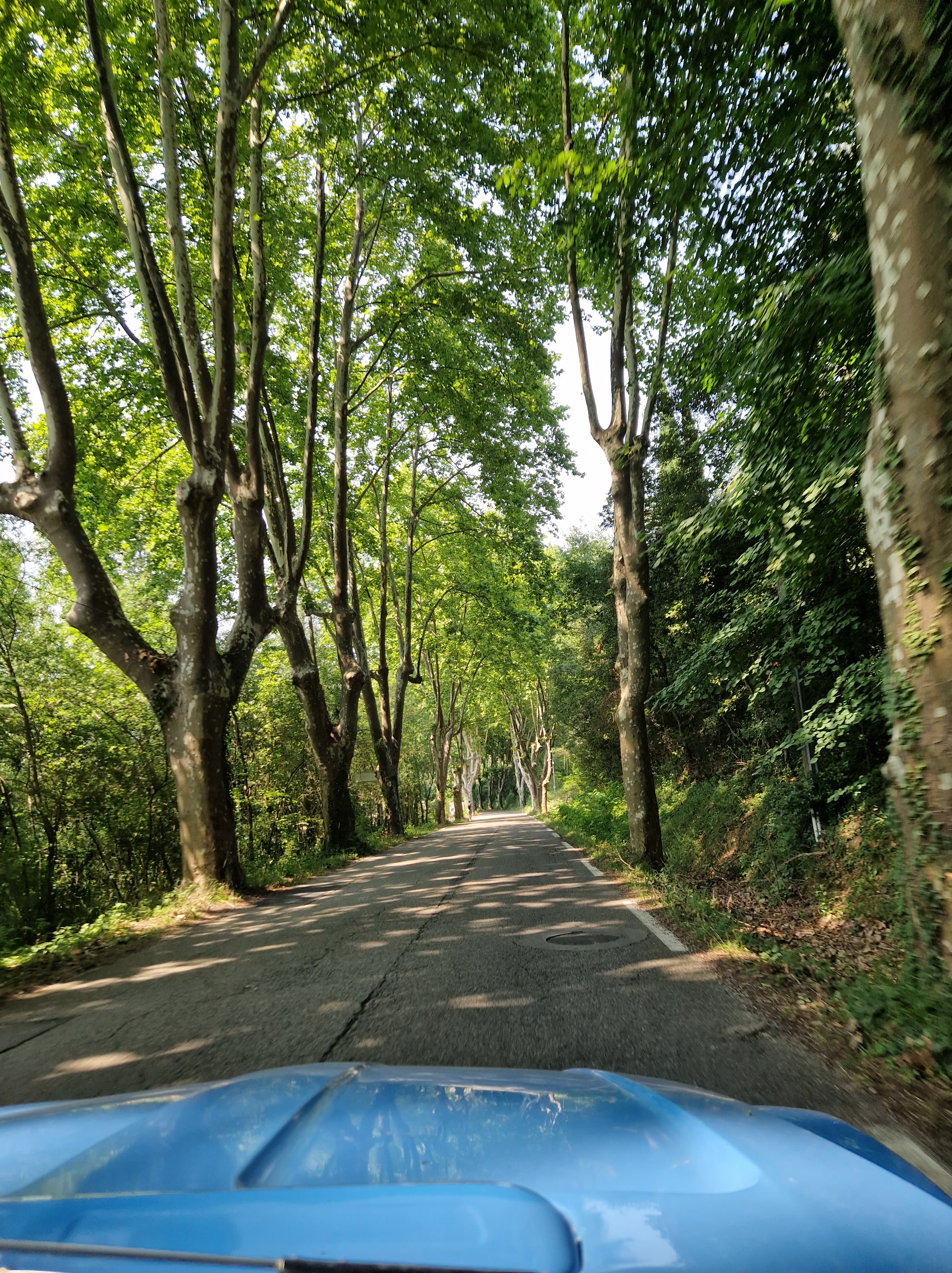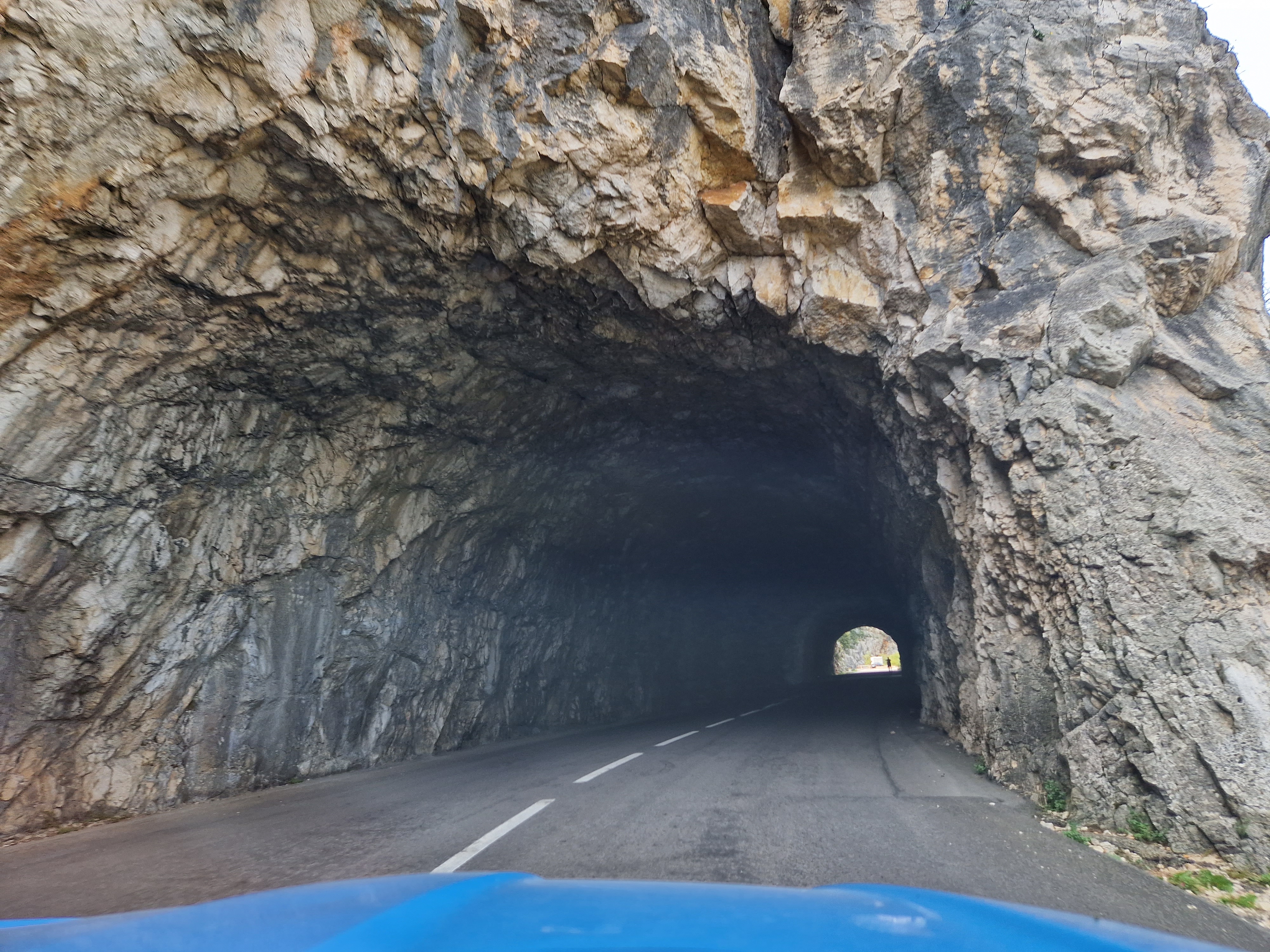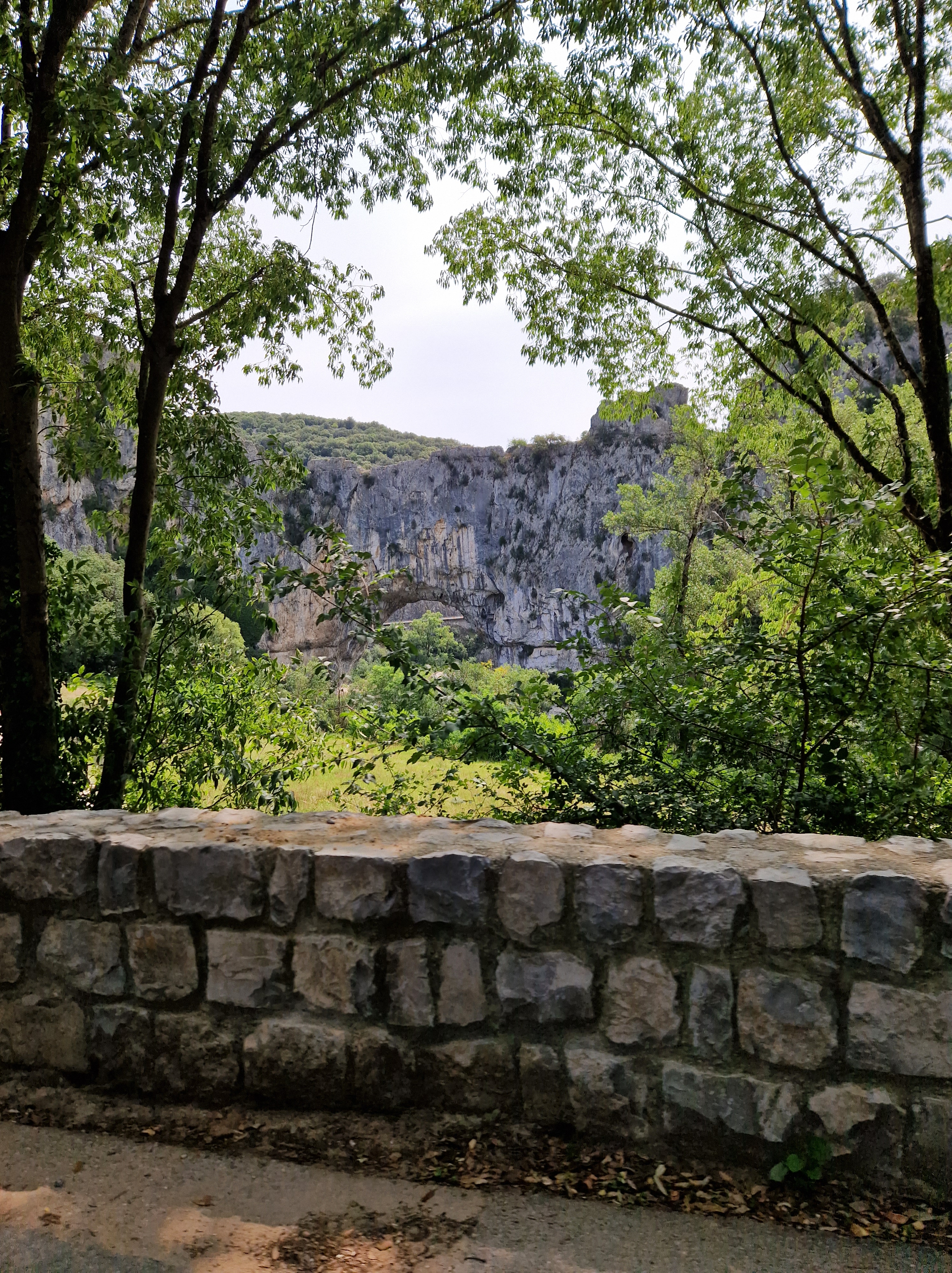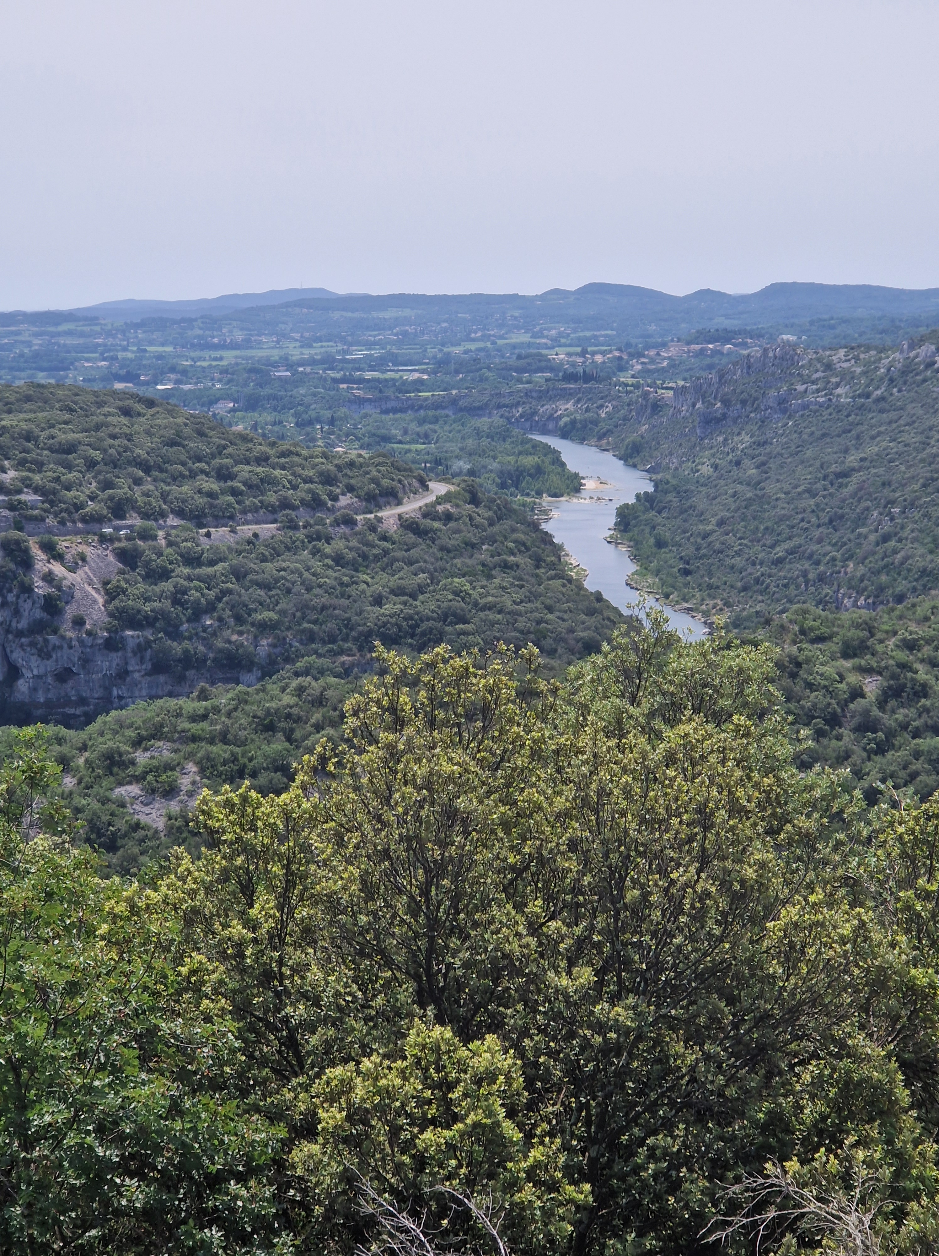 De “belvédères” zijn “balcons” geworden: geplaveide, omheinde uitzichtpunten waar je onmogelijk een spannende fotoshoot met de Dyane kunt doen. Voor een mooi rotsen-décor zou je midden op de weg moeten stilstaan. Een scenario dat met jakkerende Franse bouwbusjes achter je op zijn minst onverstandig te noemen is. Door de dicht bebladerde steeneiken op de hellingen naast de weg heb je zicht op de Ardèche noch op de rotswanden. De foto’s vanuit de auto zijn toevalstreffers.