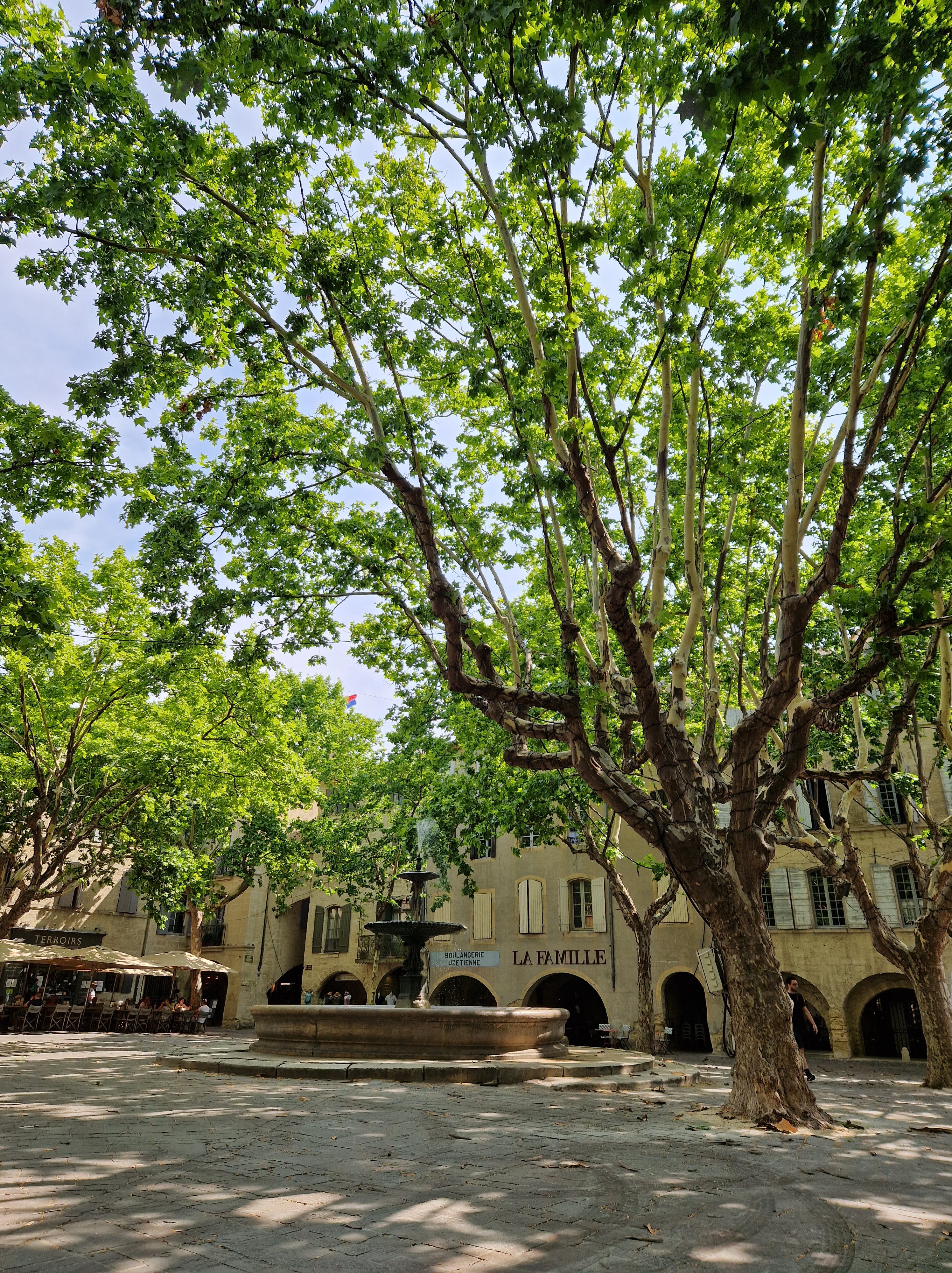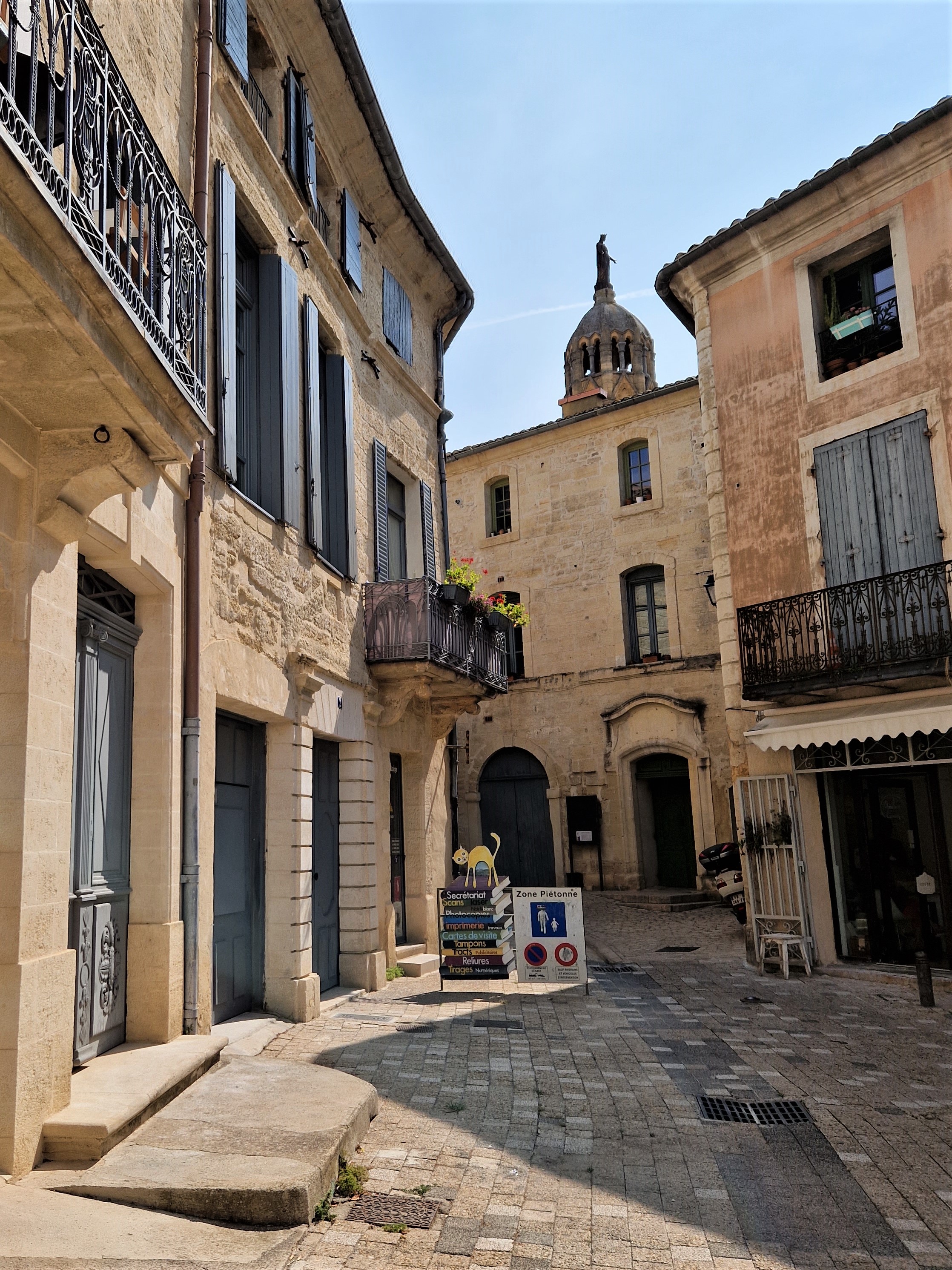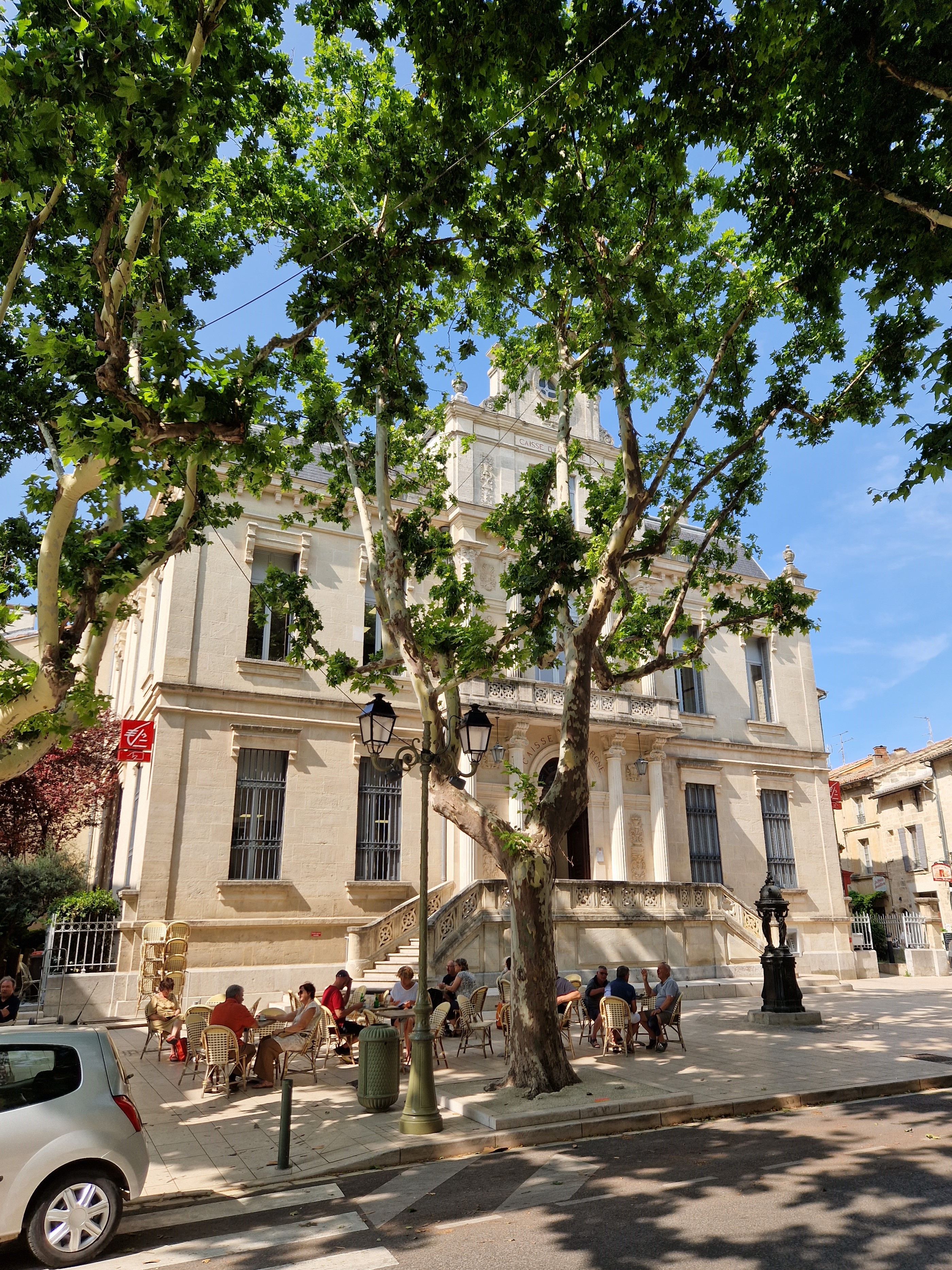 We gaan naar Uzès, ik wil eens wat anders. We beginnen bij de kathedraal, Cathédrale Saint Théodorit d’Uzès. Leve de supergroothoeklens van mijn mobiel. Een megalomaan ouderwets bankgebouw verschuilt zich achter de platanen aan de overkant.