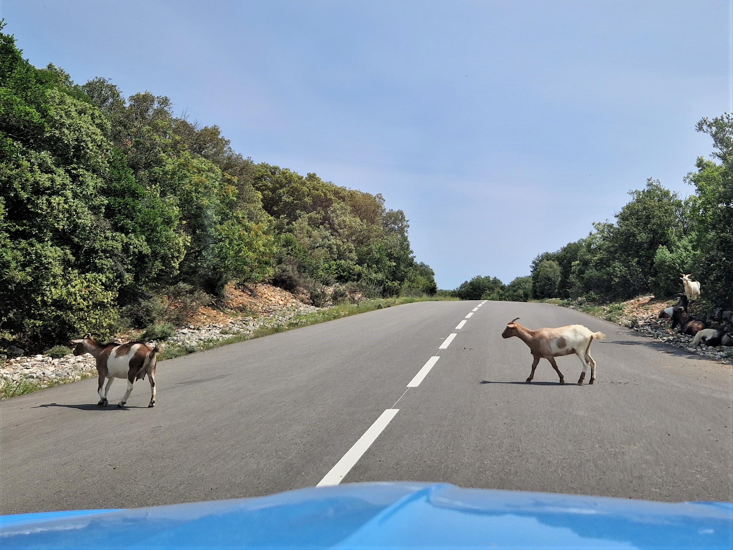 De Route Touristique de l’Ardèche is voor een troep geiten uitermate geschikt voor een siësta in de schaduw. Twee jongere exemplaren gaan op zoek naar groener gras aan de overkant. In de berm blijft de pater familias met zijn harem rustig poseren. Eehh, pauzeren.
