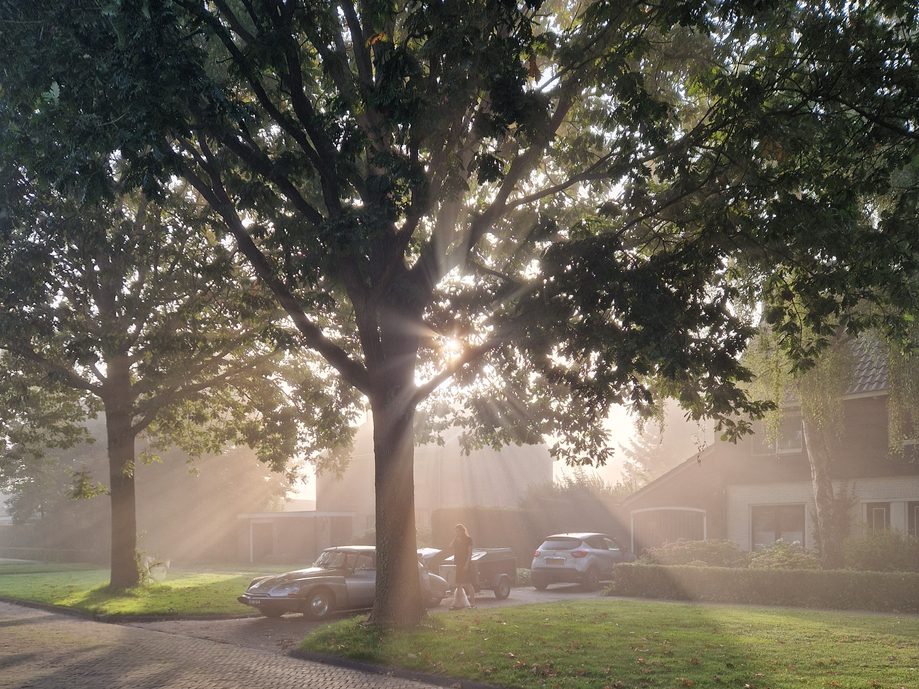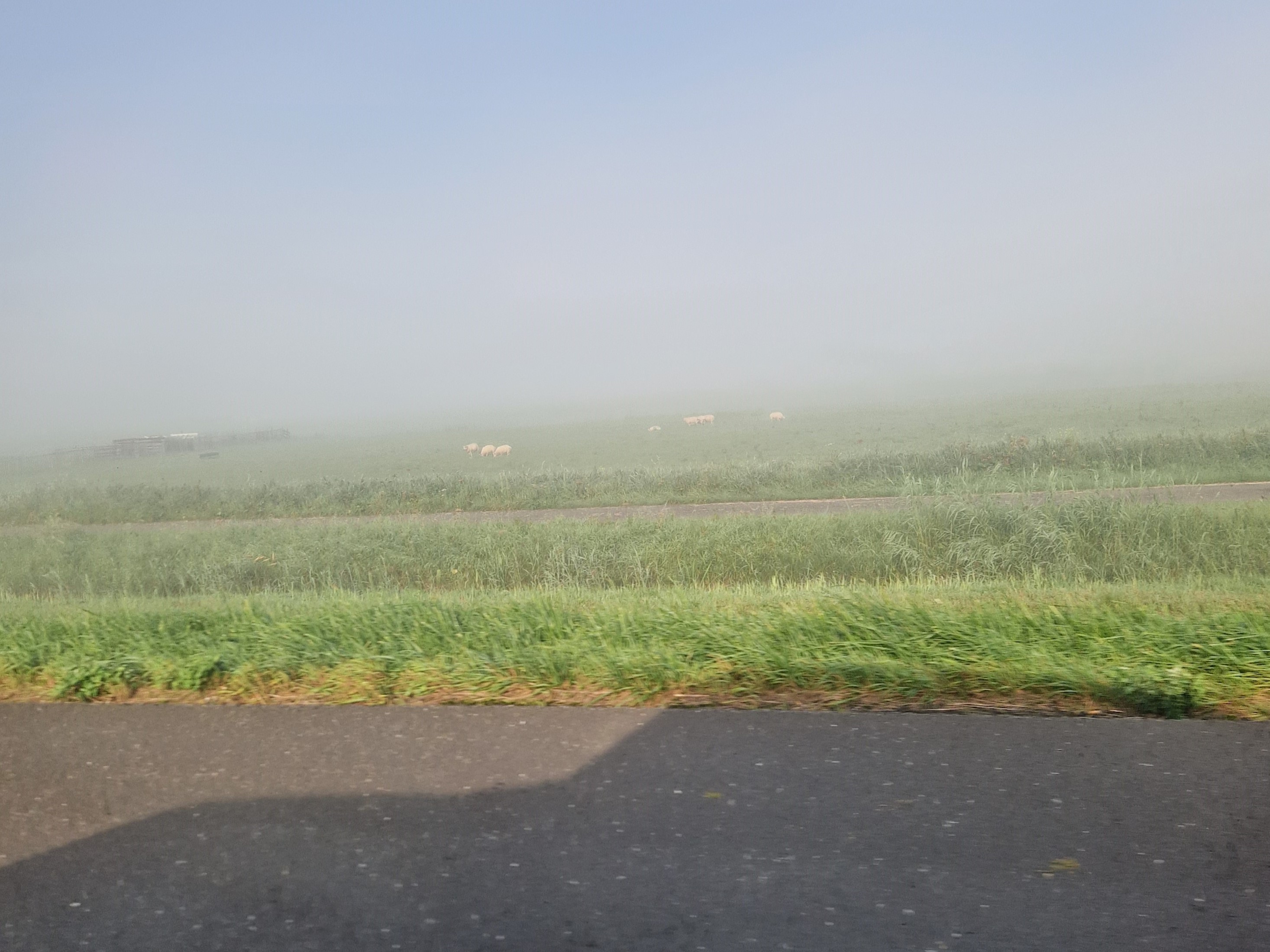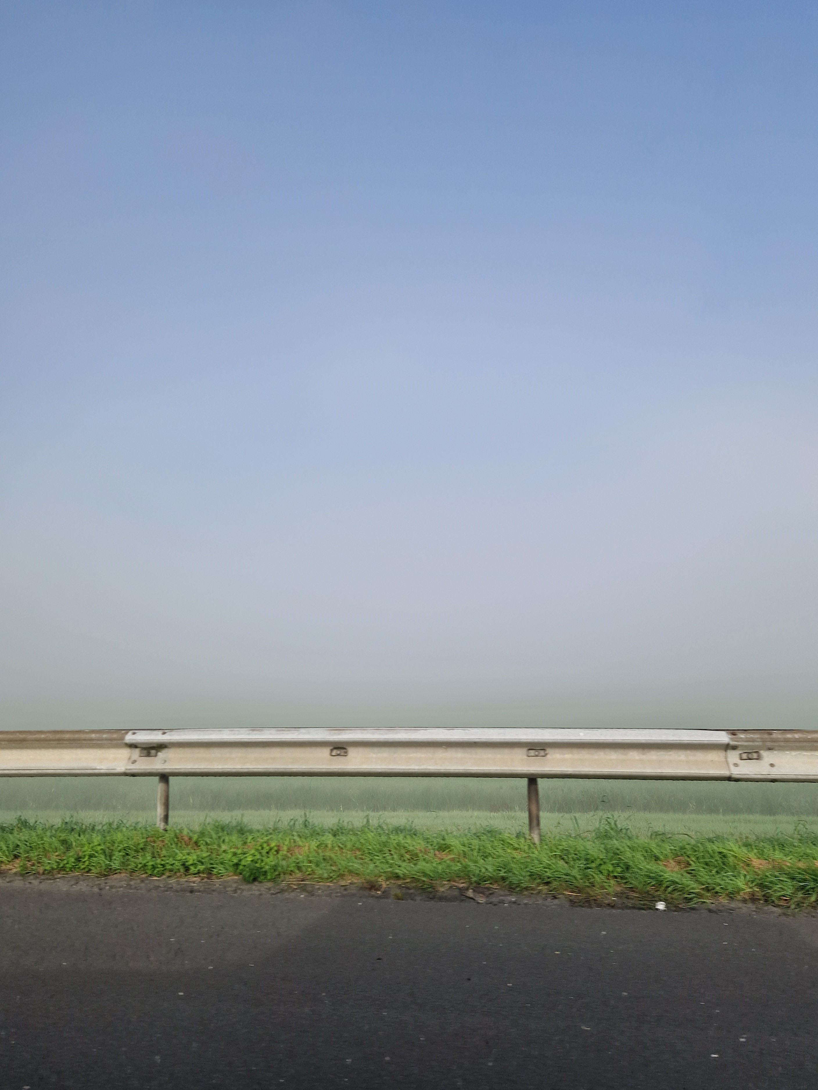 “De mist zal wel snel optrekken, de zon brandt erdoorheen!” is mijn eerste gedachte. Niets blijkt minder waar. We nemen, noodgedwongen door wegwerkzaamheden en afsluitingen bij Antwerpen, een andere route dan normaal. Tomtom (voortaan Tom genaamd) stuurt ons over Eindhoven-Maastricht-Luik, de weg die ik gezwóren had nooit meer te nemen. Ik leg me erbij neer en neem me voor van nieuwe uitzichten te genieten. De eerste uren echter kom ik bedrogen uit. Van de hele omgeving is niets te zien door de mist. Alleen de contouren van bomen in diverse schakeringen grijs zorgen voor wat diepte in het schouwspel.