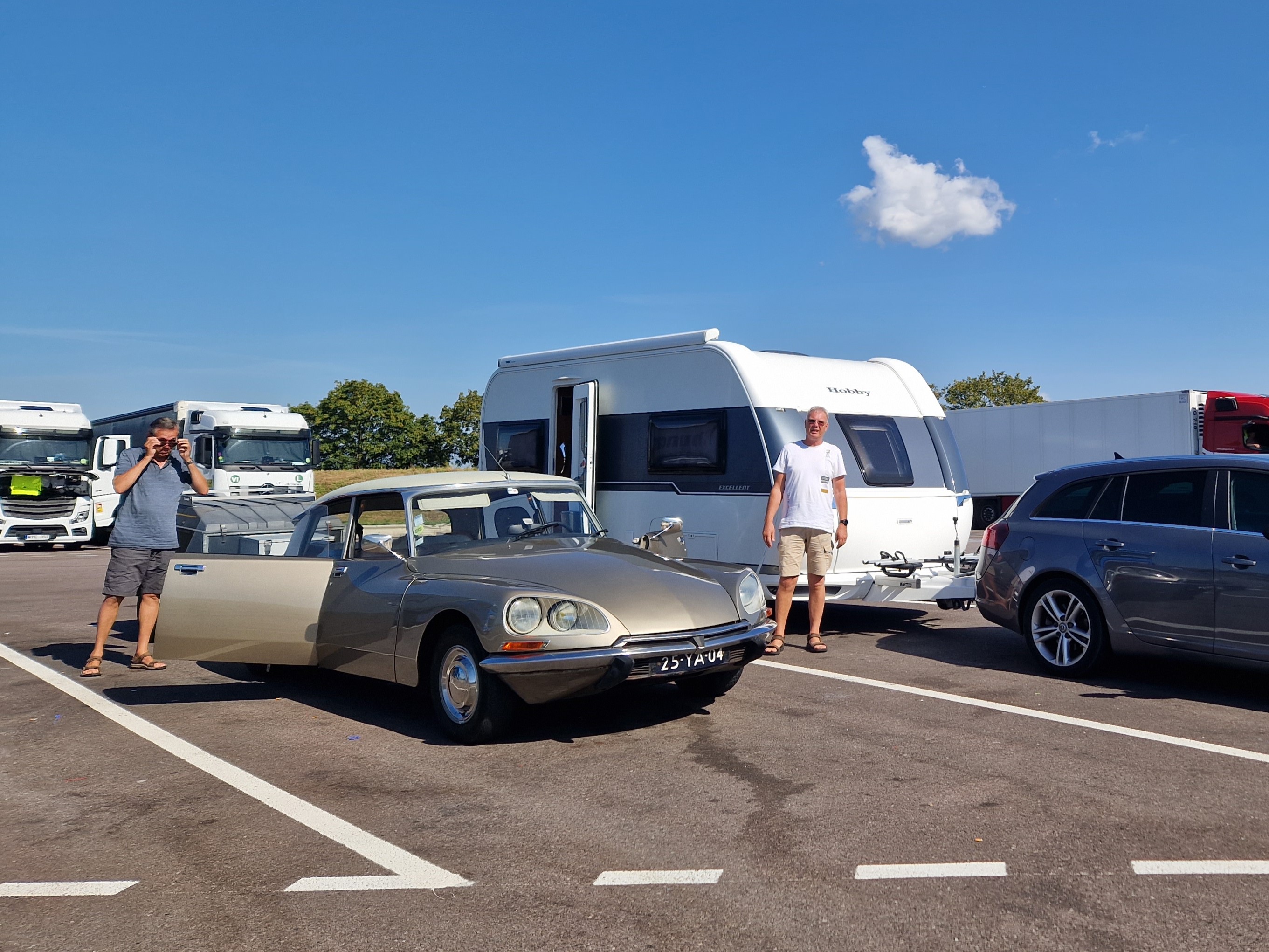 Op de eerste parkeerplaats in Frankrijk staan Hans en Thilde, al dan niet toevallig. In hun koele caravan eten en drinken we snel iets. Nergens schaduw, het zwarte asfalt brandt onder de voetzolen dus rap ervandoor!