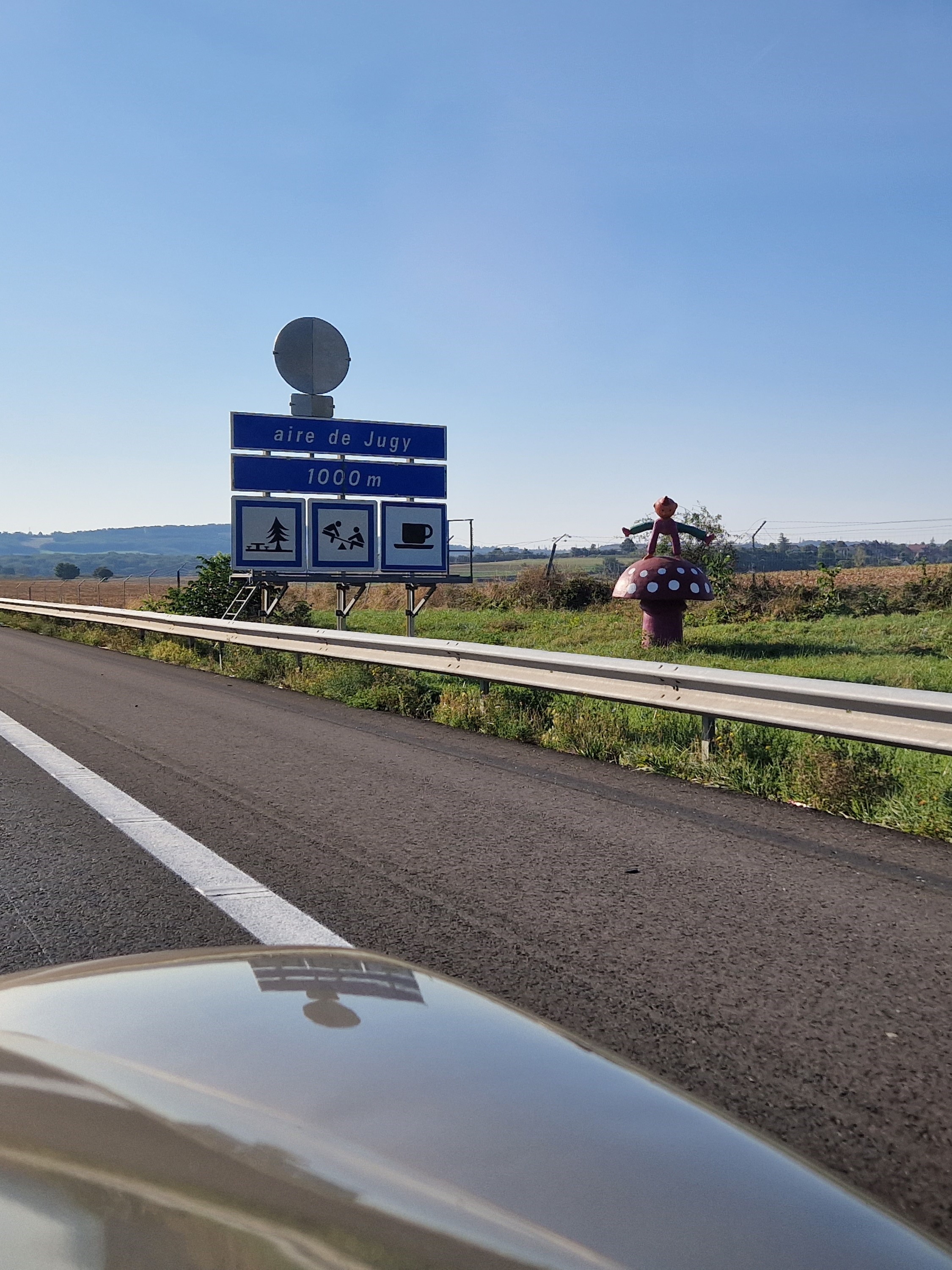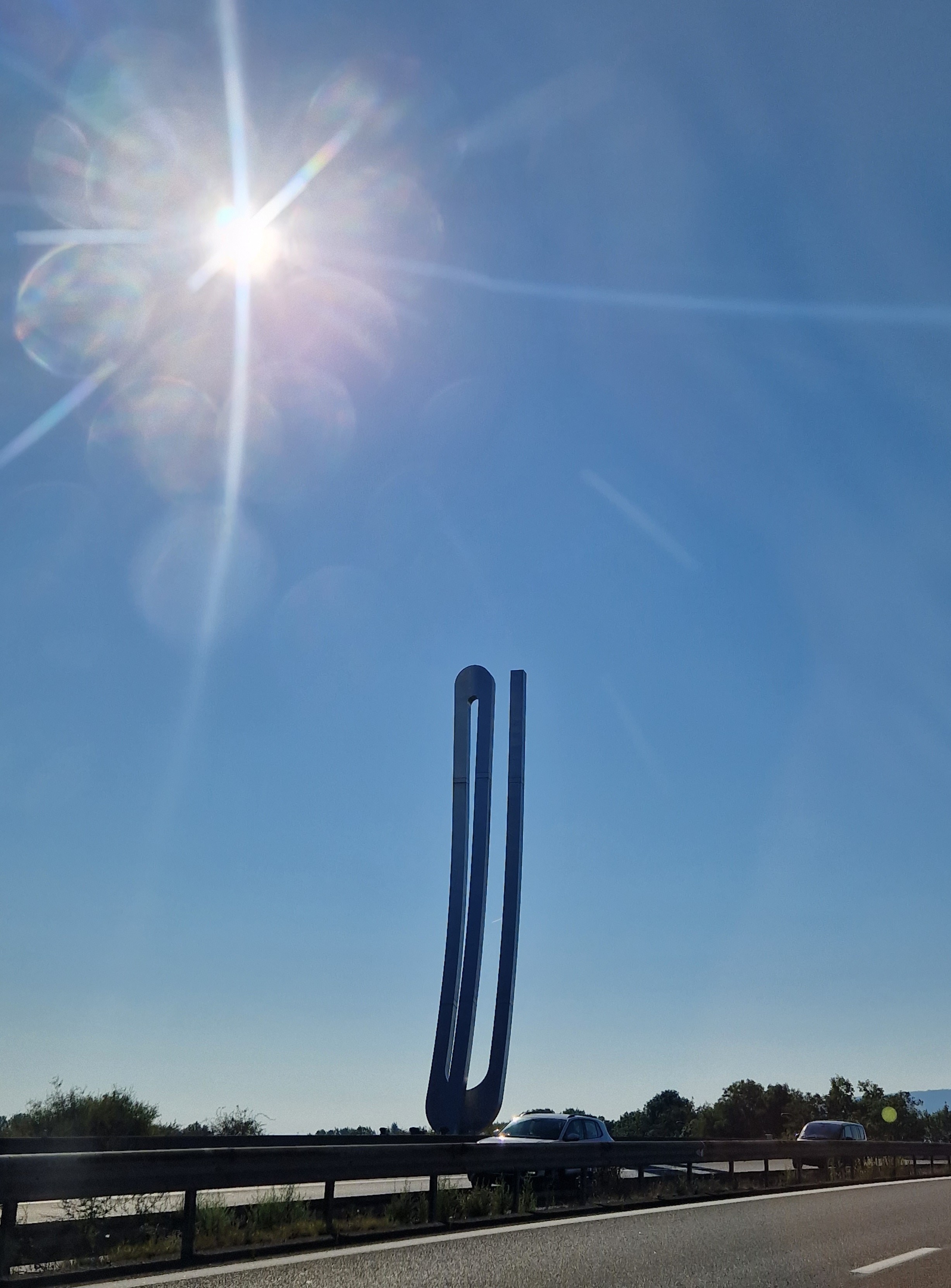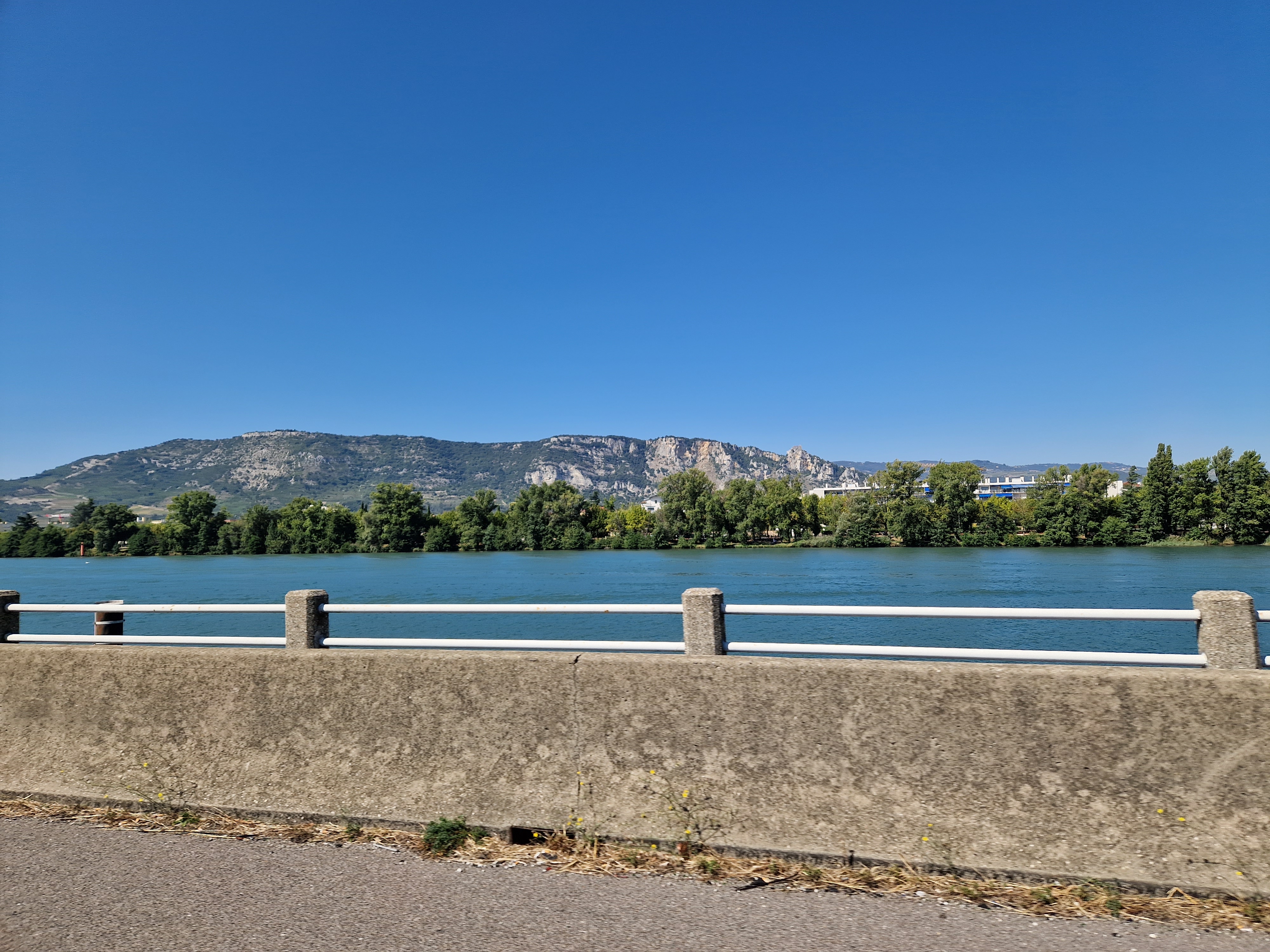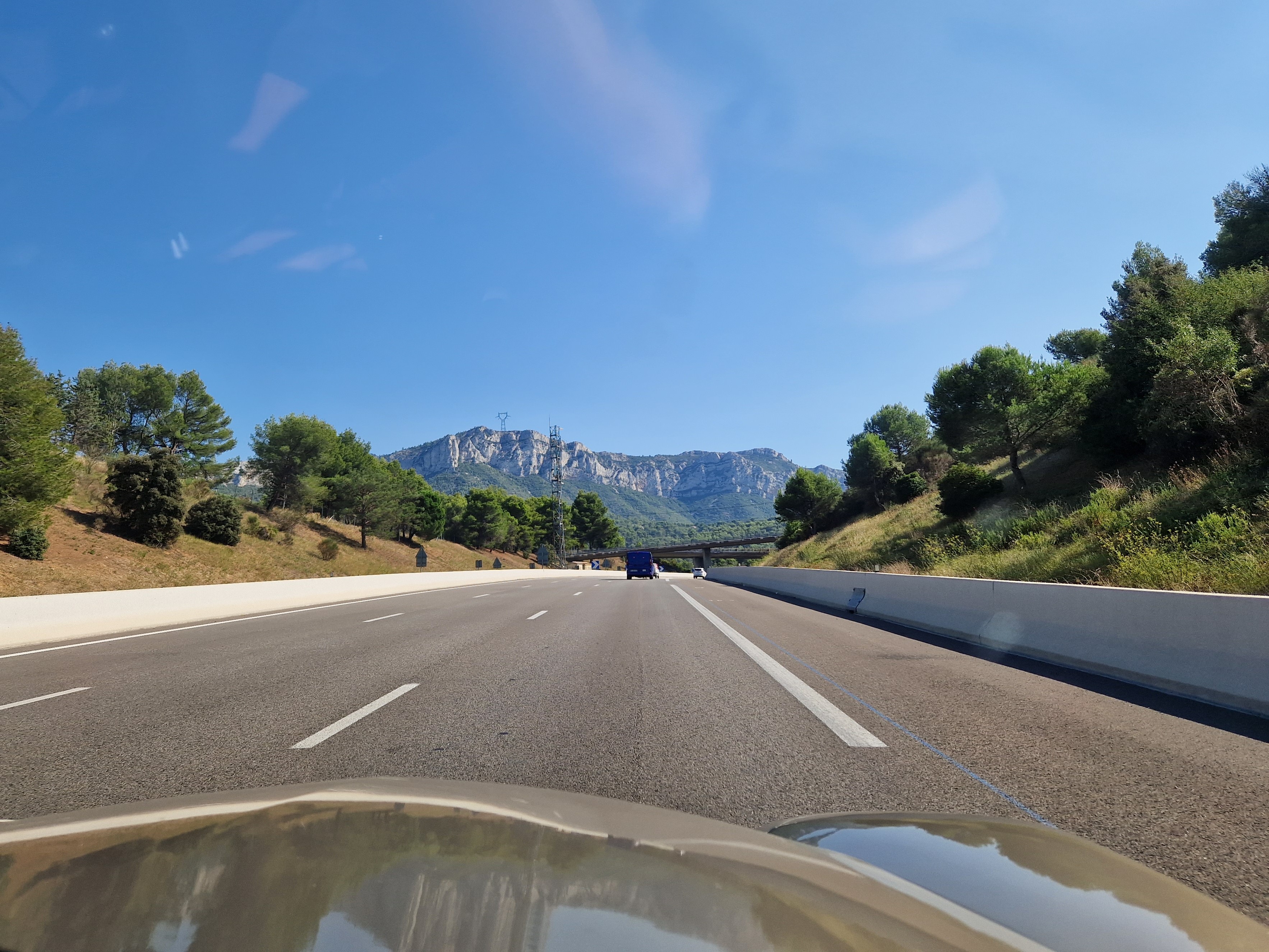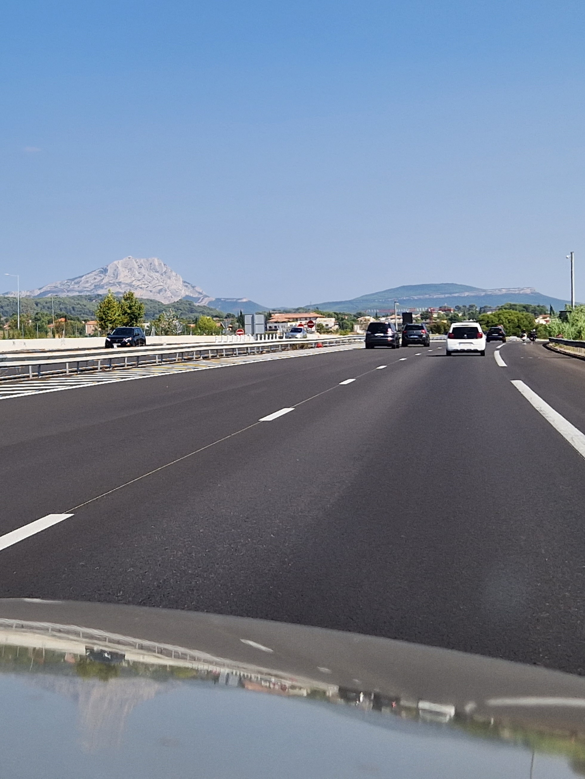 Langs Aire de Jugy, “de paddenstoelen” favoriete stop bij de kinderen vroeger. We zijn net pas op pad, wij rijden door. Dwars door Lyon, komen we eerst langs Signe Infini. Voor de tunnels door Lyon een pietsie file, dan langs Musée des Confluences, waarna we langs de blauwe Rhône lekker door kunnen kachelen. We zien de Mont Sainte Victoire (de berg van Cézanne en van Gogh) helder wit tegen de blauwe lucht afsteken. Het zijn allemaal punten van herkenning voor ons.