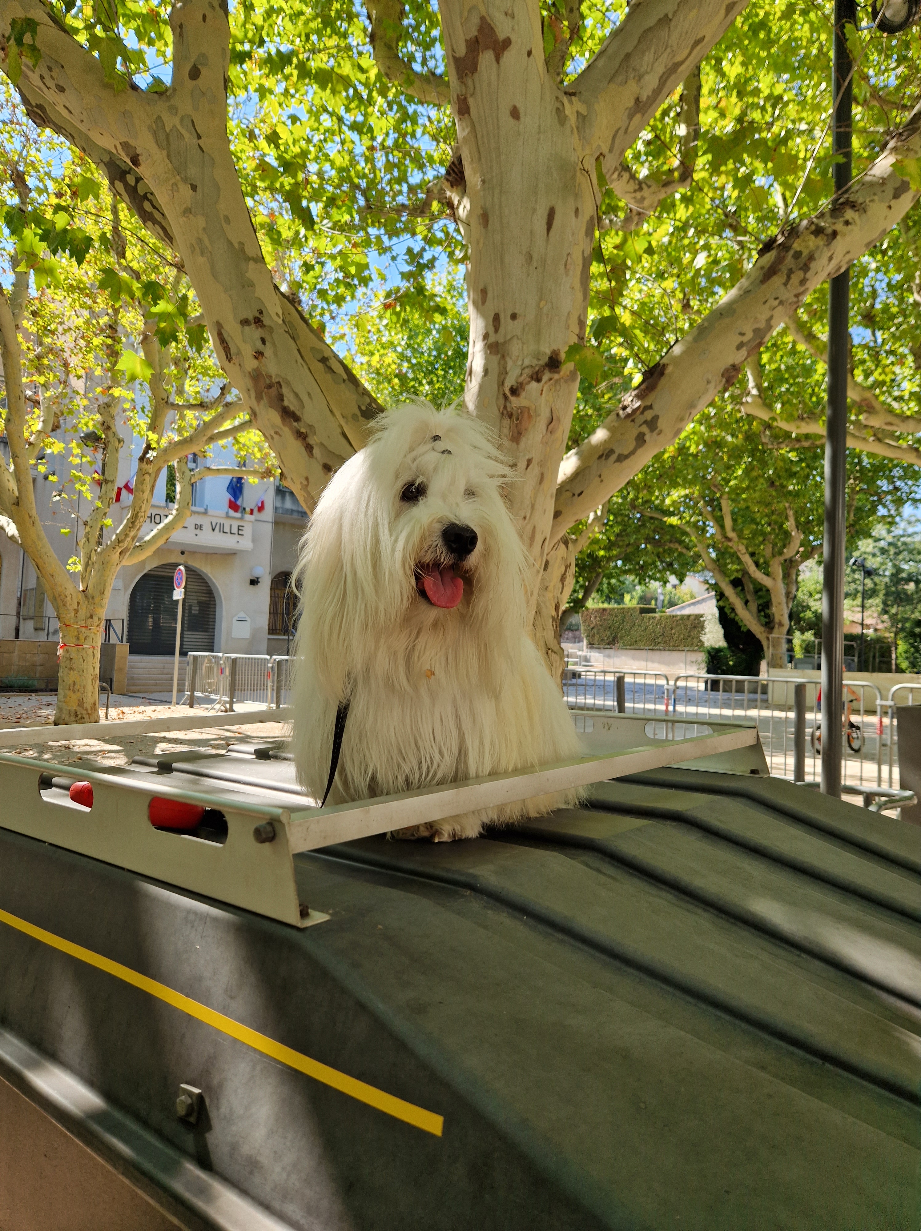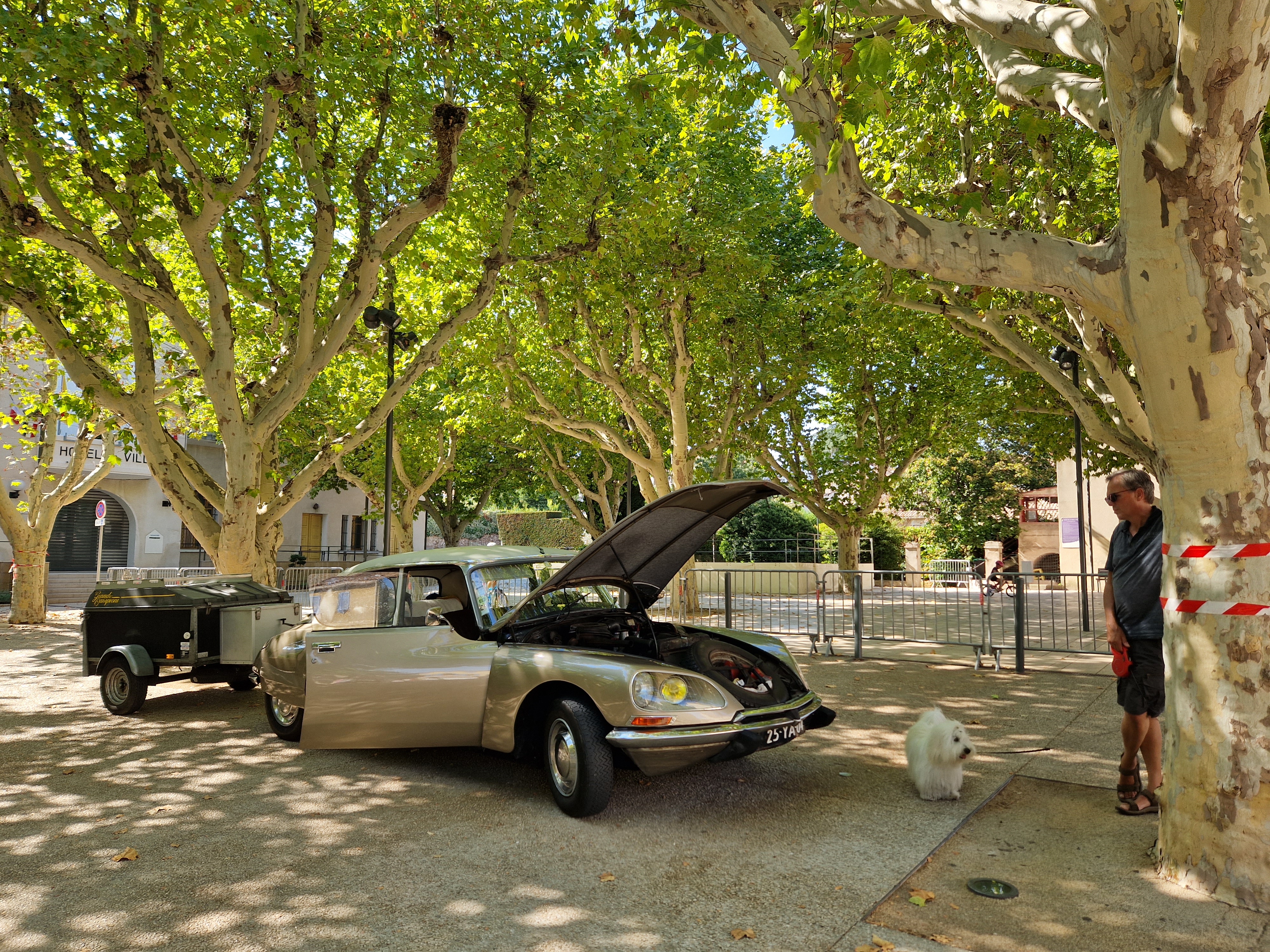Als we een end op streek zijn, licht vlak voor een afslag ineens het radiatorlampje rood op. Ik dirigeer Gijs snel de snelweg af. Het lampje floept direct uit. Gijs weet zéker dat er in zo’n dorpje, met de gezellige naam La Bouilladisse, een schaduwrijk dorpspleintje is. Hij krijgt gelijk. Onder de platanen midden in het plaatsje koelen we mooi af. De auto ook.
