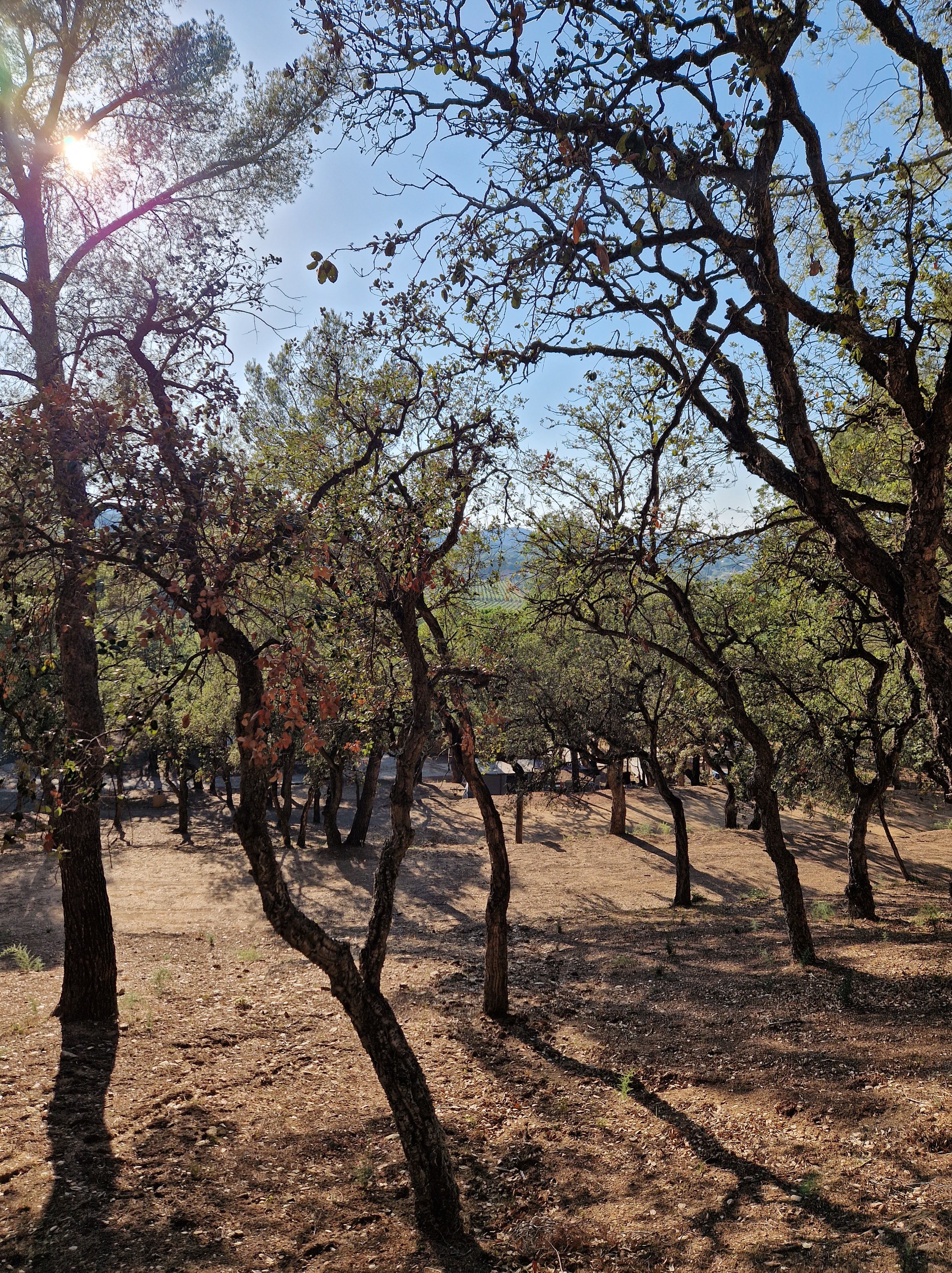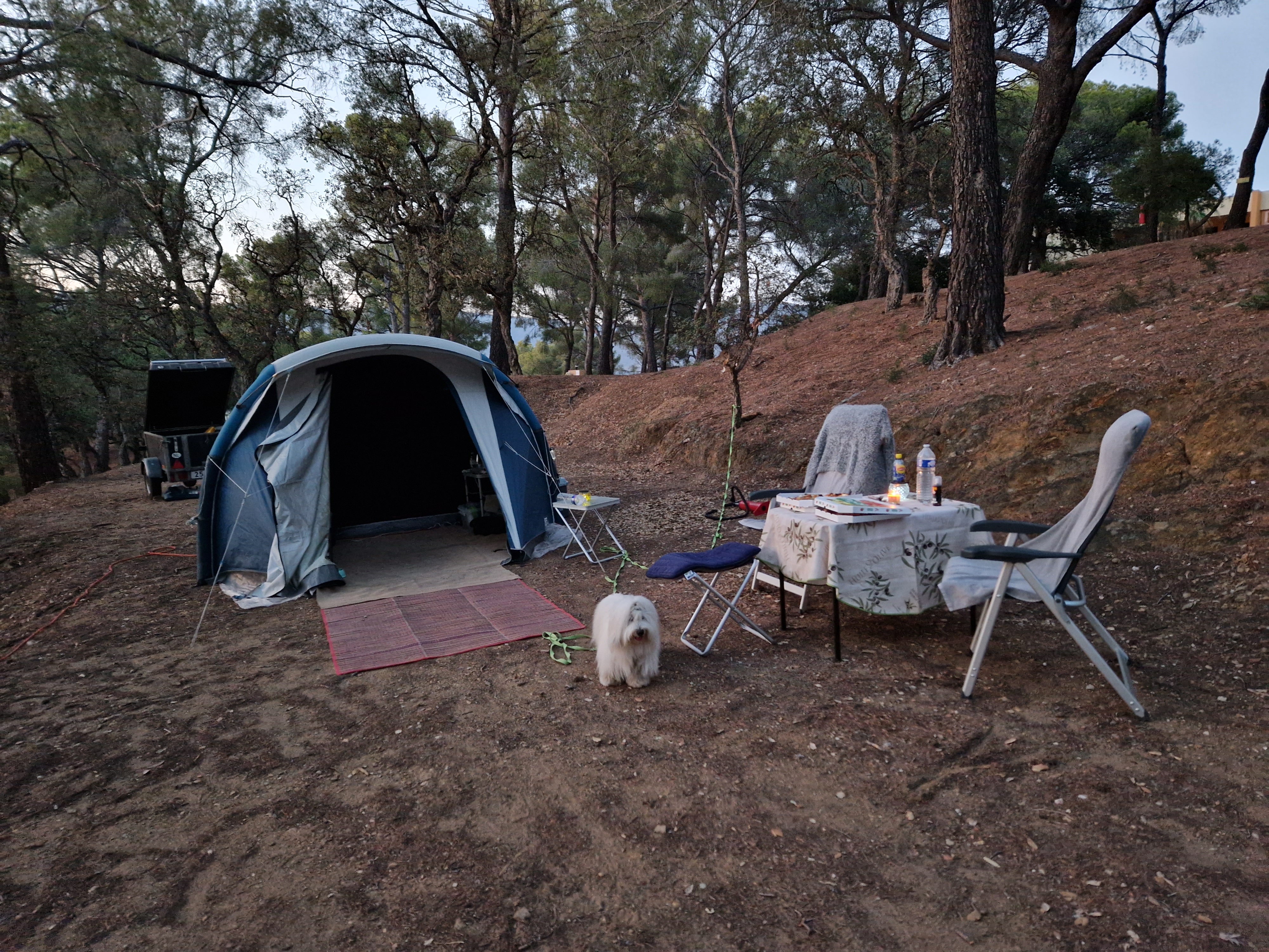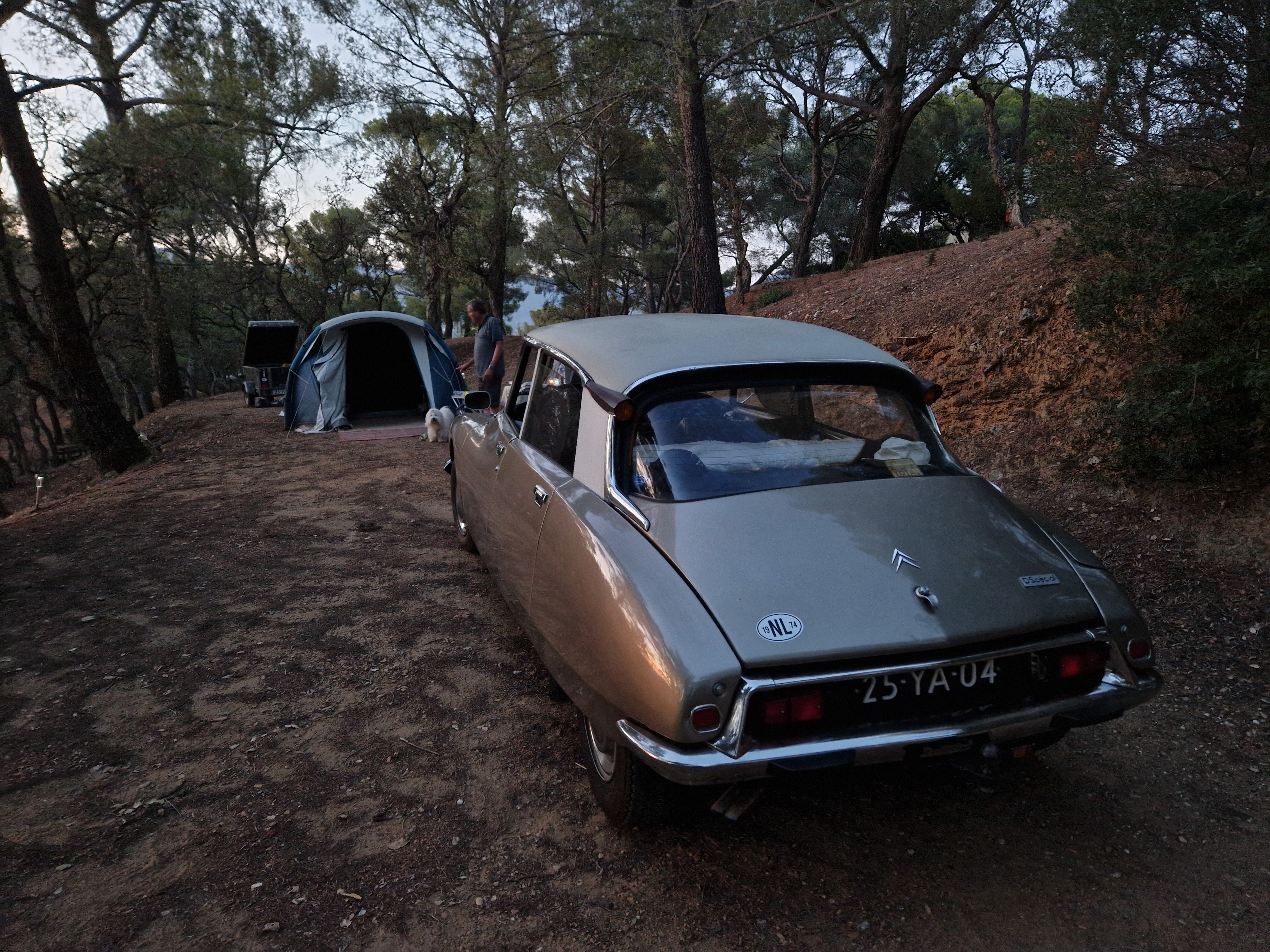 Tegen 5en arriveren we op de camping, Le Grand Batailler in La Favière. We mogen een plek uitzoeken, zodat we een uurtje later een heel terras van drie plekken voor onszelf ingericht hebben. Uitzicht op dennen en wijnvelden in het avondrood. Het leven is goed.