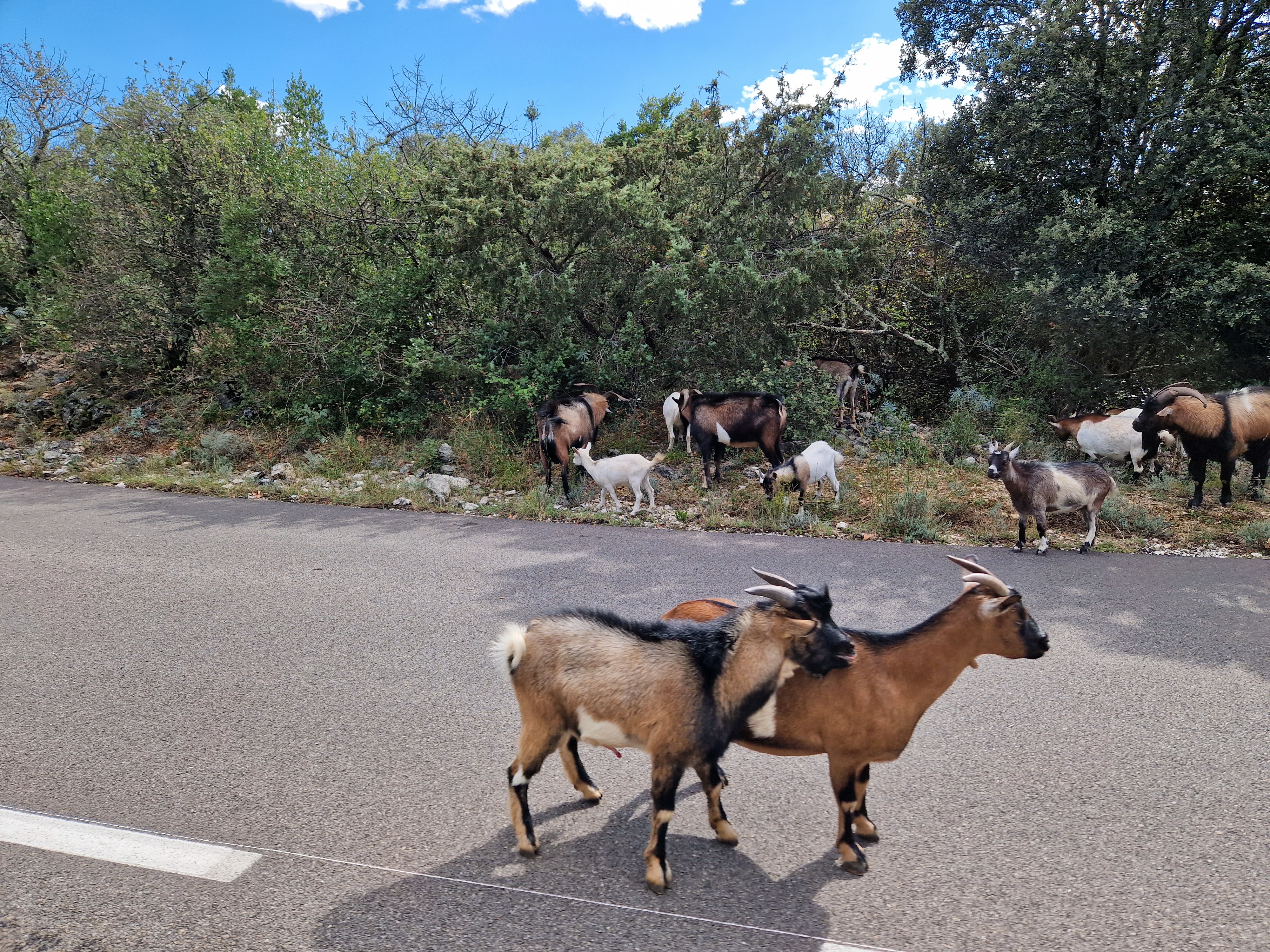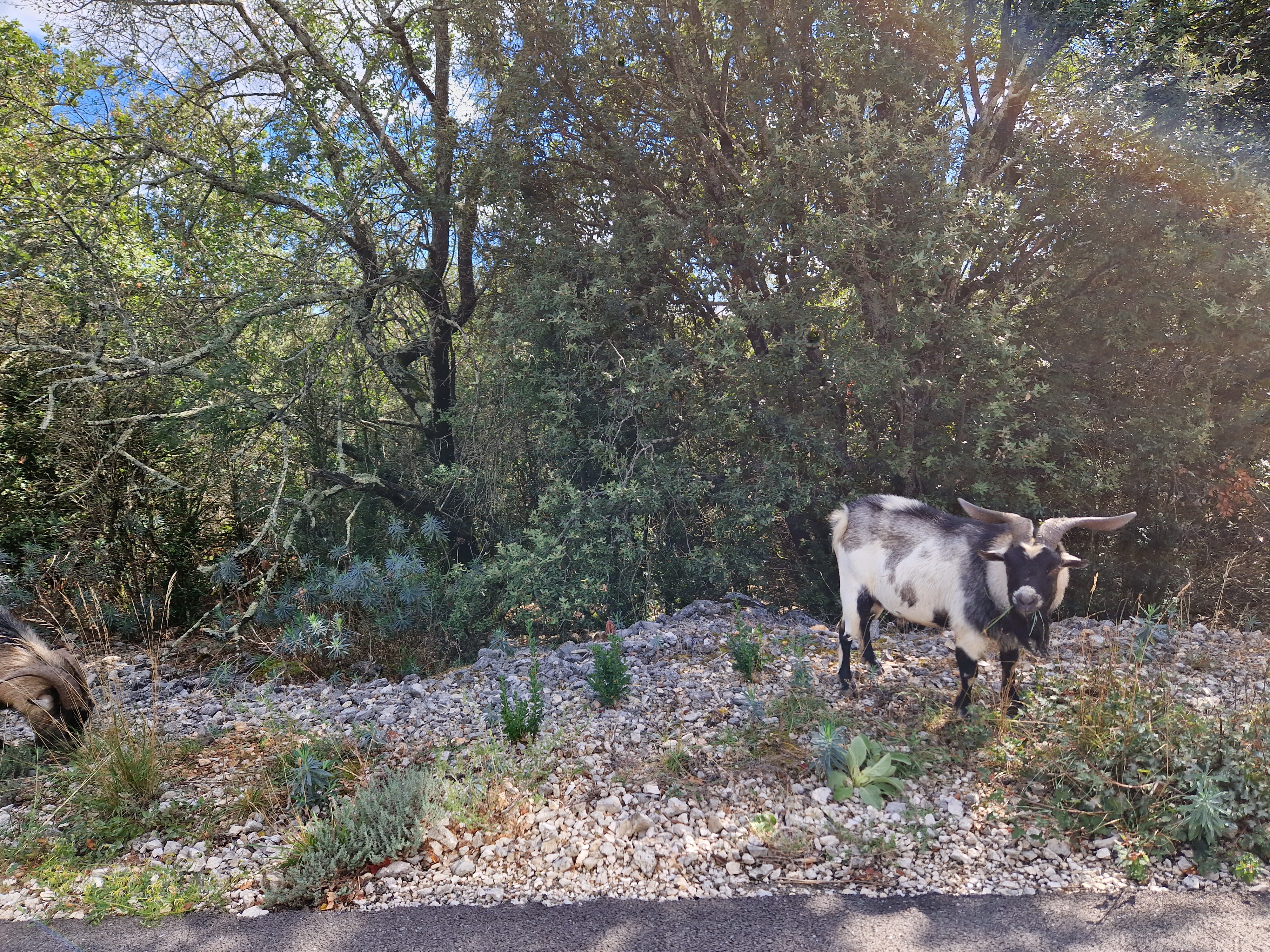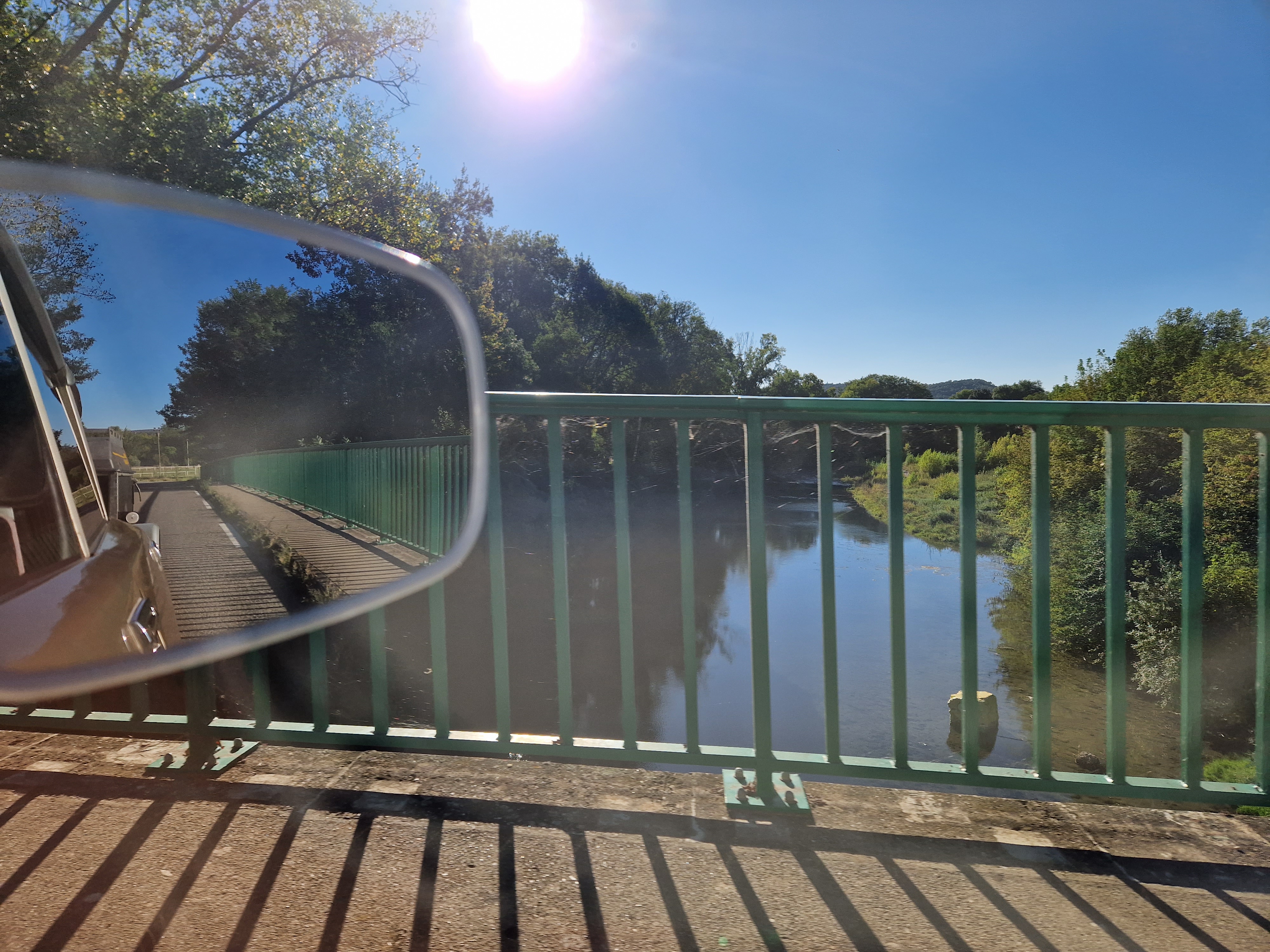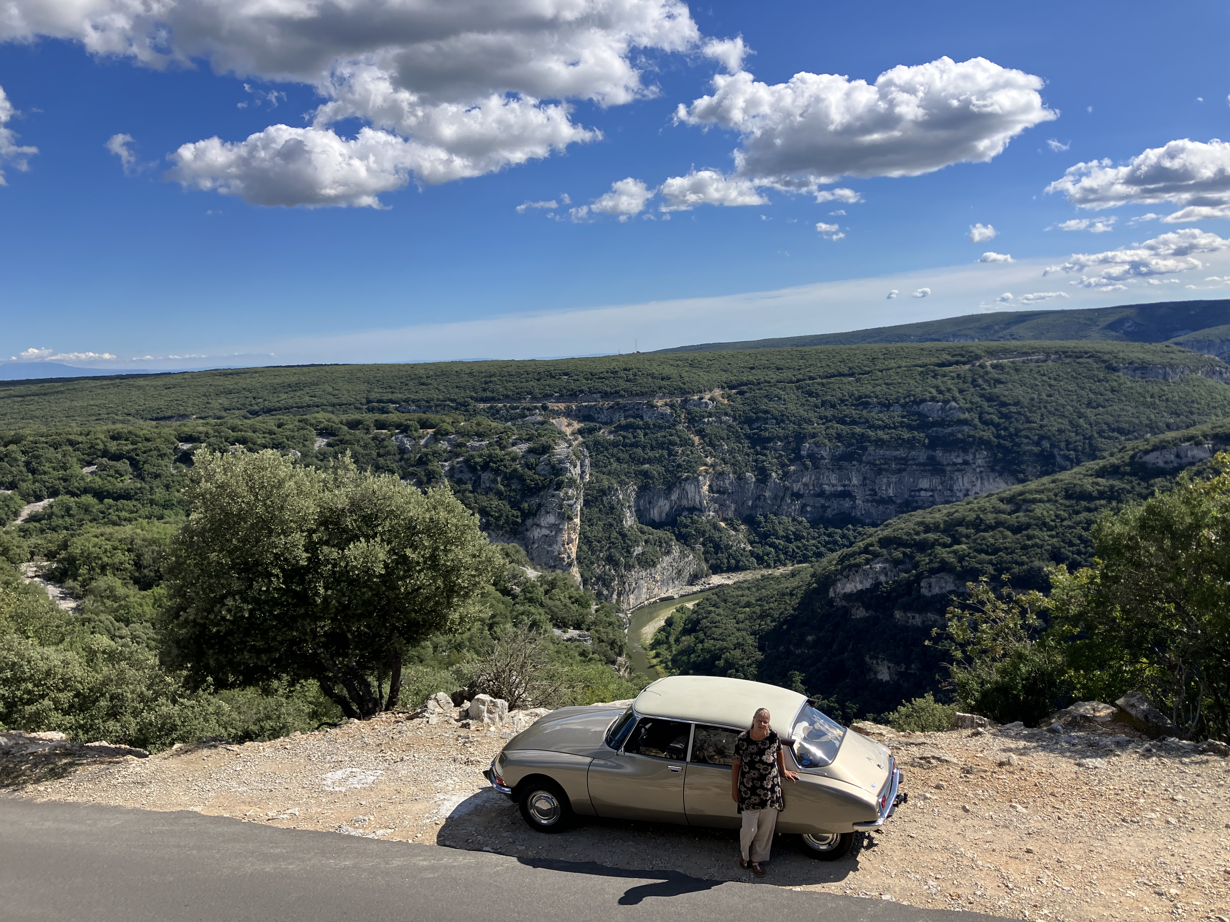 Er wat wind, het is droog en helder. Fris. “De Ardèche moeten we natuurlijk ook met een andere auto doen,” zo verwoordt Gijs het idee. Aldus besloten, trekken we er met ons luxe rijtuig op uit. In La Déesse door de Gorges de l’Ardèche. Dat rijmt (bijna). We groeten mijnheer De Bok die met zijn harem en jonkies over de weg struint, op zoek naar restjes groen tussen de verdroogde struiken in de berm. Terug via het brugje in Saint Martin d’Ardèche waarna de DS ook in een (reeds geoogst) wijnveld geduldig poseert.