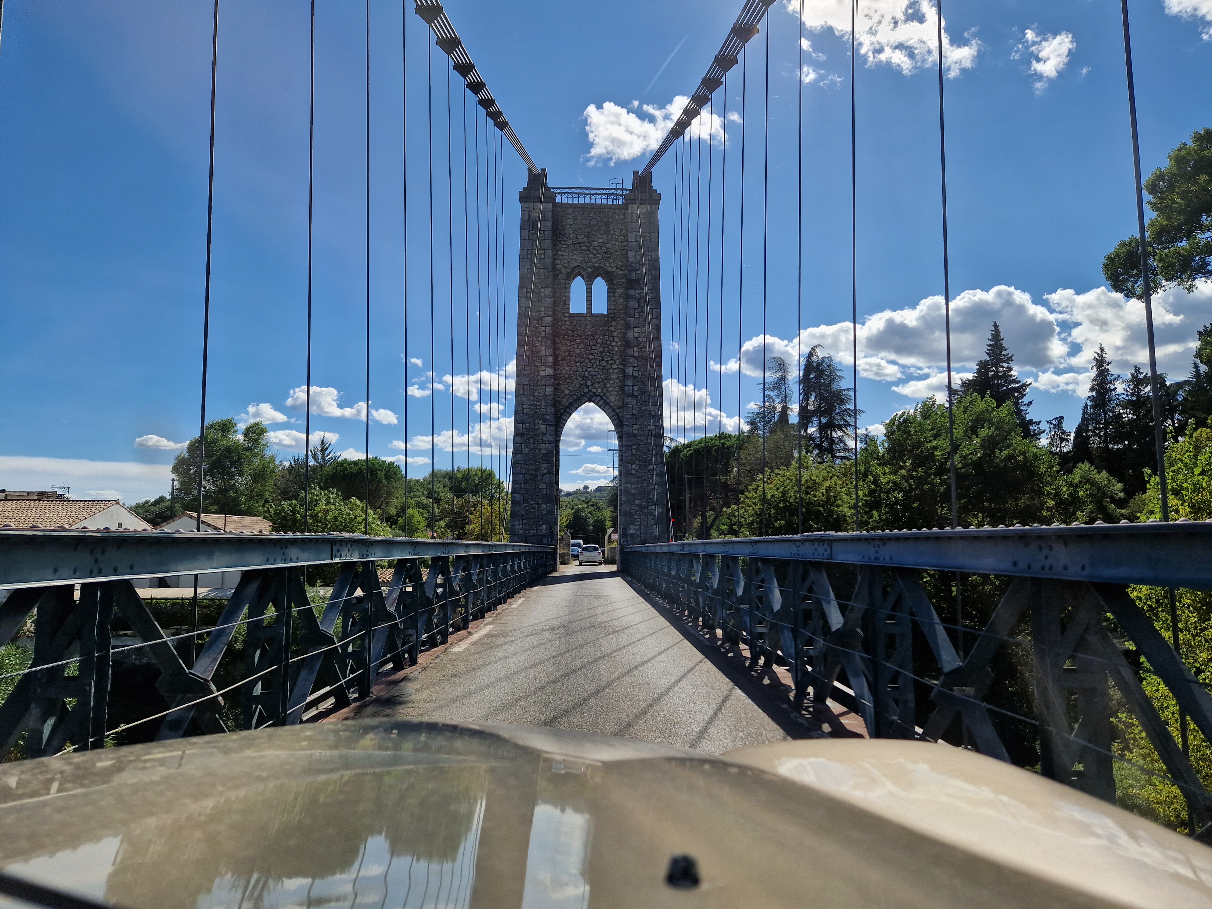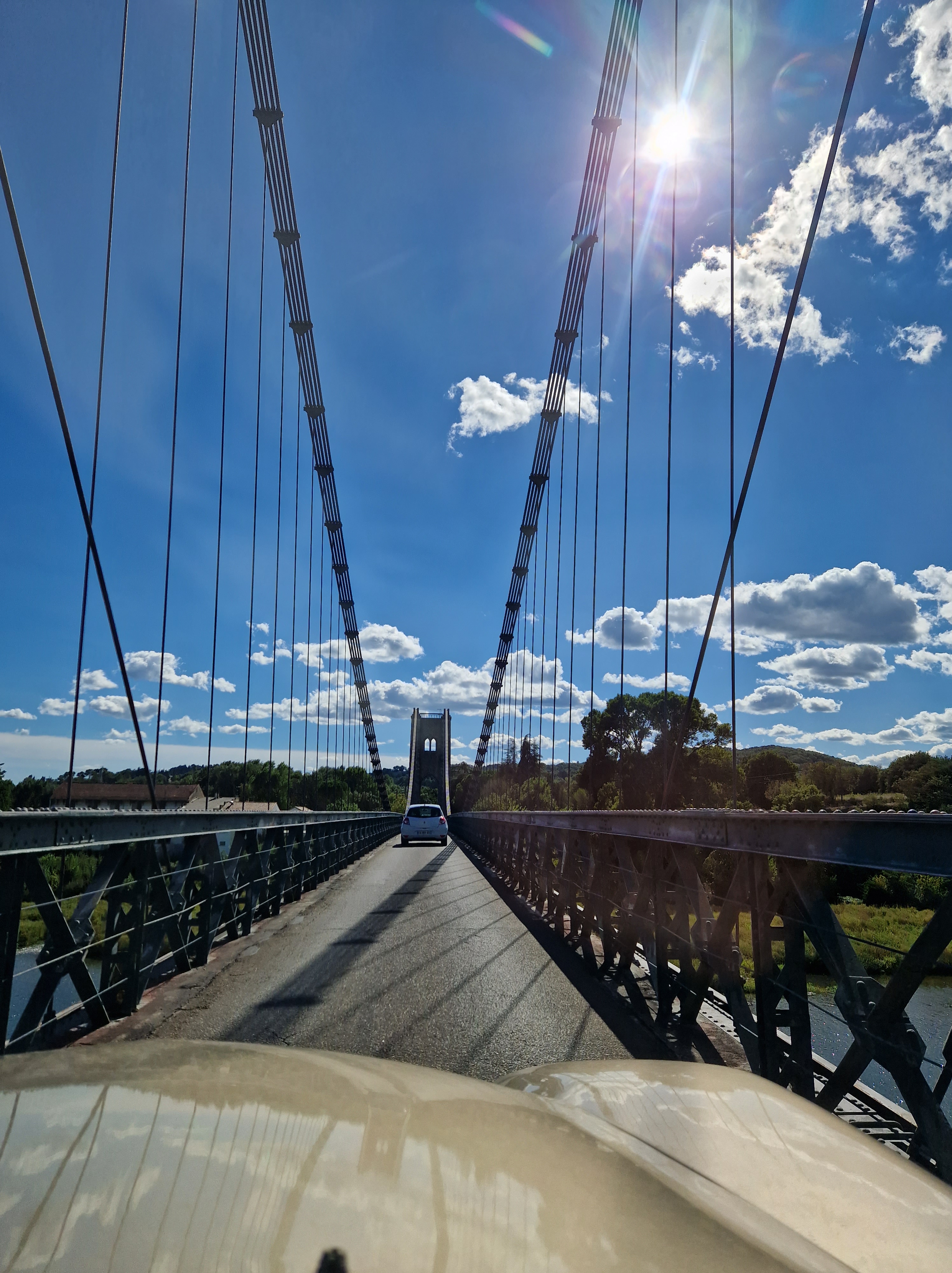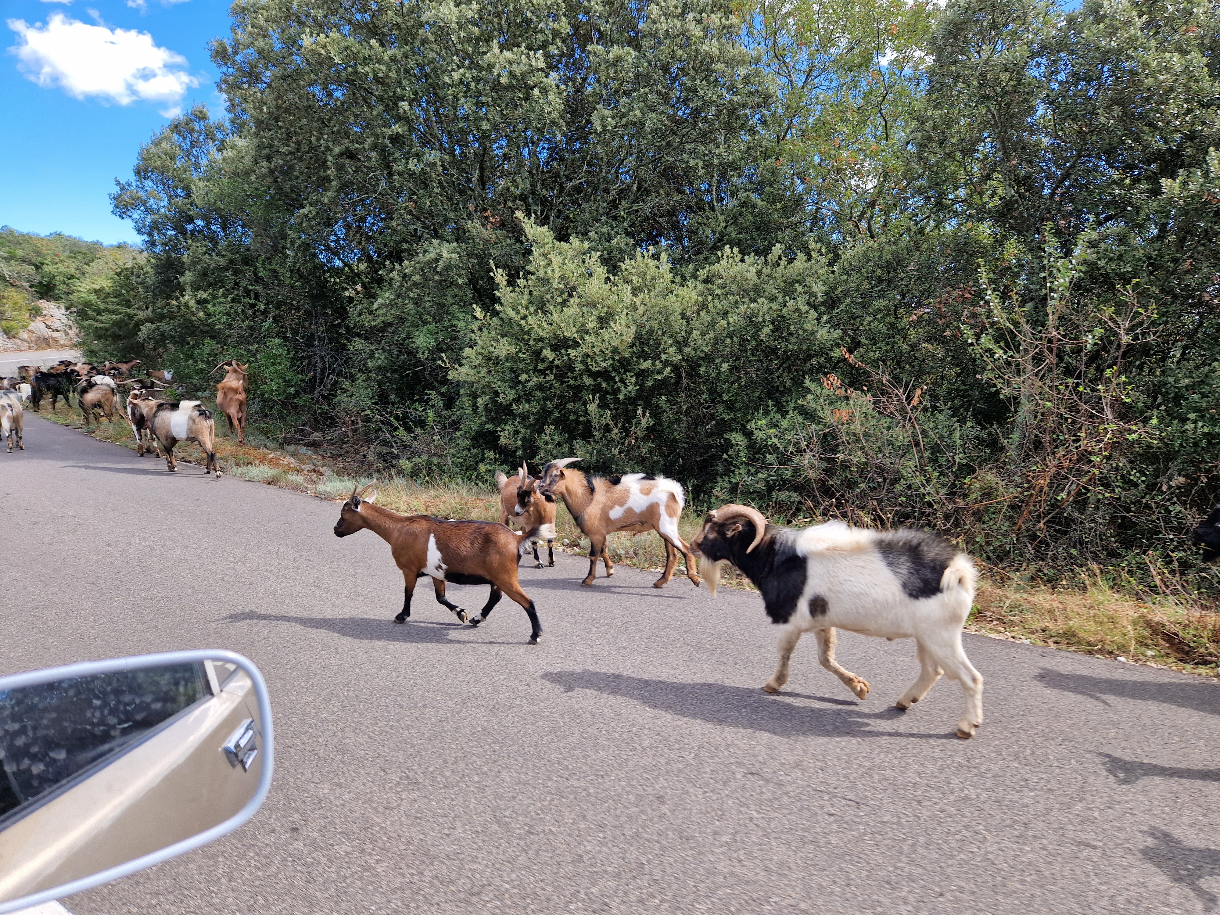 Er wat wind, het is droog en helder. Fris. “De Ardèche moeten we natuurlijk ook met een andere auto doen,” zo verwoordt Gijs het idee. Aldus besloten, trekken we er met ons luxe rijtuig op uit. In La Déesse door de Gorges de l’Ardèche. Dat rijmt (bijna). We groeten mijnheer De Bok die met zijn harem en jonkies over de weg struint, op zoek naar restjes groen tussen de verdroogde struiken in de berm. Terug via het brugje in Saint Martin d’Ardèche waarna de DS ook in een (reeds geoogst) wijnveld geduldig poseert.