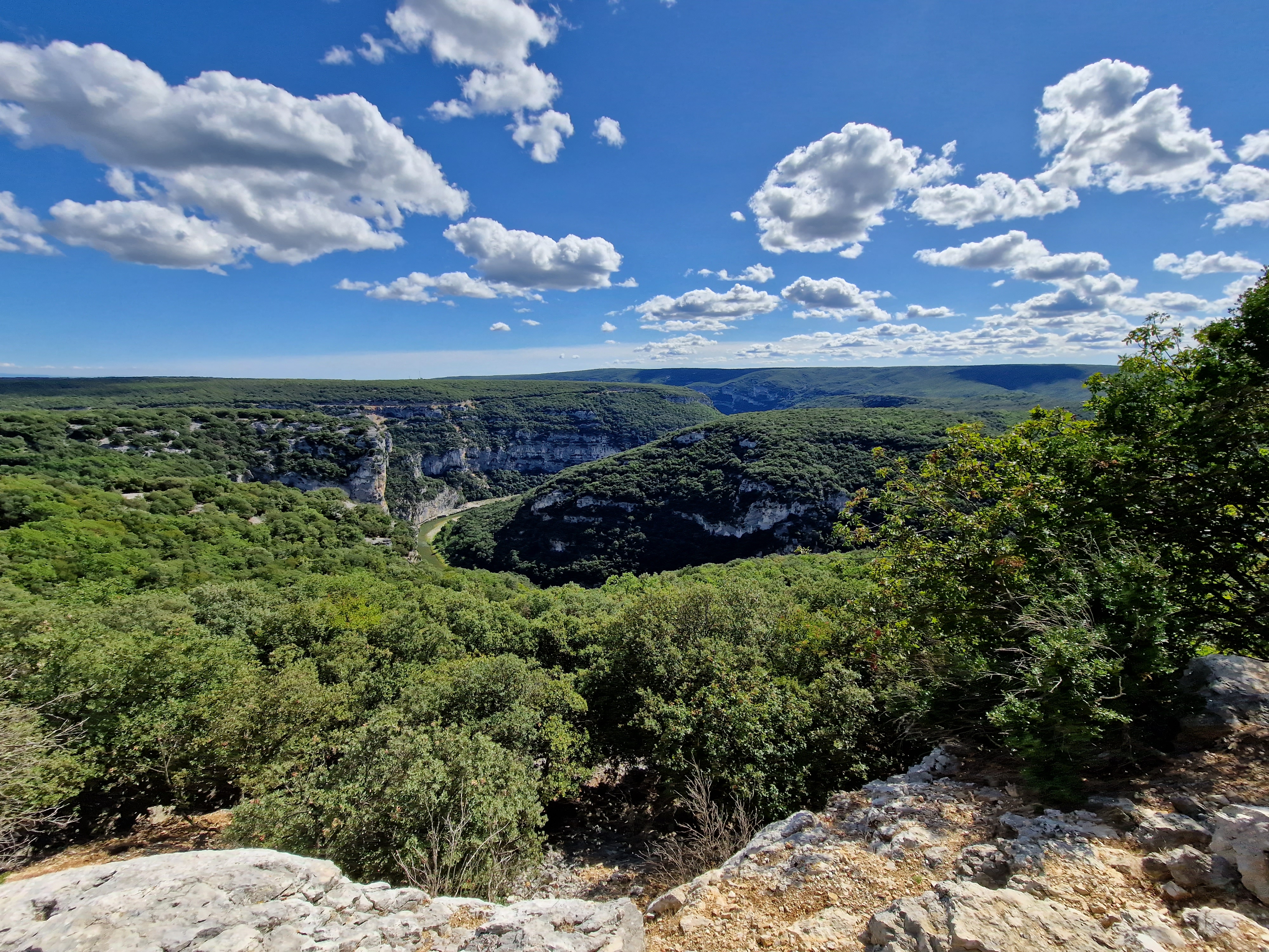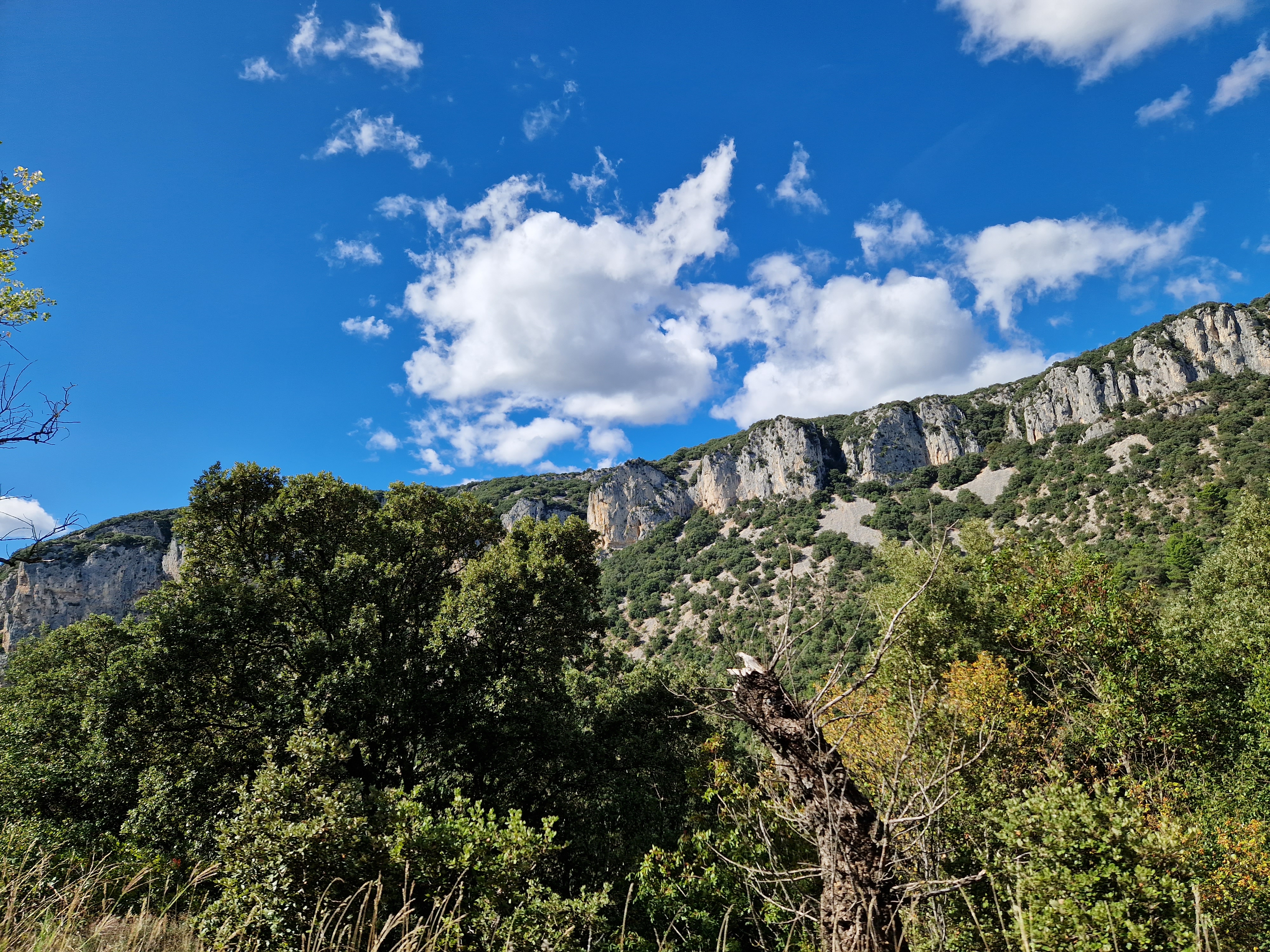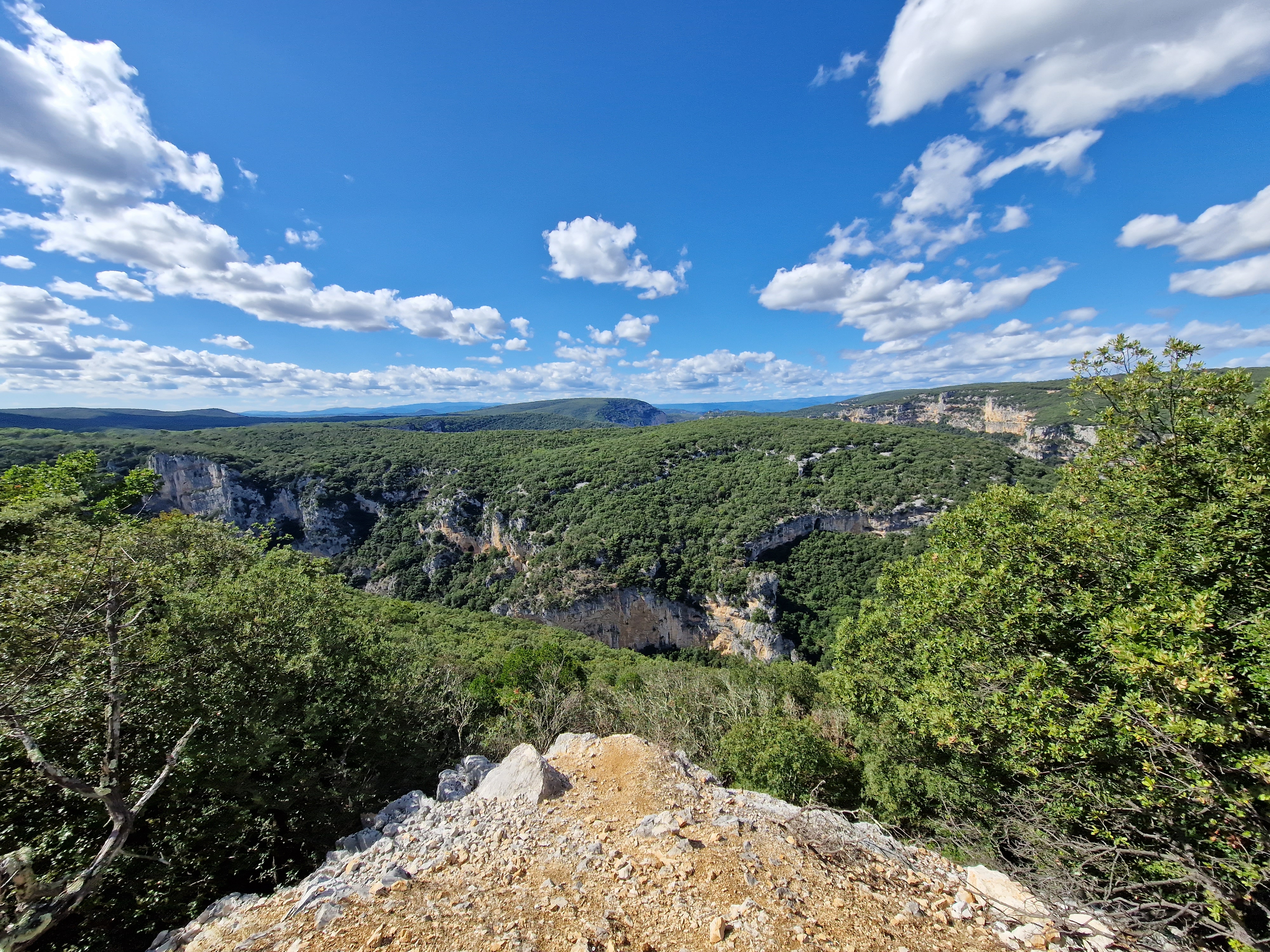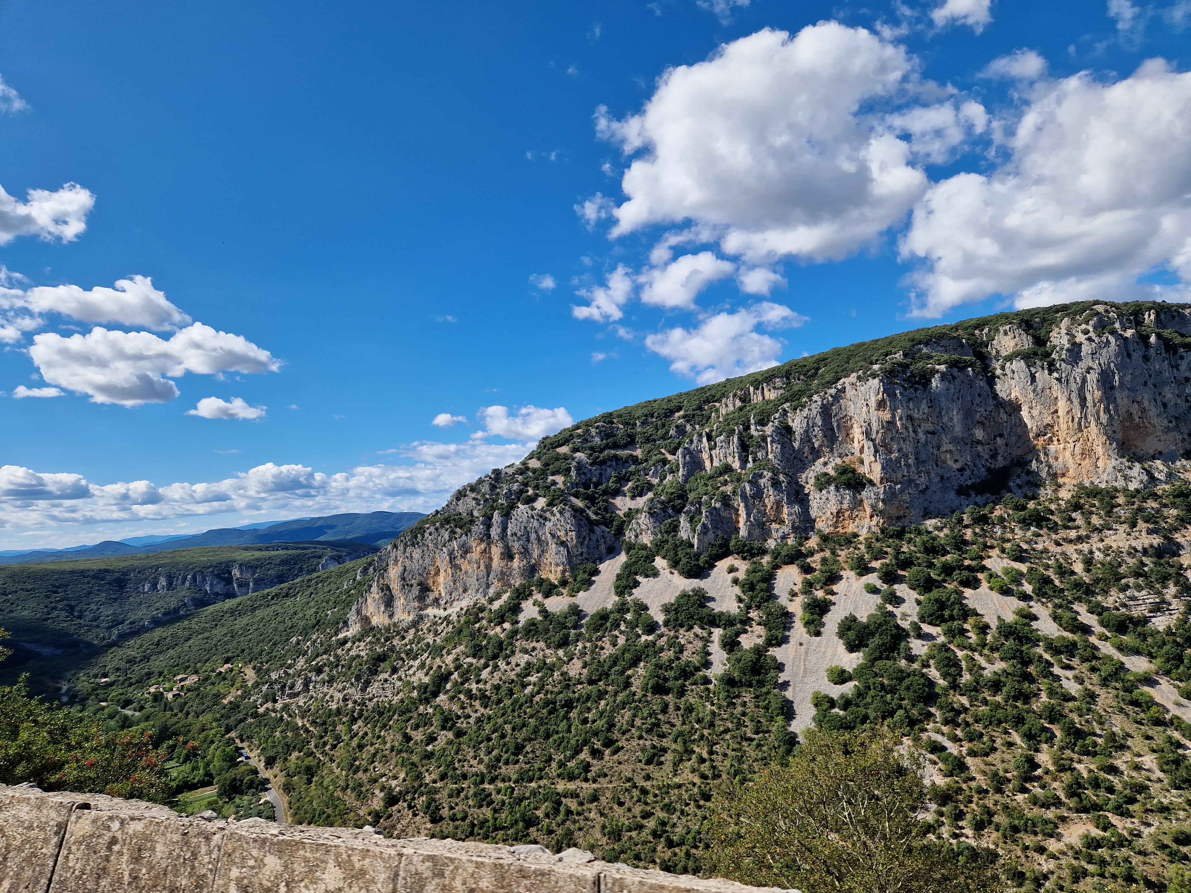 Er wat wind, het is droog en helder. Fris. “De Ardèche moeten we natuurlijk ook met een andere auto doen,” zo verwoordt Gijs het idee. Aldus besloten, trekken we er met ons luxe rijtuig op uit. In La Déesse door de Gorges de l’Ardèche. Dat rijmt (bijna). We groeten mijnheer De Bok die met zijn harem en jonkies over de weg struint, op zoek naar restjes groen tussen de verdroogde struiken in de berm. Terug via het brugje in Saint Martin d’Ardèche waarna de DS ook in een (reeds geoogst) wijnveld geduldig poseert.