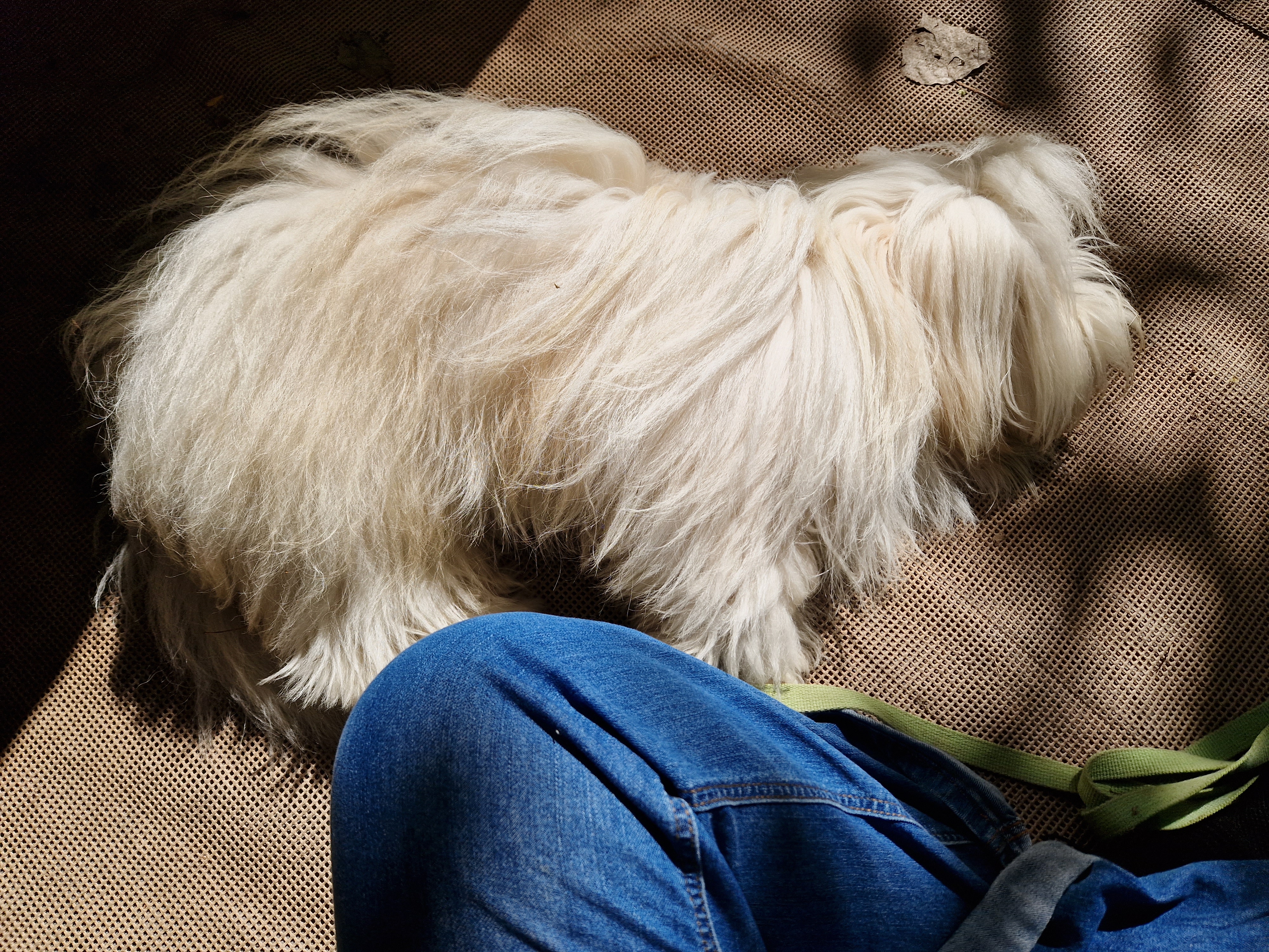 Na een warme rit zijn we blij als we op de camping arriveren. Gelukkig liggen de stoelen in het karretje bovenop zodat we éérst wat kunnen drinken en uitpuffen. In juni stond deze plek vol in de zon, nu komt hij amper boven de bomen uit. ‘s Avonds eten we, comme d’habitude, bij Café de France waar ik direct op twee Cotonnetjes stuit. Vanzelfsprekend gaan die, mèt grijnzende baas en al, op de foto.